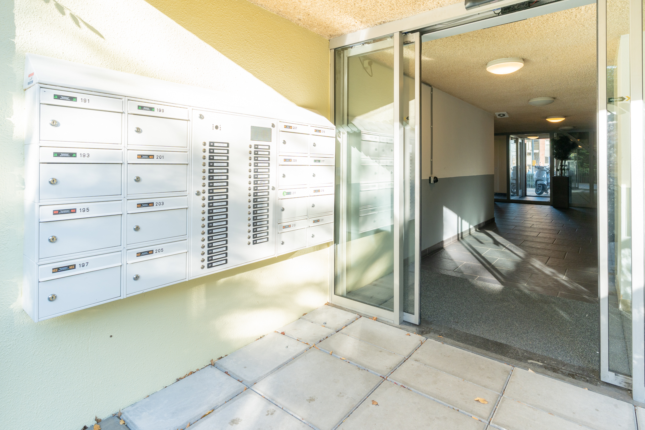 Centrale entree, brievenbussen, trappenhuis en lift.