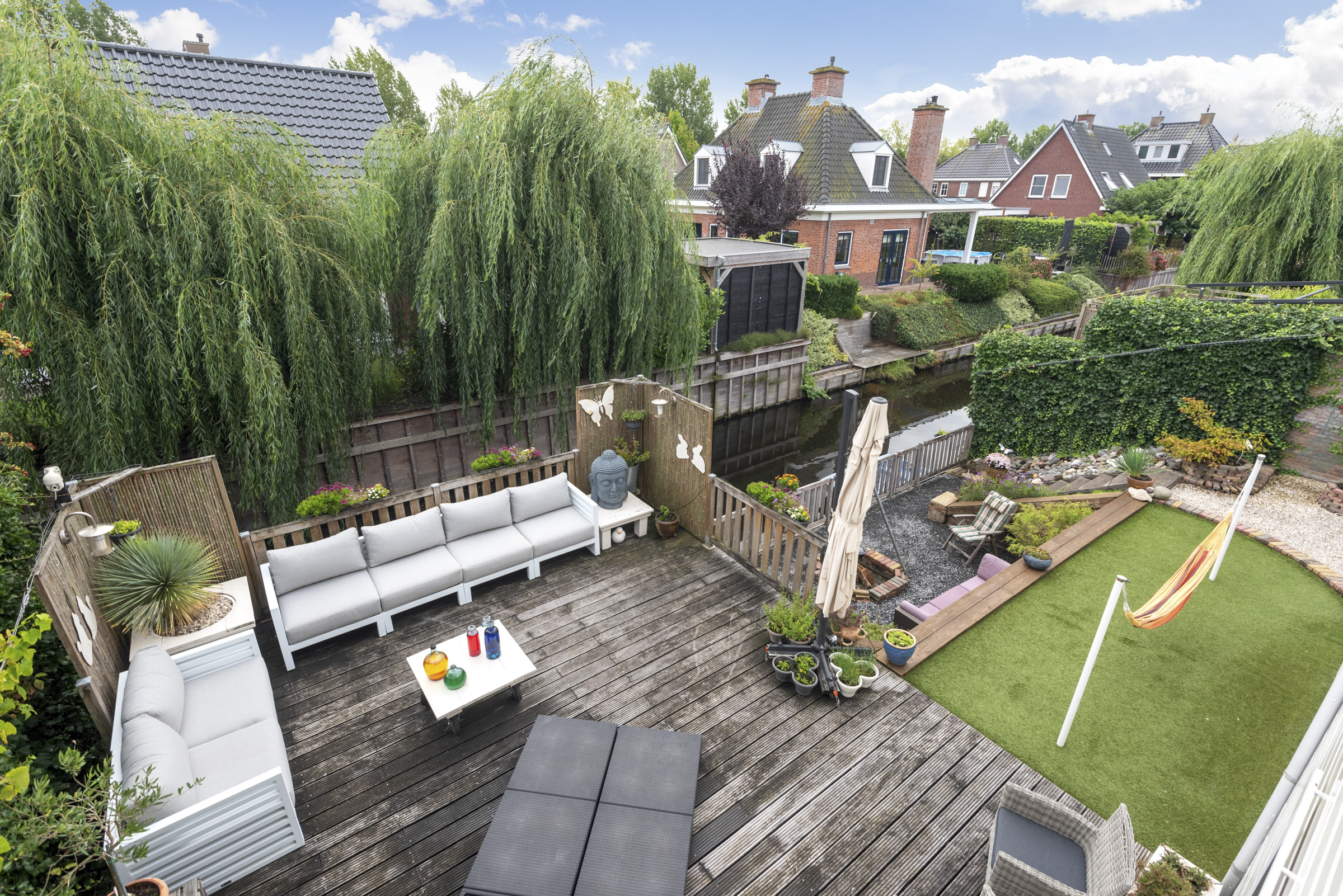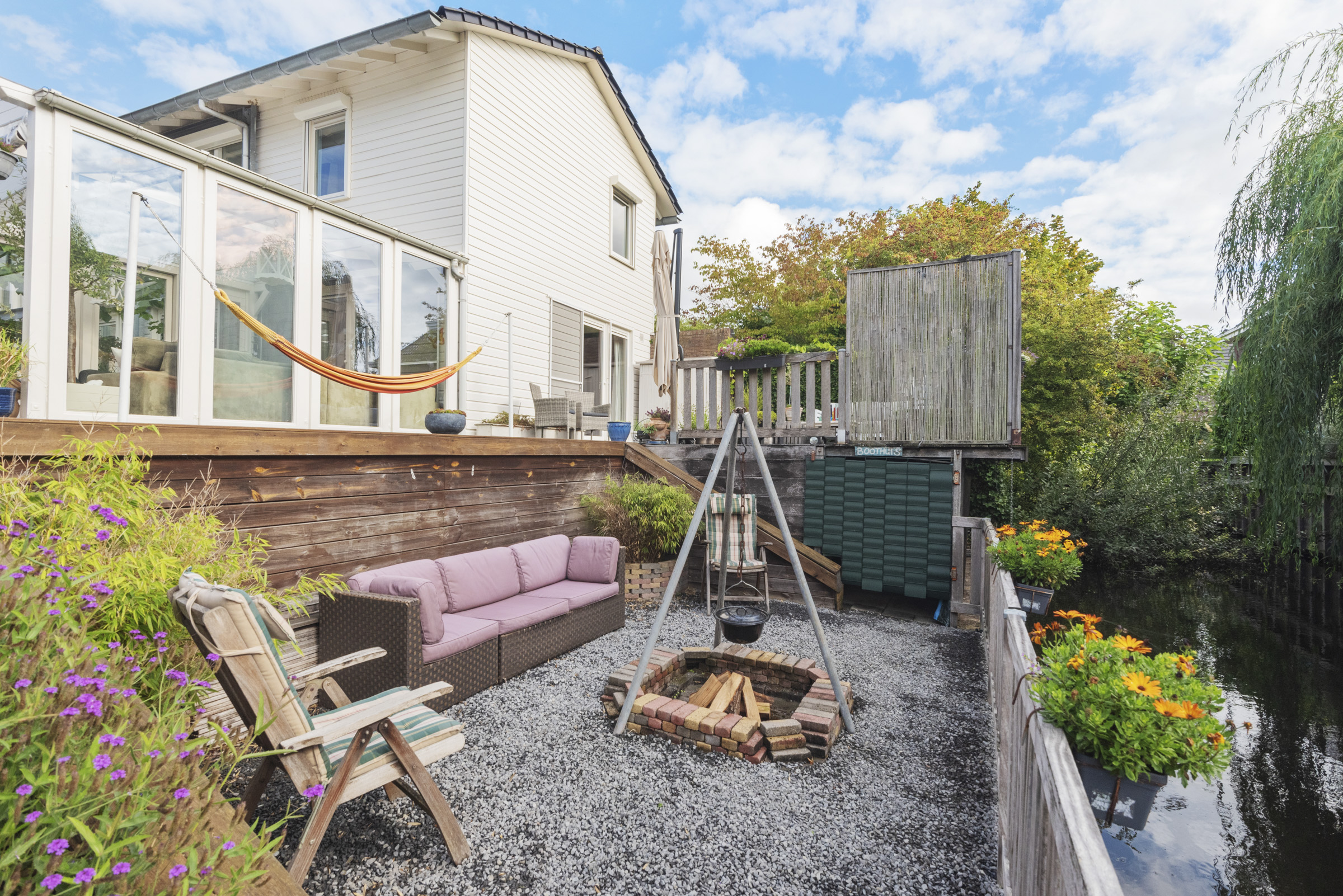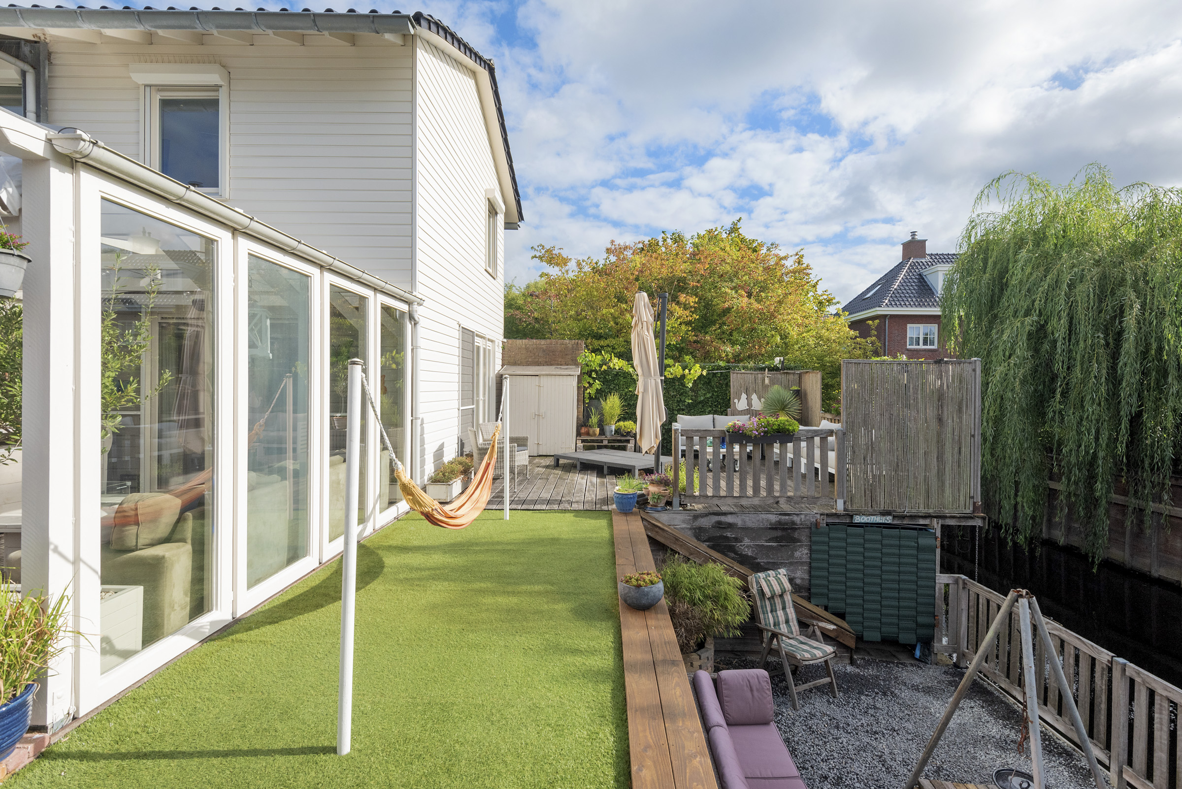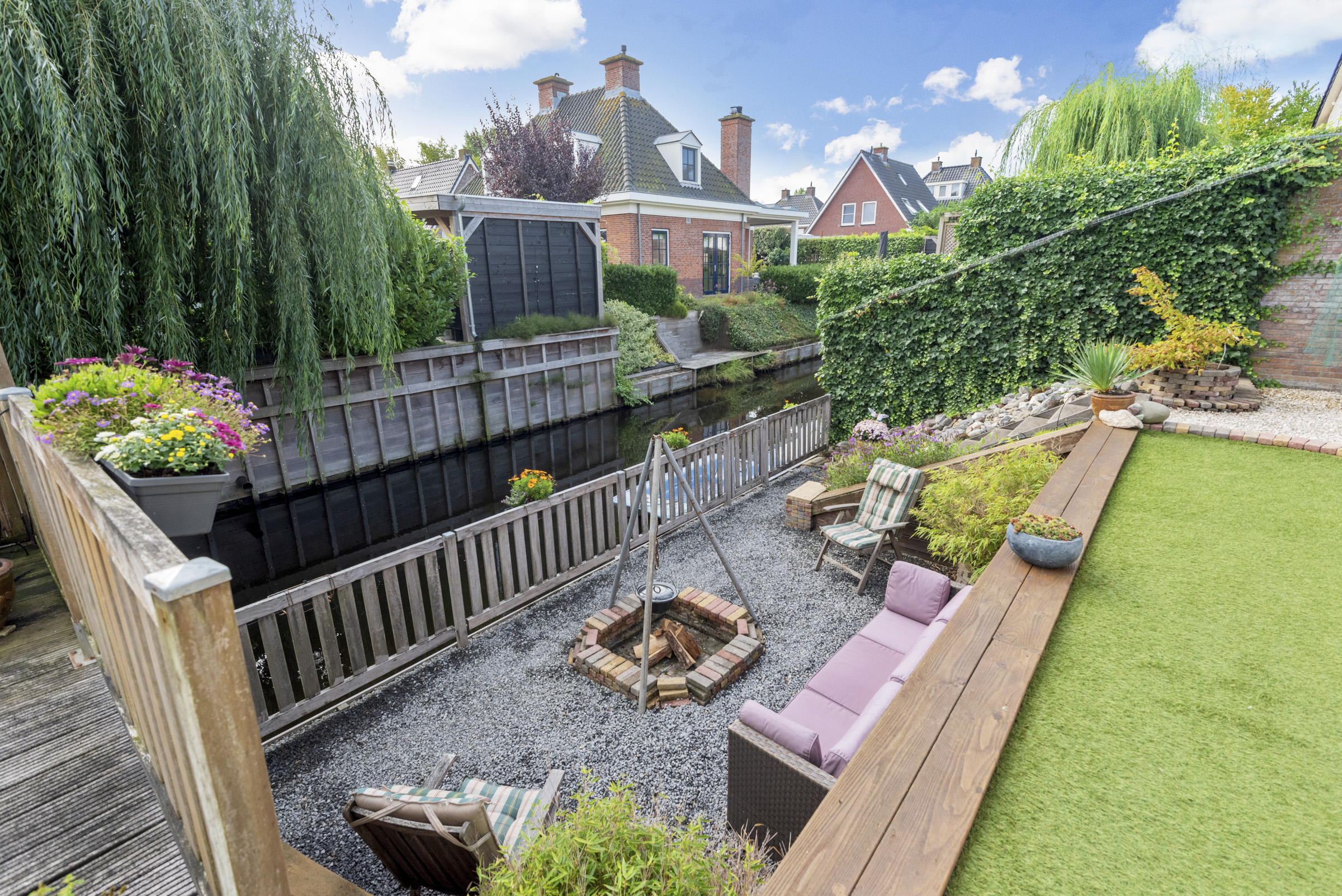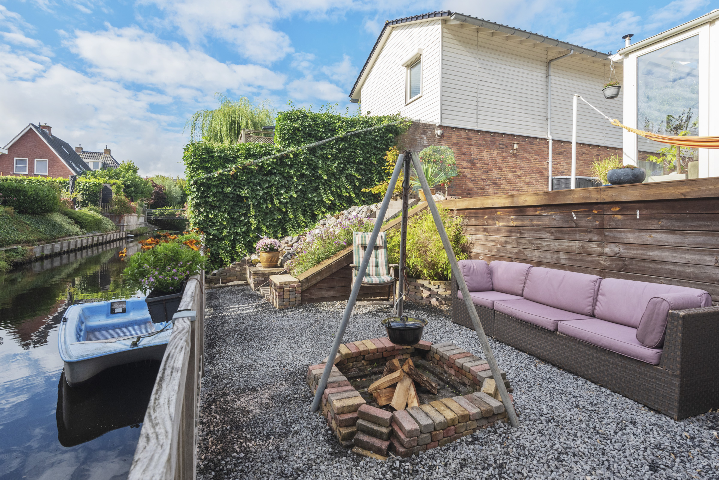 Voor in de tuin tref je parkeergelegenheid op eigen grond en de overkapping voor de fietsen en/of scooters. Als je de poort doorgaat, kom je bij de geïsoleerde multifunctionele ruimte welke op een betonnen fundering staat. Deze is momenteel in gebruik als werkruimte en berging, maar hier tref je een hal en de voorbereidingen voor een toilet en een basic keukenblok. De ruimte wordt verwarmd met een radiator en twee infrarood panelen. Achterin de tuin is een heerlijk terras direct aan het water gerealiseerd met een berging. Tevens is hier een hoger gelegen terras met een berging voor de kussens, waar je heerlijk tot in de avonduurtjes in de zon kan zitten. In de zonnige op het zuidwesten gelegen zijtuin heb je de sfeervolle veranda, de vijver en de trampoline. Er is een irrigatiesysteem aangelegd voor het automatisch bewateren van de tuin.