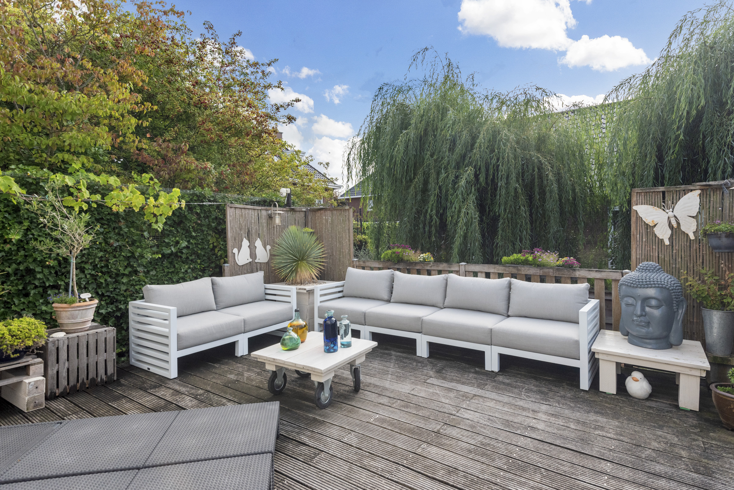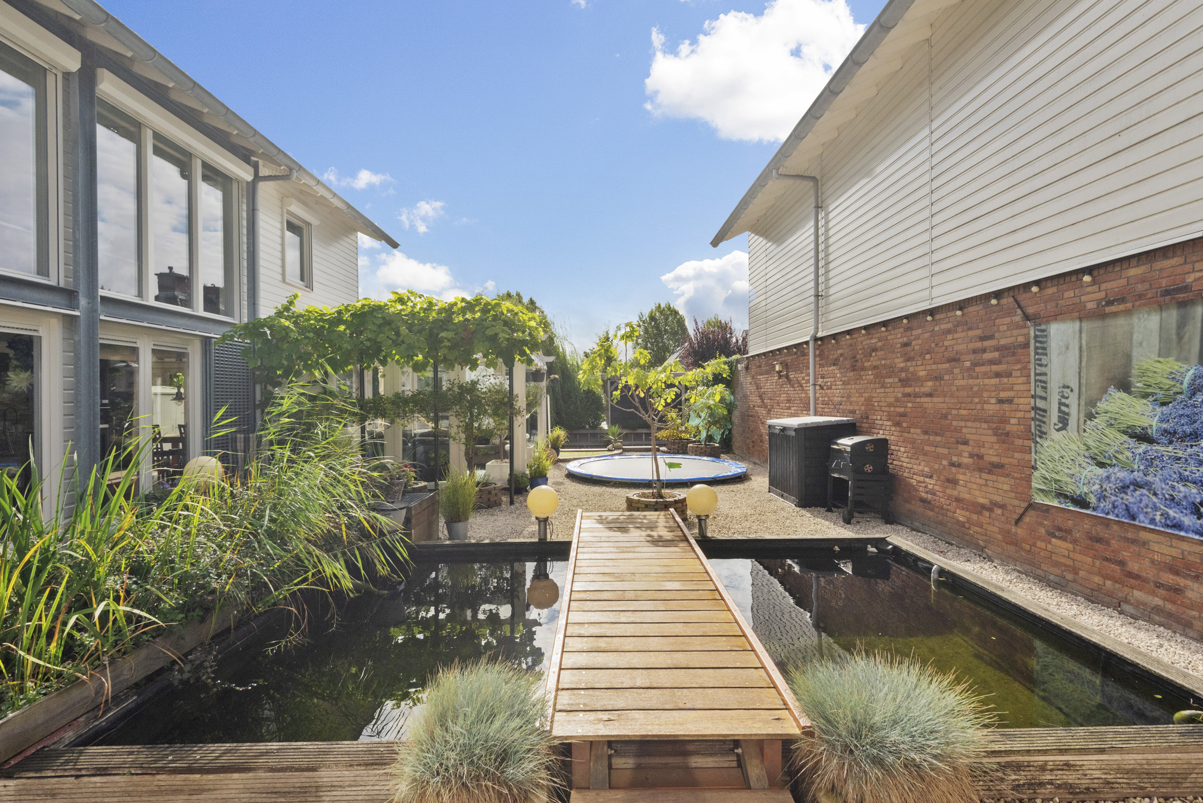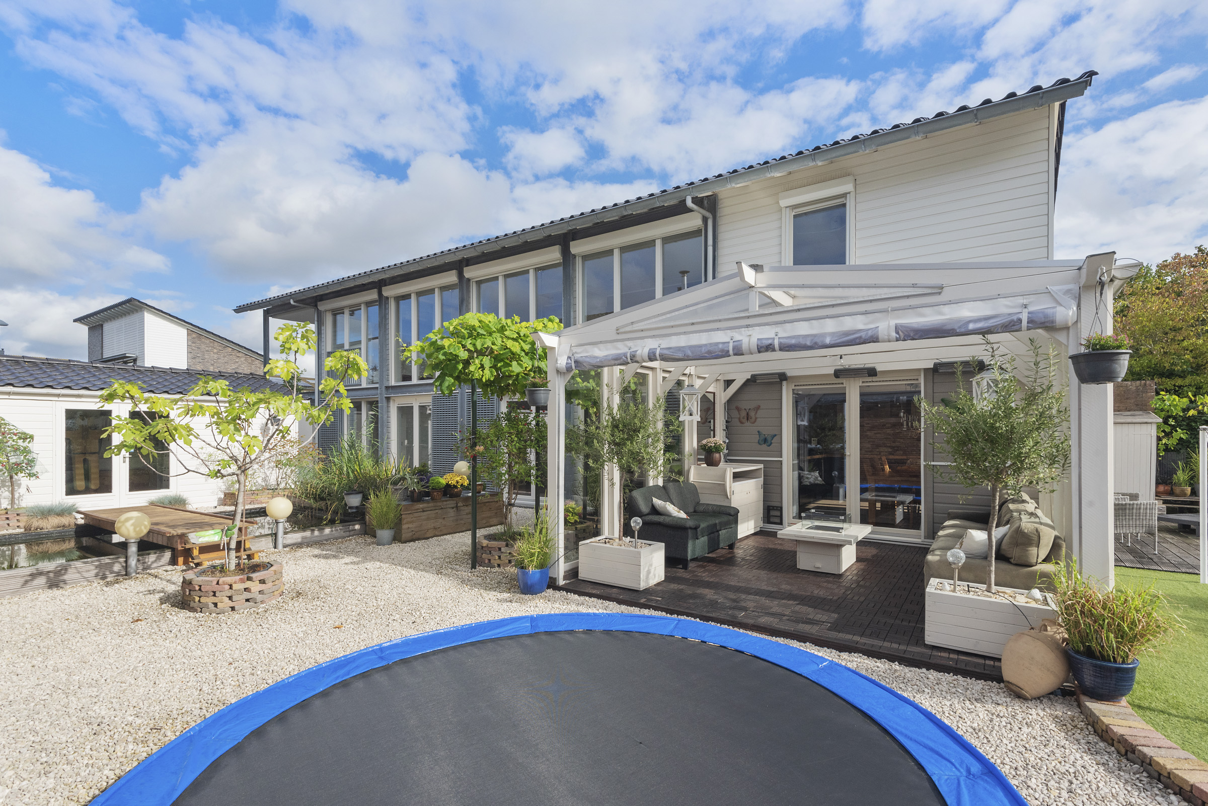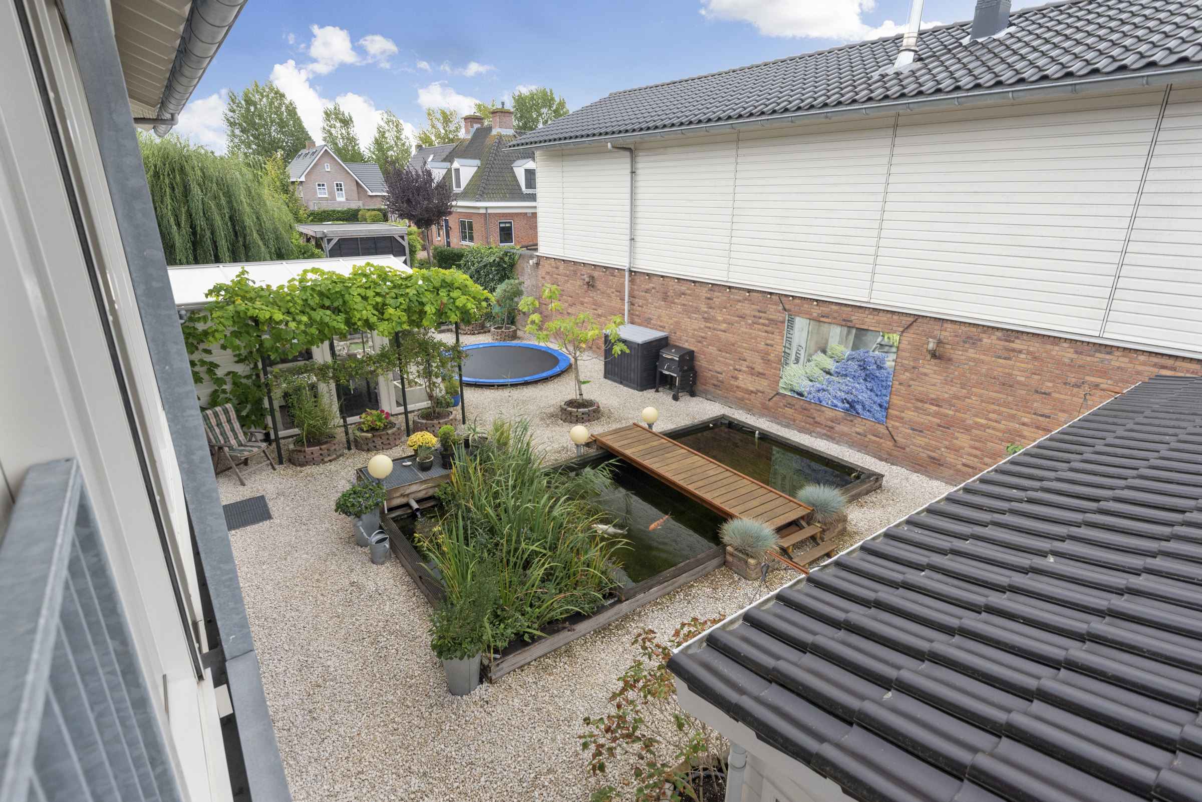 Voor in de tuin tref je parkeergelegenheid op eigen grond en de overkapping voor de fietsen en/of scooters. Als je de poort doorgaat, kom je bij de geïsoleerde multifunctionele ruimte welke op een betonnen fundering staat. Deze is momenteel in gebruik als werkruimte en berging, maar hier tref je een hal en de voorbereidingen voor een toilet en een basic keukenblok. De ruimte wordt verwarmd met een radiator en twee infrarood panelen. Achterin de tuin is een heerlijk terras direct aan het water gerealiseerd met een berging. Tevens is hier een hoger gelegen terras met een berging voor de kussens, waar je heerlijk tot in de avonduurtjes in de zon kan zitten. In de zonnige op het zuidwesten gelegen zijtuin heb je de sfeervolle veranda, de vijver en de trampoline. Er is een irrigatiesysteem aangelegd voor het automatisch bewateren van de tuin.
