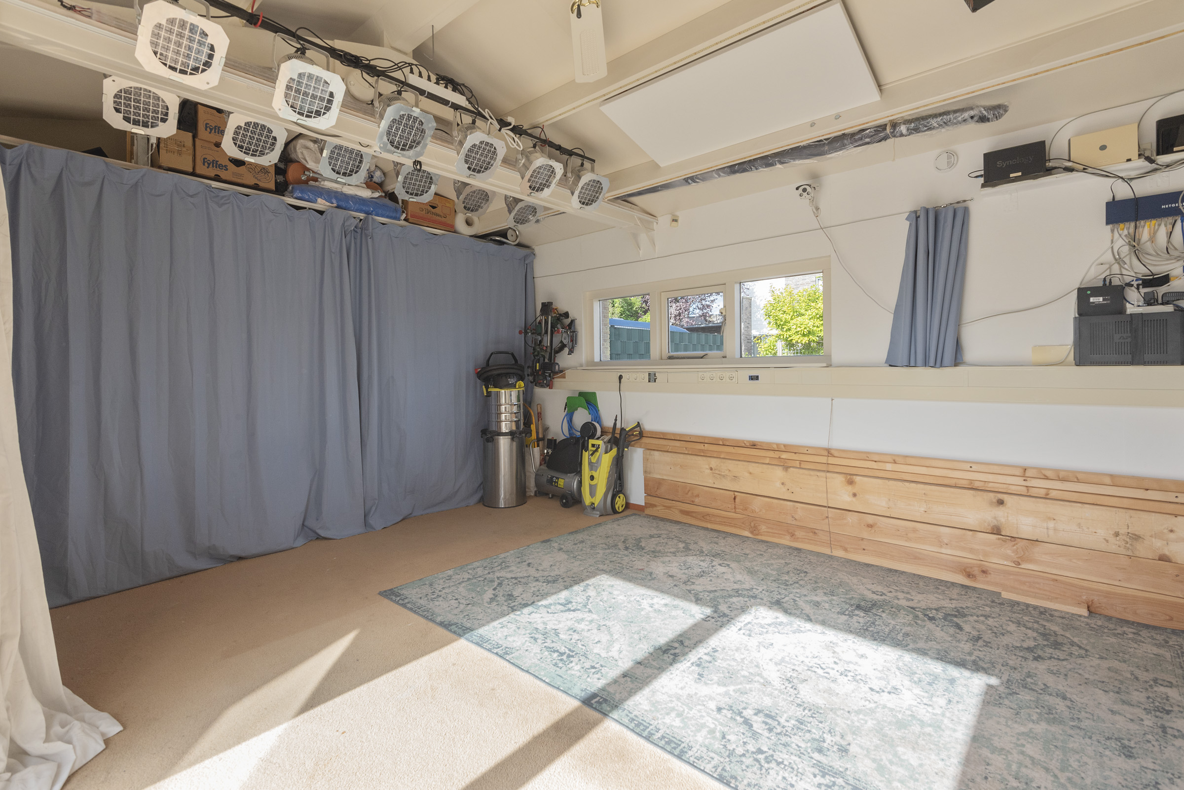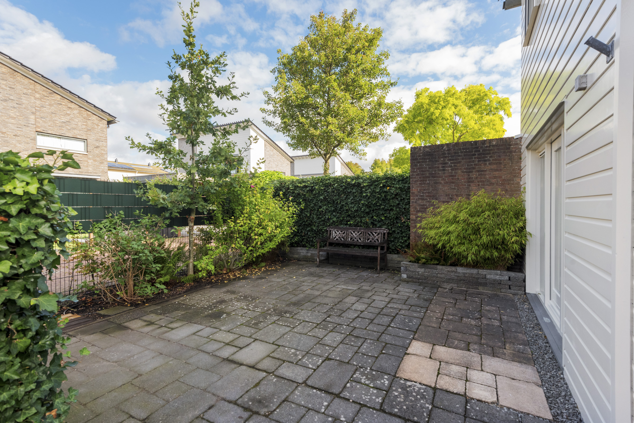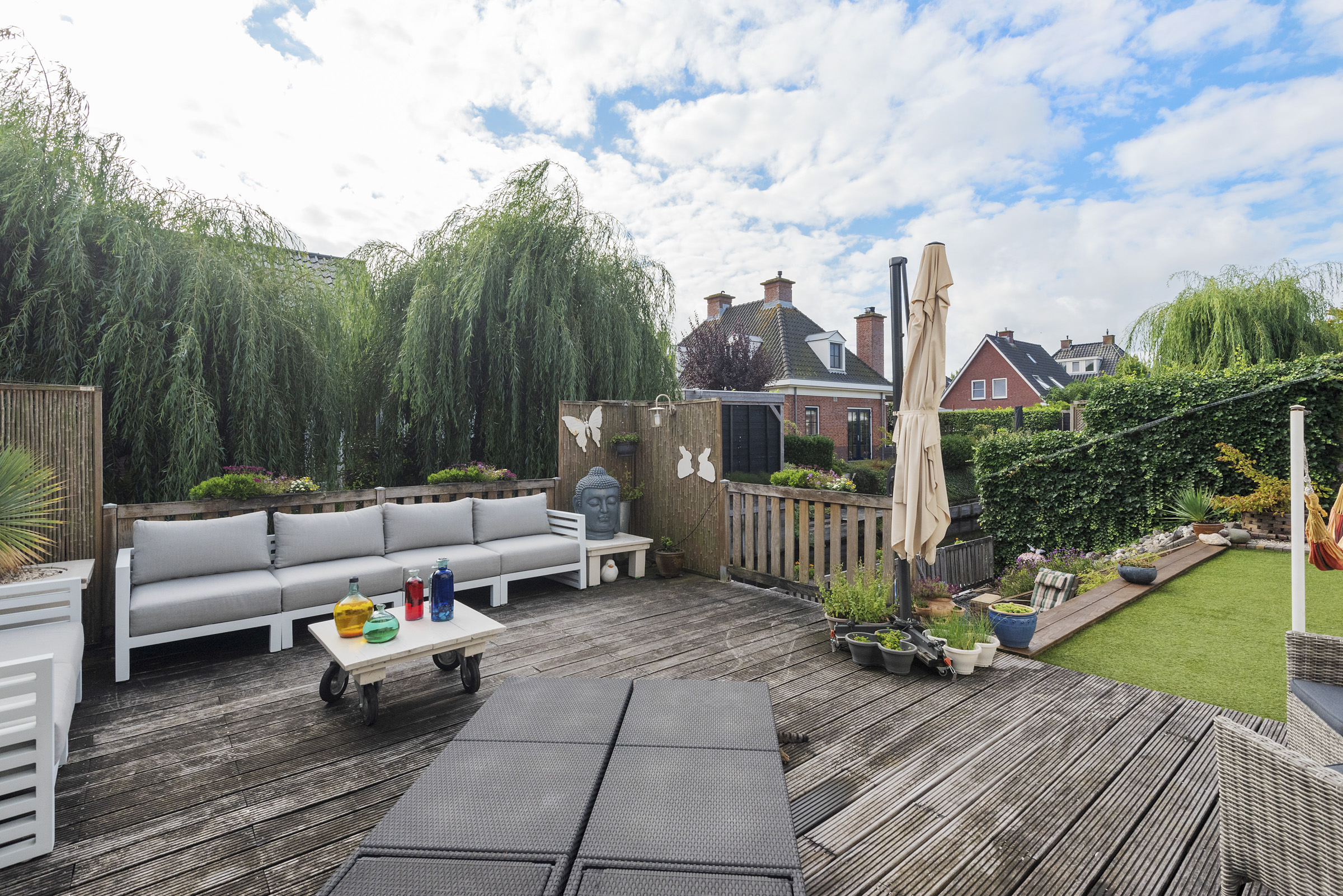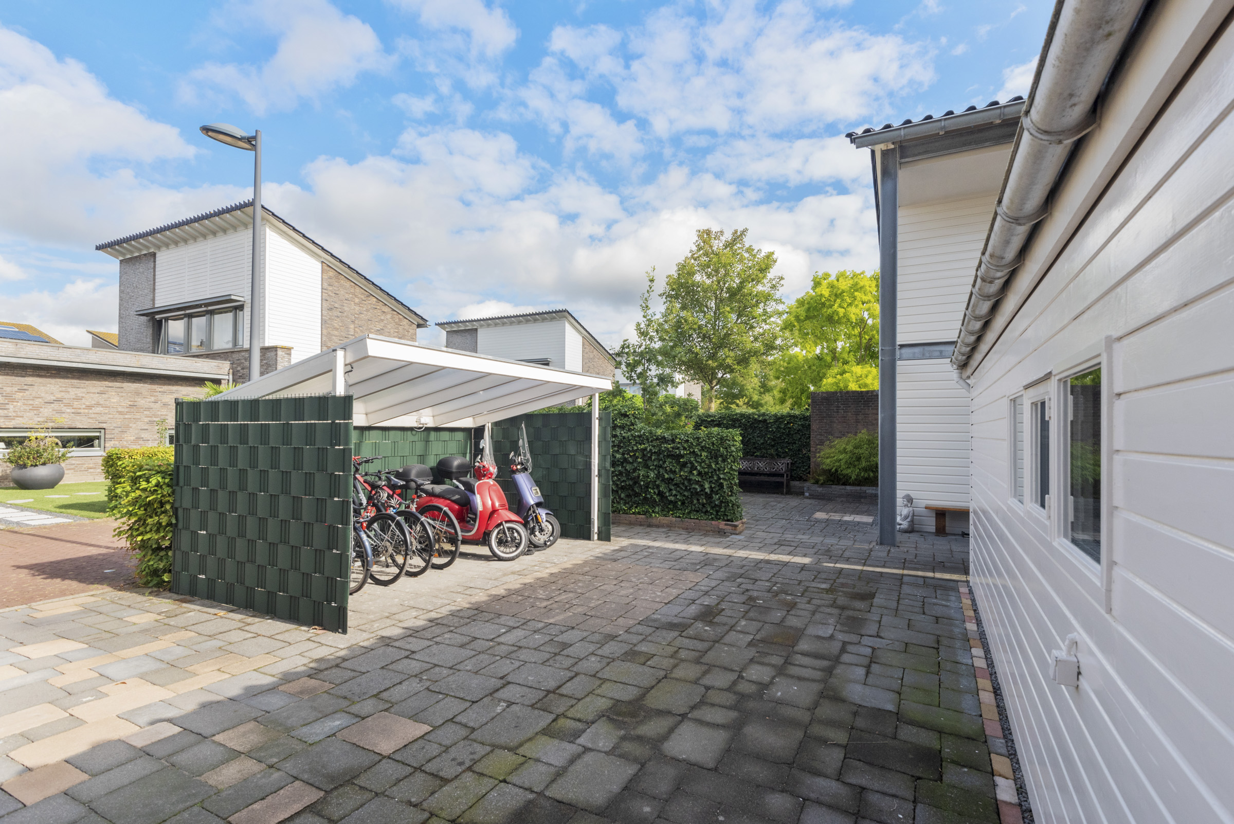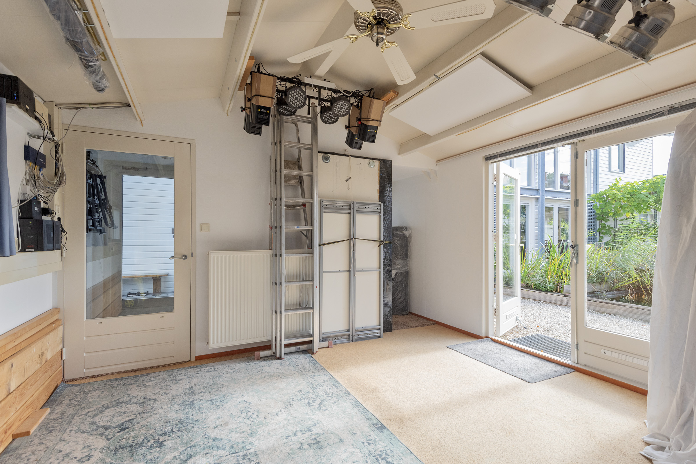 Voor in de tuin tref je parkeergelegenheid op eigen grond en de overkapping voor de fietsen en/of scooters. Als je de poort doorgaat, kom je bij de geïsoleerde multifunctionele ruimte welke op een betonnen fundering staat. Deze is momenteel in gebruik als werkruimte en berging, maar hier tref je een hal en de voorbereidingen voor een toilet en een basic keukenblok. De ruimte wordt verwarmd met een radiator en twee infrarood panelen. Achterin de tuin is een heerlijk terras direct aan het water gerealiseerd met een berging. Tevens is hier een hoger gelegen terras met een berging voor de kussens, waar je heerlijk tot in de avonduurtjes in de zon kan zitten. In de zonnige op het zuidwesten gelegen zijtuin heb je de sfeervolle veranda, de vijver en de trampoline. Er is een irrigatiesysteem aangelegd voor het automatisch bewateren van de tuin.