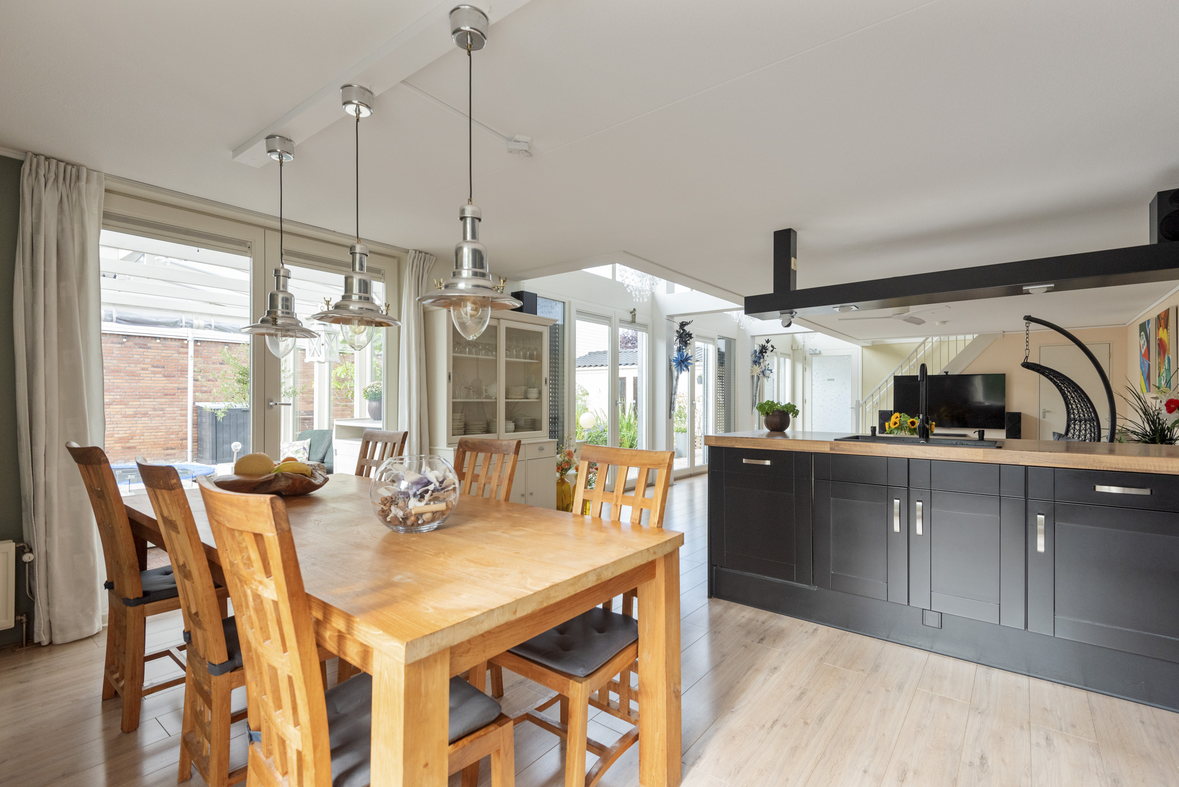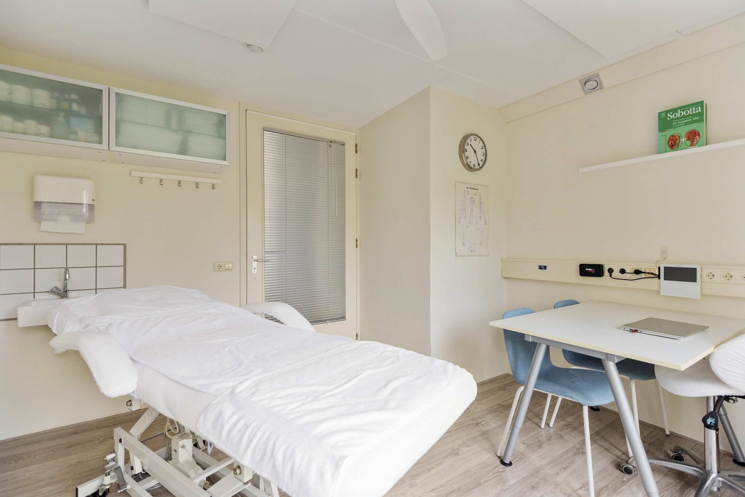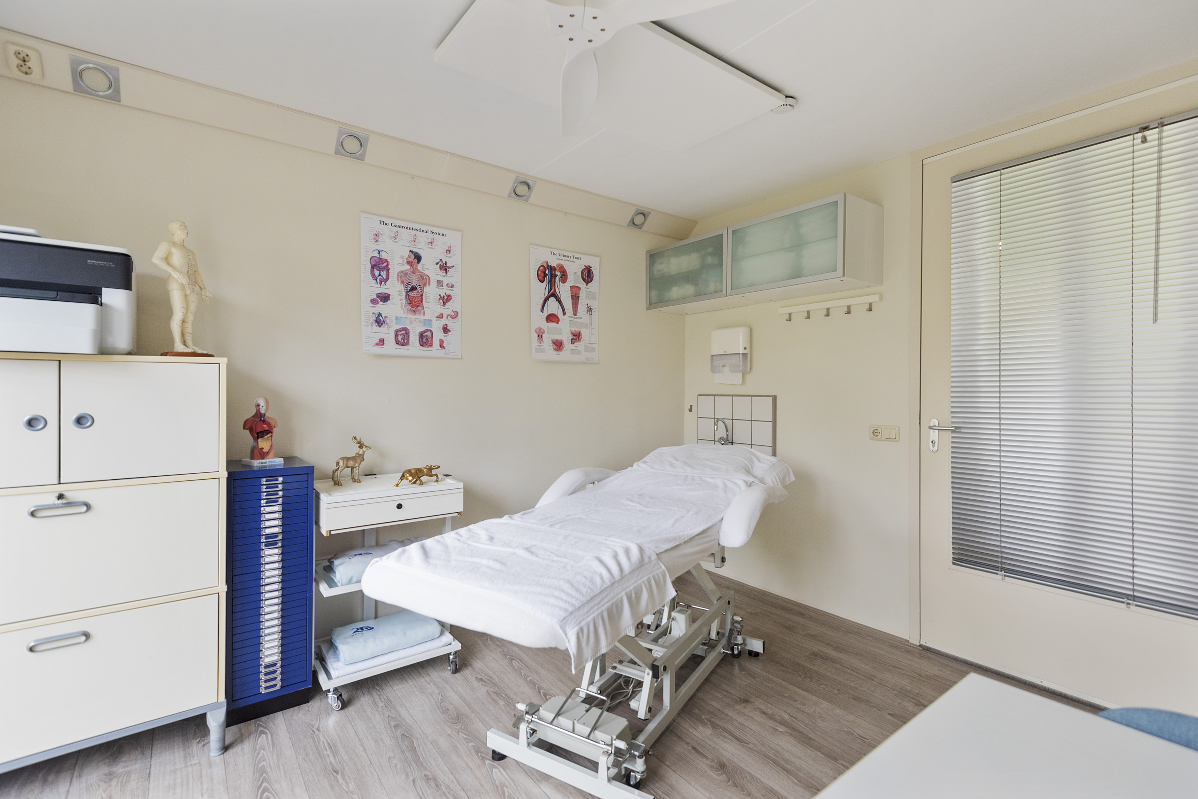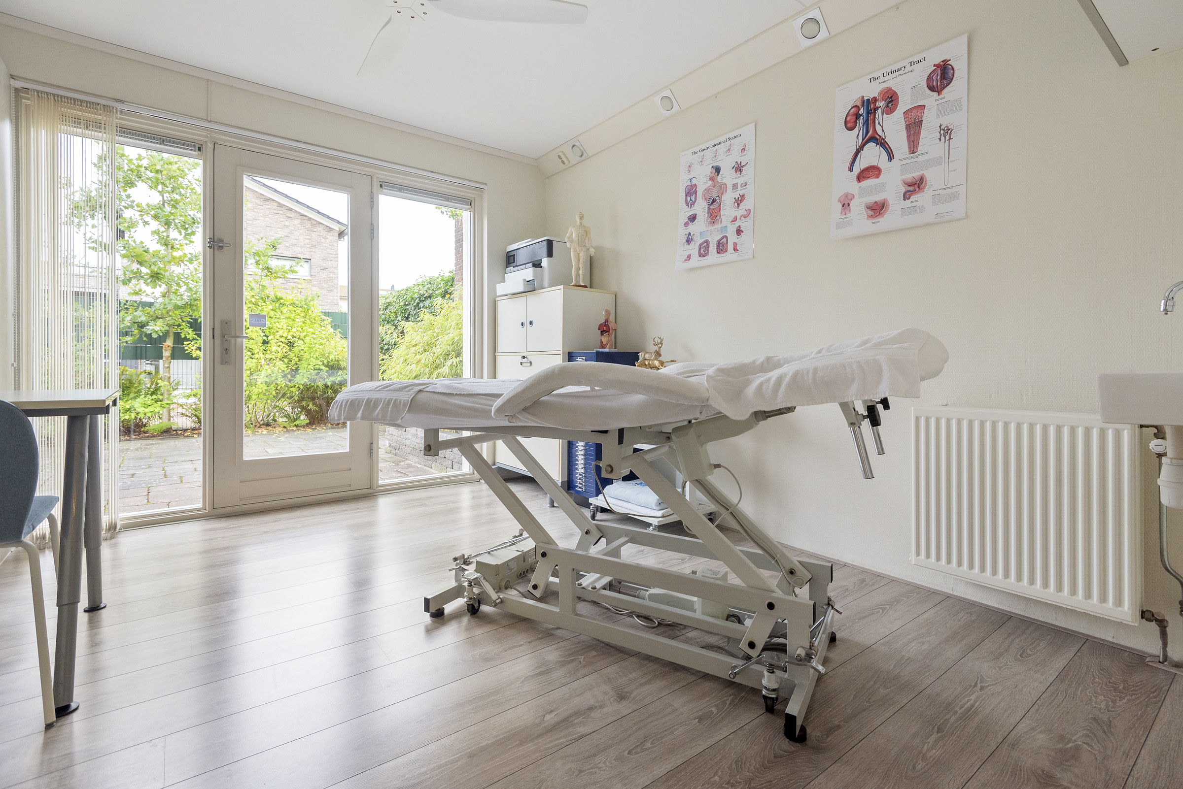 Entree, hal, meterkast, vaste kast, wachtruimte naar de praktijkruimte. De ruime praktijkruimte kan natuurlijk ook als kantoor of 5e slaapkamer gebruikt worden, deze ruimte wordt zowel door een radiator als twee infrarood panelen verwarmd. De praktijkruimte heeft een eigen deur naar de voortuin. De woonkamer, met praktische trapkast, kenmerkt zich door de vele raampartijen, wat een heerlijk daglicht geeft in de woning. Hier zijn een viertal dubbel openslaande deuren die toegang geven tot de tuin. De ruime half-open keuken is aan de achterzijde gelegen met een gezellig barretje aan het schiereiland. De keuken beschikt over de volgende inbouwapparatuur: koel-vriescombi (nieuw), stoomoven (nieuw), kookplaat, afzuigkap en vaatwasser. Ook hier tref je dubbel openslaande deuren naar de tuin.