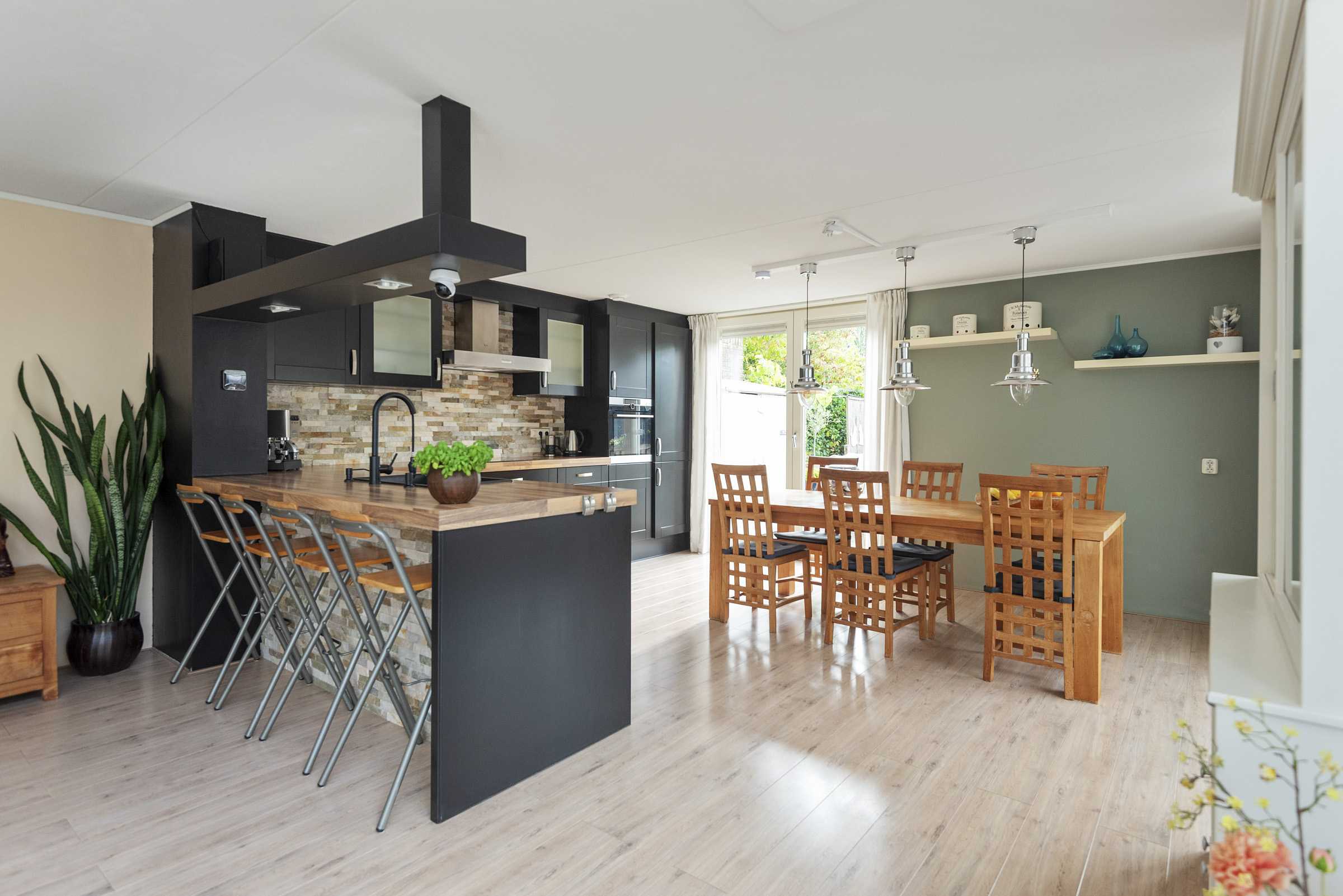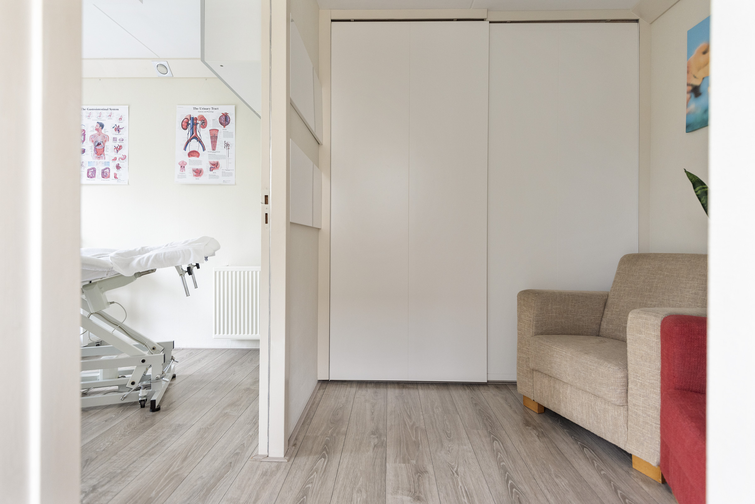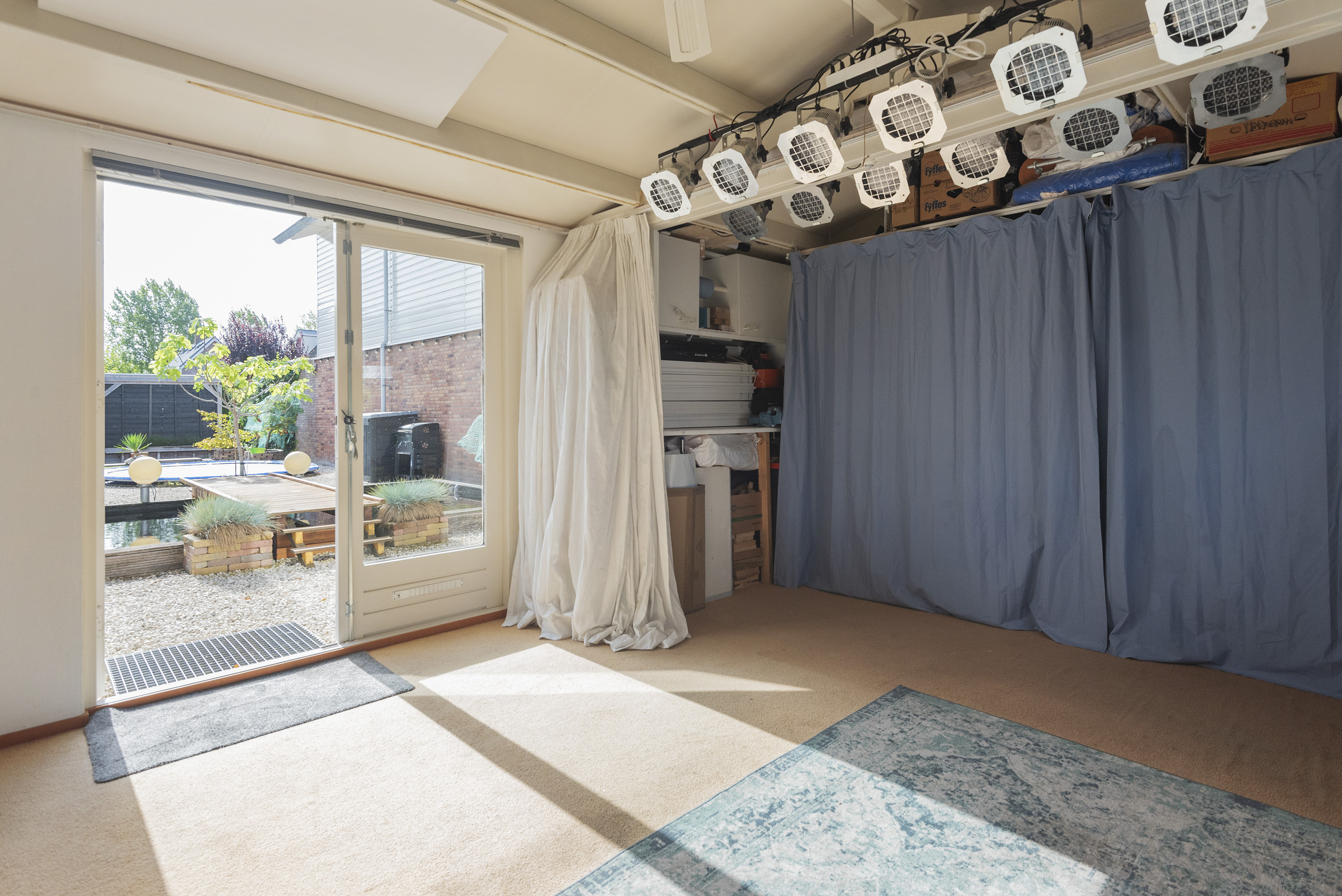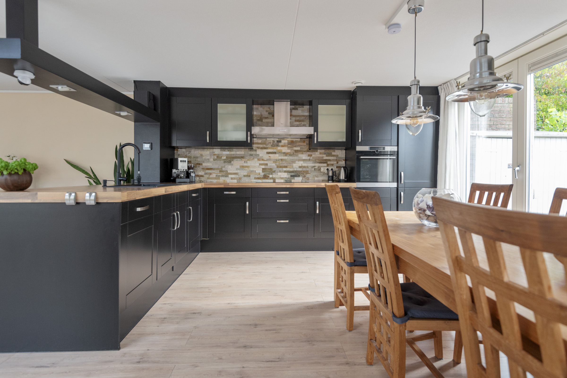 Entree, hal, meterkast, vaste kast, wachtruimte naar de praktijkruimte. De ruime praktijkruimte kan natuurlijk ook als kantoor of 5e slaapkamer gebruikt worden, deze ruimte wordt zowel door een radiator als twee infrarood panelen verwarmd. De praktijkruimte heeft een eigen deur naar de voortuin. De woonkamer, met praktische trapkast, kenmerkt zich door de vele raampartijen, wat een heerlijk daglicht geeft in de woning. Hier zijn een viertal dubbel openslaande deuren die toegang geven tot de tuin. De ruime half-open keuken is aan de achterzijde gelegen met een gezellig barretje aan het schiereiland. De keuken beschikt over de volgende inbouwapparatuur: koel-vriescombi (nieuw), stoomoven (nieuw), kookplaat, afzuigkap en vaatwasser. Ook hier tref je dubbel openslaande deuren naar de tuin.