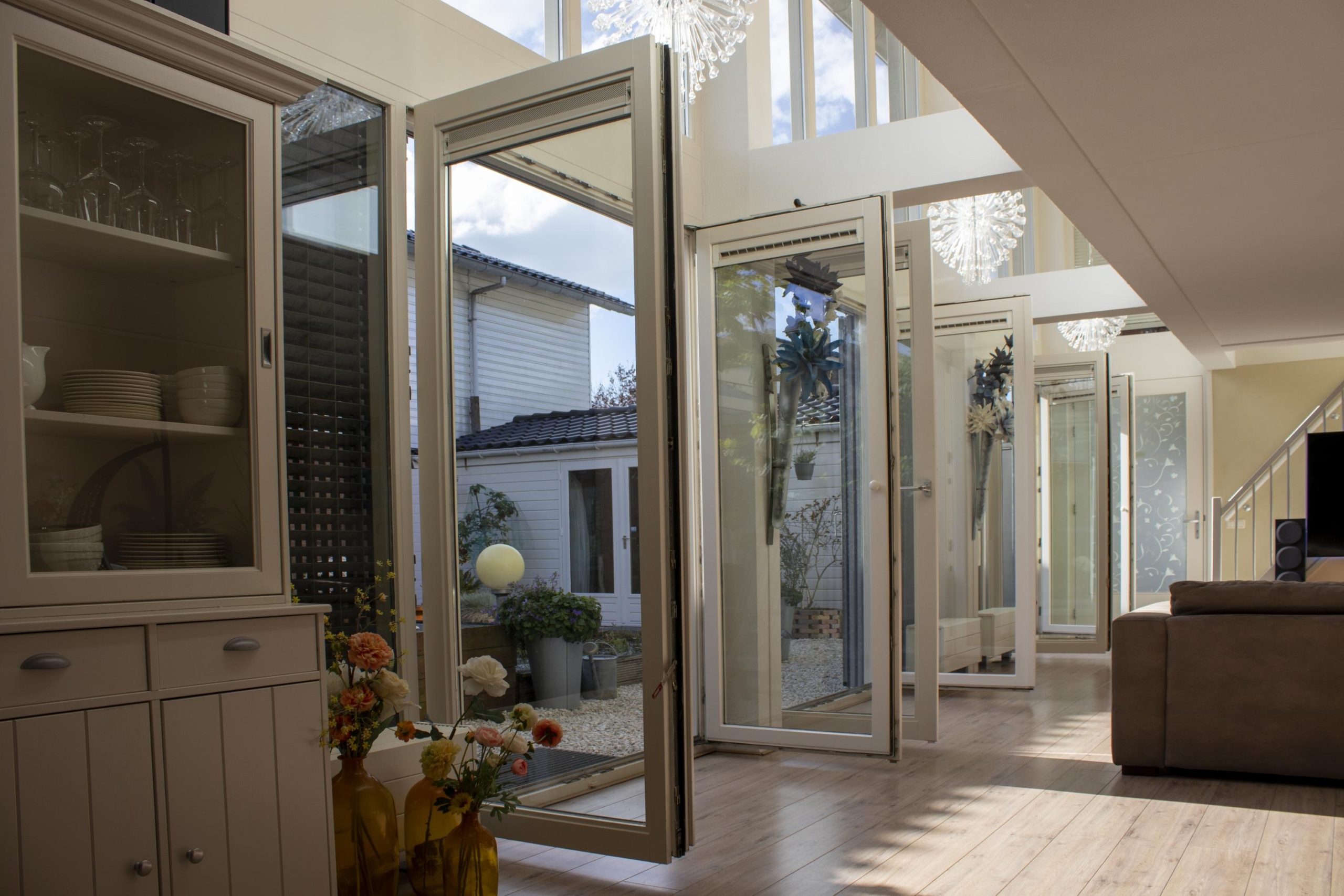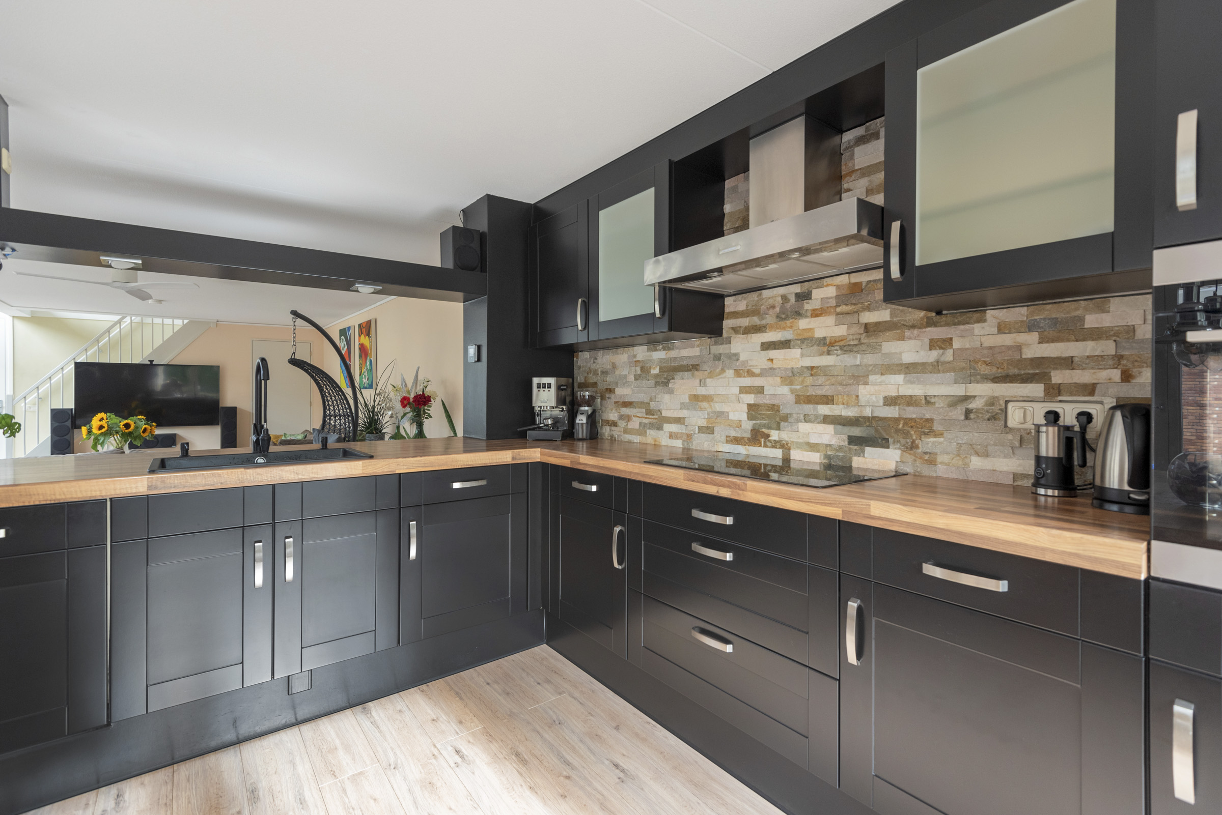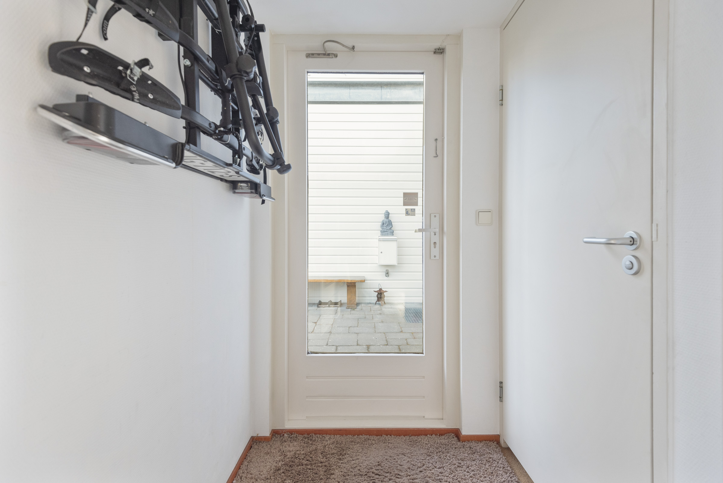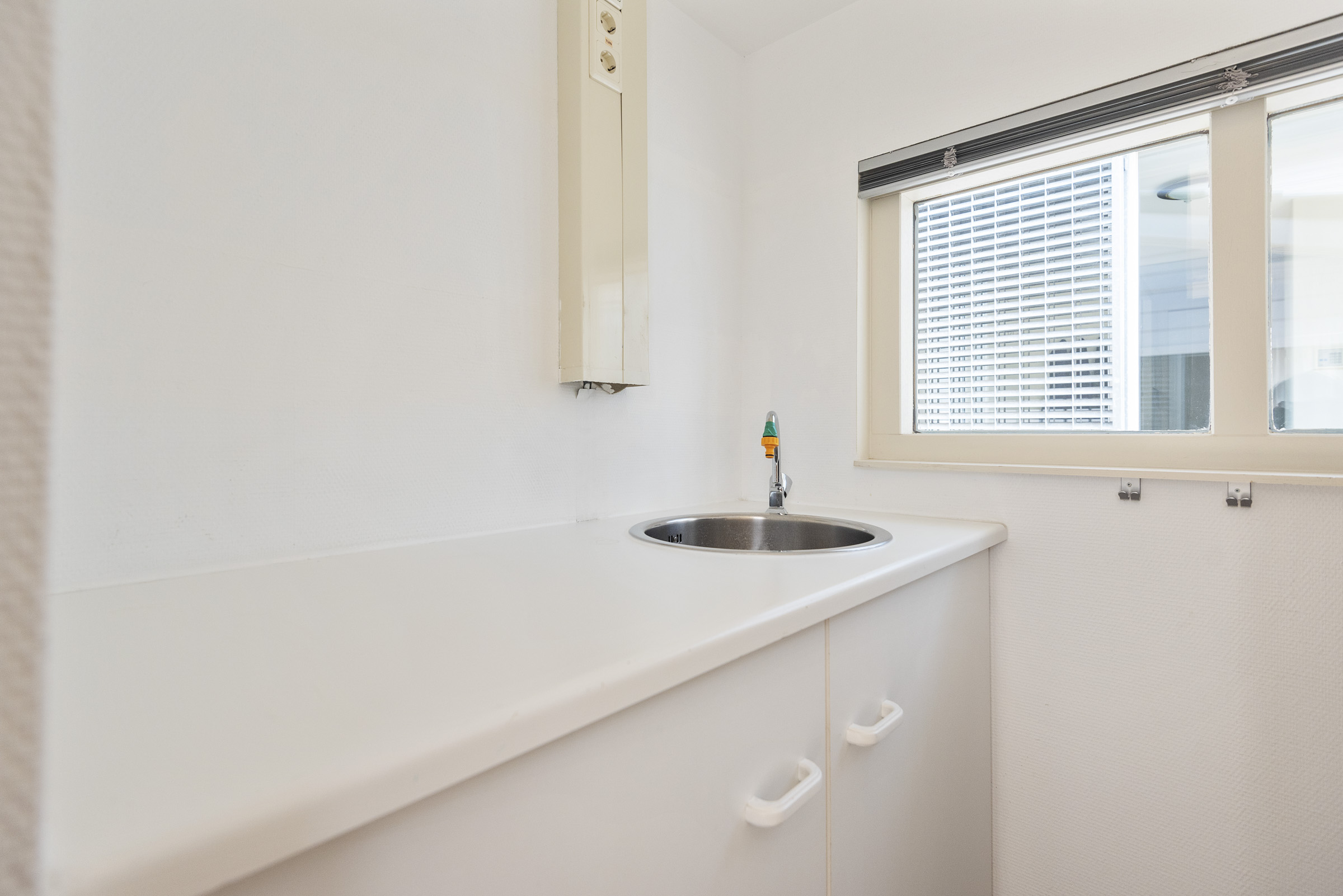 Entree, hal, meterkast, vaste kast, wachtruimte naar de praktijkruimte. De ruime praktijkruimte kan natuurlijk ook als kantoor of 5e slaapkamer gebruikt worden, deze ruimte wordt zowel door een radiator als twee infrarood panelen verwarmd. De praktijkruimte heeft een eigen deur naar de voortuin. De woonkamer, met praktische trapkast, kenmerkt zich door de vele raampartijen, wat een heerlijk daglicht geeft in de woning. Hier zijn een viertal dubbel openslaande deuren die toegang geven tot de tuin. De ruime half-open keuken is aan de achterzijde gelegen met een gezellig barretje aan het schiereiland. De keuken beschikt over de volgende inbouwapparatuur: koel-vriescombi (nieuw), stoomoven (nieuw), kookplaat, afzuigkap en vaatwasser. Ook hier tref je dubbel openslaande deuren naar de tuin.