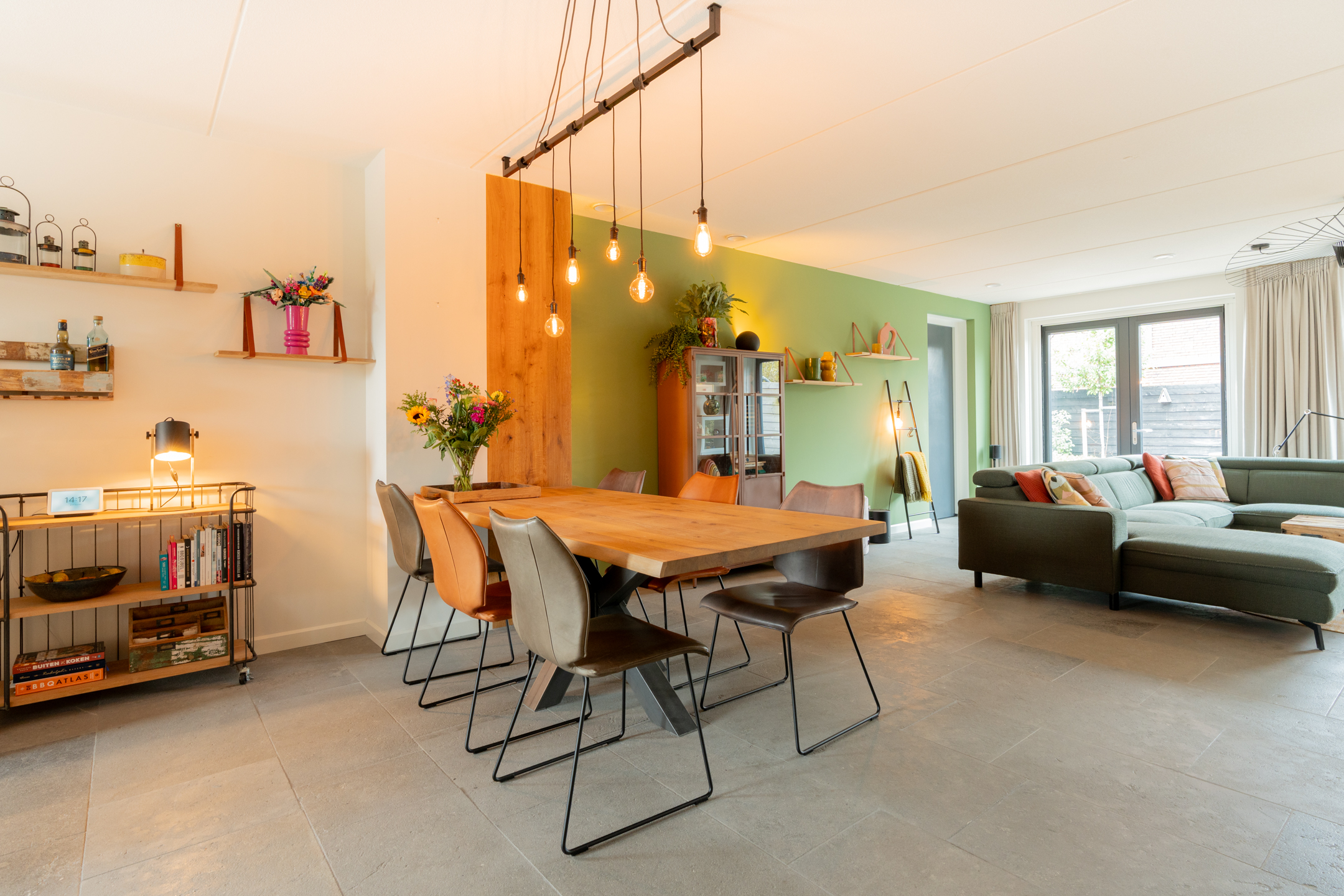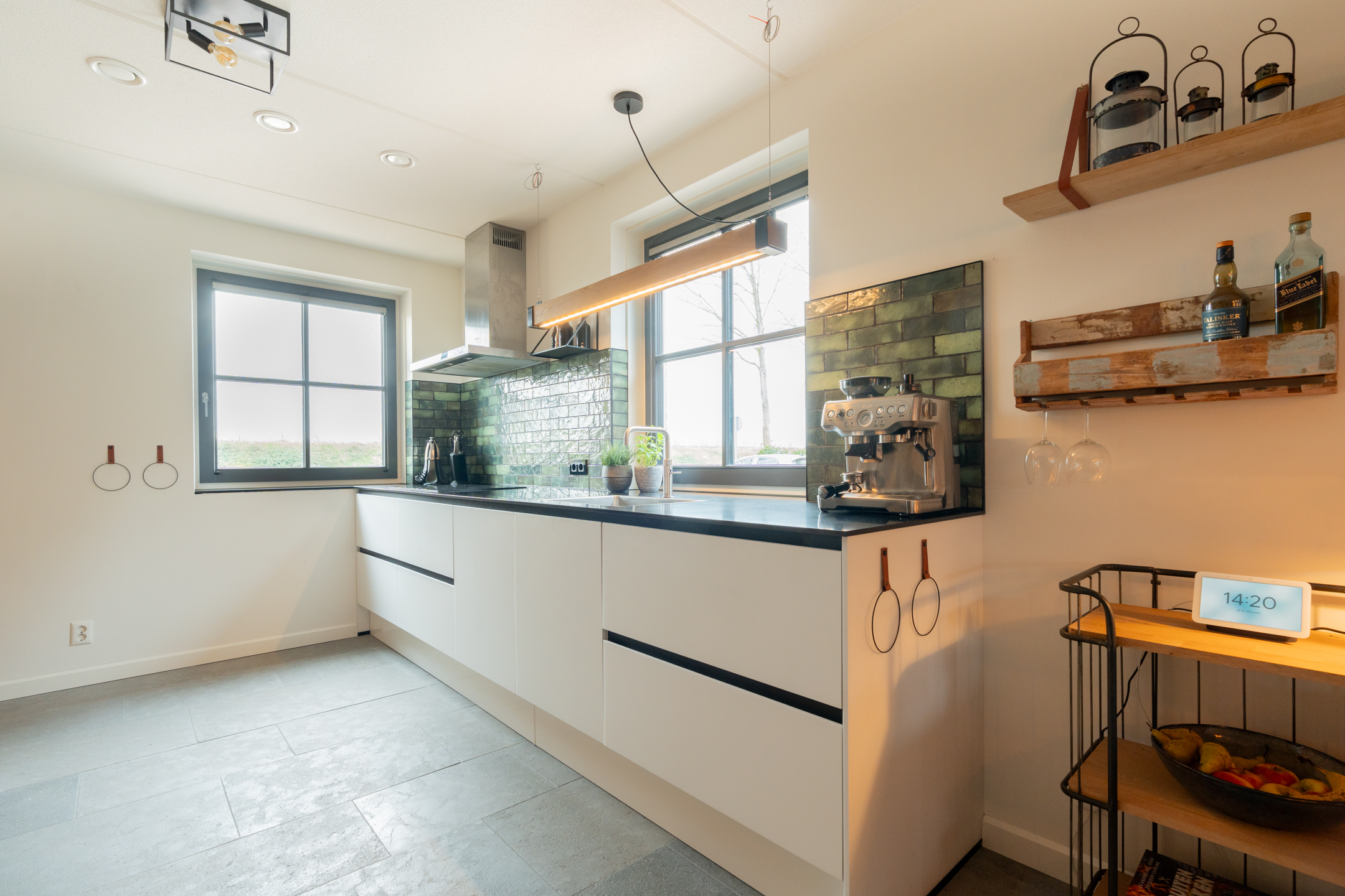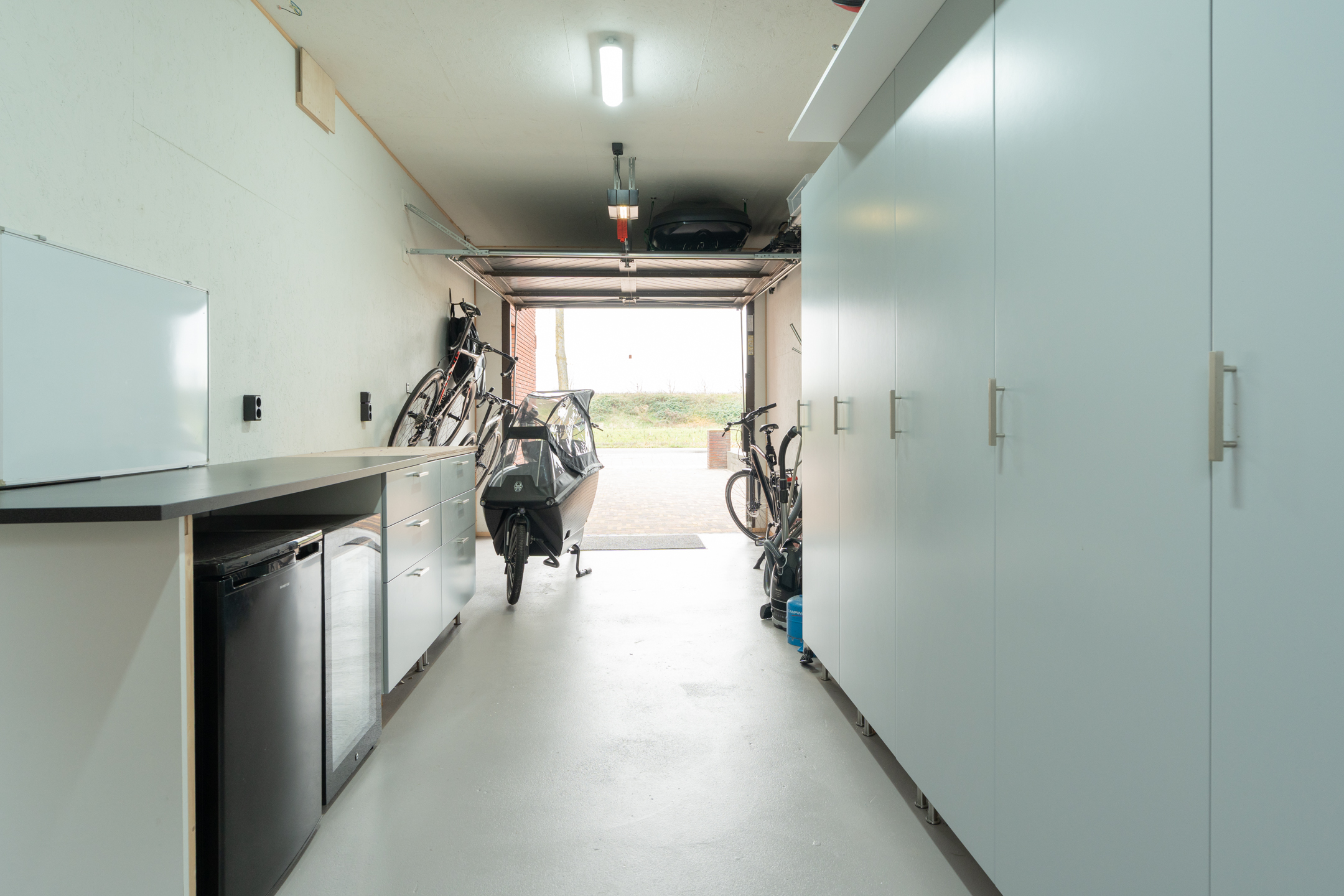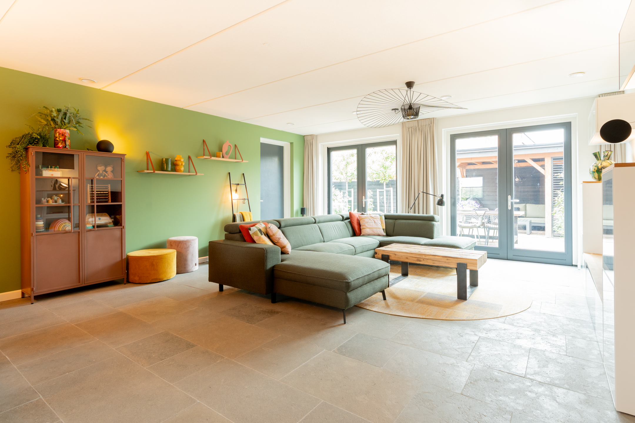 Binnenkomen doe je in een ruime hal met moderne meterkast met glasvezel. Strak afgewerkt toilet. De uitgebouwde, tuingerichte woonkamer straalt luxe uit met een natuurstenen vloer, vloerverwarming en dubbele openslaande deuren naar de fraai aangelegde achtertuin. De royale keuken aan de voorzijde is een echte eyecatcher: uitgerust met alle denkbare apparatuur; kookplaat, afzuigkap, oven, combi-oven, grote koelkast en ernaast een aparte grote vriezer, vaatwasser en Quooker, een stijlvolle groene tegelwand en fingerprint proof kastfronten. De garage, voorzien van dak- en muurisolatie, is bereikbaar vanuit zowel de tuin als de woonkamer en beschikt over een elektrische roldeur.