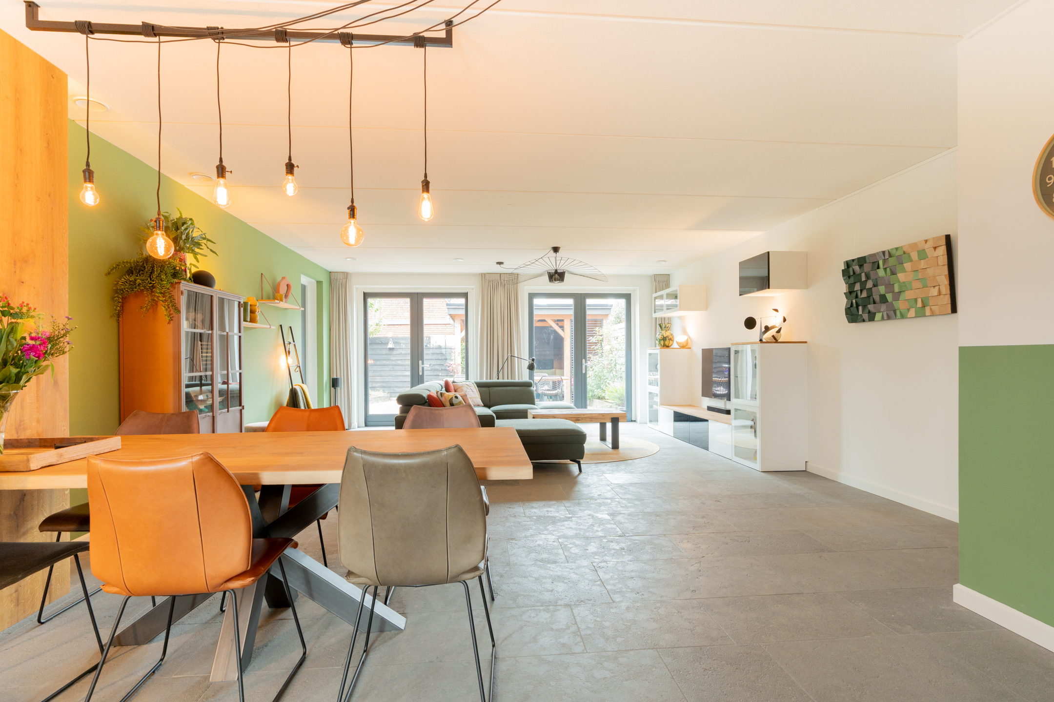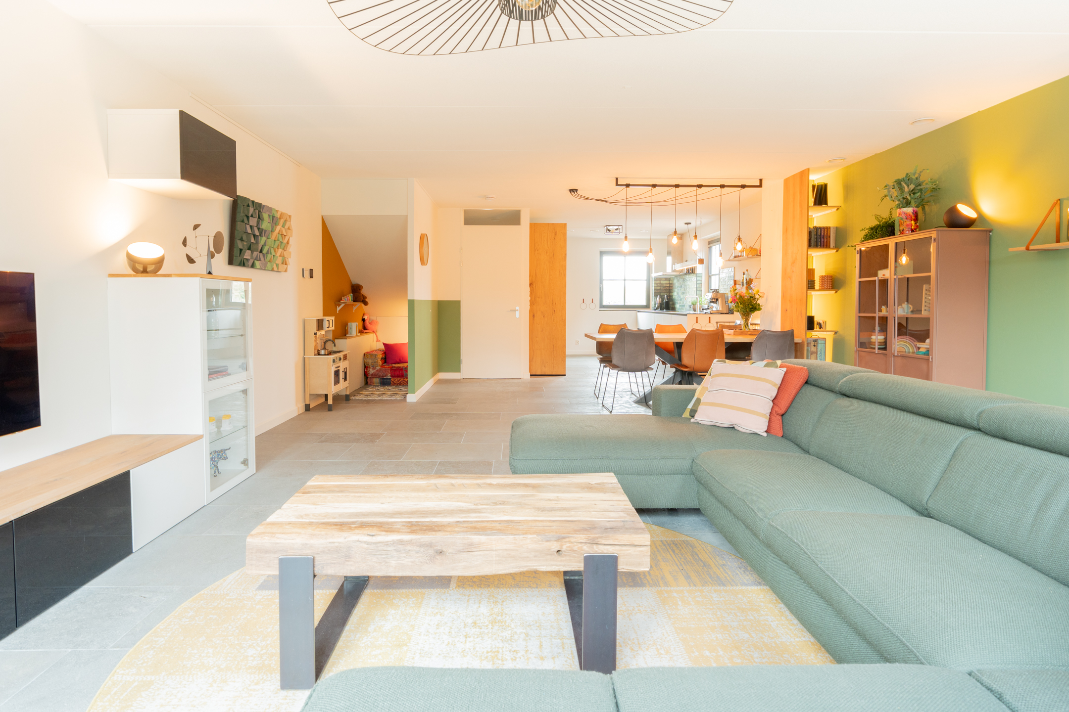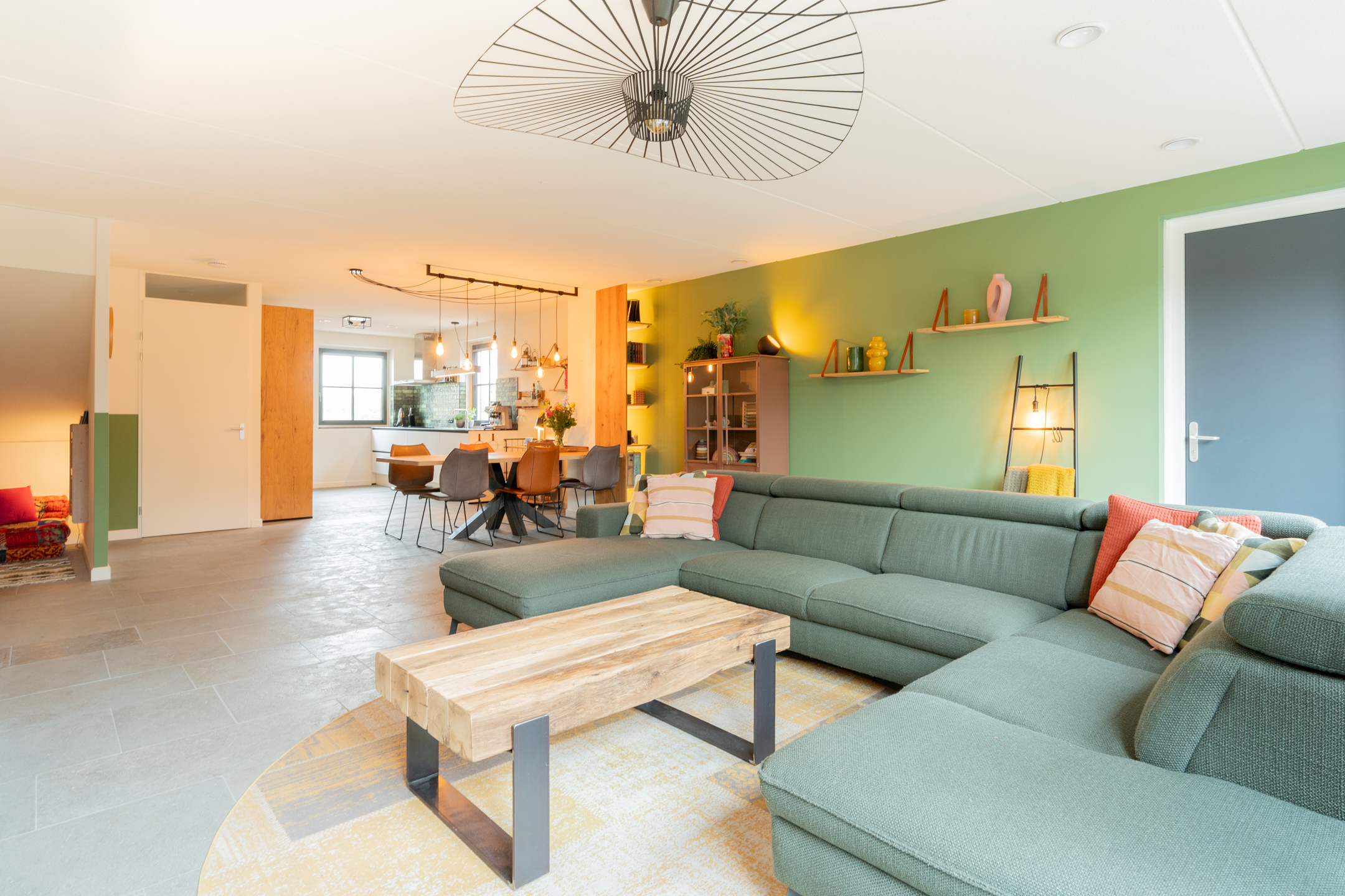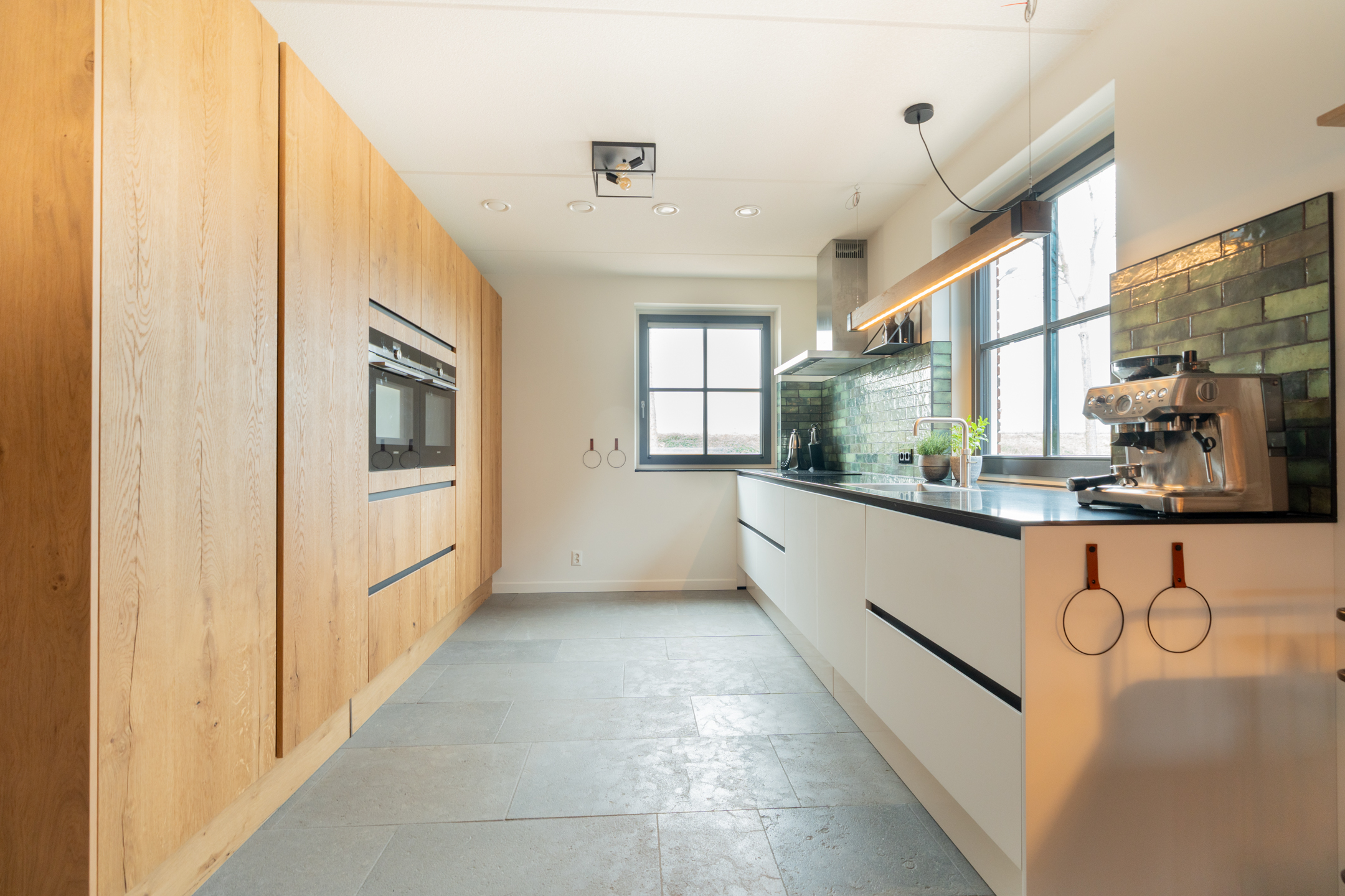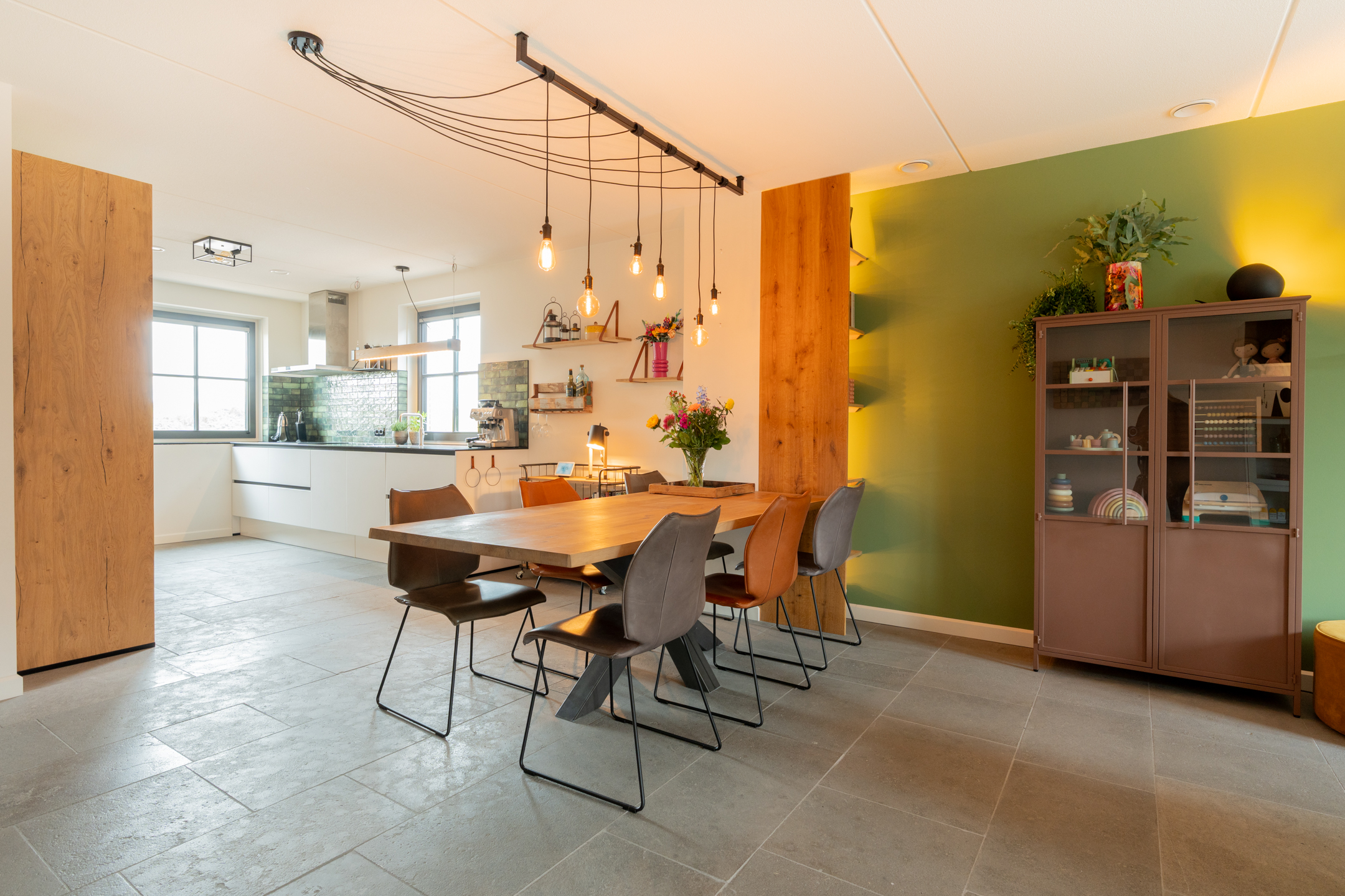 Binnenkomen doe je in een ruime hal met moderne meterkast met glasvezel. Strak afgewerkt toilet. De uitgebouwde, tuingerichte woonkamer straalt luxe uit met een natuurstenen vloer, vloerverwarming en dubbele openslaande deuren naar de fraai aangelegde achtertuin. De royale keuken aan de voorzijde is een echte eyecatcher: uitgerust met alle denkbare apparatuur; kookplaat, afzuigkap, oven, combi-oven, grote koelkast en ernaast een aparte grote vriezer, vaatwasser en Quooker, een stijlvolle groene tegelwand en fingerprint proof kastfronten. De garage, voorzien van dak- en muurisolatie, is bereikbaar vanuit zowel de tuin als de woonkamer en beschikt over een elektrische roldeur.