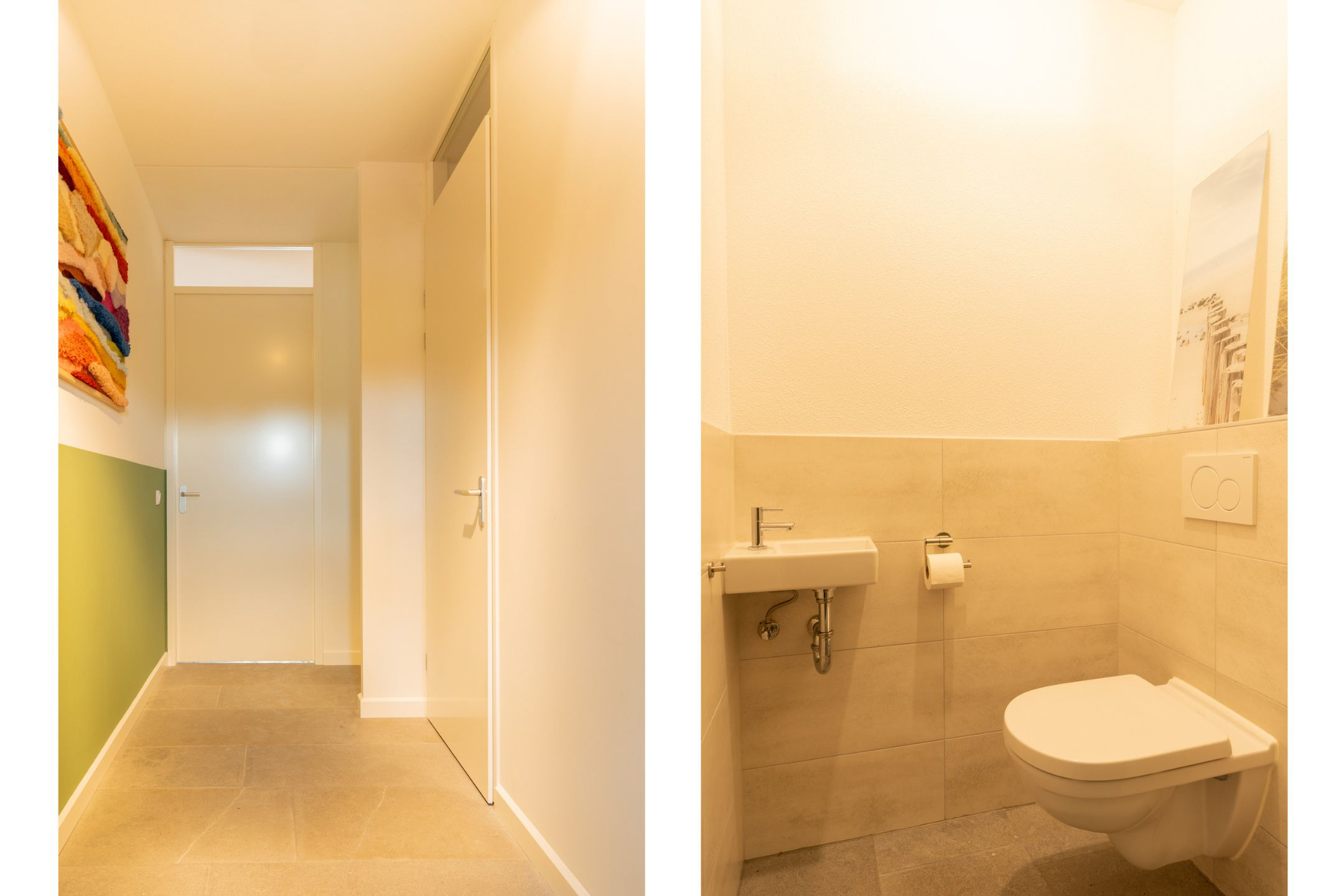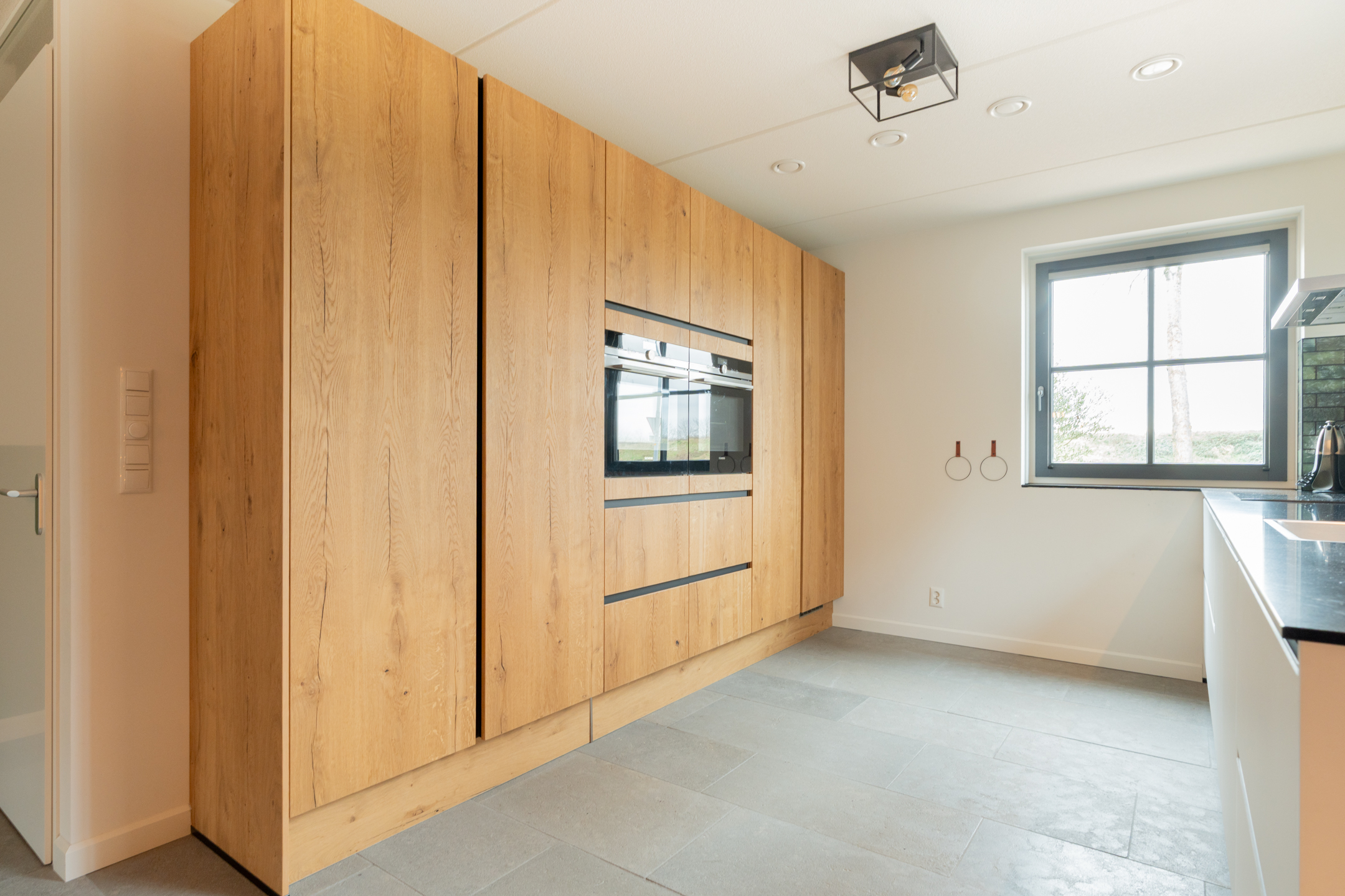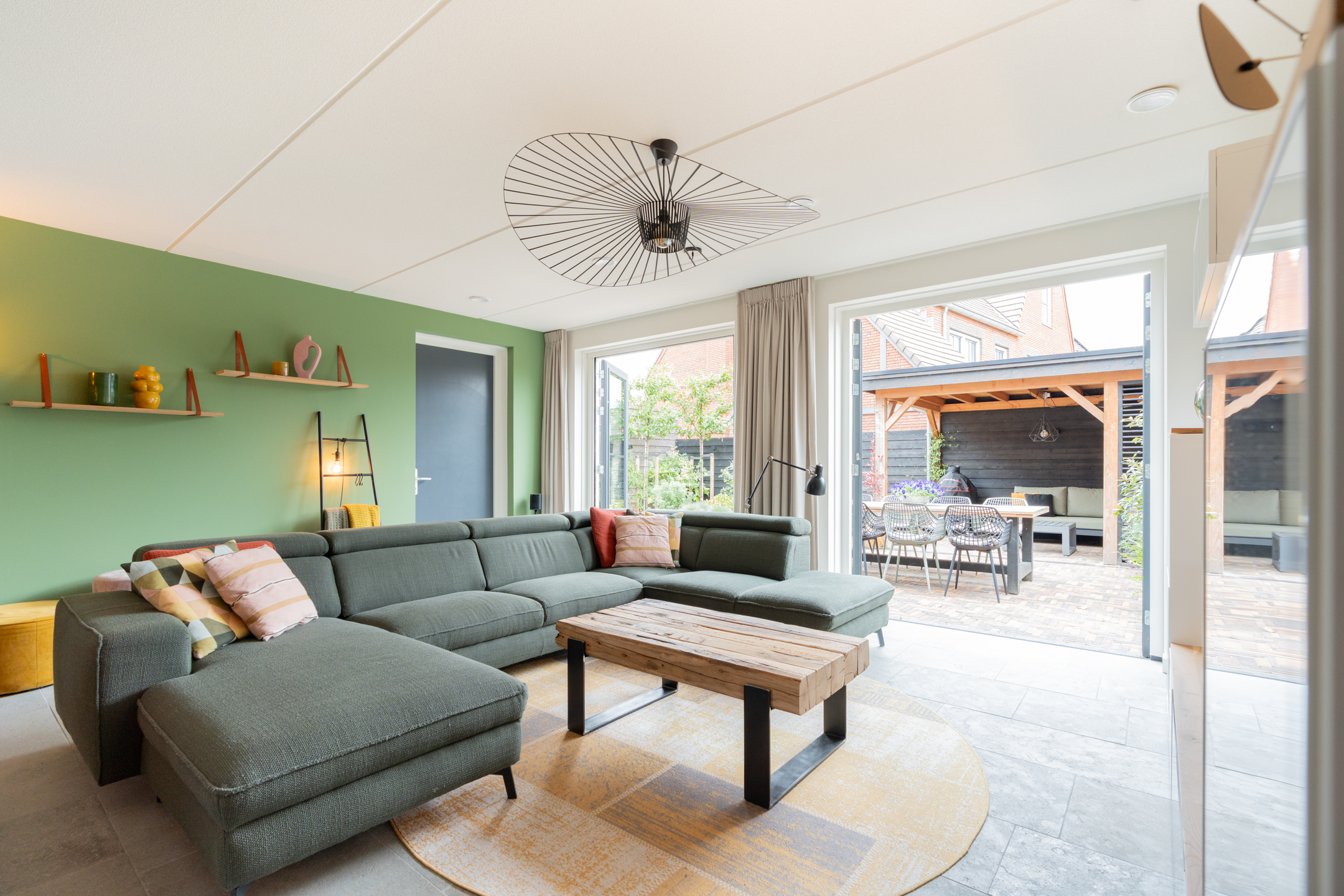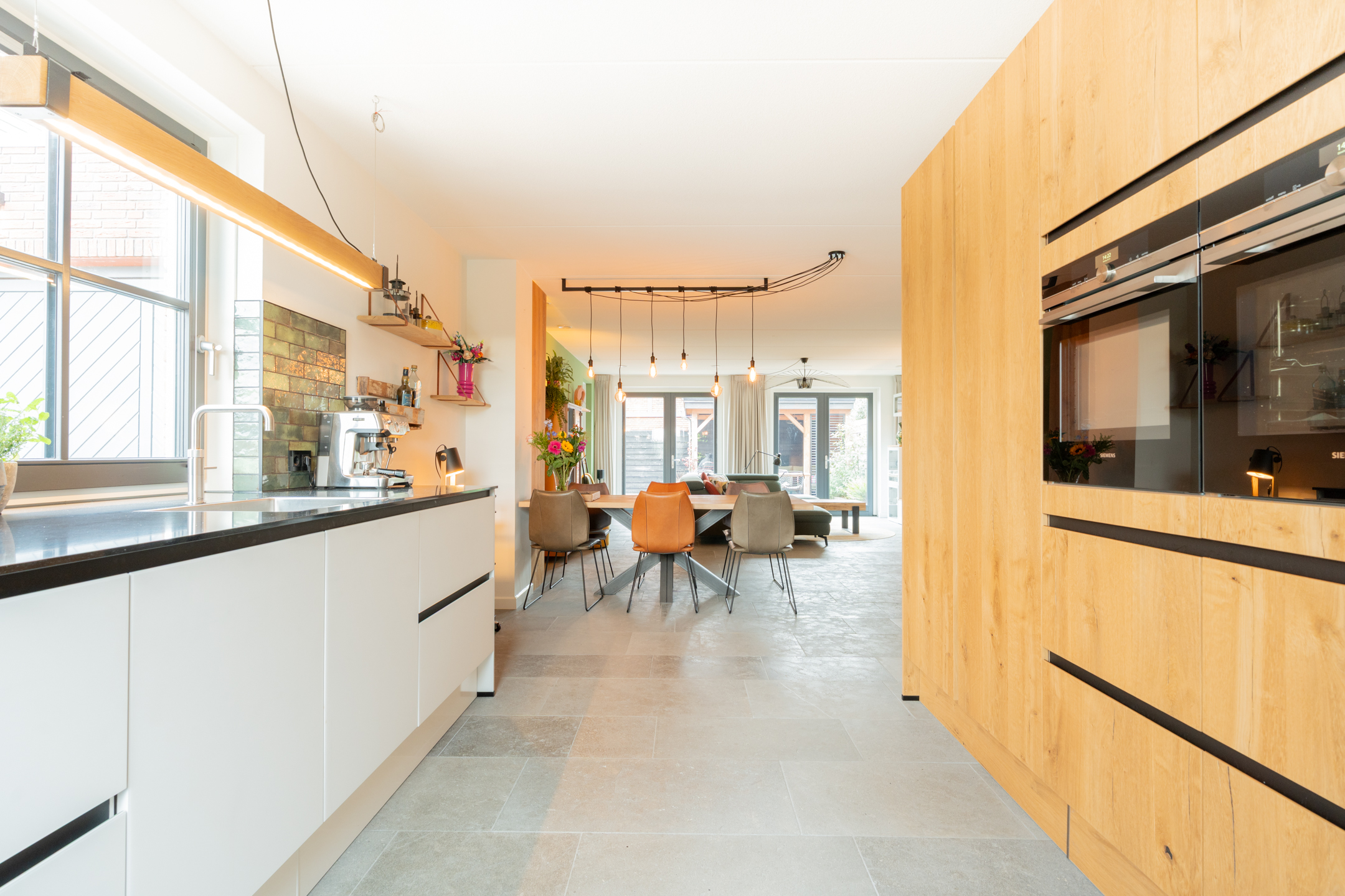 Binnenkomen doe je in een ruime hal met moderne meterkast met glasvezel. Strak afgewerkt toilet. De uitgebouwde, tuingerichte woonkamer straalt luxe uit met een natuurstenen vloer, vloerverwarming en dubbele openslaande deuren naar de fraai aangelegde achtertuin. De royale keuken aan de voorzijde is een echte eyecatcher: uitgerust met alle denkbare apparatuur; kookplaat, afzuigkap, oven, combi-oven, grote koelkast en ernaast een aparte grote vriezer, vaatwasser en Quooker, een stijlvolle groene tegelwand en fingerprint proof kastfronten. De garage, voorzien van dak- en muurisolatie, is bereikbaar vanuit zowel de tuin als de woonkamer en beschikt over een elektrische roldeur.