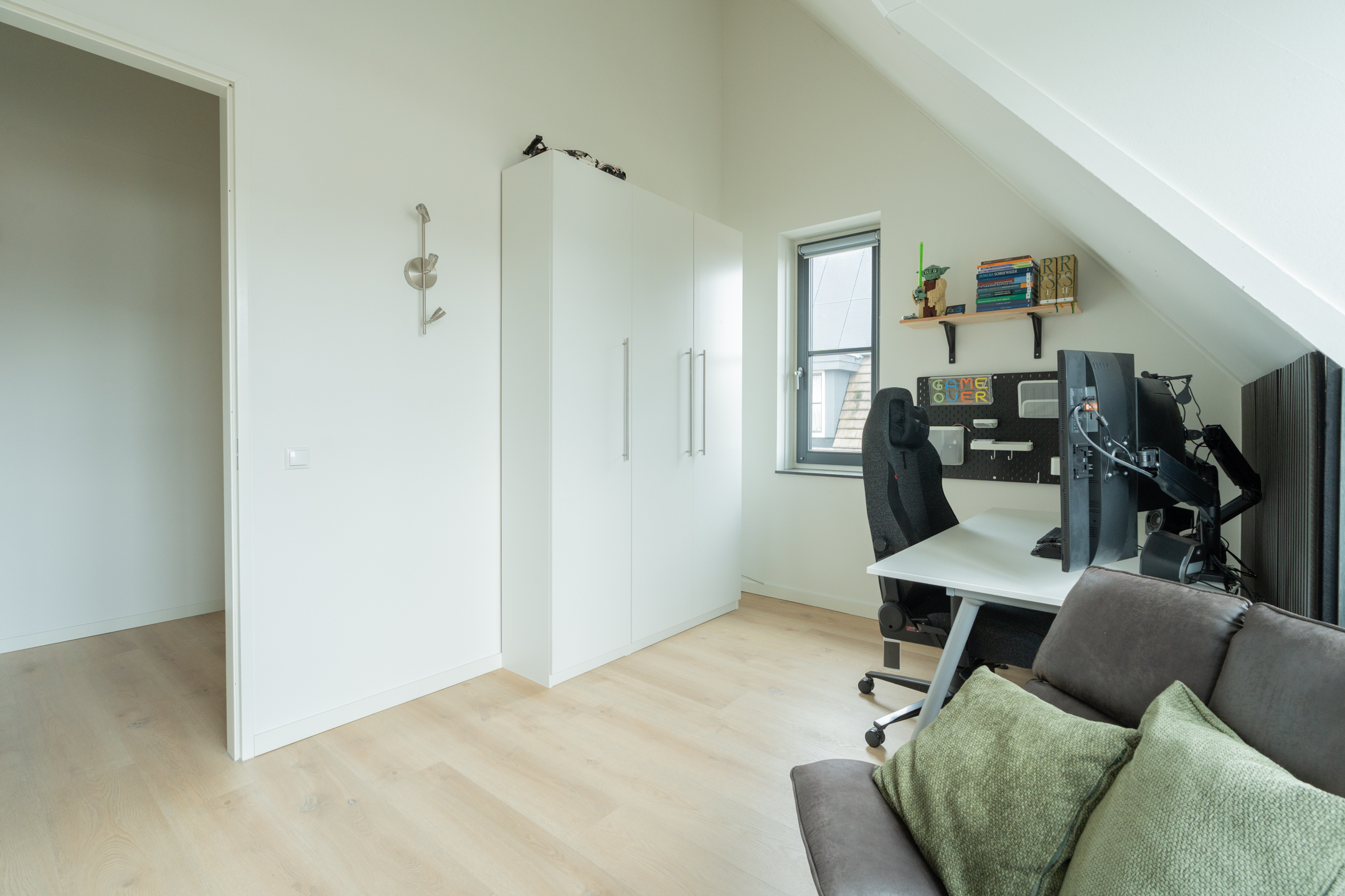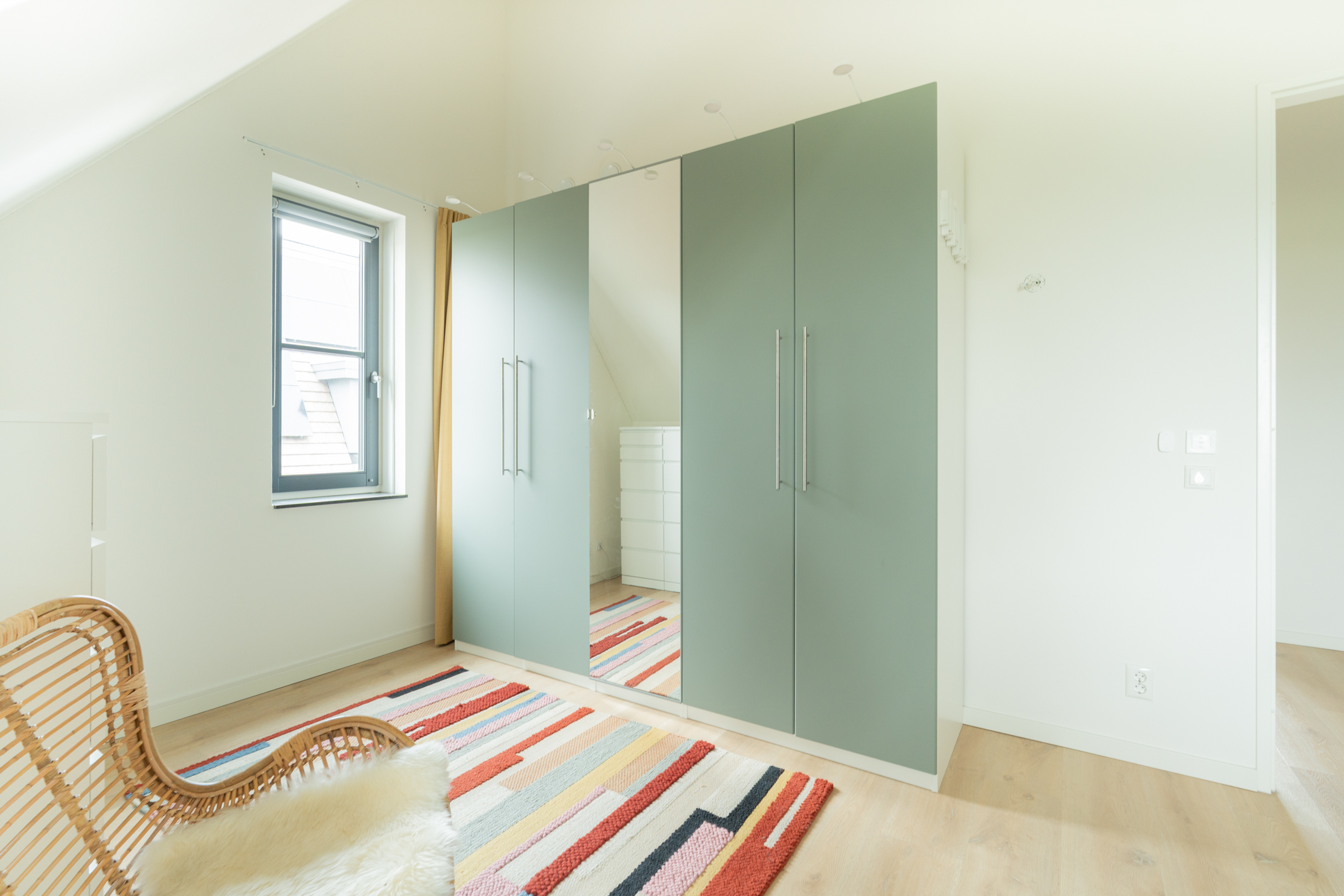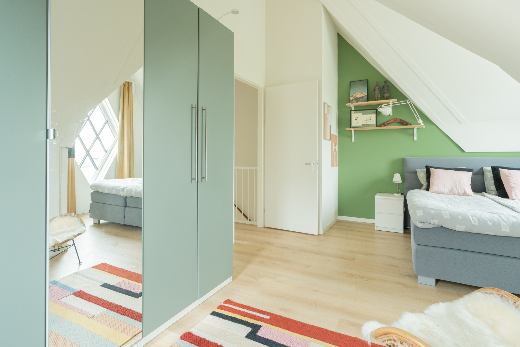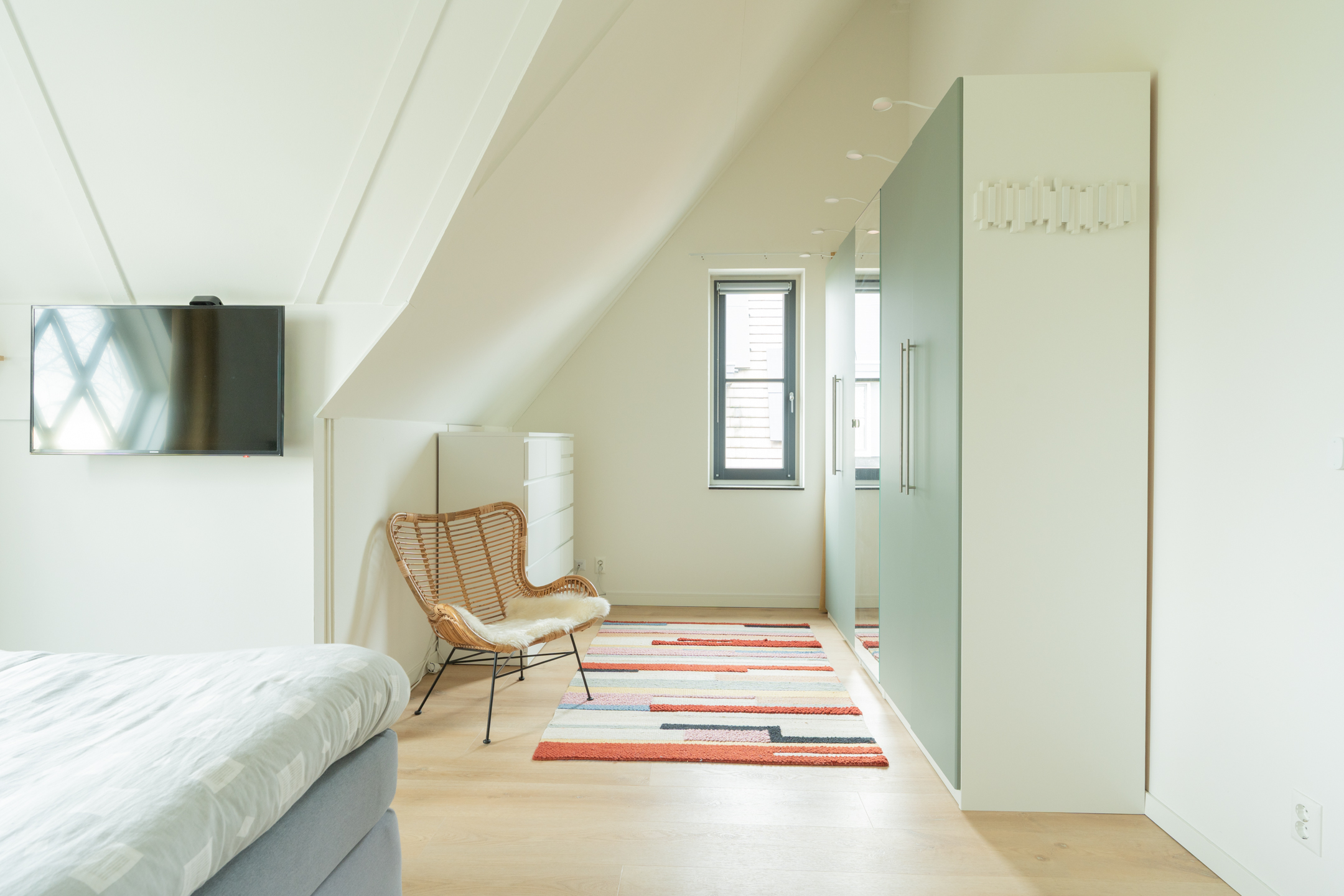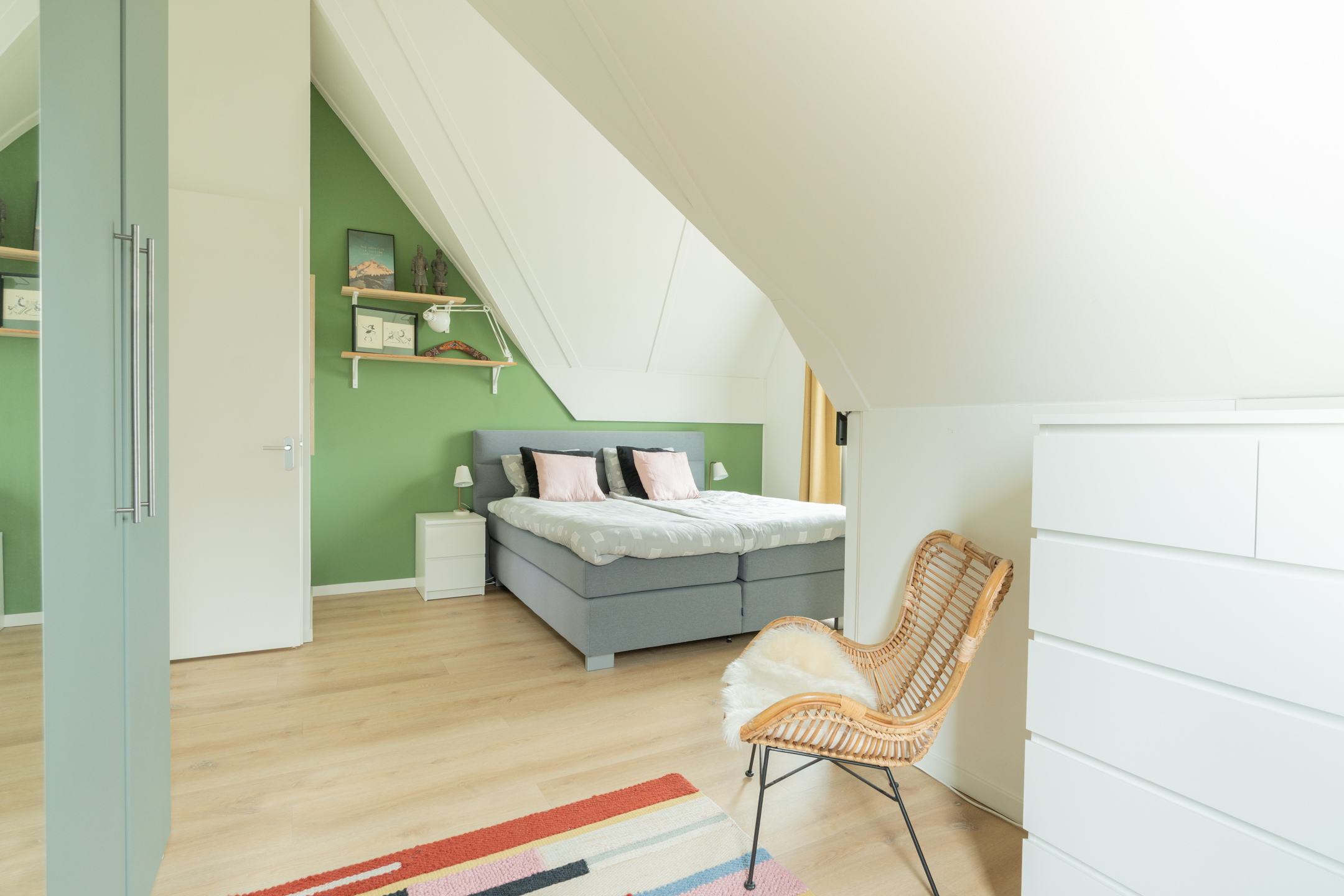 Hier vind je nog twee royale slaapkamers, beide met hoge nok en praktische bergruimte achter de knieschotten. De kamer aan de achterzijde beschikt bovendien over een dakkapel.