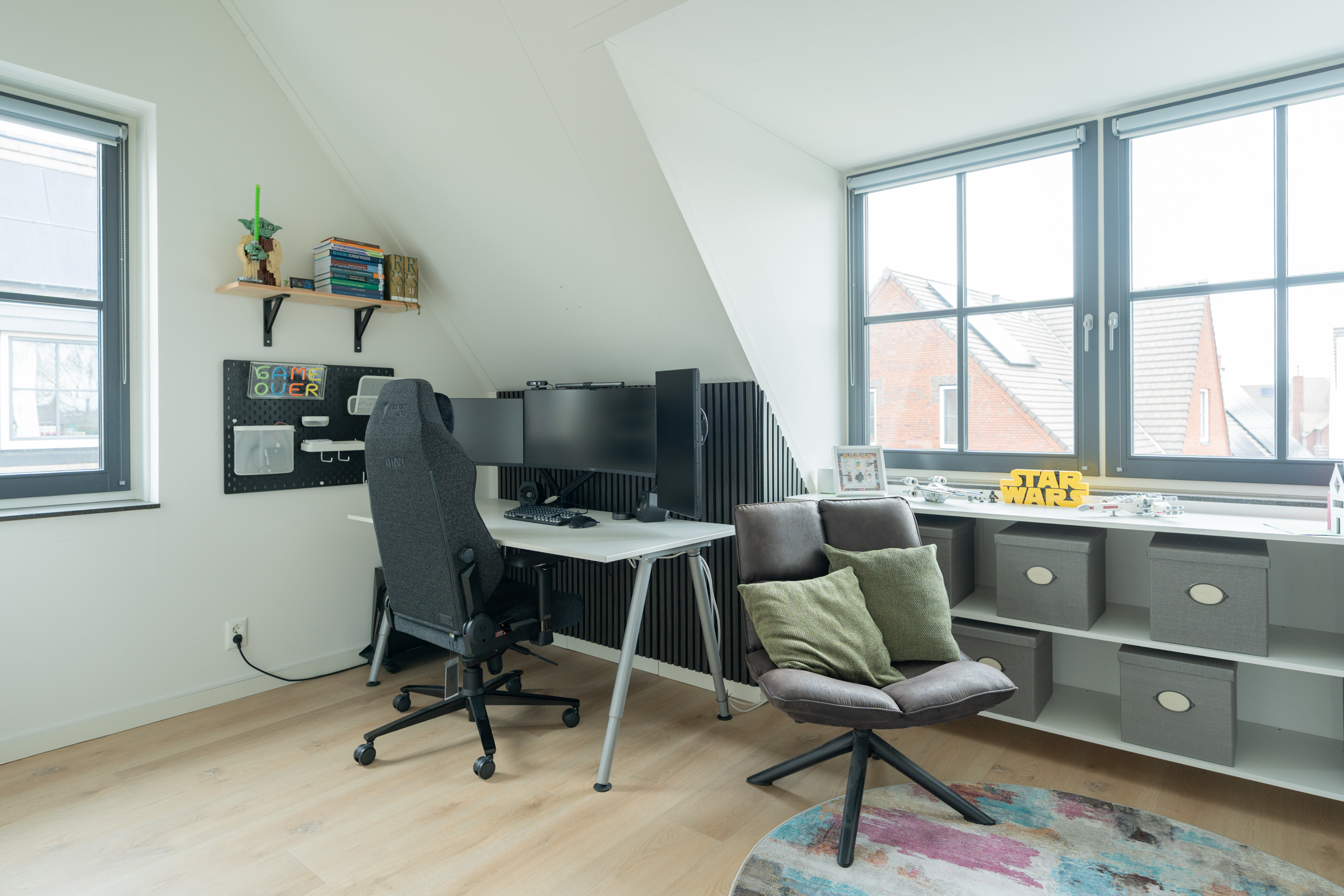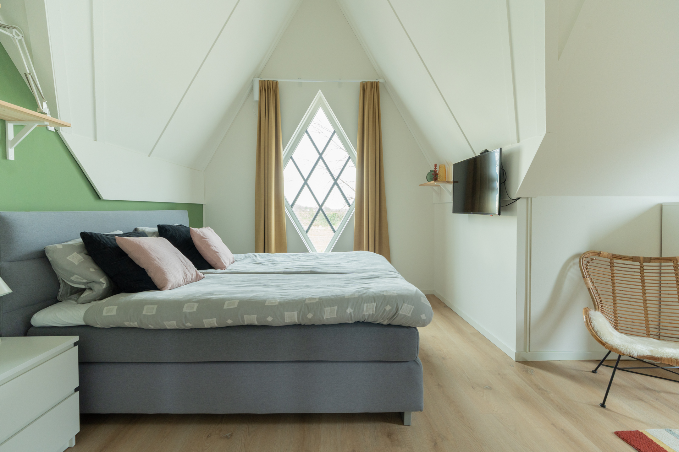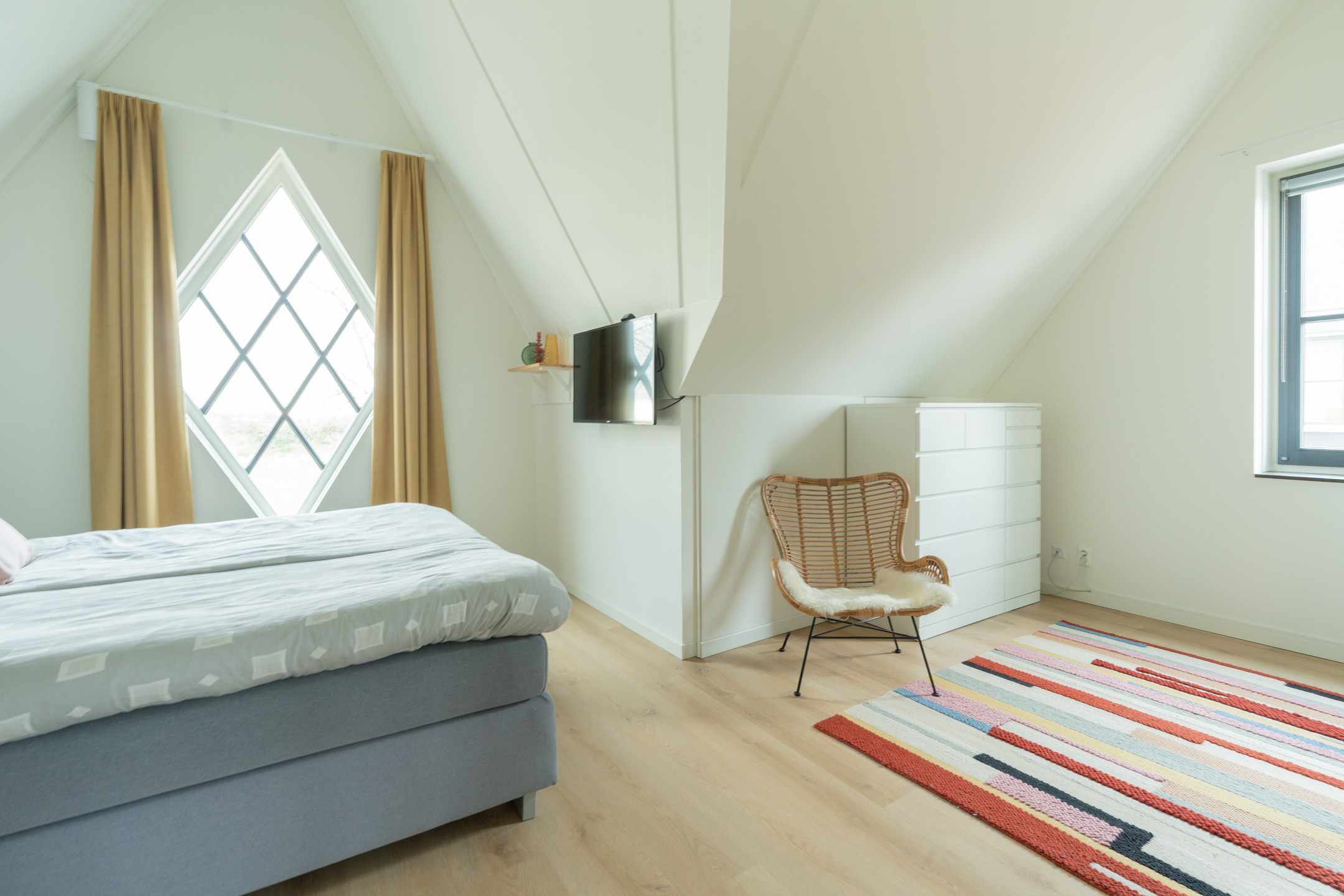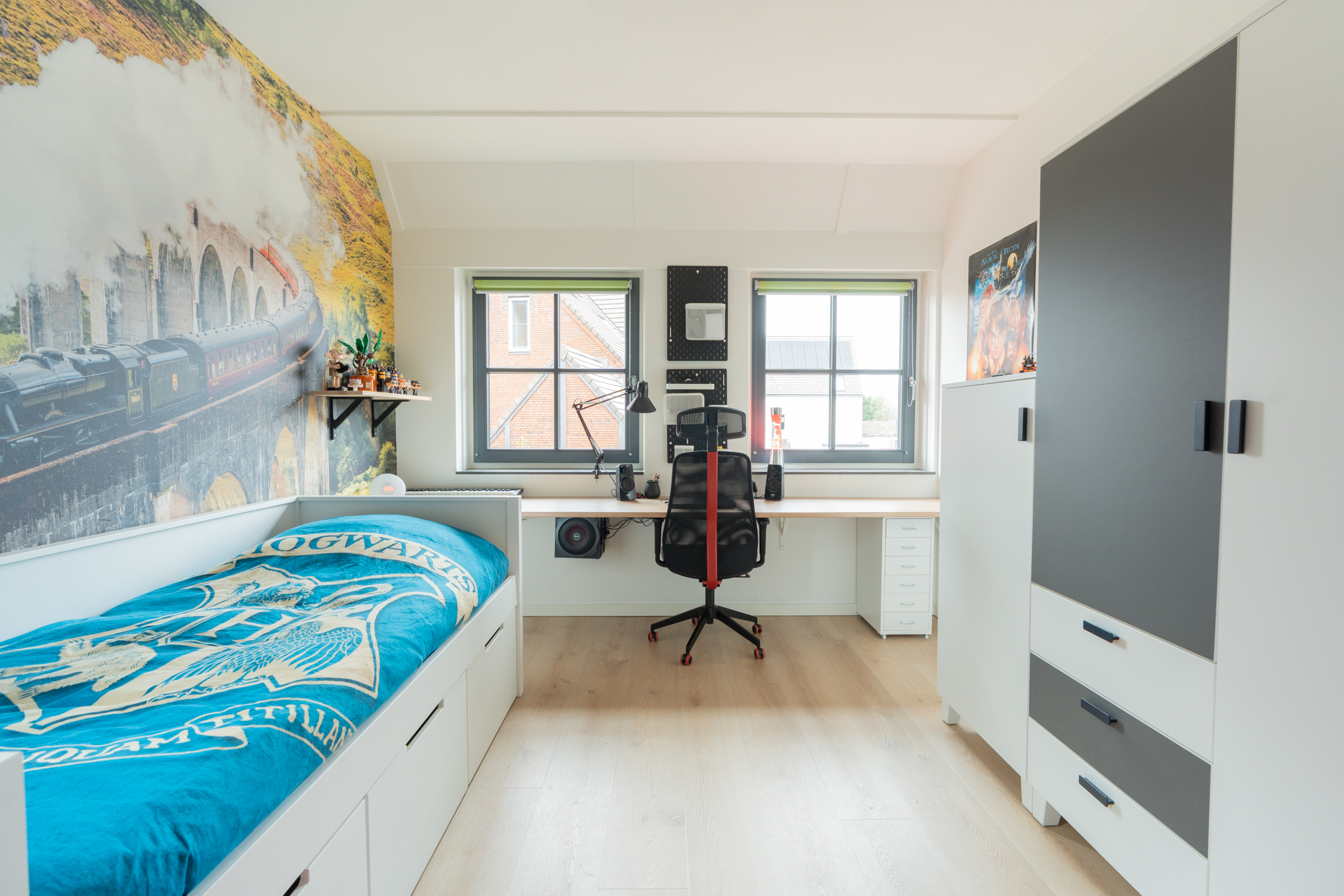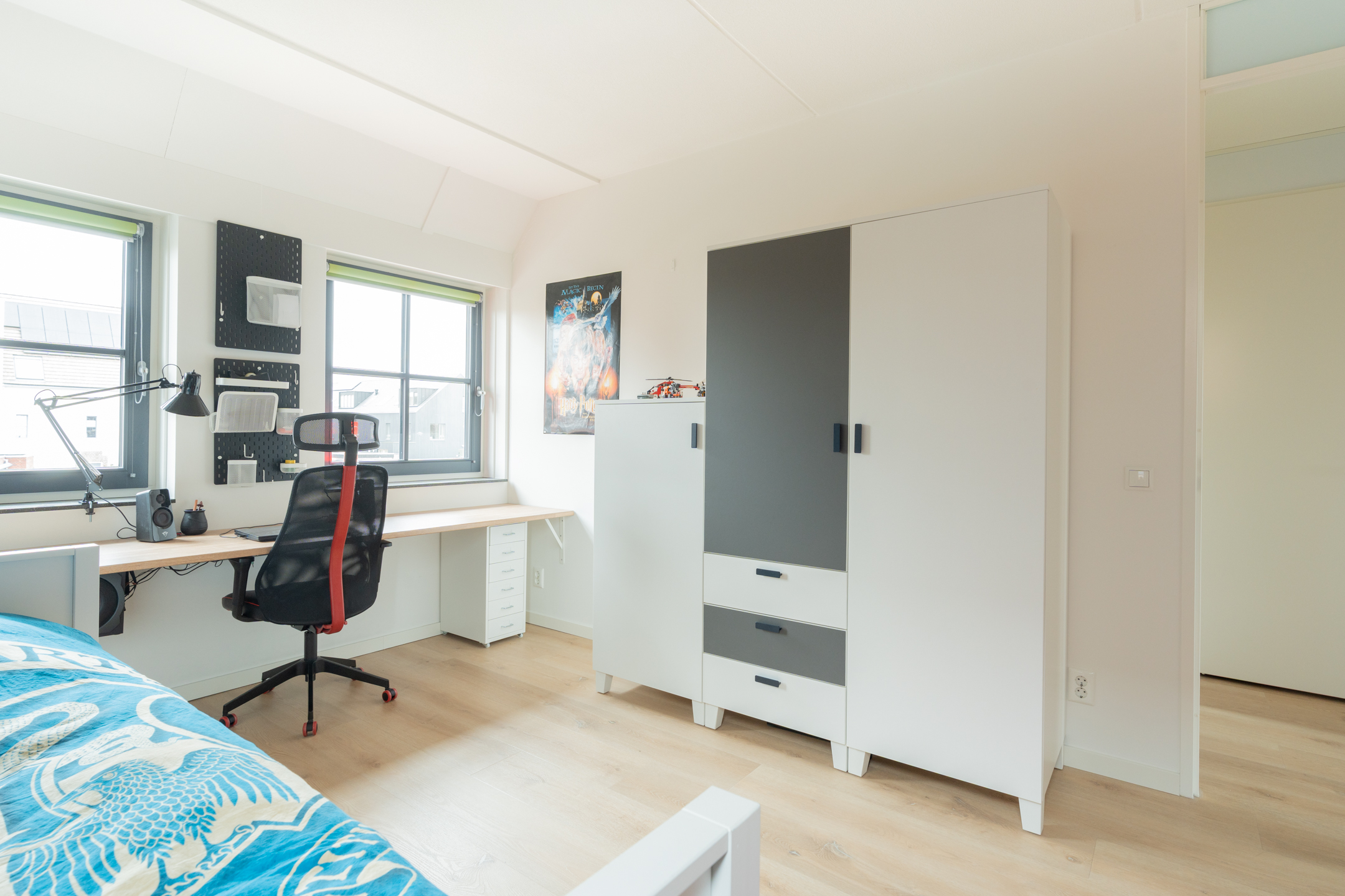 Hier vind je nog twee royale slaapkamers, beide met hoge nok en praktische bergruimte achter de knieschotten. De kamer aan de achterzijde beschikt bovendien over een dakkapel.