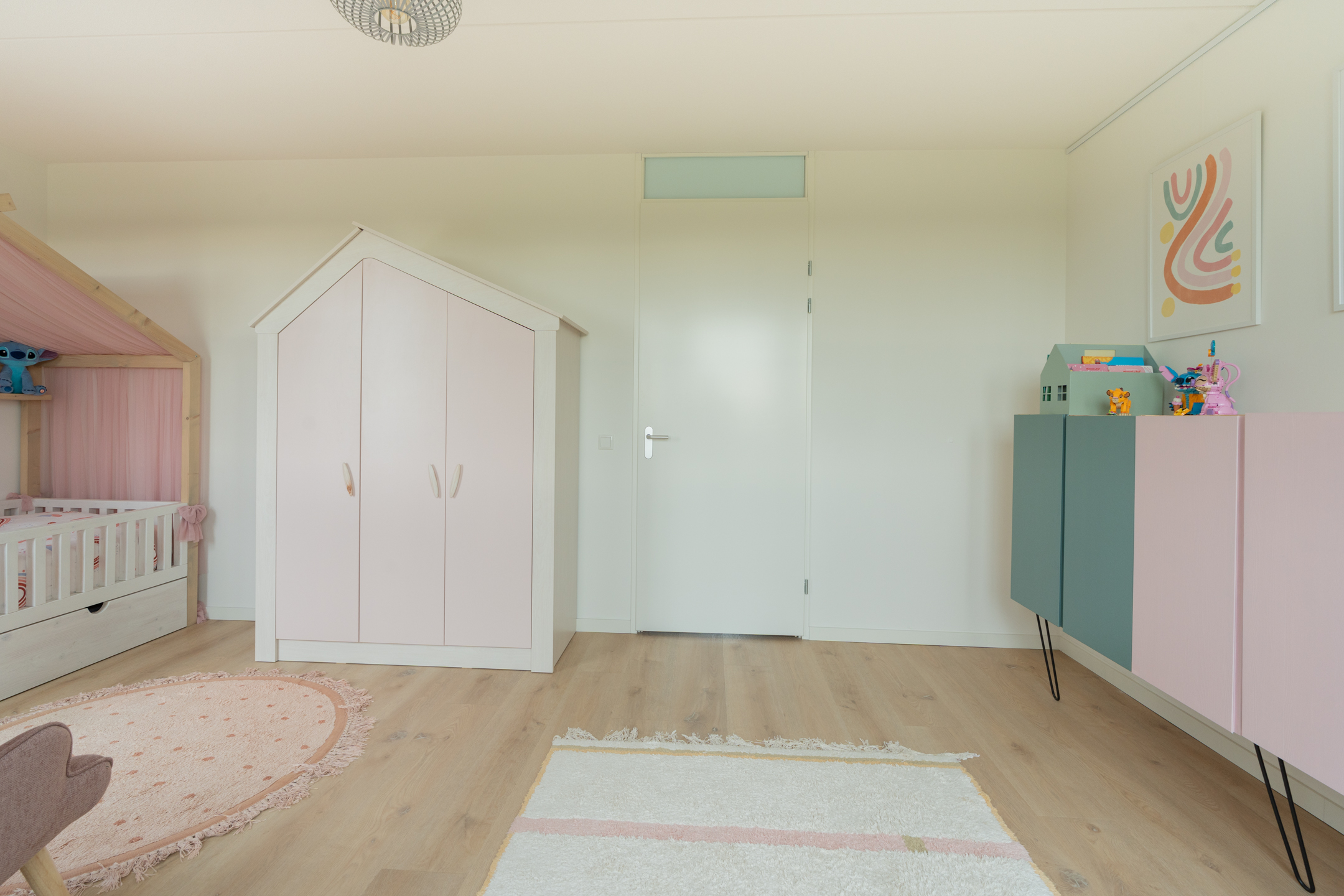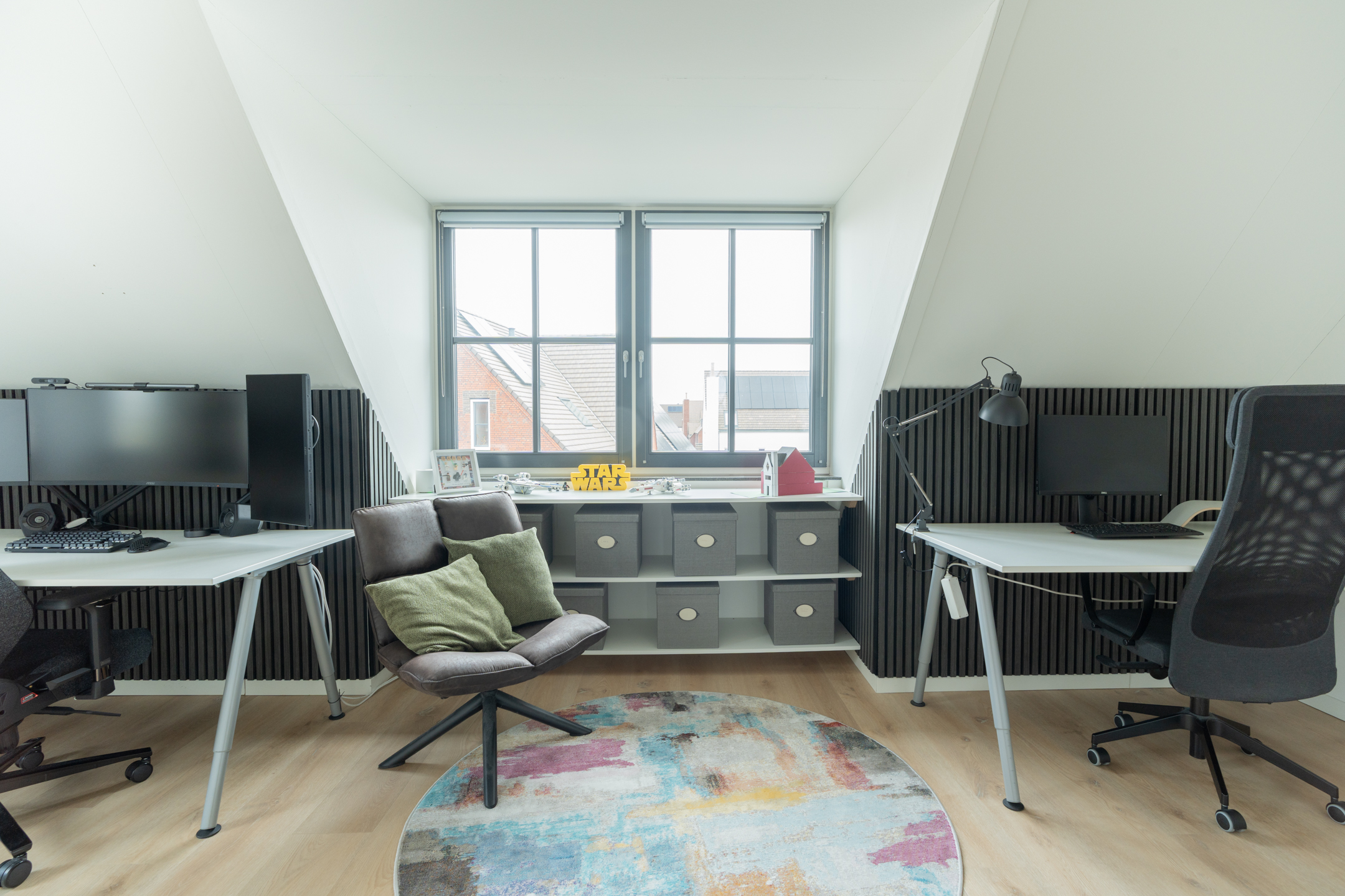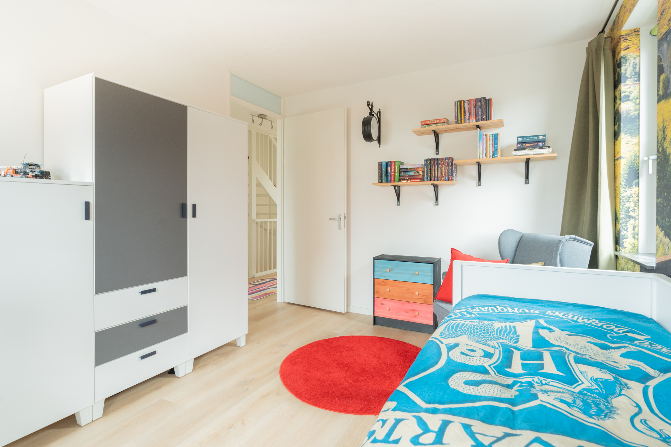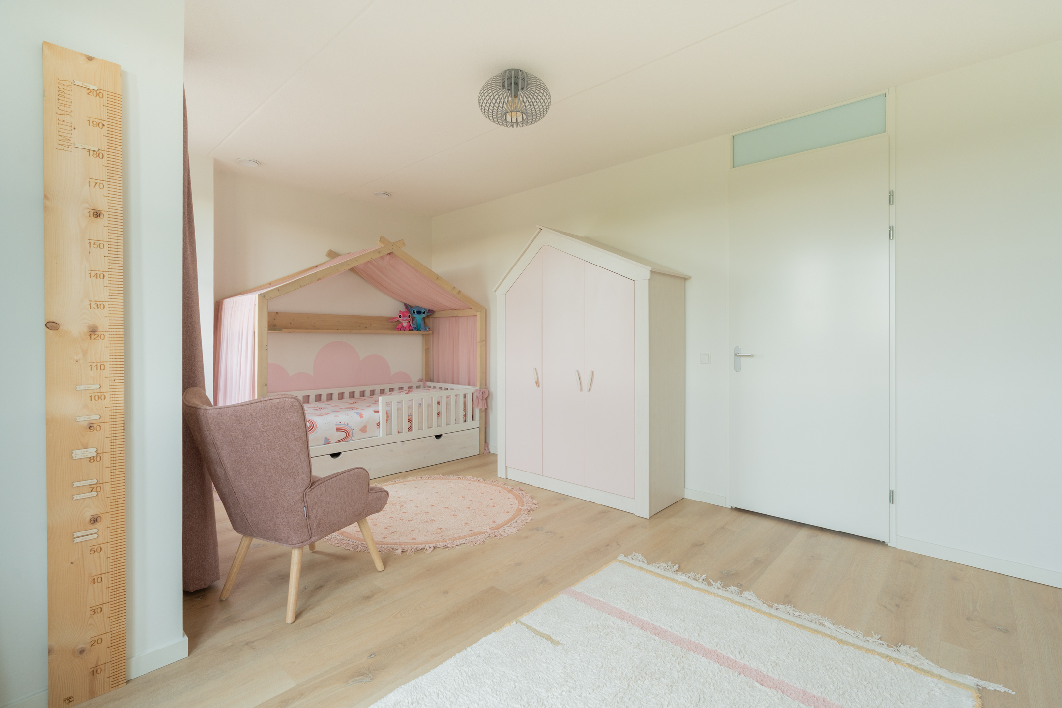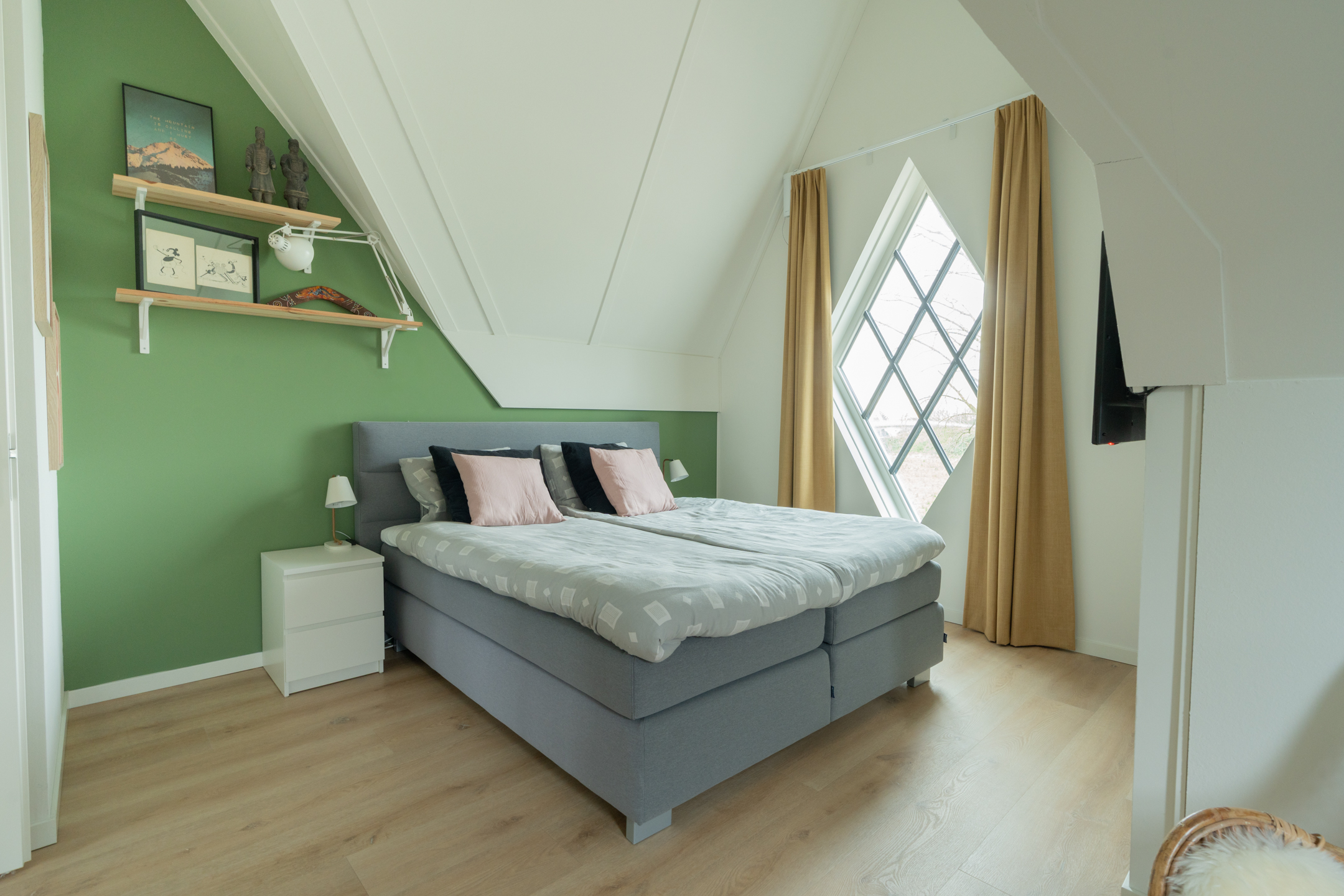 Hier vind je nog twee royale slaapkamers, beide met hoge nok en praktische bergruimte achter de knieschotten. De kamer aan de achterzijde beschikt bovendien over een dakkapel.