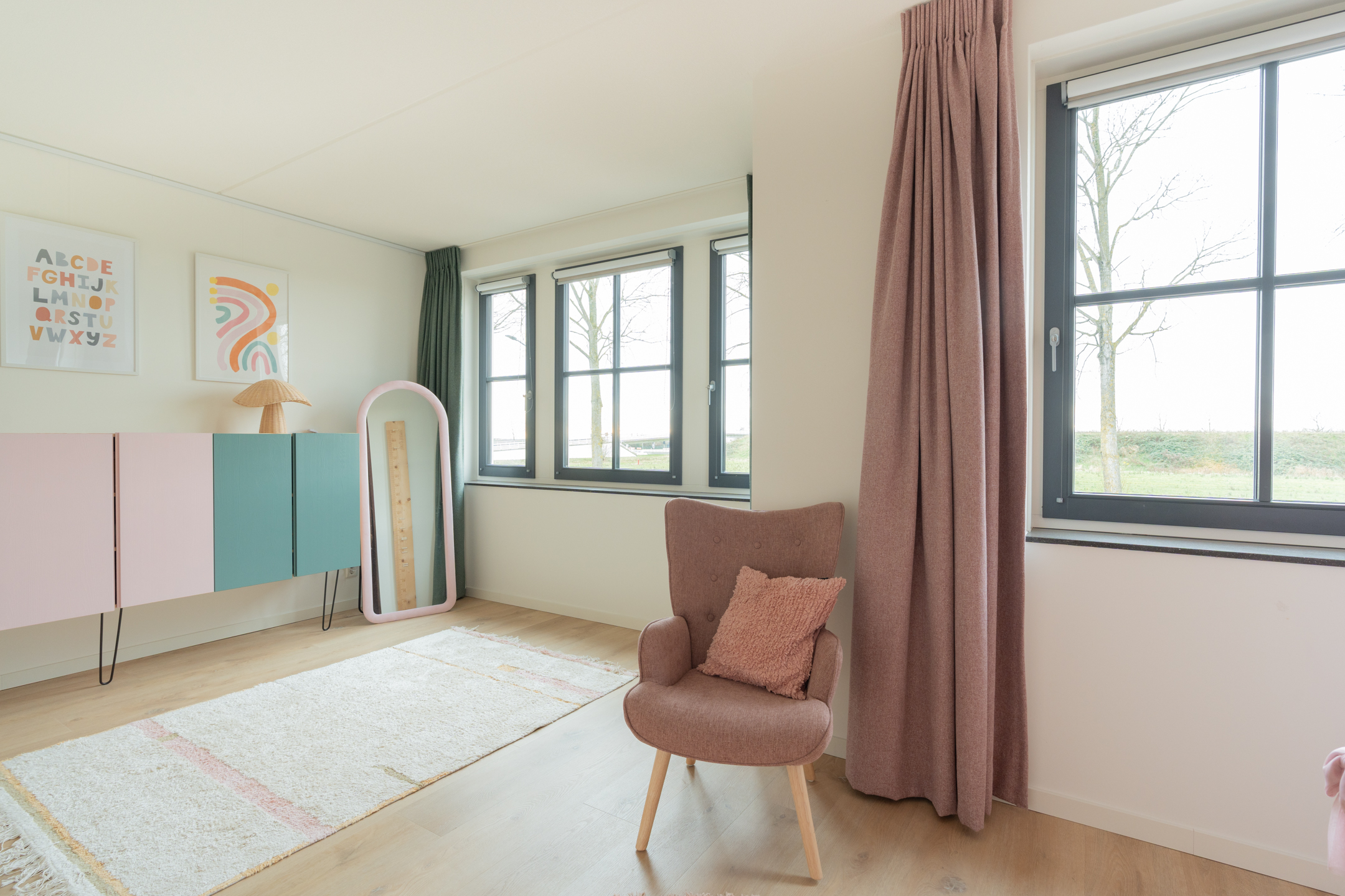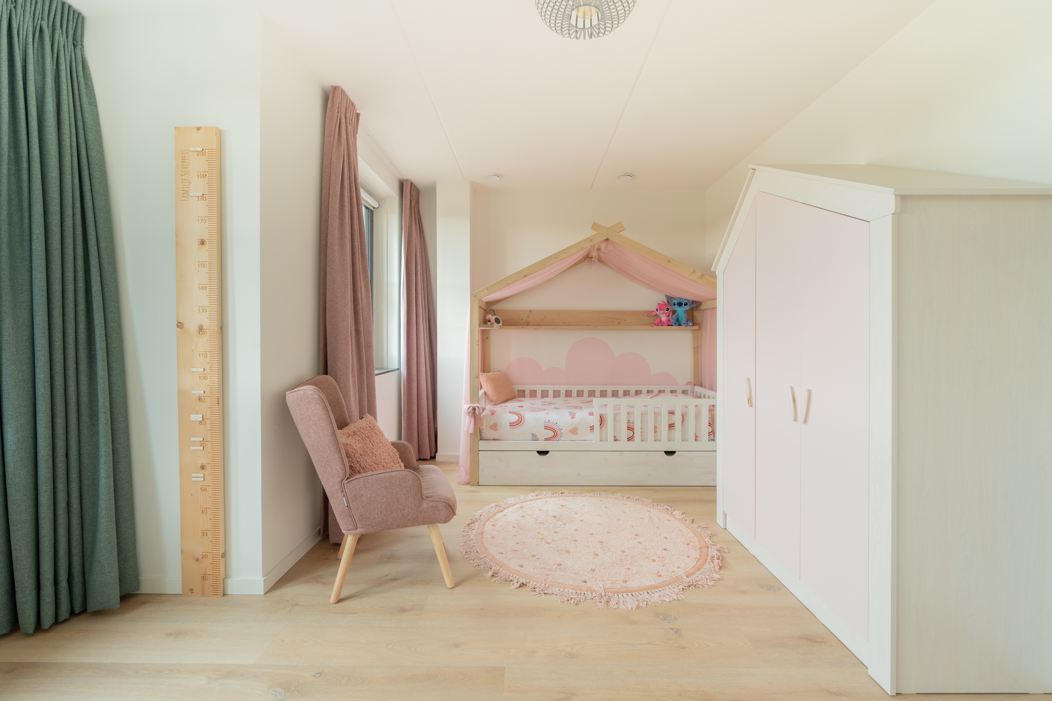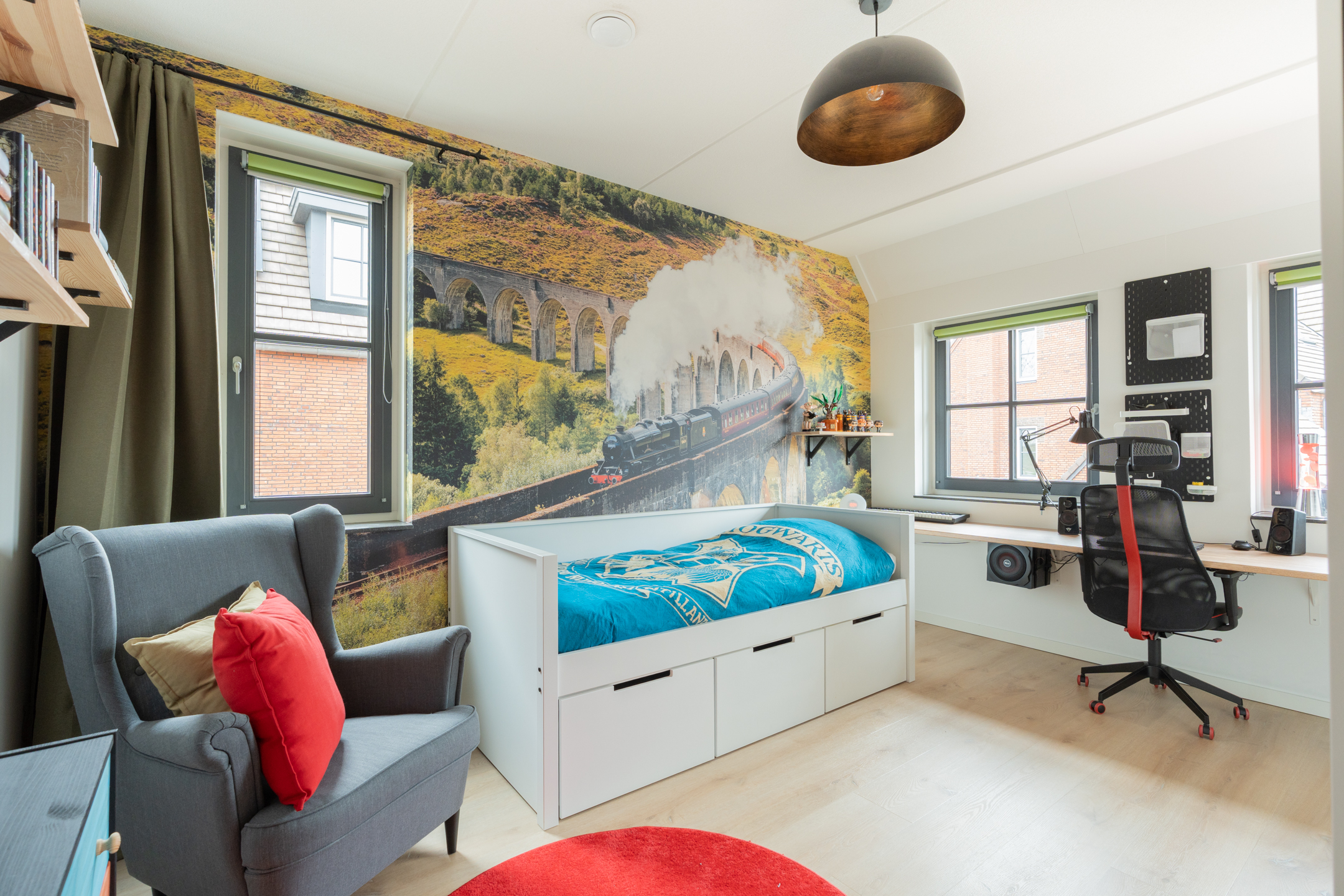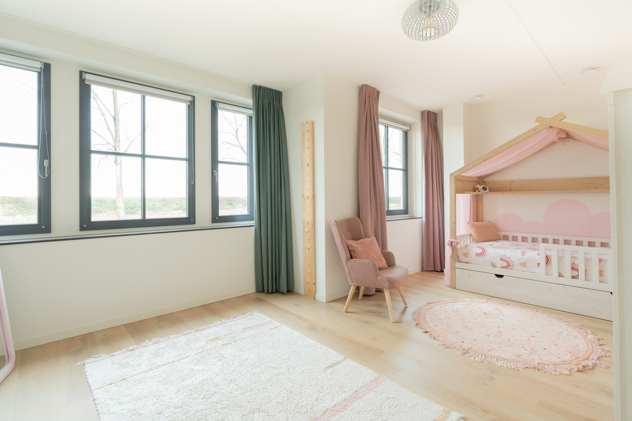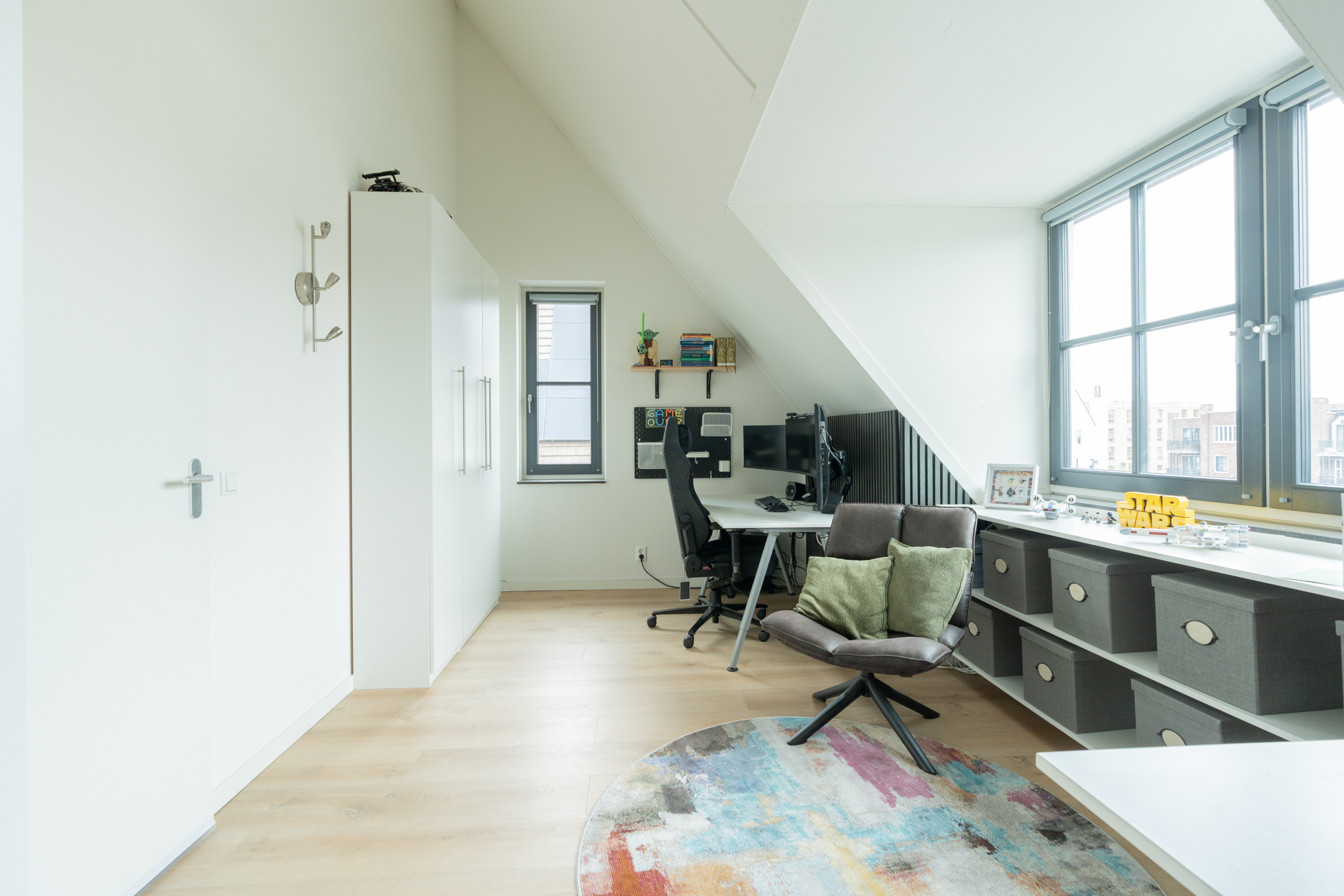 Hier vind je nog twee royale slaapkamers, beide met hoge nok en praktische bergruimte achter de knieschotten. De kamer aan de achterzijde beschikt bovendien over een dakkapel.