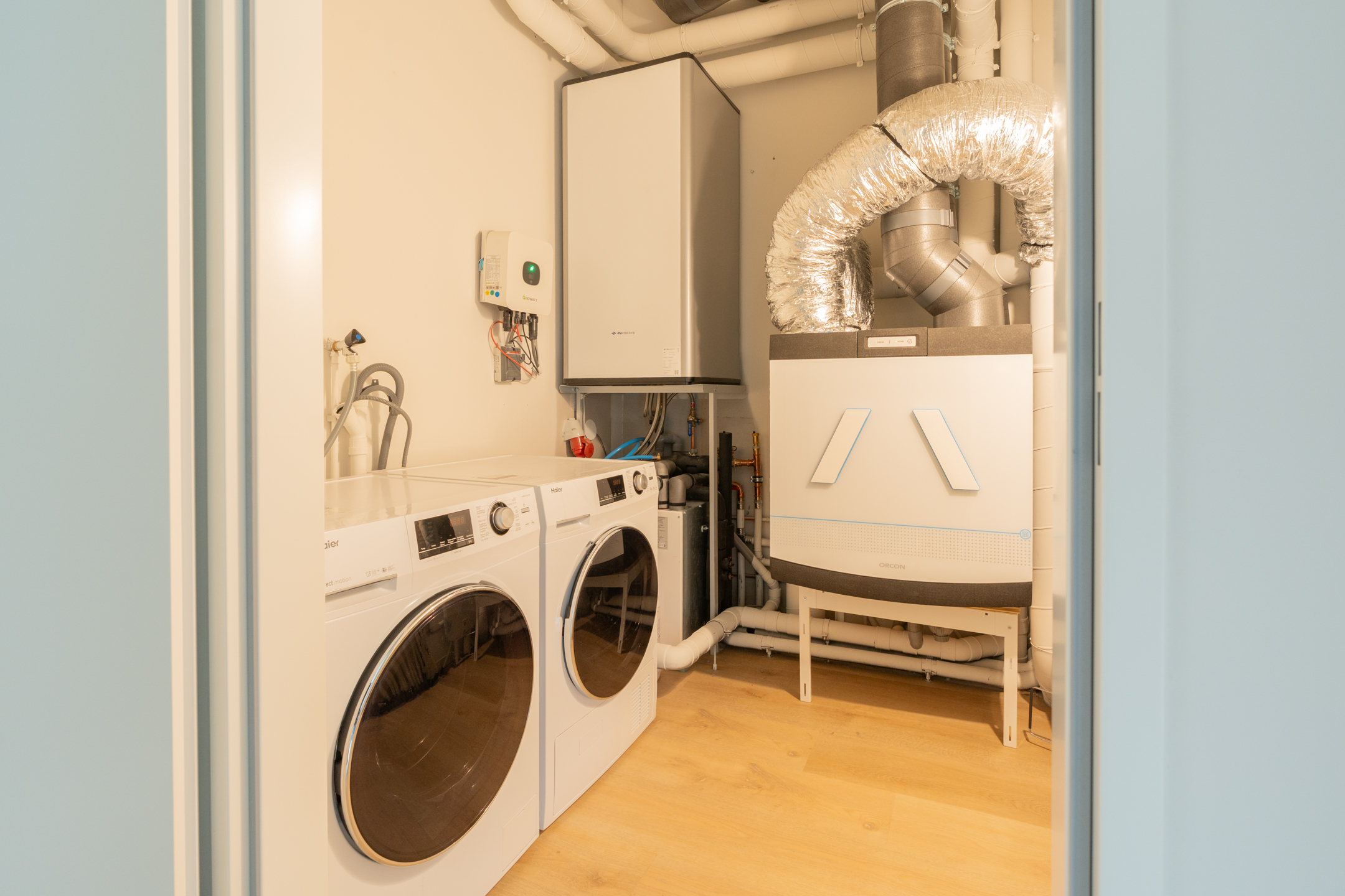 In de technische ruimte bevinden zich de warmtepomp, boiler, omvormer van de zonnepanelen en de aansluitingen voor wasmachine en droger. Ook deze verdieping is volledig uitgerust met een mooie pvc vloer en vloerverwarming.