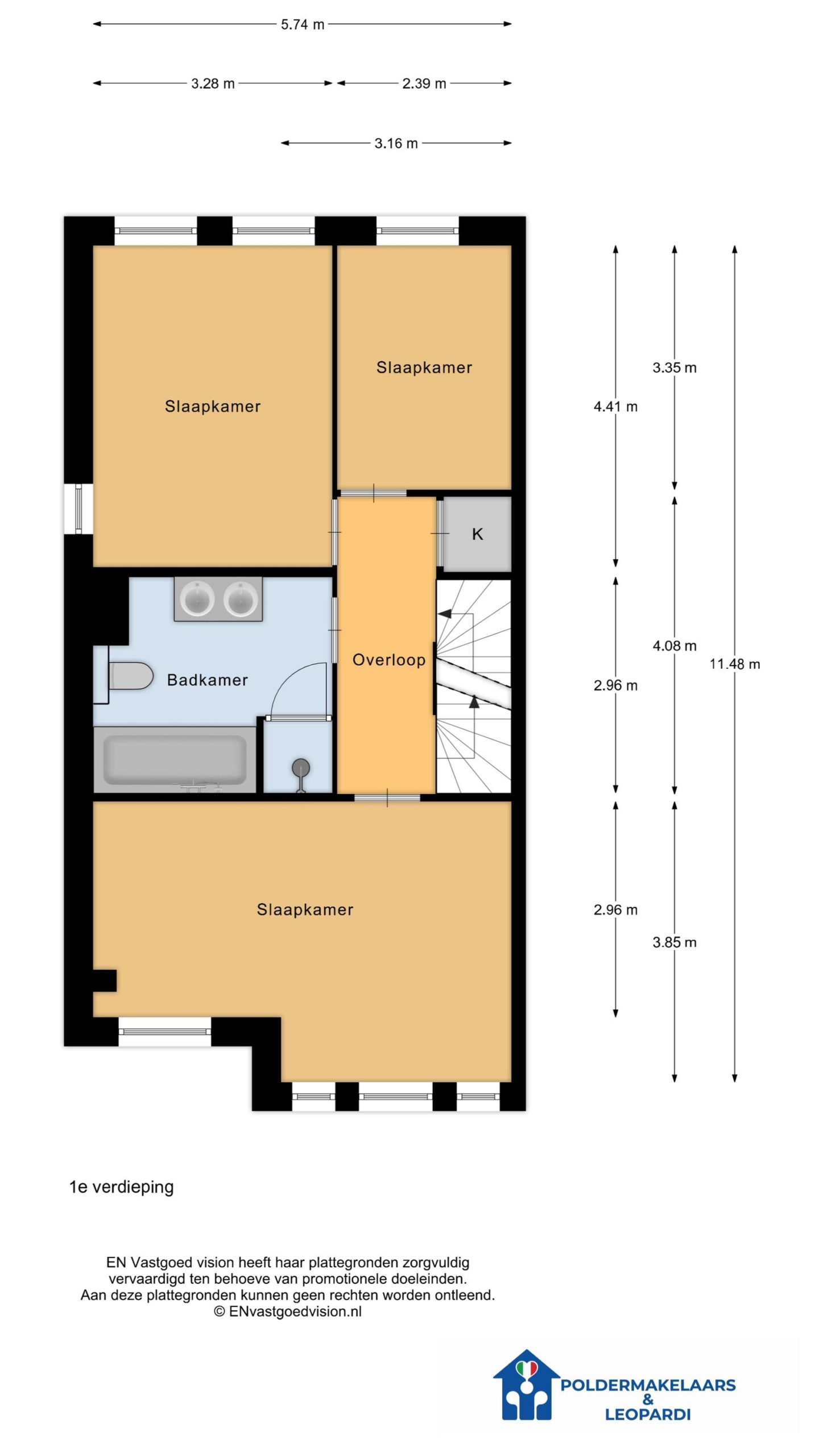 De lichte overloop geeft toegang tot drie ruime slaapkamers. Een riante slaapkamer aan de voorzijde en 2 ruime slaapkamers aan de achterzijde. De moderne badkamer is compleet ingericht met ligbad, inloopdouche, dubbele wastafel in meubel, toilet, kolomkast en verlichte spiegel. De gehele verdieping is voorzien van een fraaie pvc vloer en vloerverwarming.