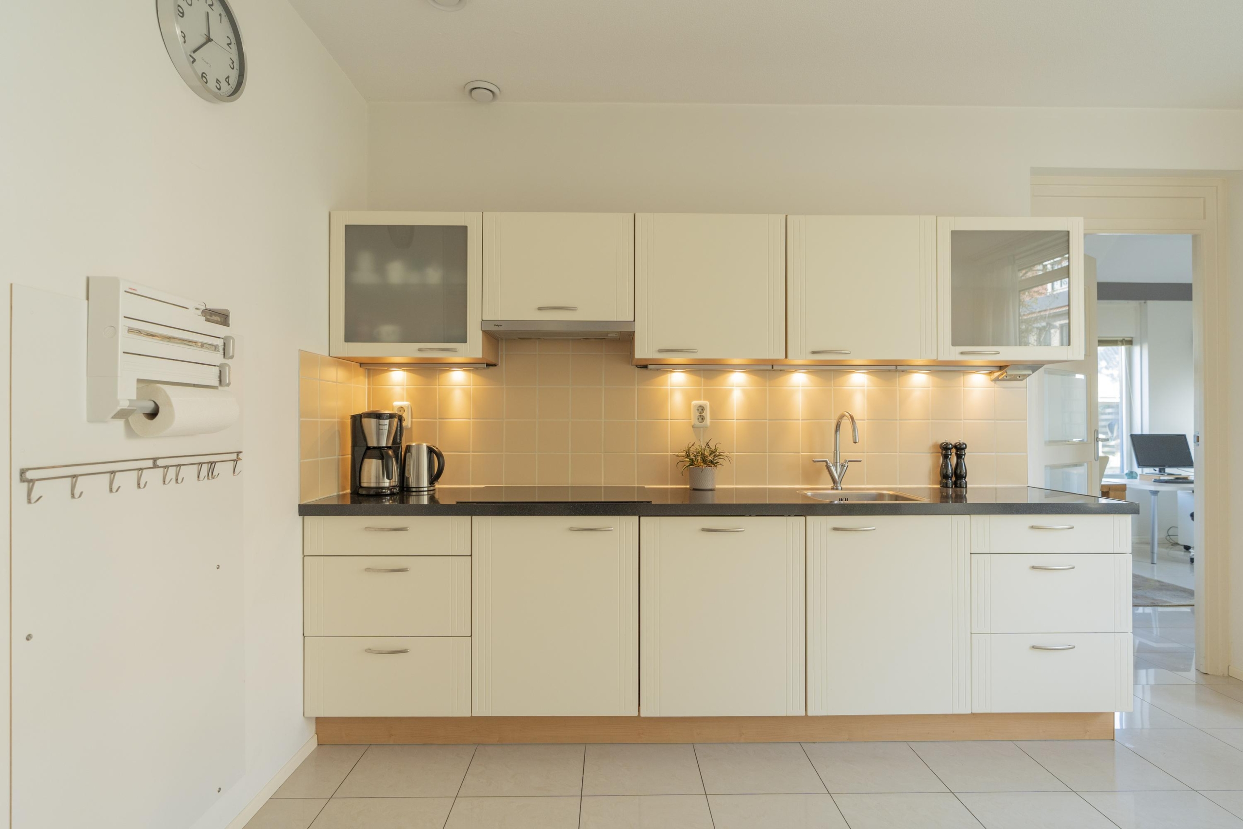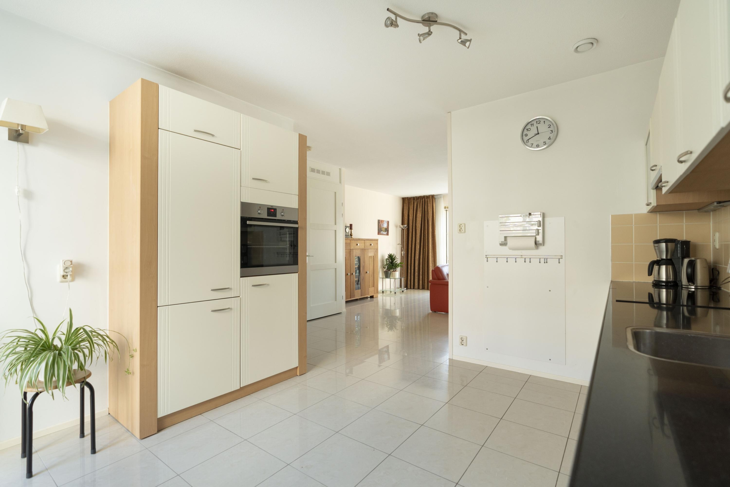 Entree, hal, meterkast (8 groepen + glasvezel), een separate toiletruimte (2011) met een zwevend toilet en fonteintje, de trapopgang en toegang tot de woonkamer. De ruime woonkamer heeft een provisiekast, openslaande deuren én een loopdeur naar de achtertuin, een extra zijraam en een half open keuken. De keuken met eethoek is voorzien van diverse inbouwapparatuur zoals een inductiekookplaat met afzuigkap, een vaatwasser, een spoelbak met kraan, een koel-vriescombinatie en een oven. Dit gedeelte van de woning is voorzien van een tegelvloer met vloerverwarming.