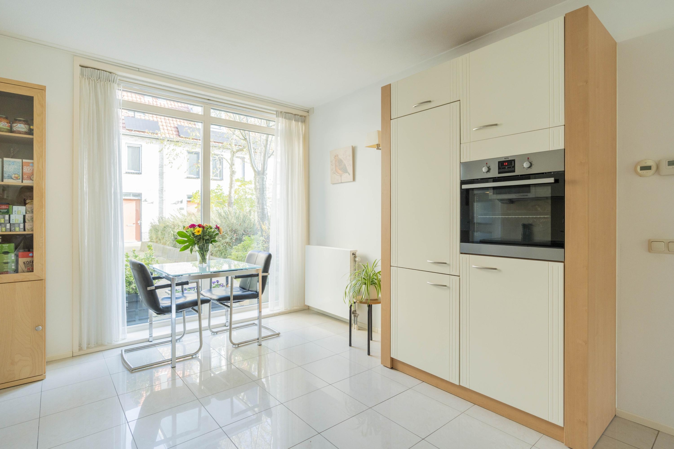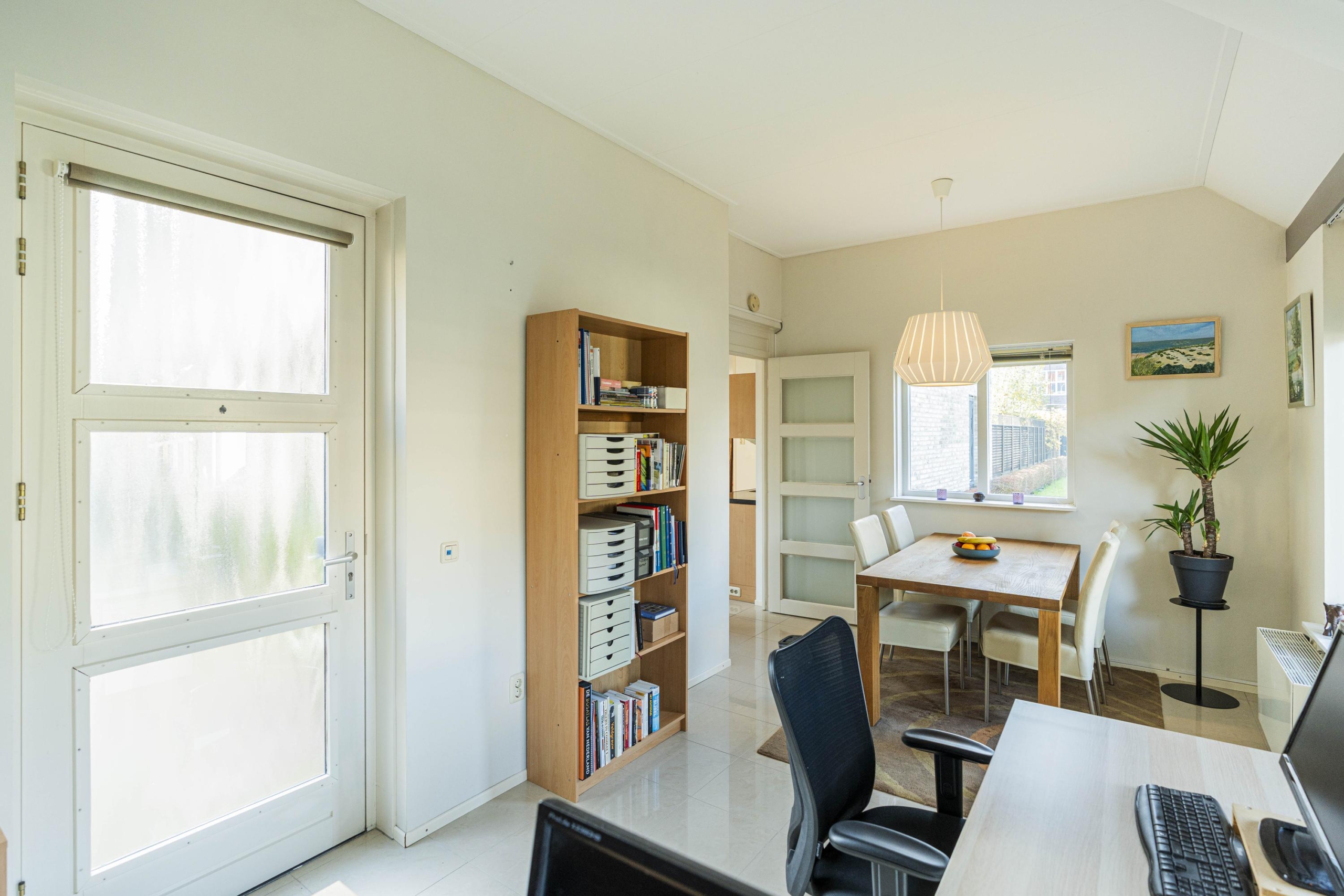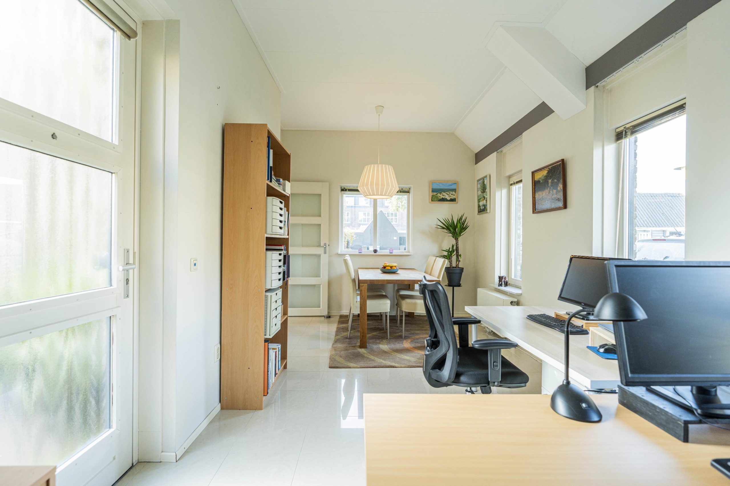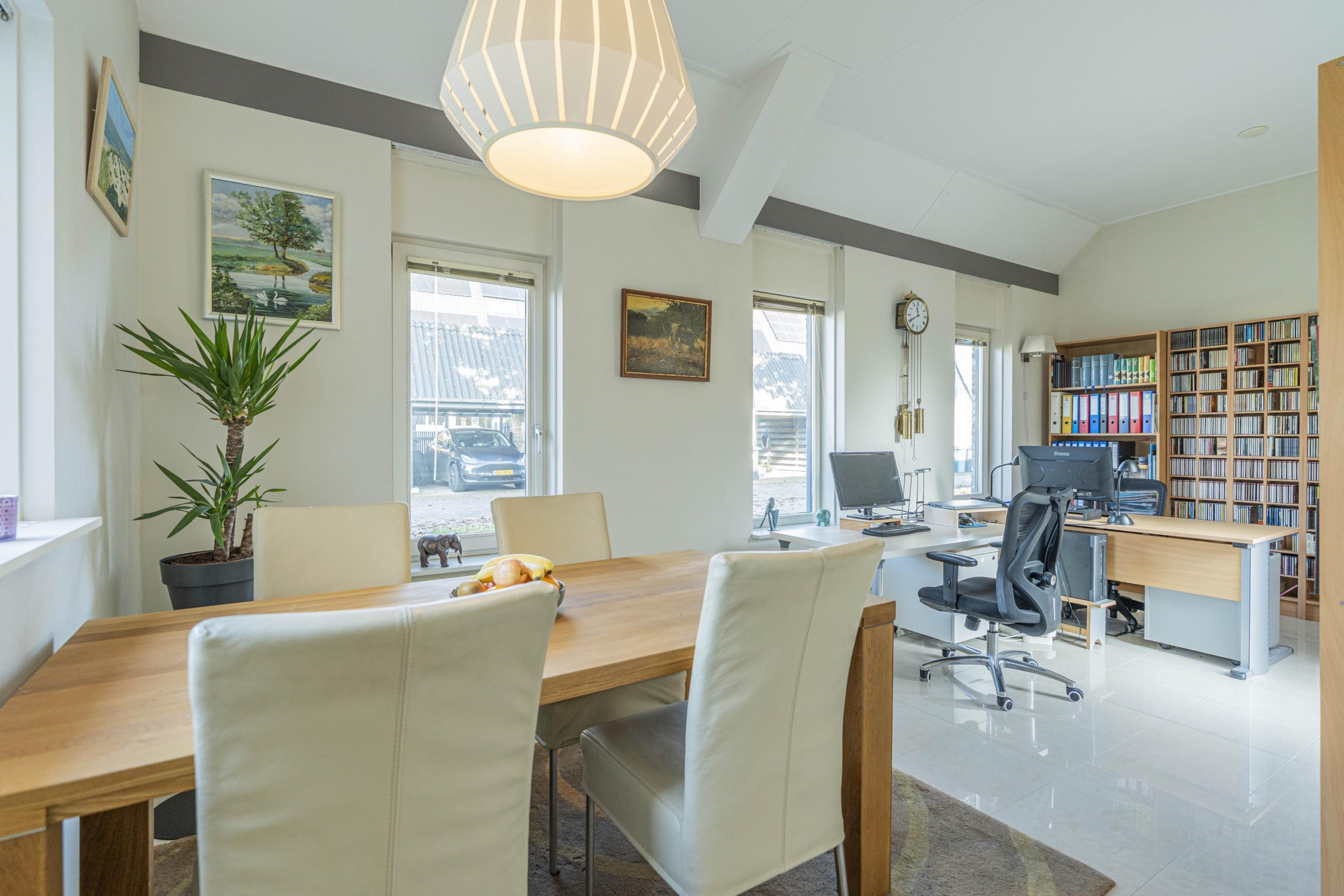 Aan de zijkant van de woning bevindt zich nog een extra zijflank. Deze ruimte is vanuit de keuken bereikbaar, maar tevens middels een eigen toegangsdeur vanaf de straat. Een multifunctionele ruimte die gebruikt kan worden als extra eetkamer, werkplek, werken aan huis of overige doeleinden. De hoge nok (nu voorzien van een plafond) van deze ruimte biedt ook nog diverse mogelijkheden.