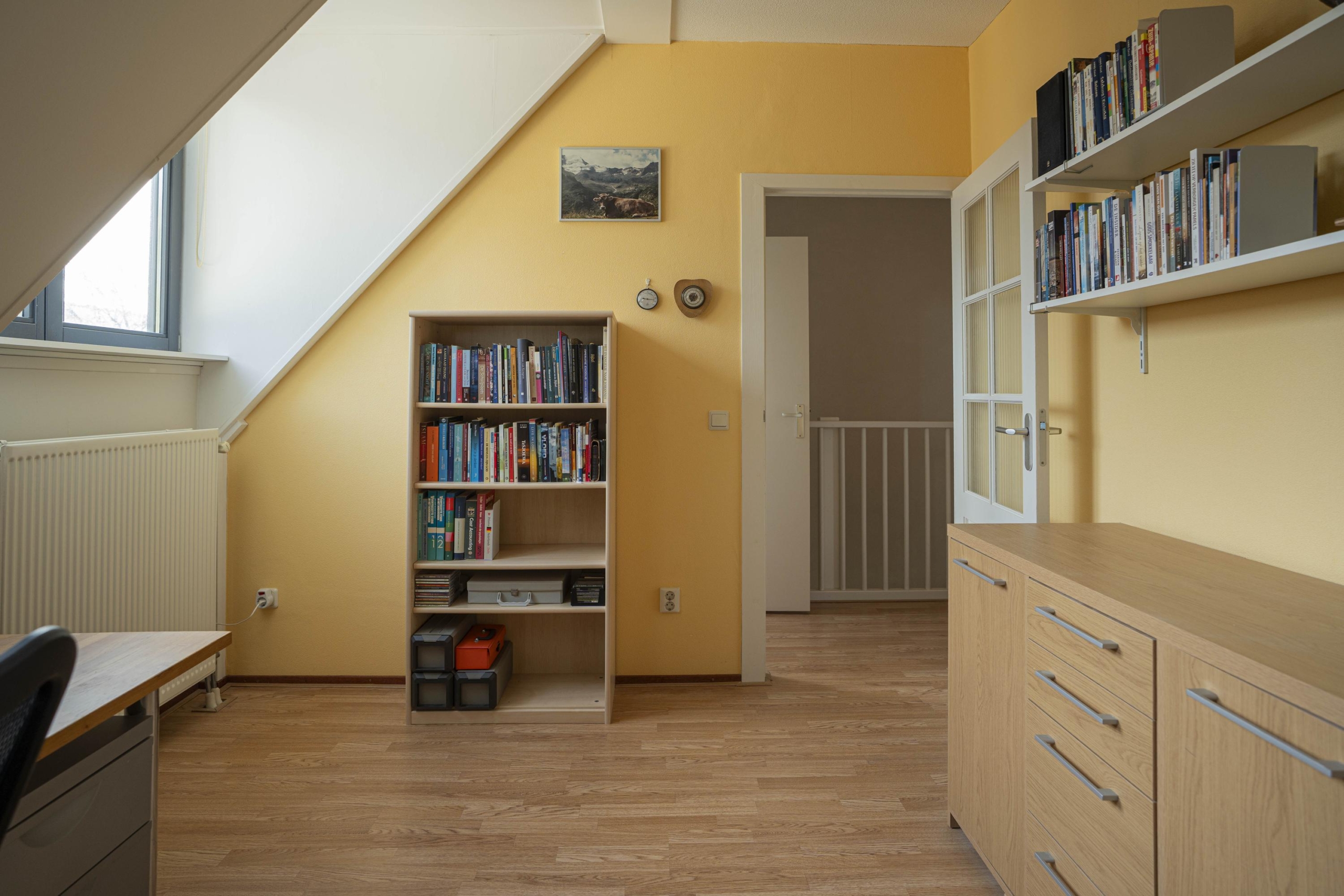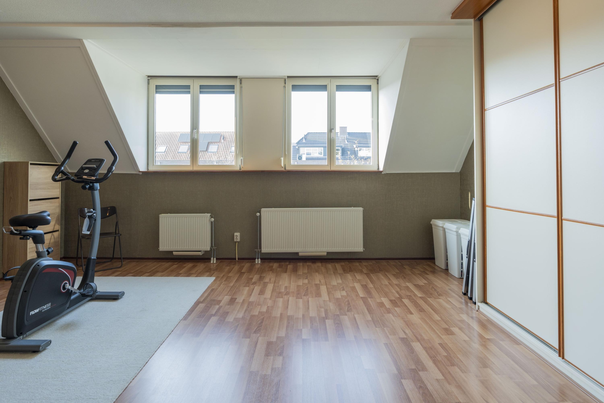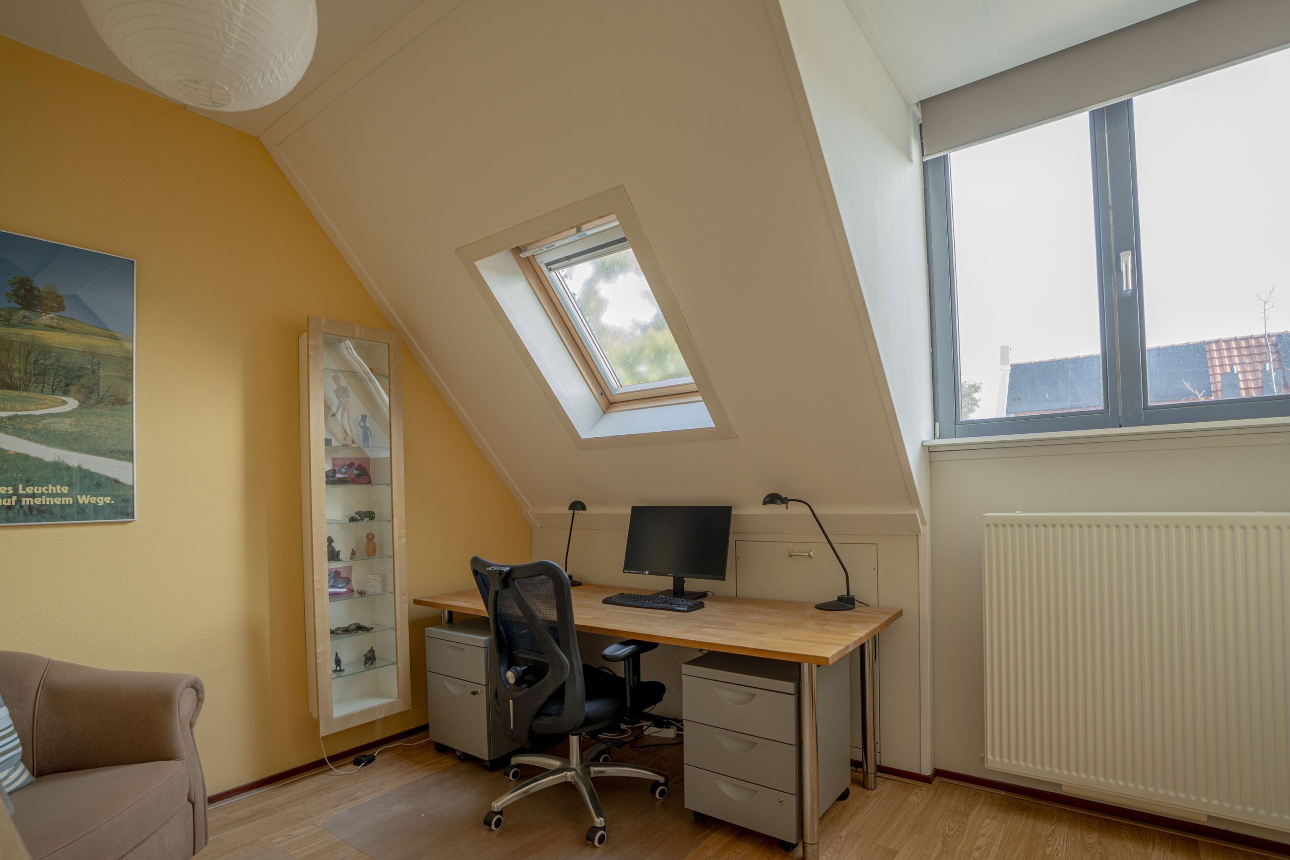 Aan de achterzijde is een ruimere slaapkamer gelegen welk is voorzien van 3 Velux dakramen en de toegang tot de vliering.