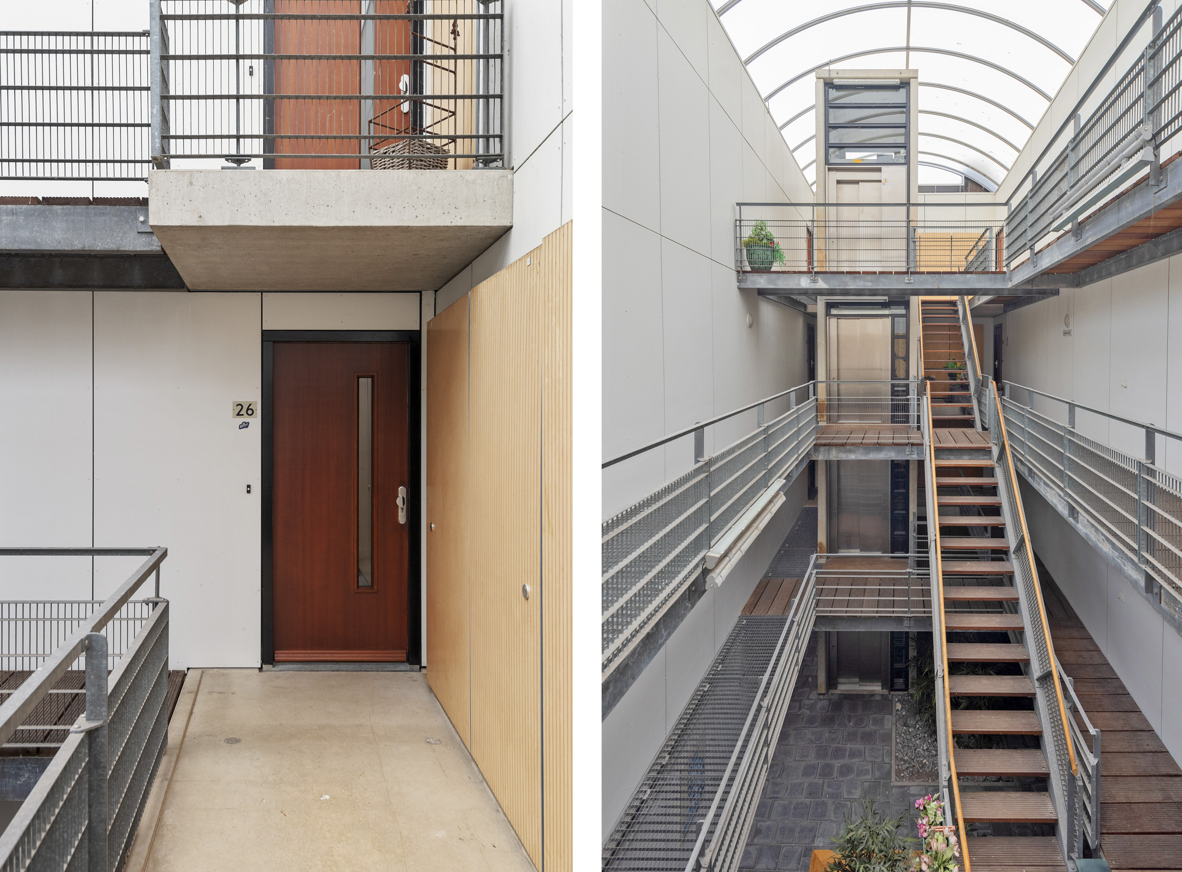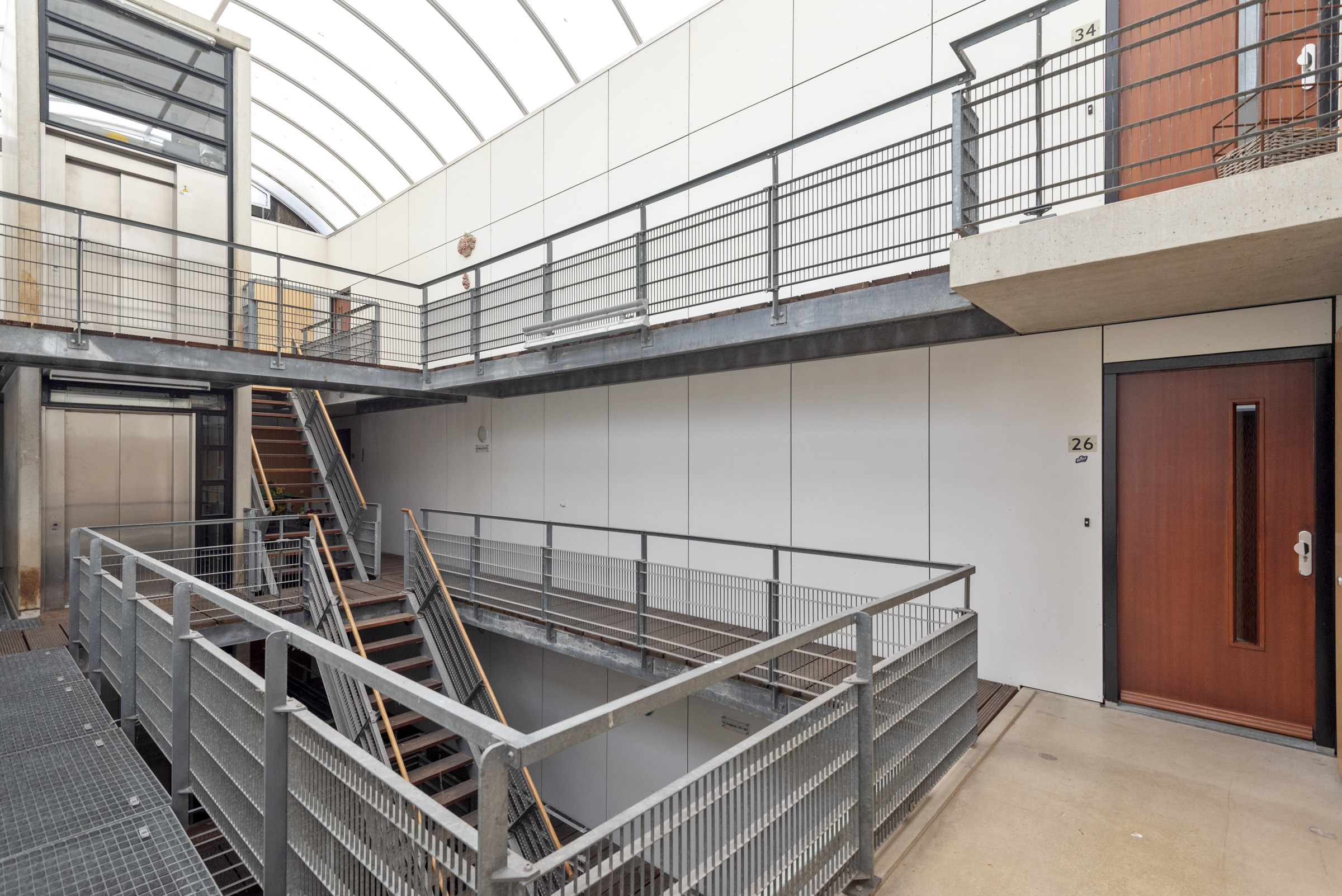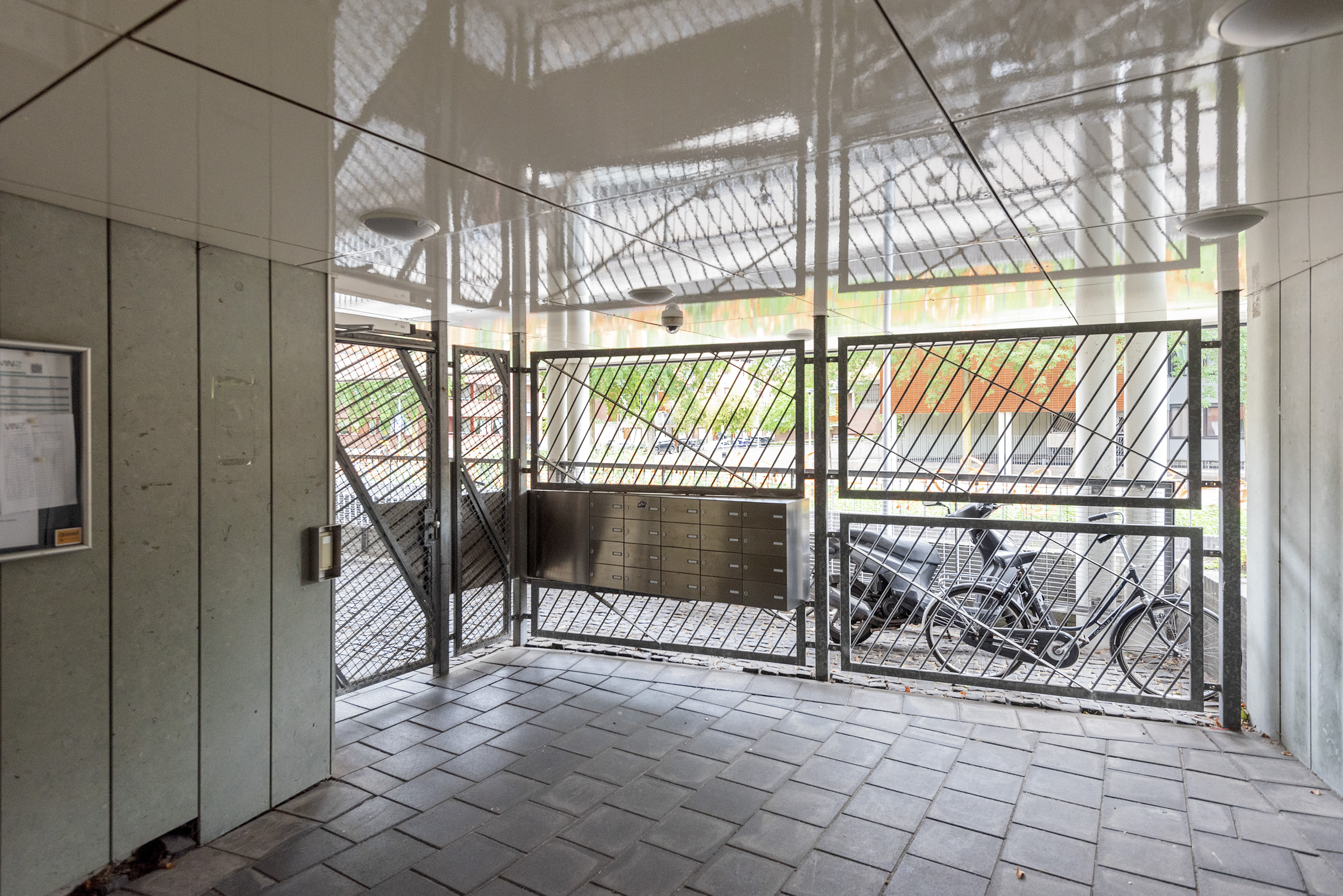 Centrale entree, brievenbussen, bellentableau, trap, lift, algemene (fietsen)berging en privé-bergingen.