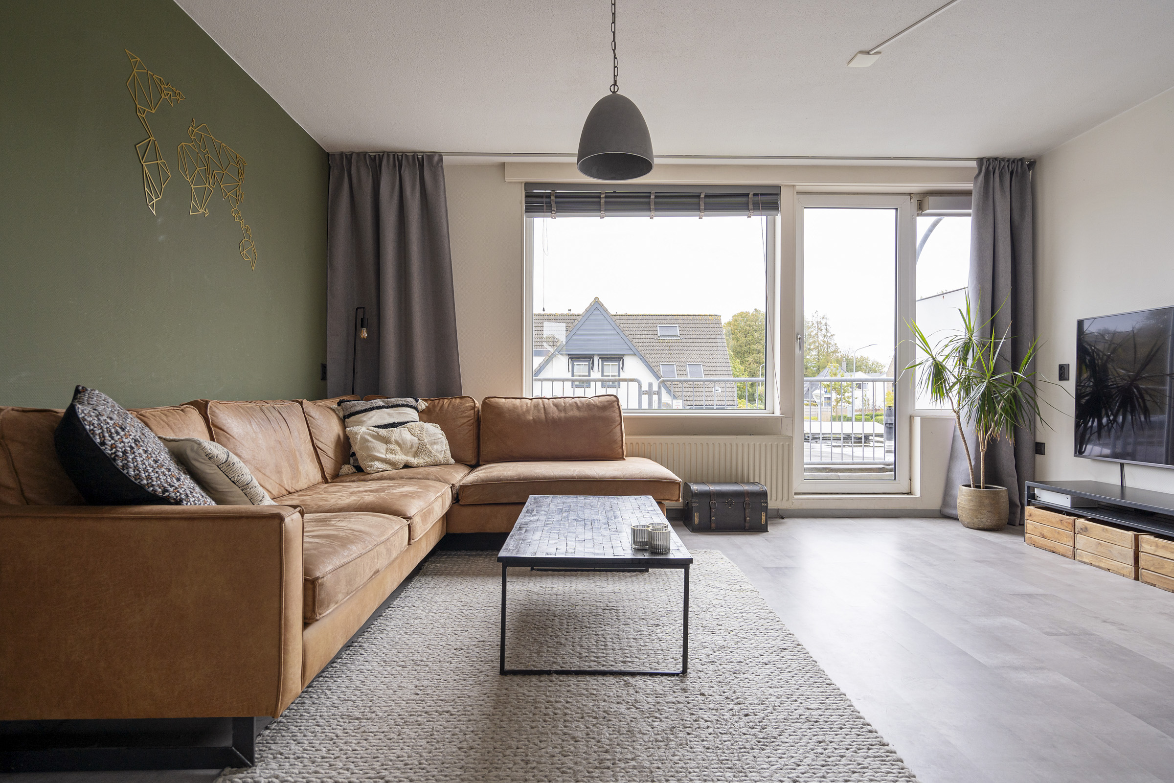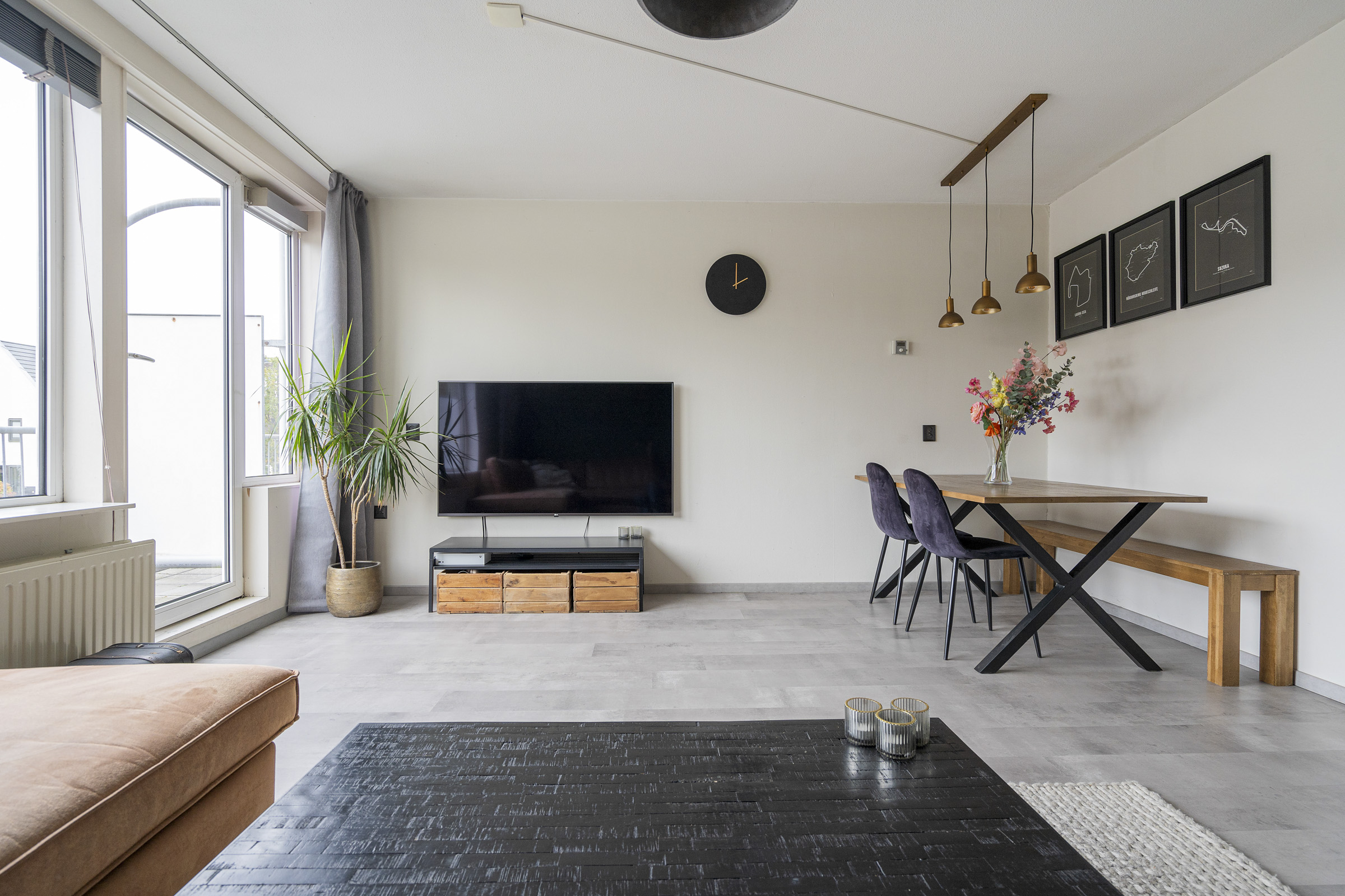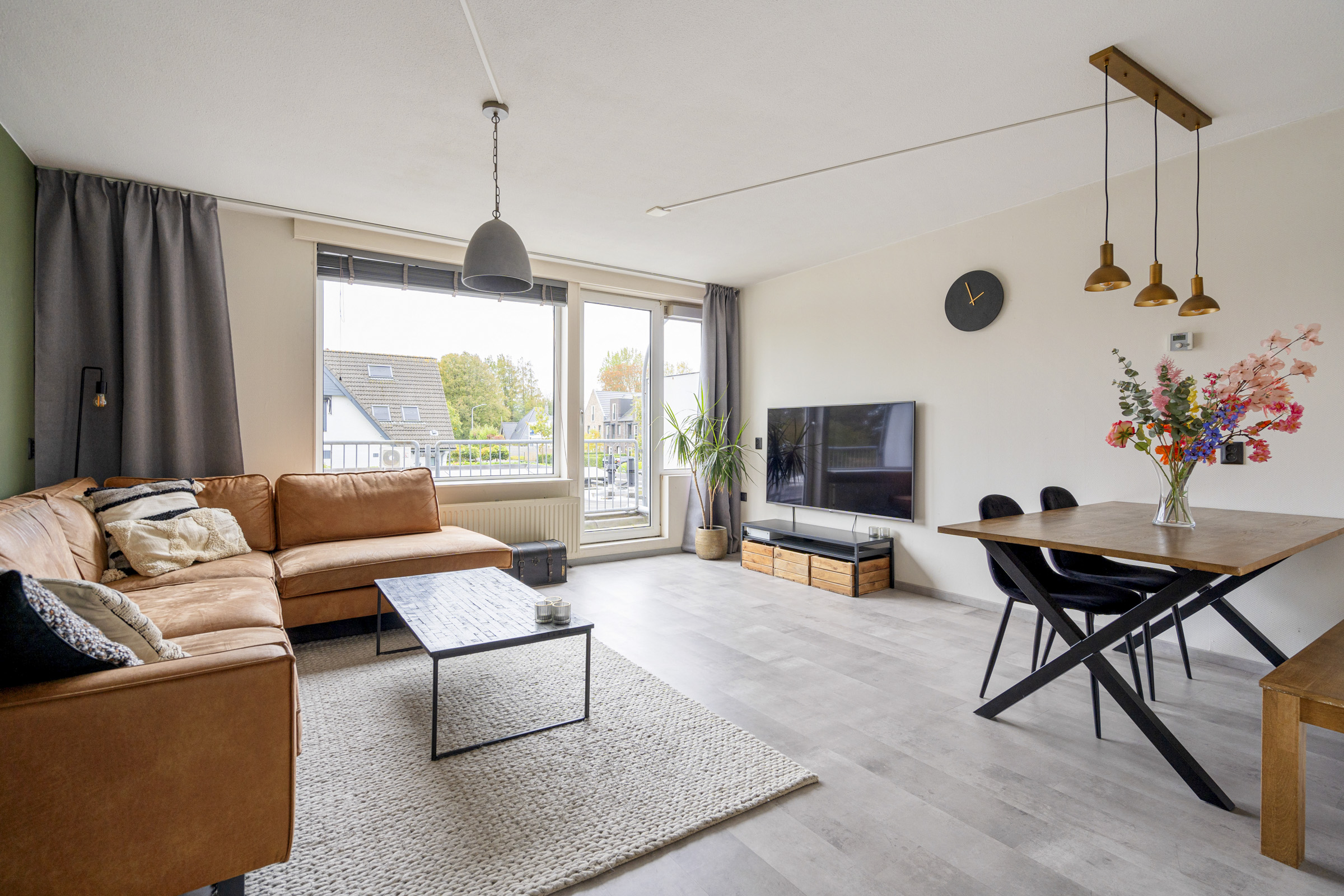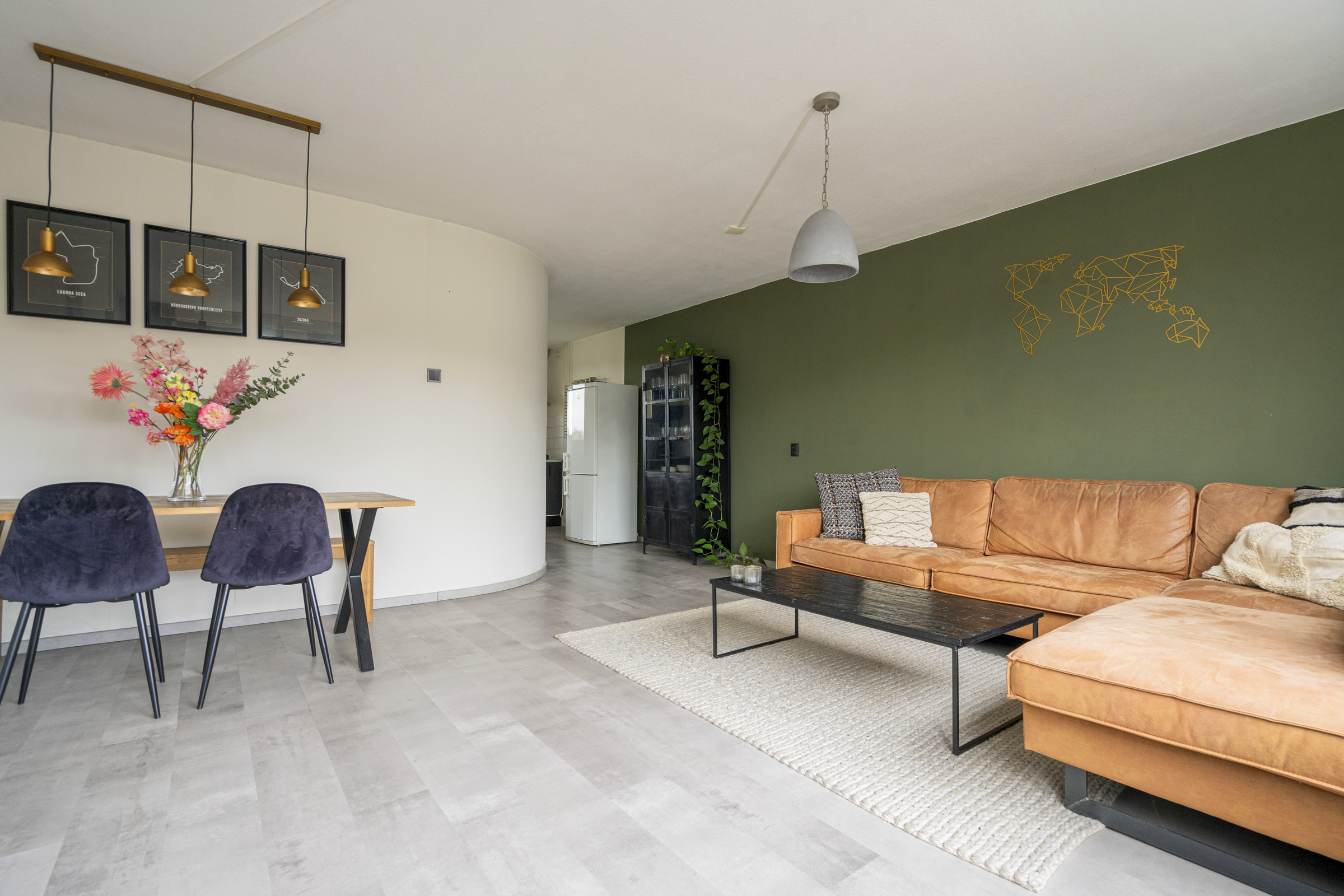 De aangrenzende lichte woonkamer is gelegen achter de speelse ronde muur van de trap, hier heb je een eethoek, een zithoek en een loopdeur naar het op het zuidoosten gelegen zonnige balkon.