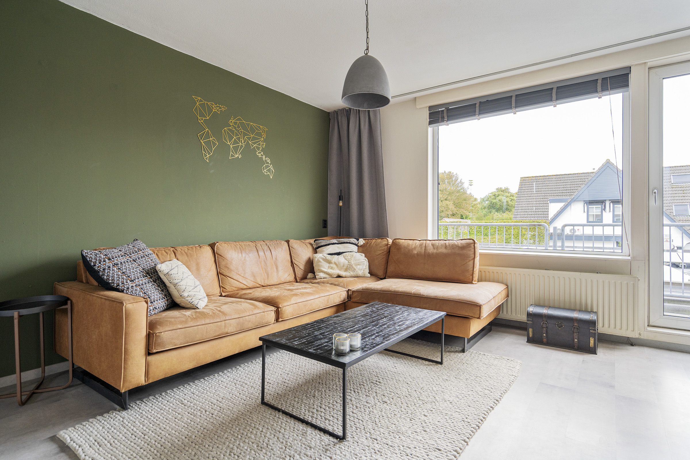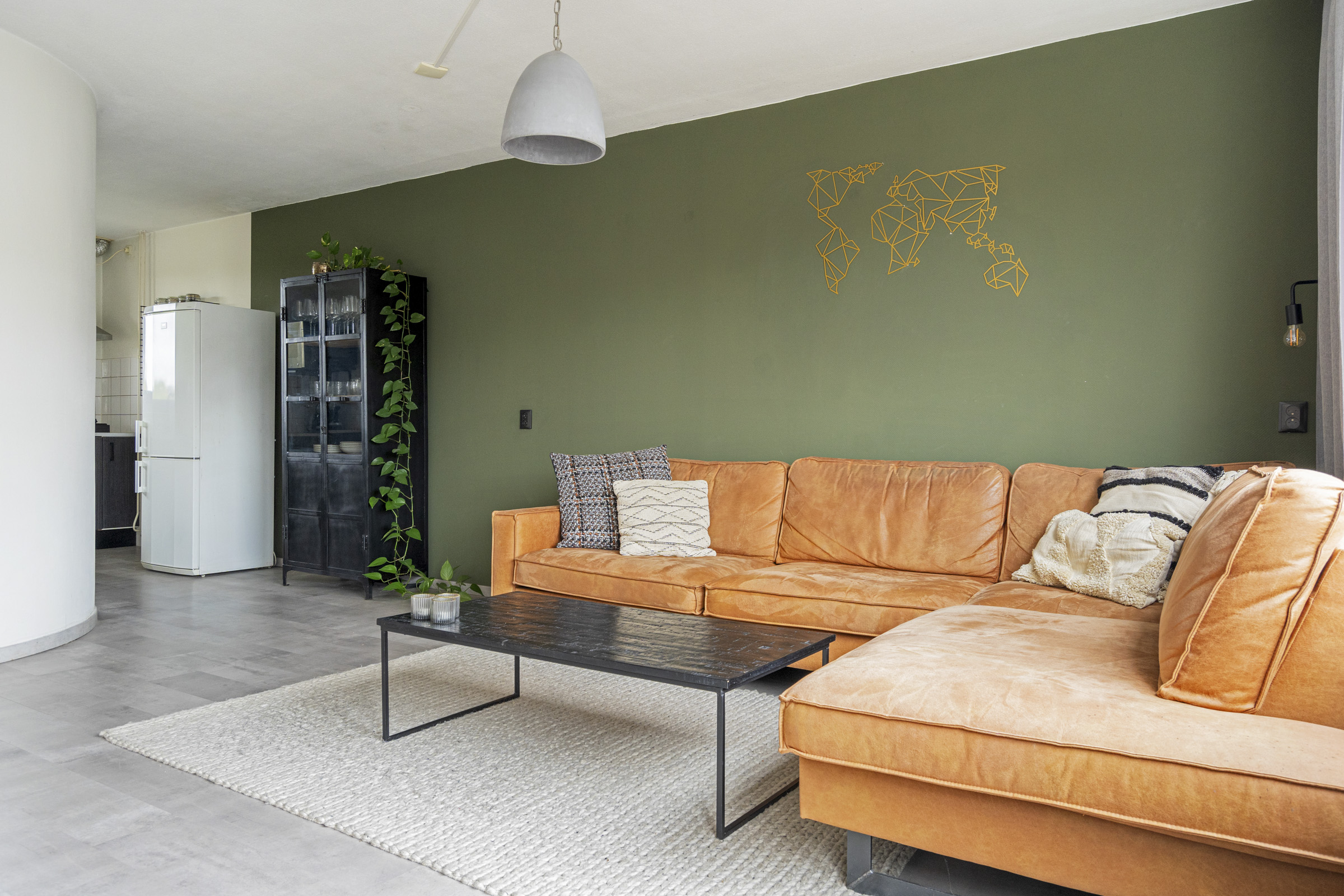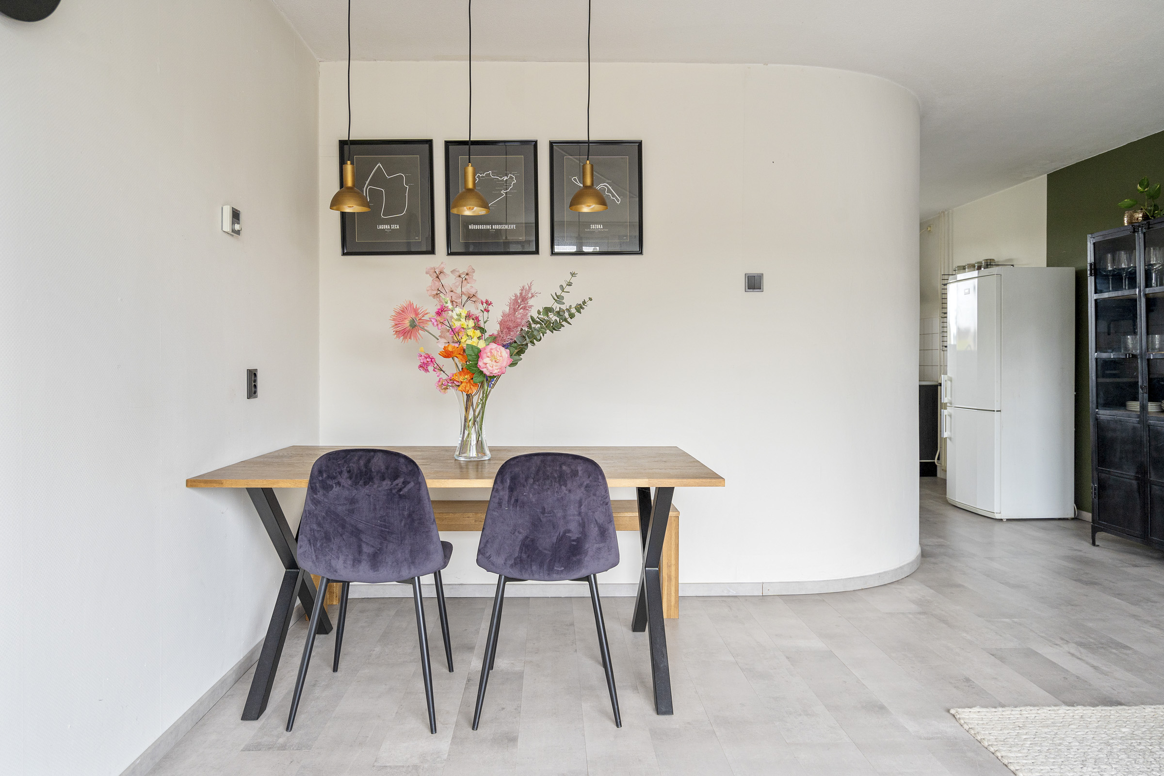 De aangrenzende lichte woonkamer is gelegen achter de speelse ronde muur van de trap, hier heb je een eethoek, een zithoek en een loopdeur naar het op het zuidoosten gelegen zonnige balkon.