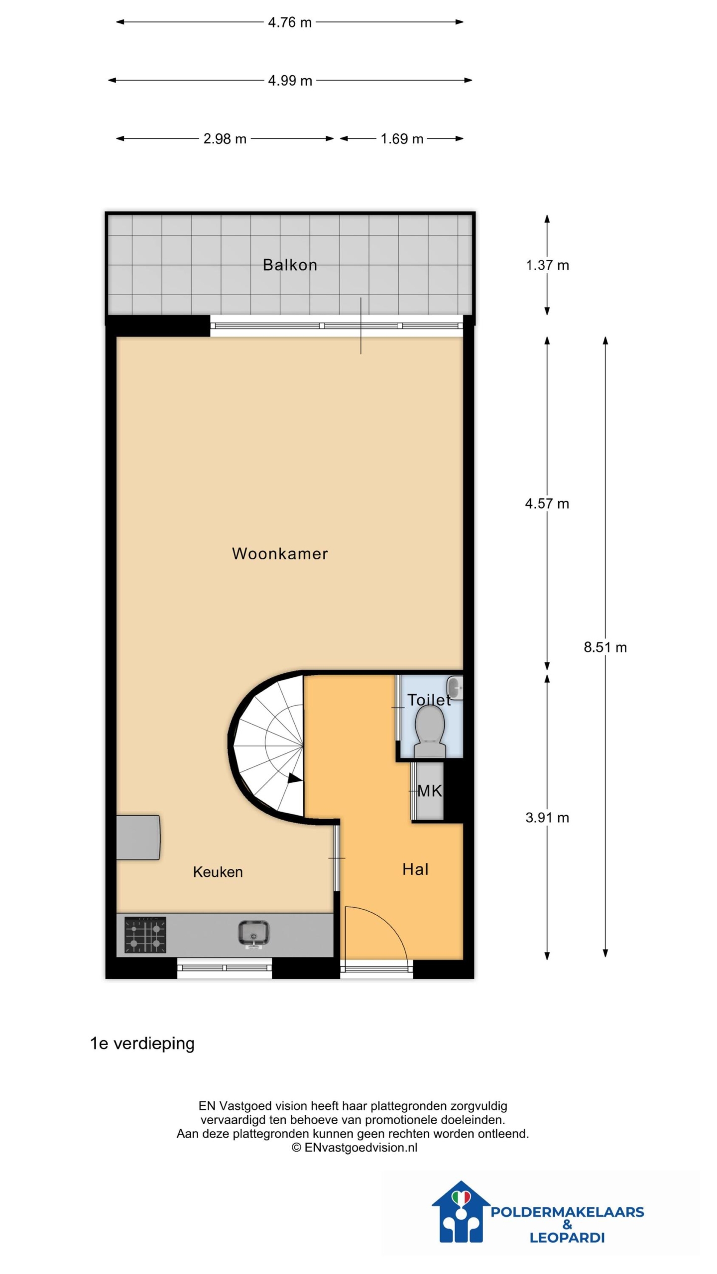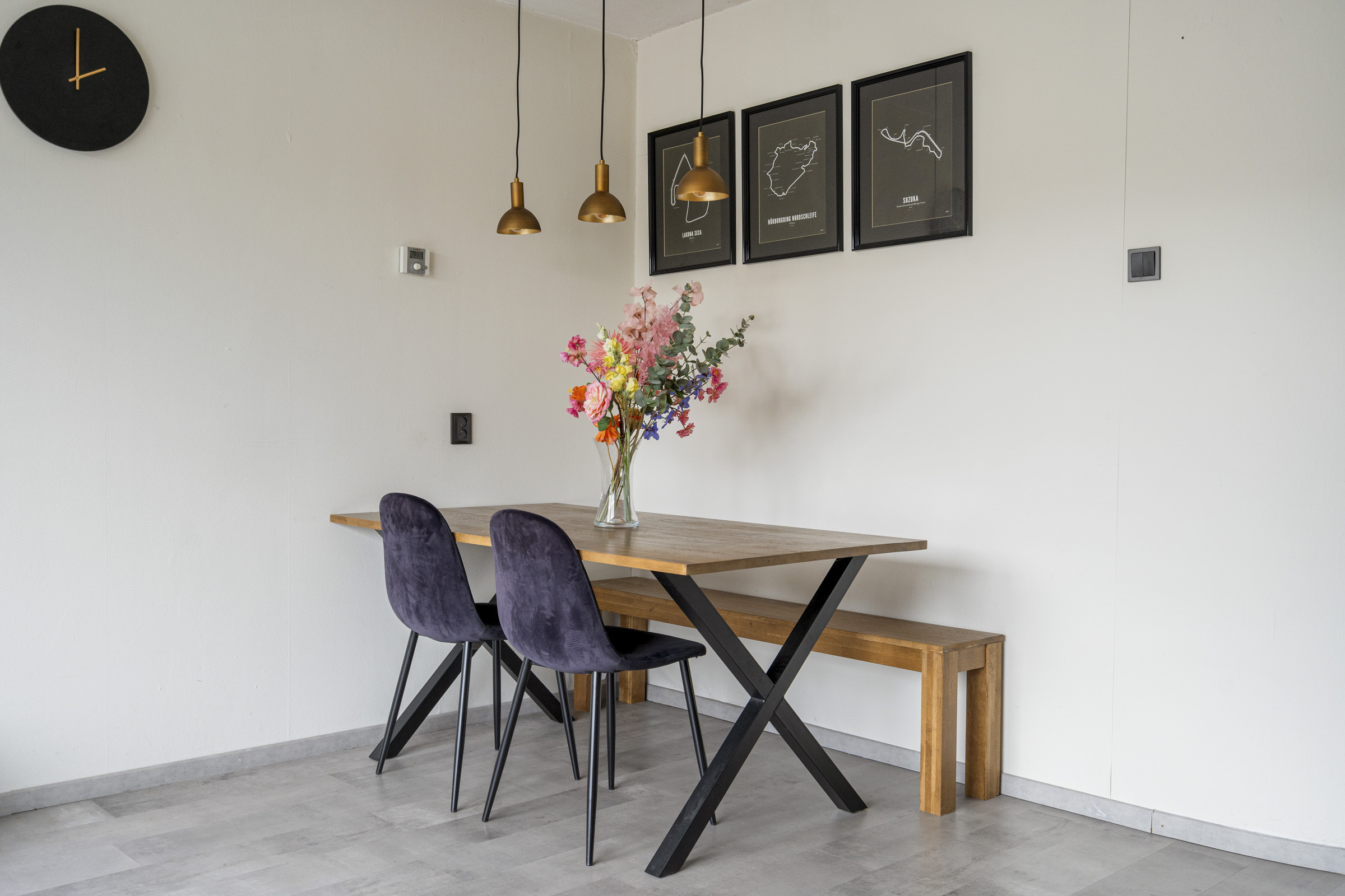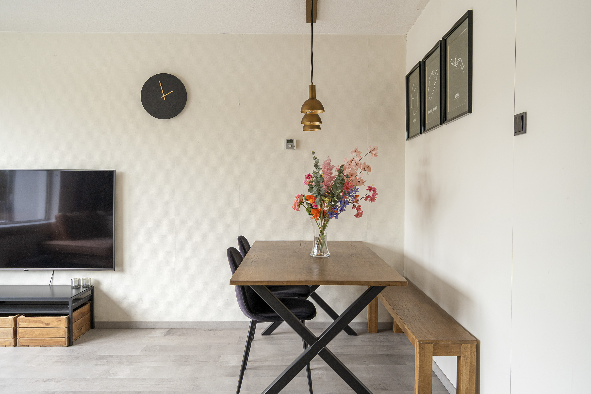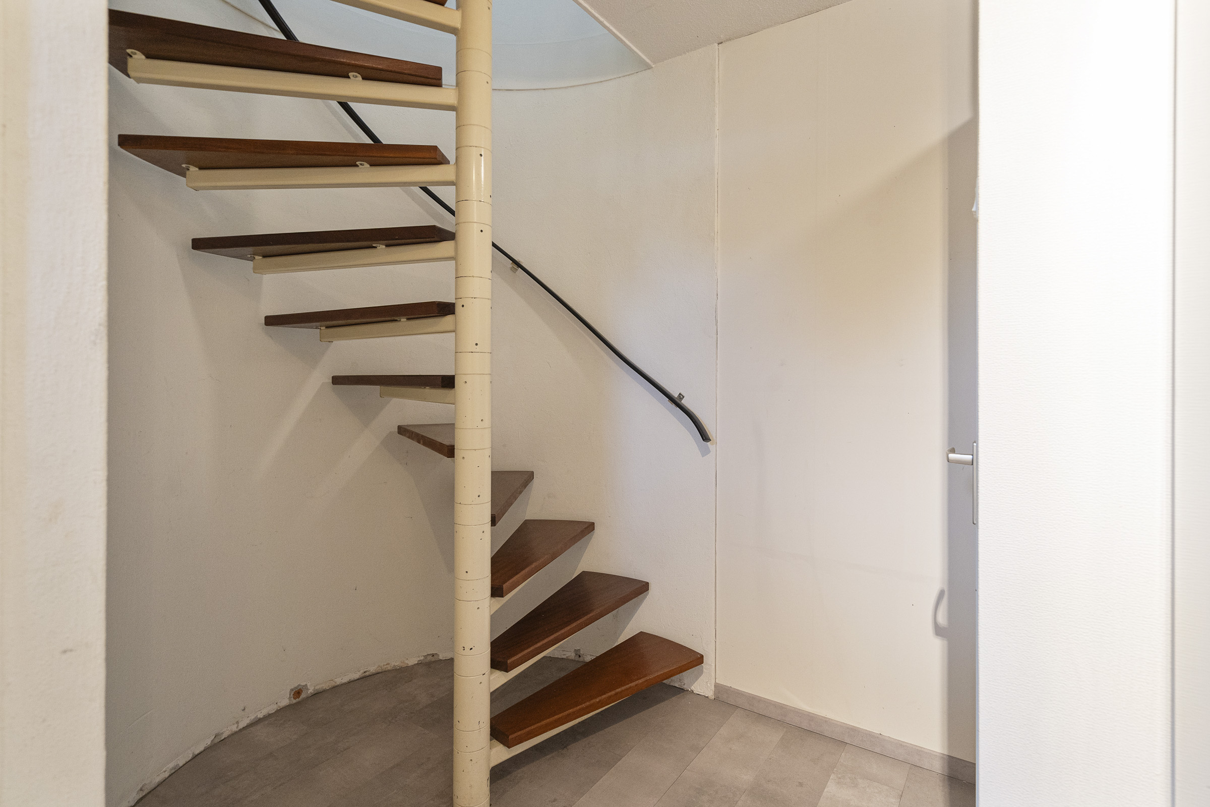 De aangrenzende lichte woonkamer is gelegen achter de speelse ronde muur van de trap, hier heb je een eethoek, een zithoek en een loopdeur naar het op het zuidoosten gelegen zonnige balkon.