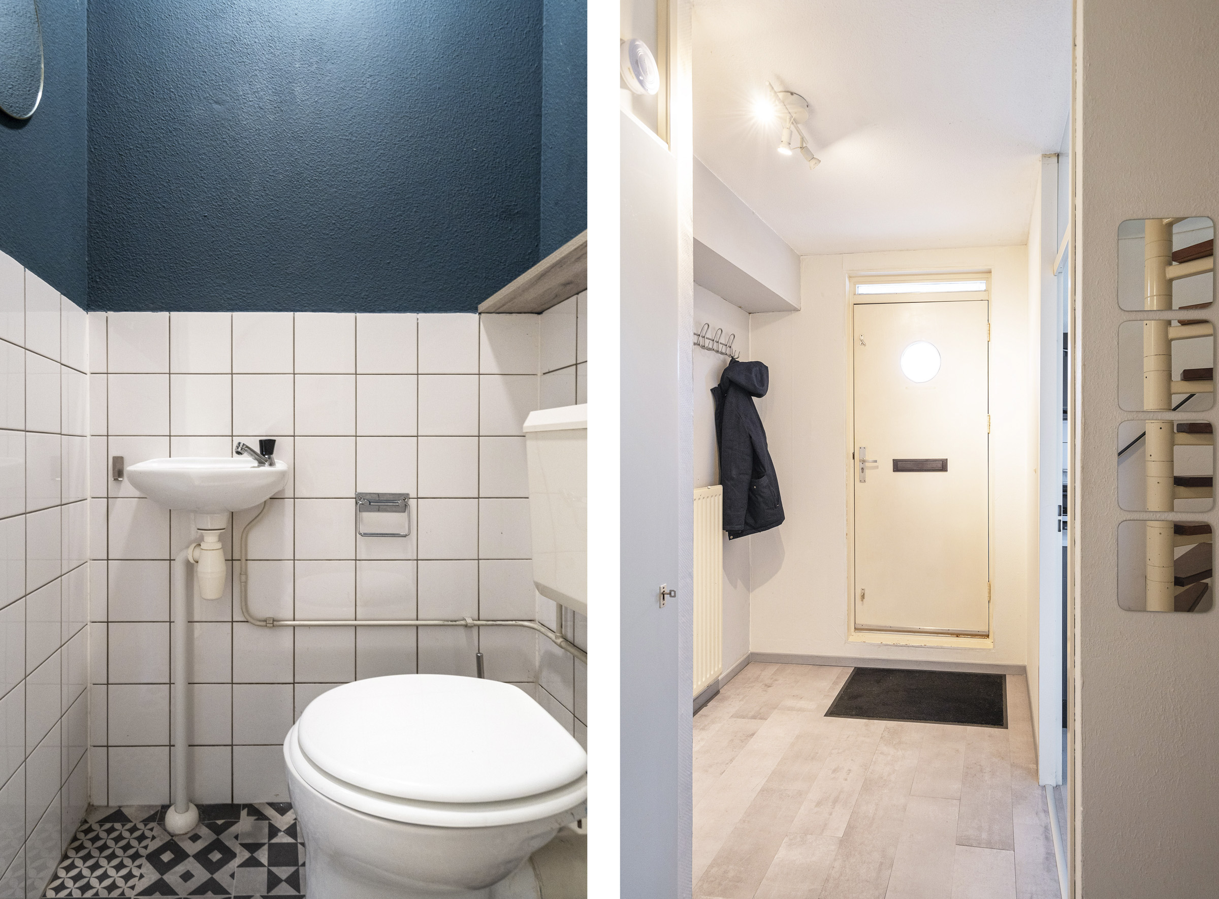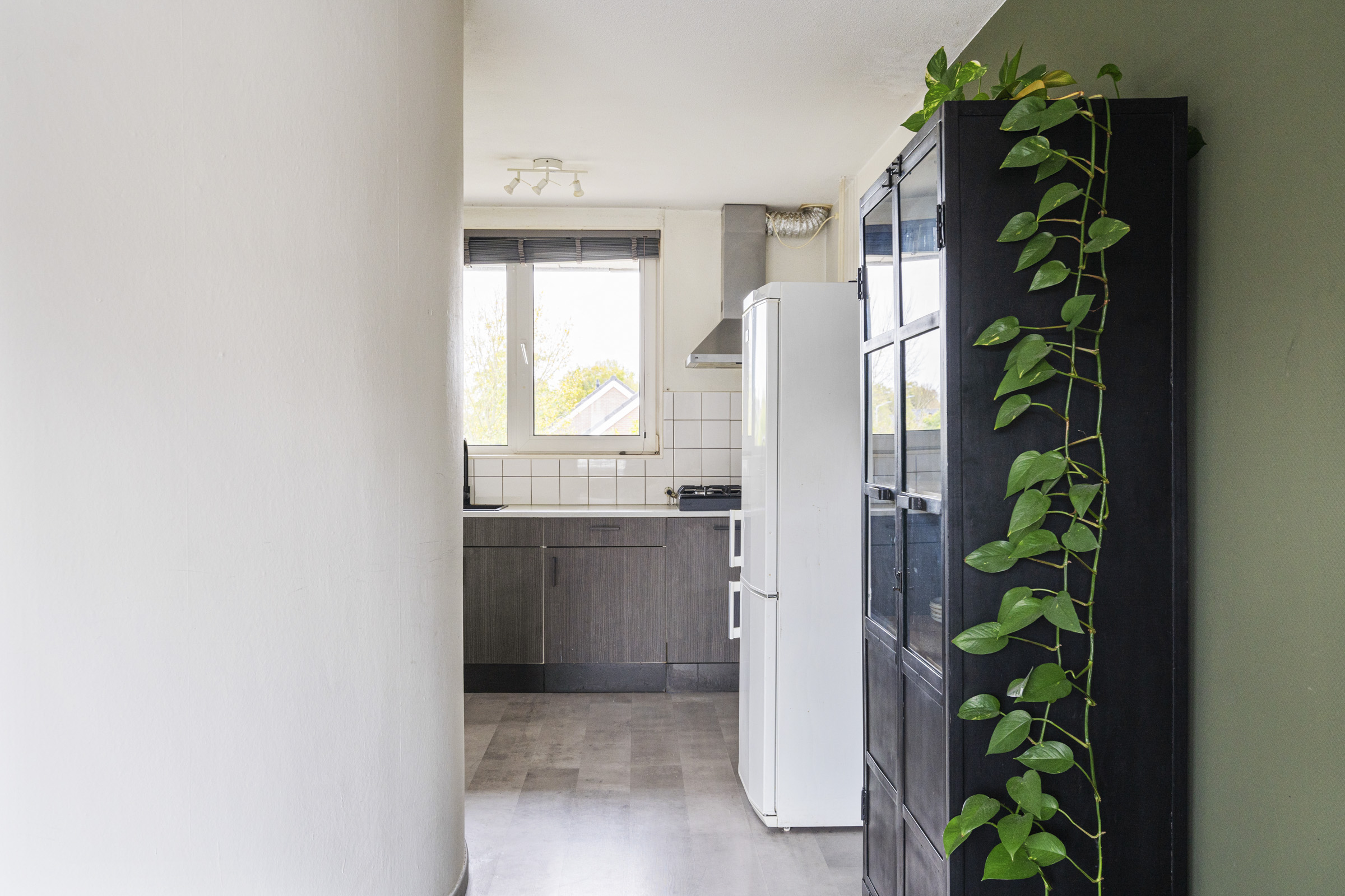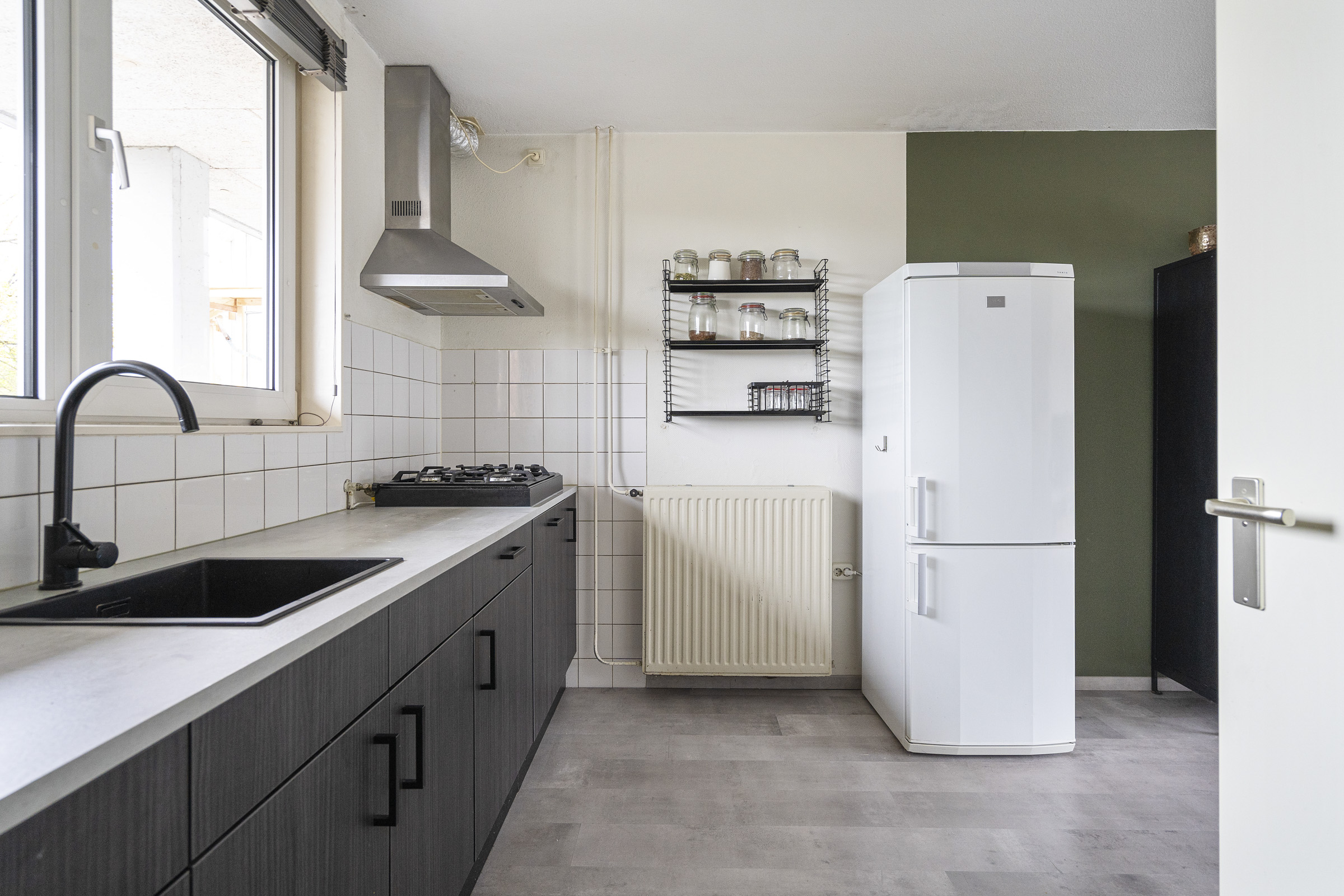 Entree, hal met meterkast, een separate toiletruimte met toilet en fonteintje, de trapopgang naar de tweede verdieping en de toegang tot de keuken en woonkamer. De half-open keuken is voorzien van een spoelbak met kraan, vaatwasser, 4-pits gaskookplaat met afzuigkap en een losse koel-vriescombinatie.