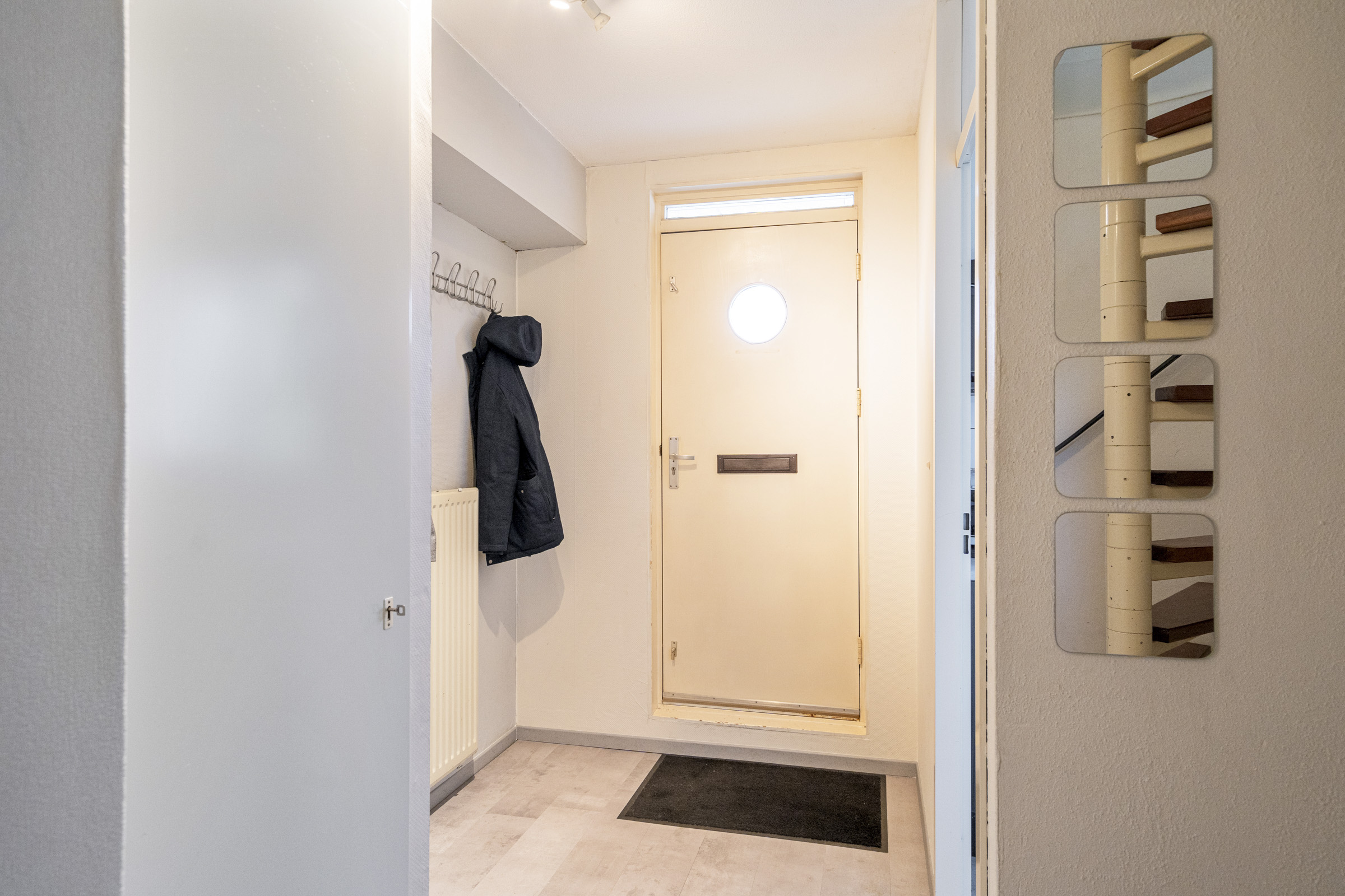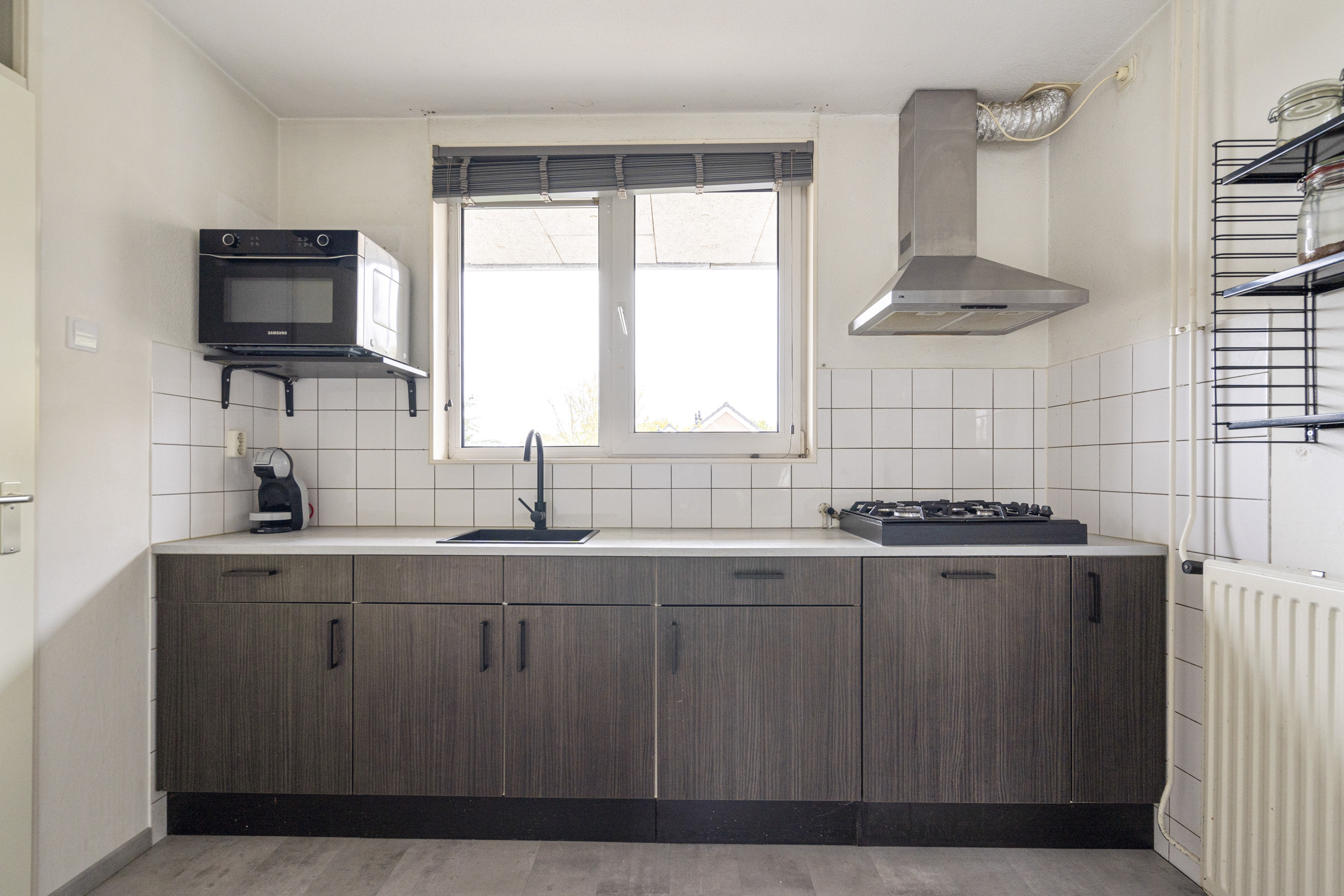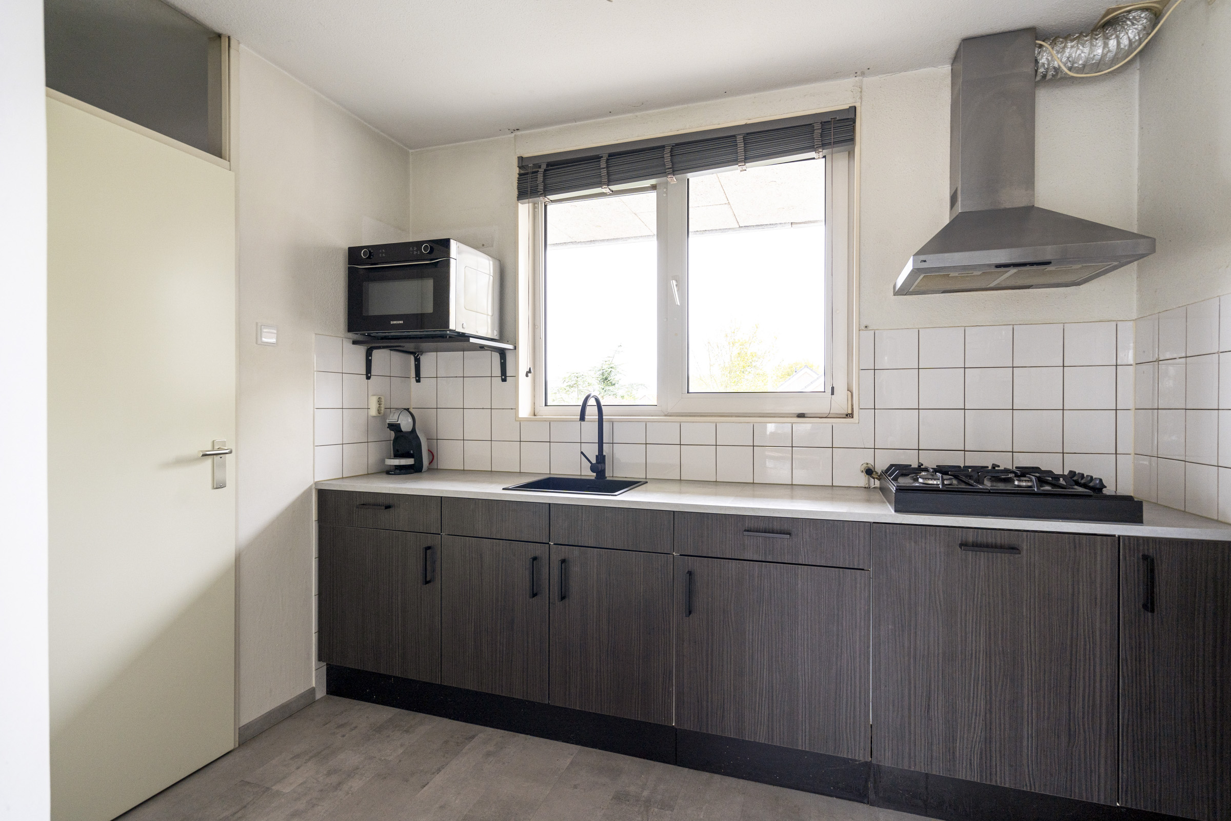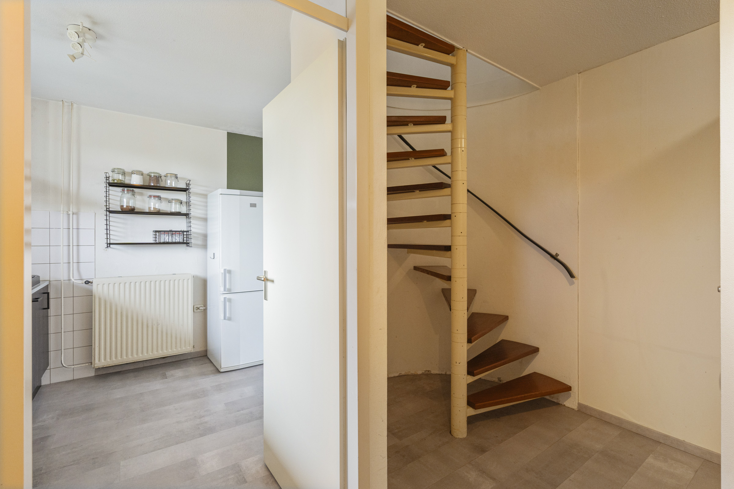 Entree, hal met meterkast, een separate toiletruimte met toilet en fonteintje, de trapopgang naar de tweede verdieping en de toegang tot de keuken en woonkamer. De half-open keuken is voorzien van een spoelbak met kraan, vaatwasser, 4-pits gaskookplaat met afzuigkap en een losse koel-vriescombinatie.