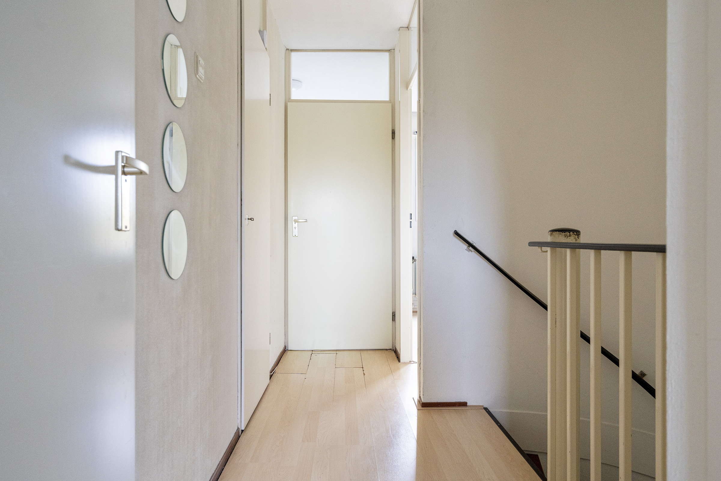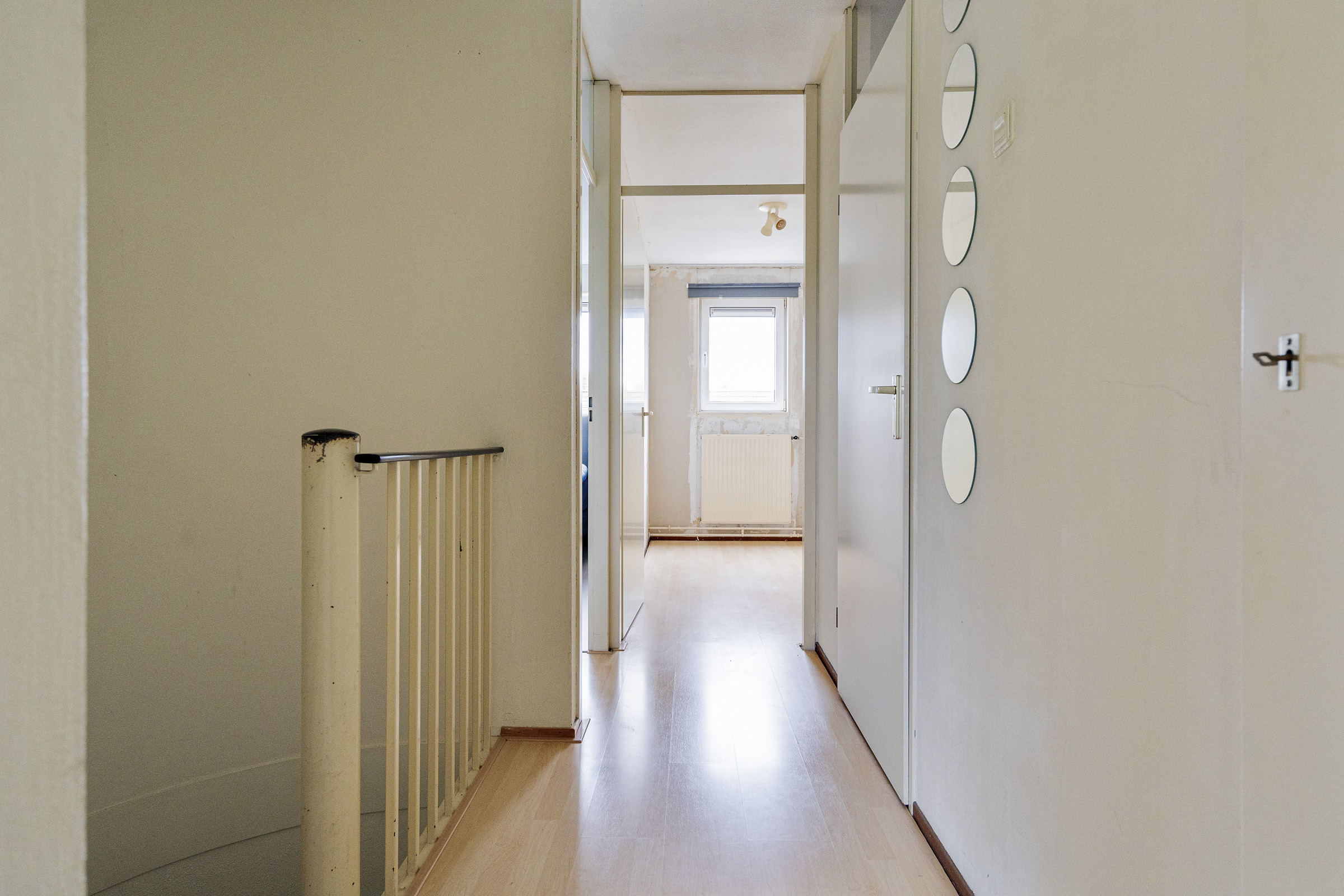 Overloop, aan de voorzijde is gelegen de eerste slaapkamer en de badkamer, die voorzien is van een douche, toilet, wastafel en een wasmachine-aansluiting. Op de overloop tref je nog een stookruimte met de opstelplaats van de