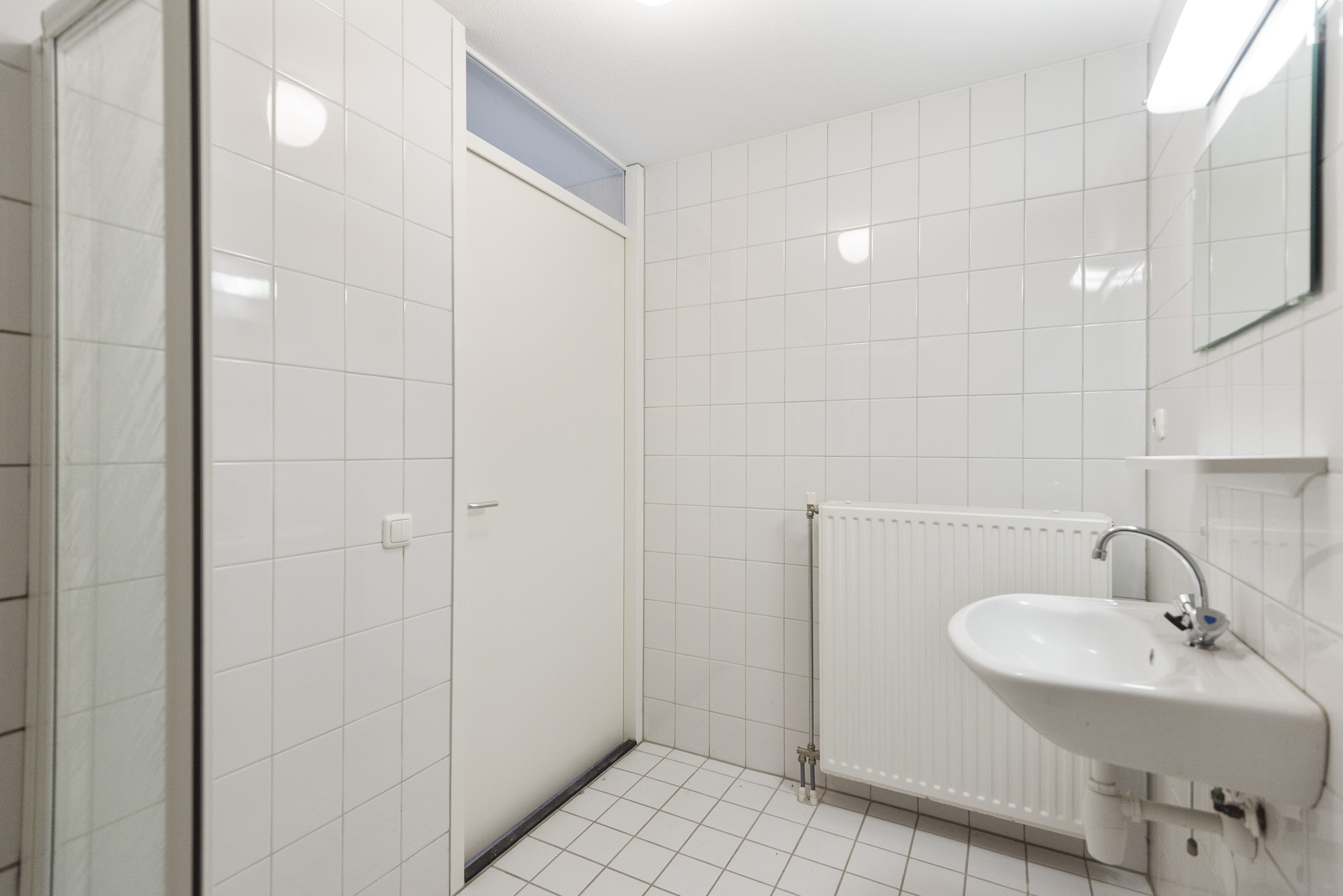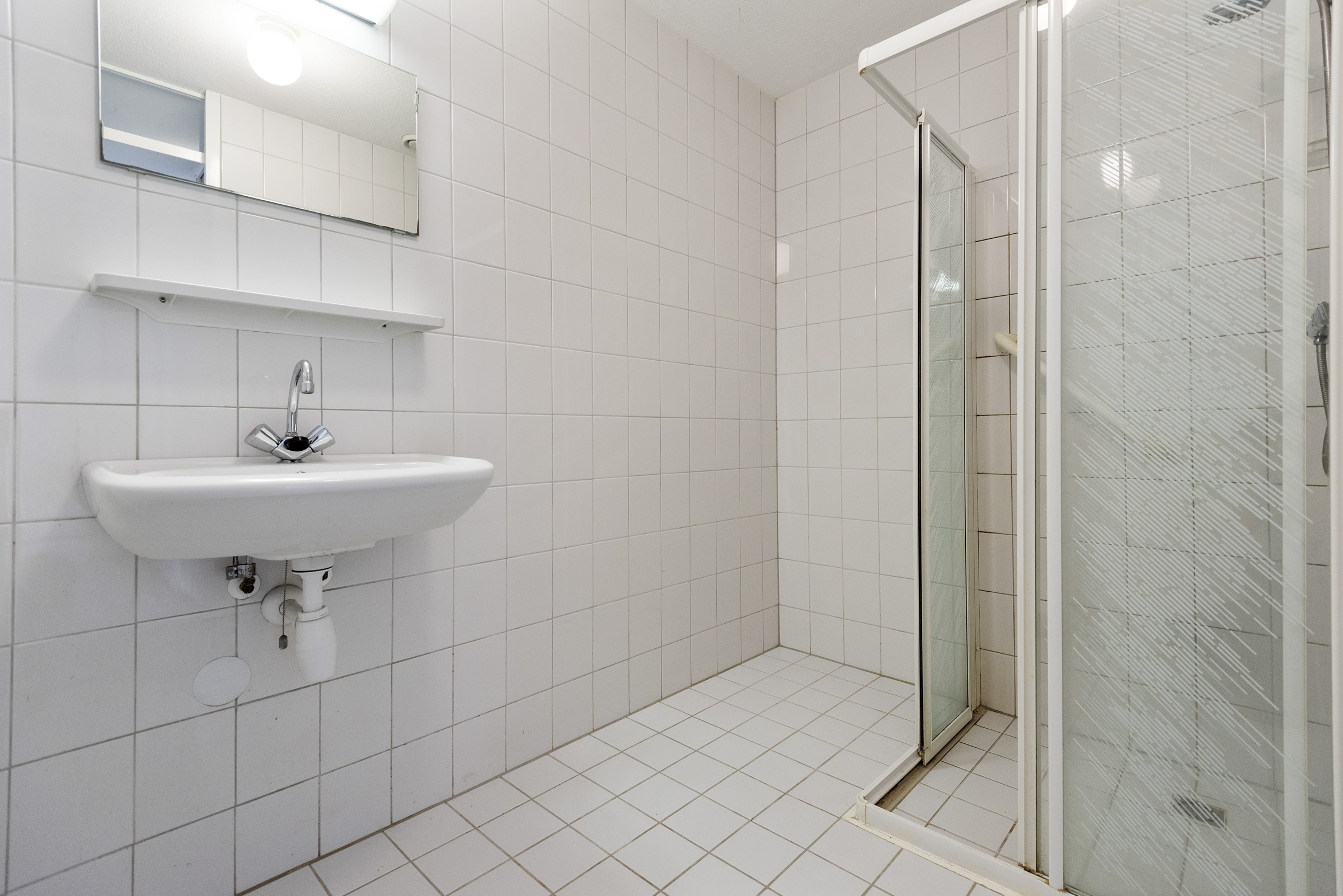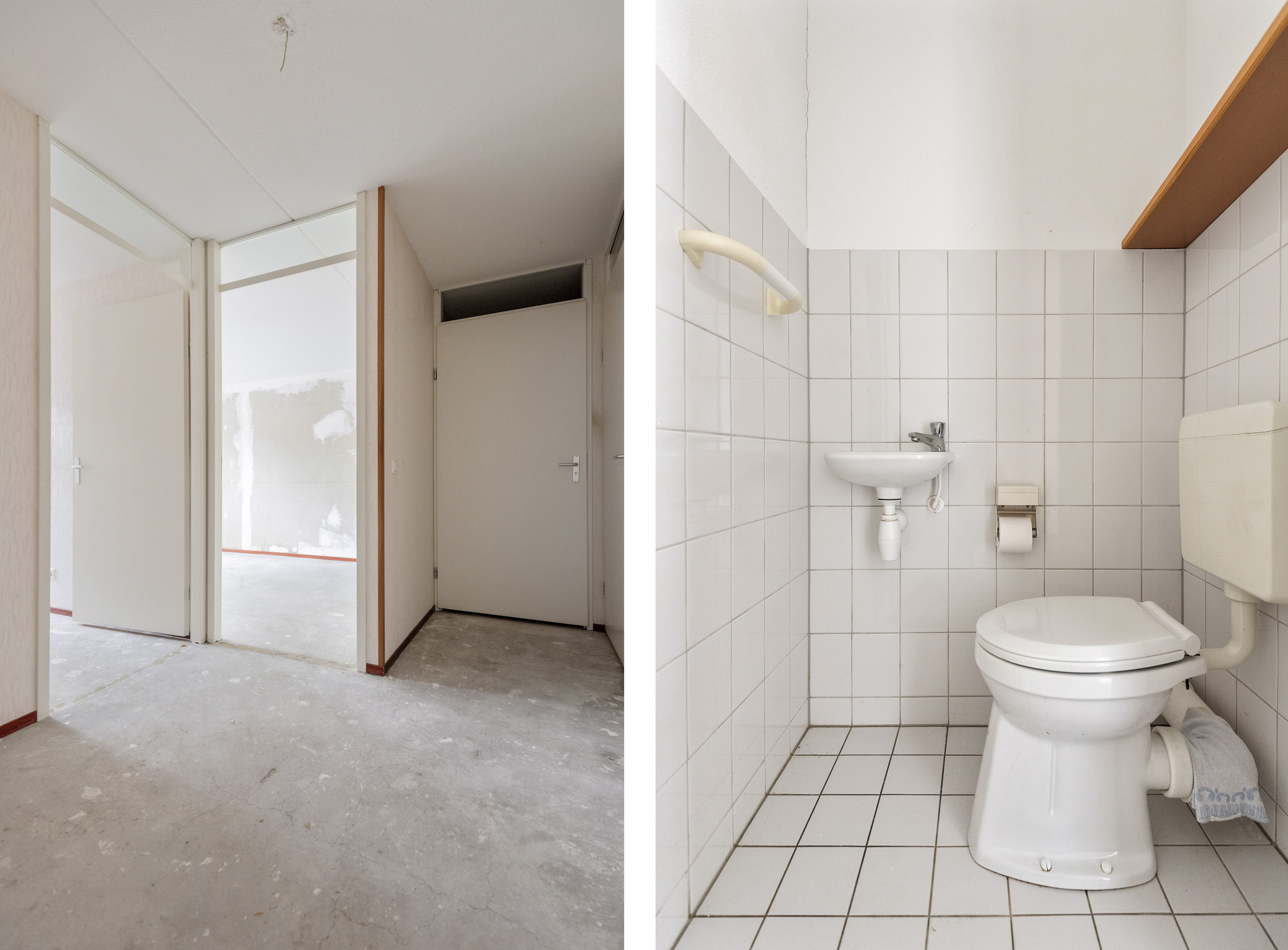 Entree, hal en het toilet met fonteintje. De woonkamer geeft toegang tot het op het zuidoosten gelegen balkon. De basic open keuken is voorzien van een afzuigkap. Er is een riante ouderslaapkamer en ruime 2e slaapkamer. De badkamer is voorzien van een douche en wastafel. In de wasruimte tref je de aansluitingen van de wasmachine en droger, de CV-ketel (Intergas HR, circa 2019) en mechanische ventilatie.