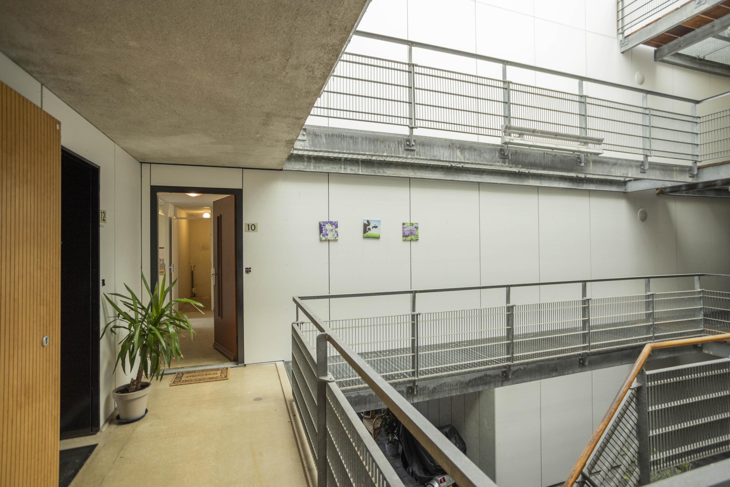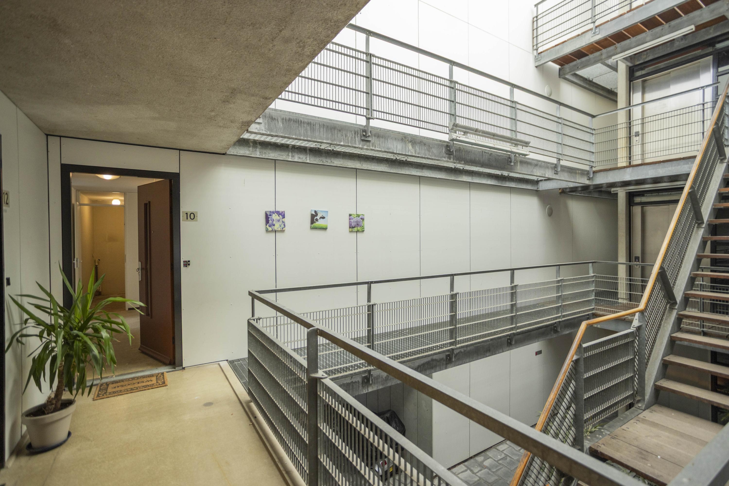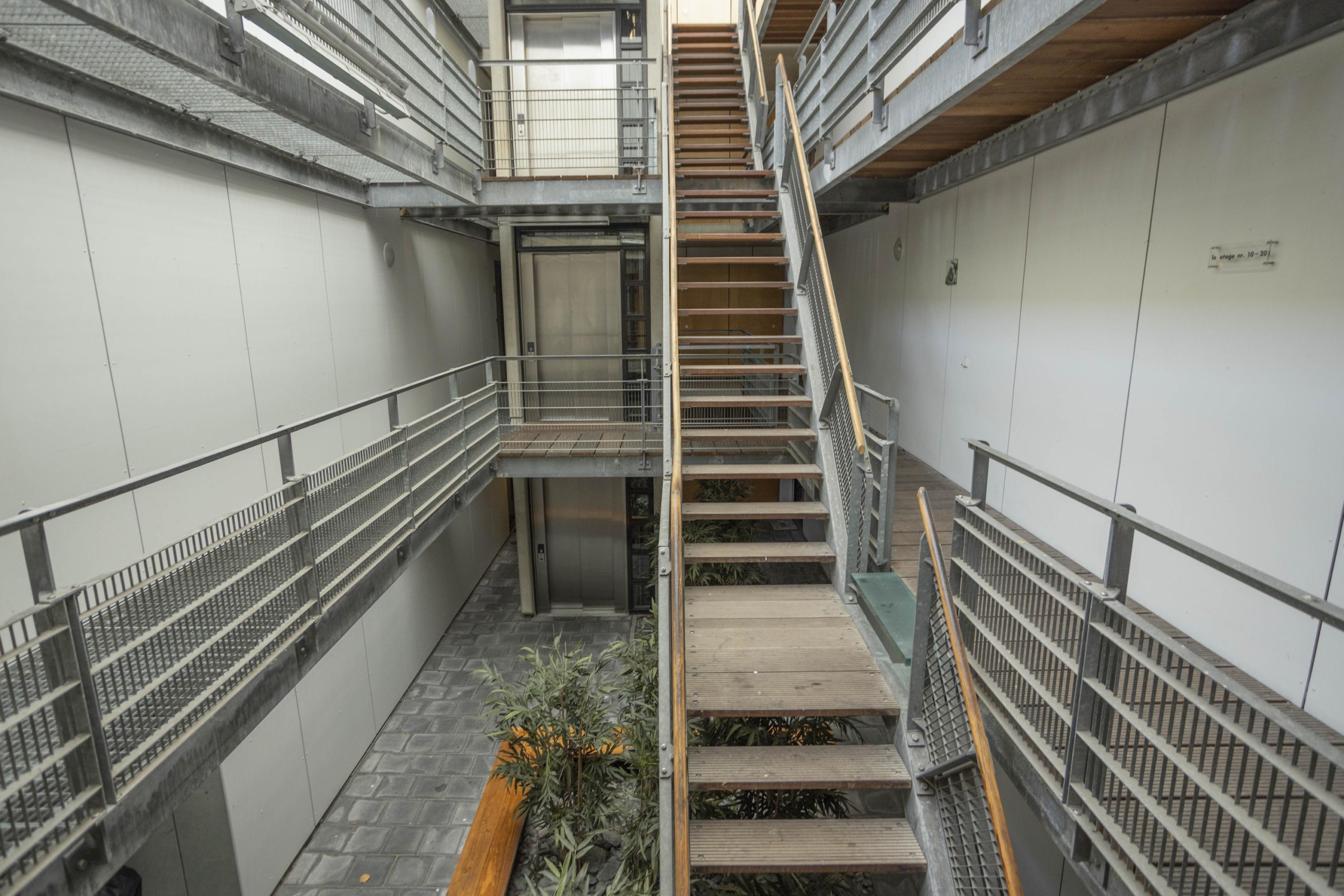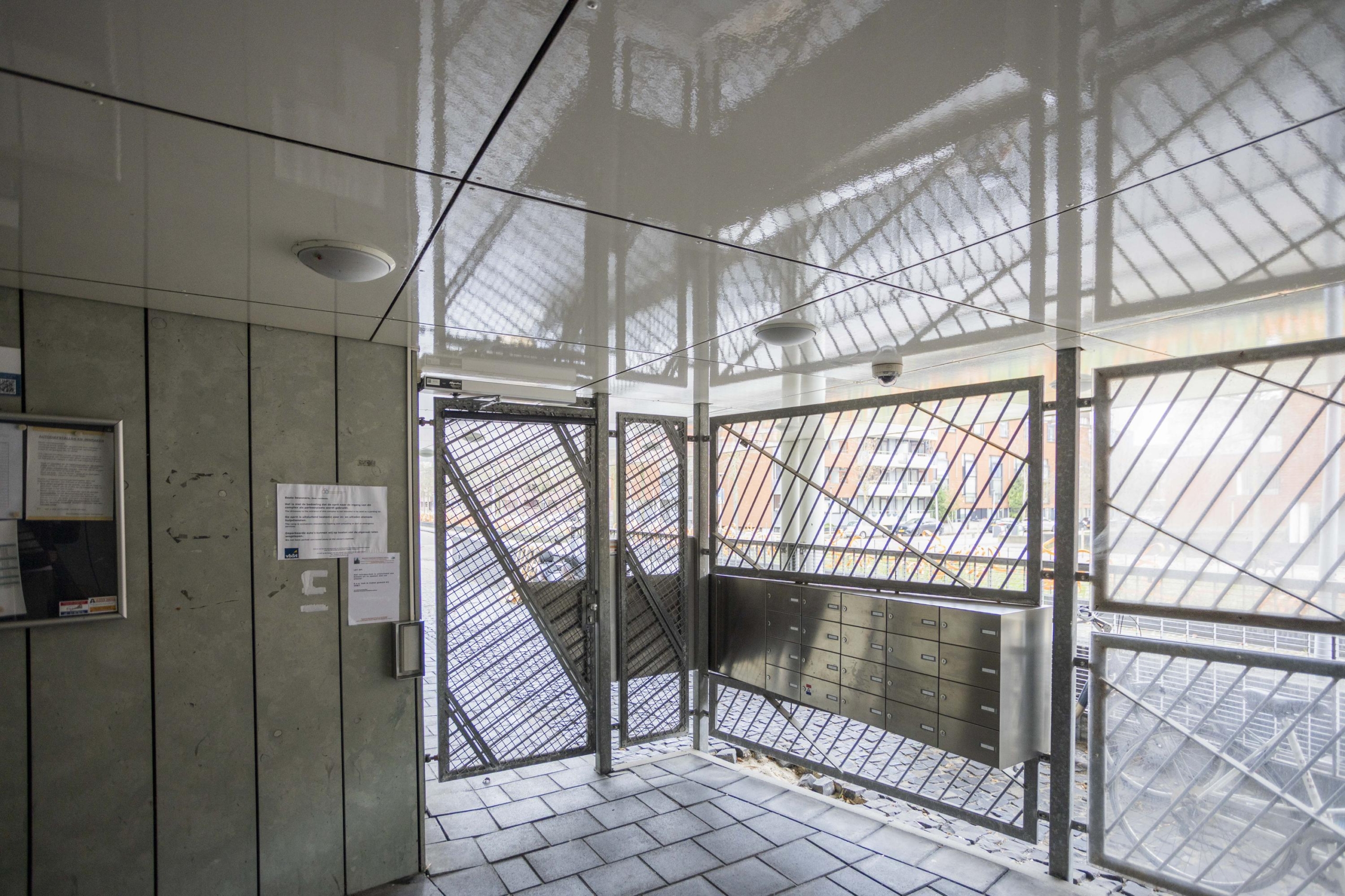 Centrale entree, brievenbussen, bellentableau, trap, lift, algemene (fietsen)berging en trapafgang naar de privé-bergingen.