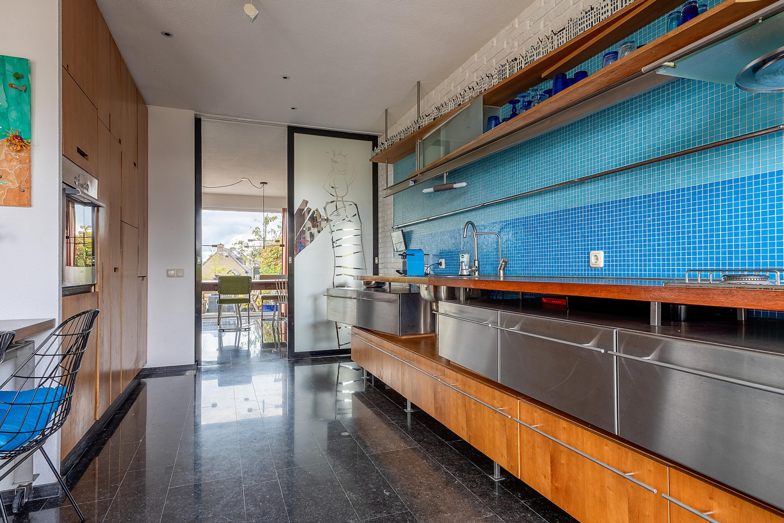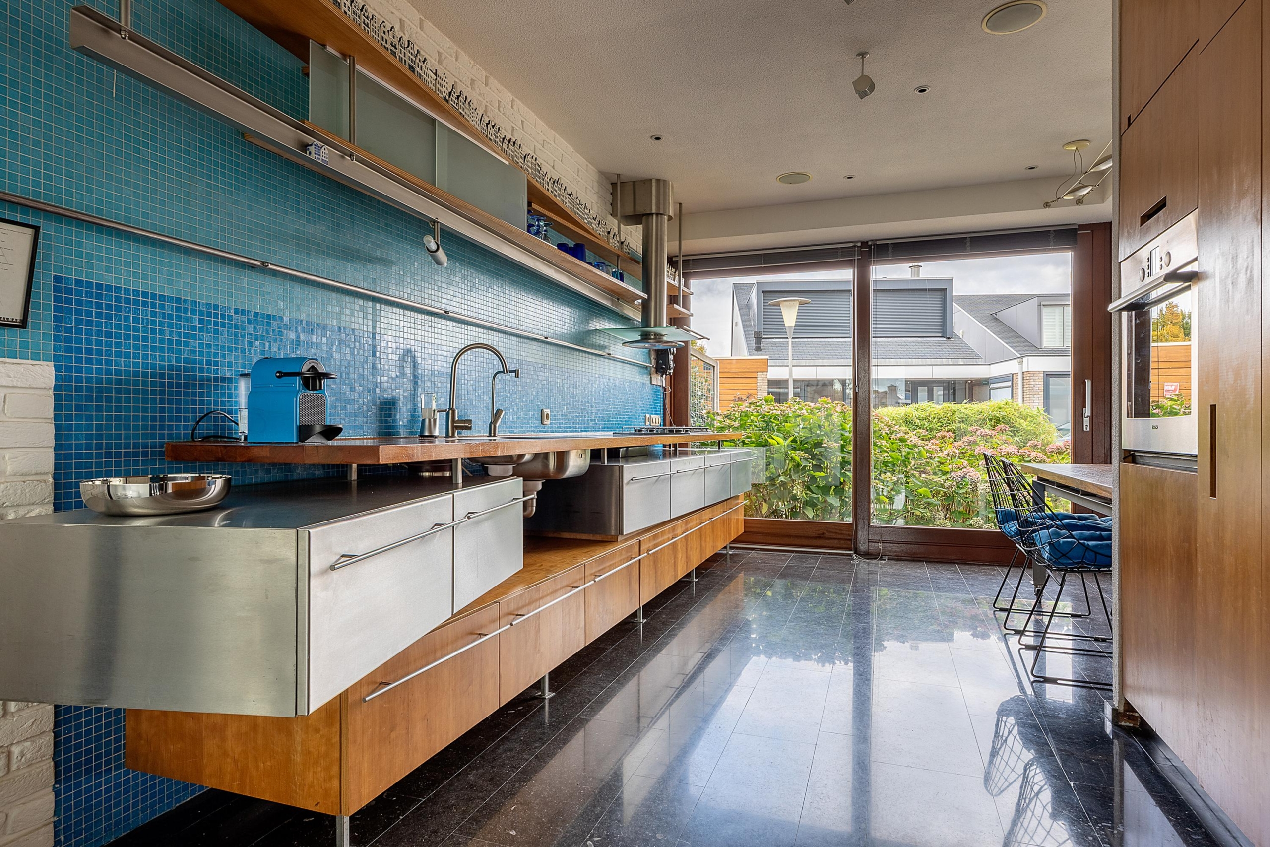 De keuken met speelse indeling is voorzien van een 4-pits gasfornuis, afzuigkap, oven, magnetron, vaatwasser, koel-vriescombinatie en handige apothekerskasten. De keuken staat in verbinding met de woonkamer via een schuifdeur. De tuingerichte woonkamer biedt een prachtig uitzicht over het water. Aangrenzend bevindt zich een kantoorruimte met daklicht. Via de kunststof schuifpui bereik je de fraai aangelegde verzorgde achtertuin aan het water, met ligplaats. Tevens tref je een vernieuwd zonnescherm. De gehele begane grond is voorzien van vloerverwarming.