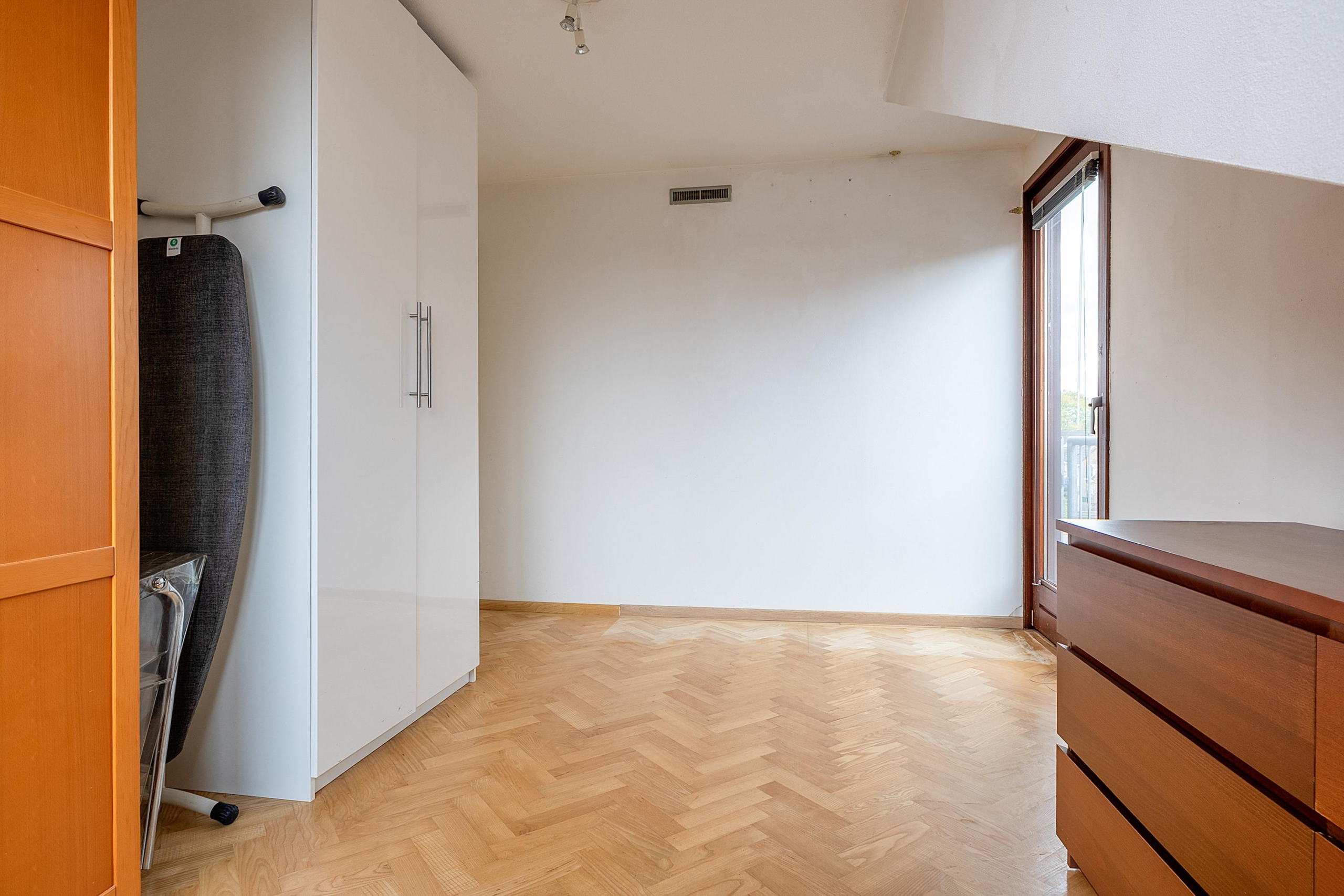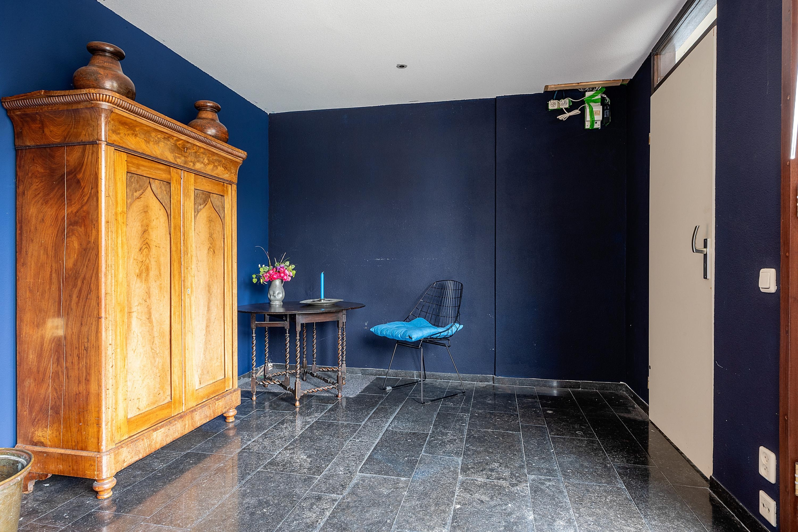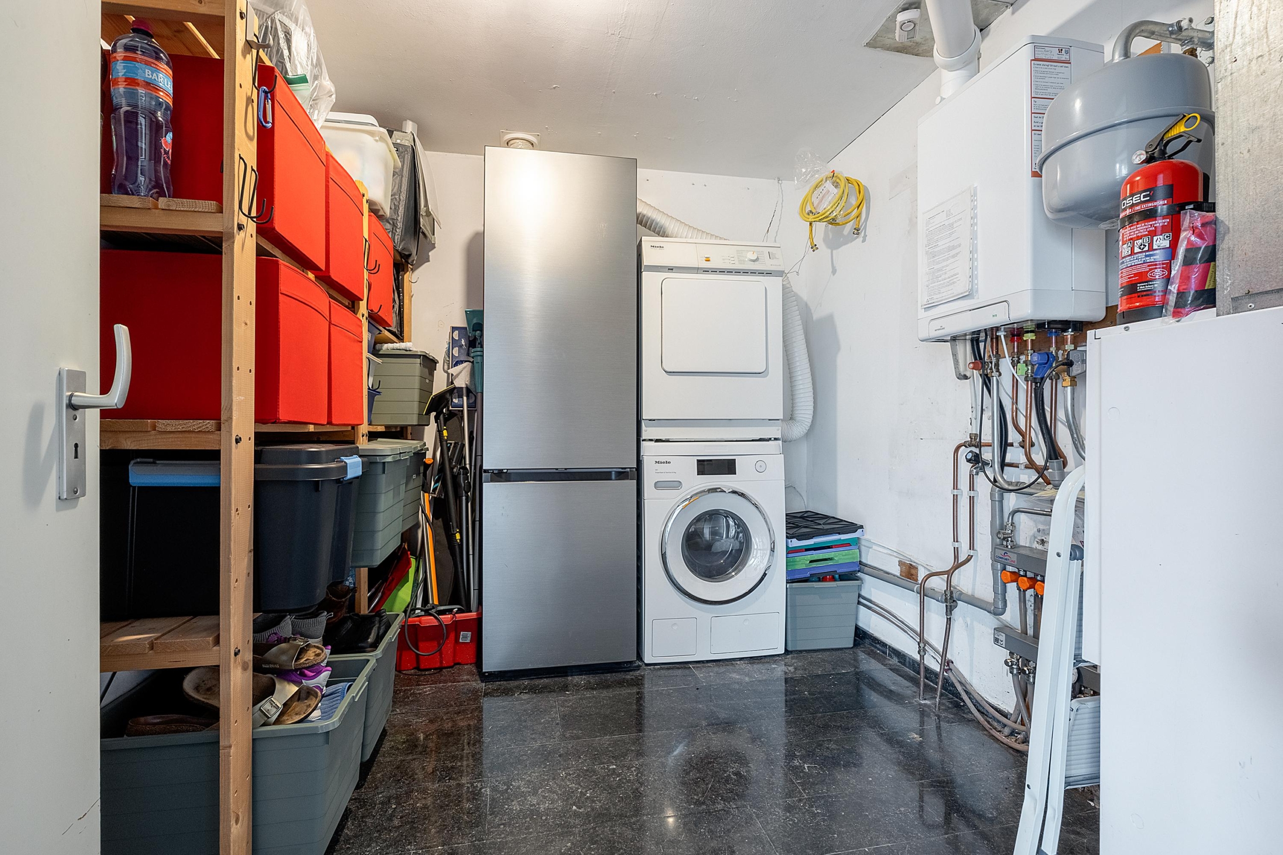 Ruime entree met garderobe en meterkast. Grote slaapkamer aan de voorzijde met wastafel. In de hal bevindt zich een praktische kast met wasmachine- en drogeraansluiting, CV-ketel (Intergas, bouwjaar circa 2024, huur !!) en extra bergruimte.