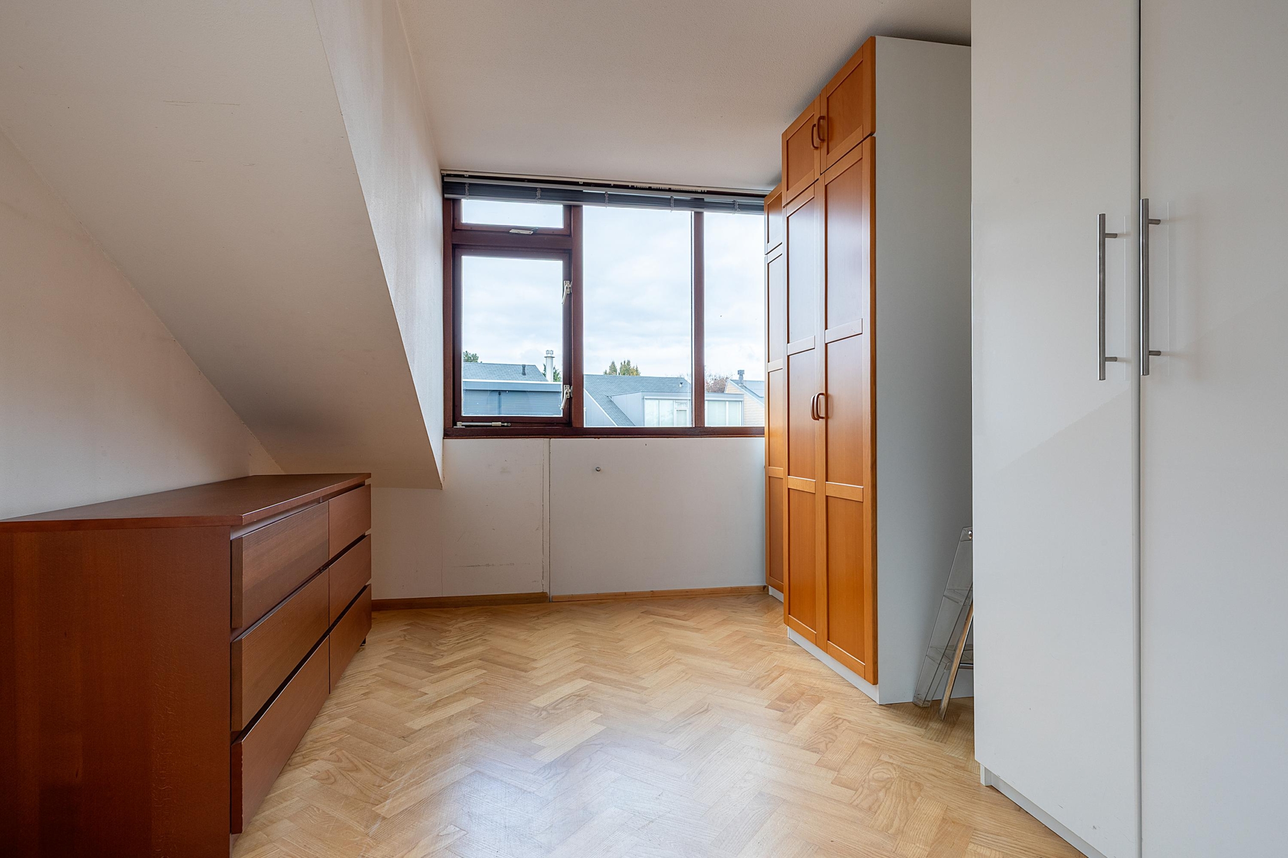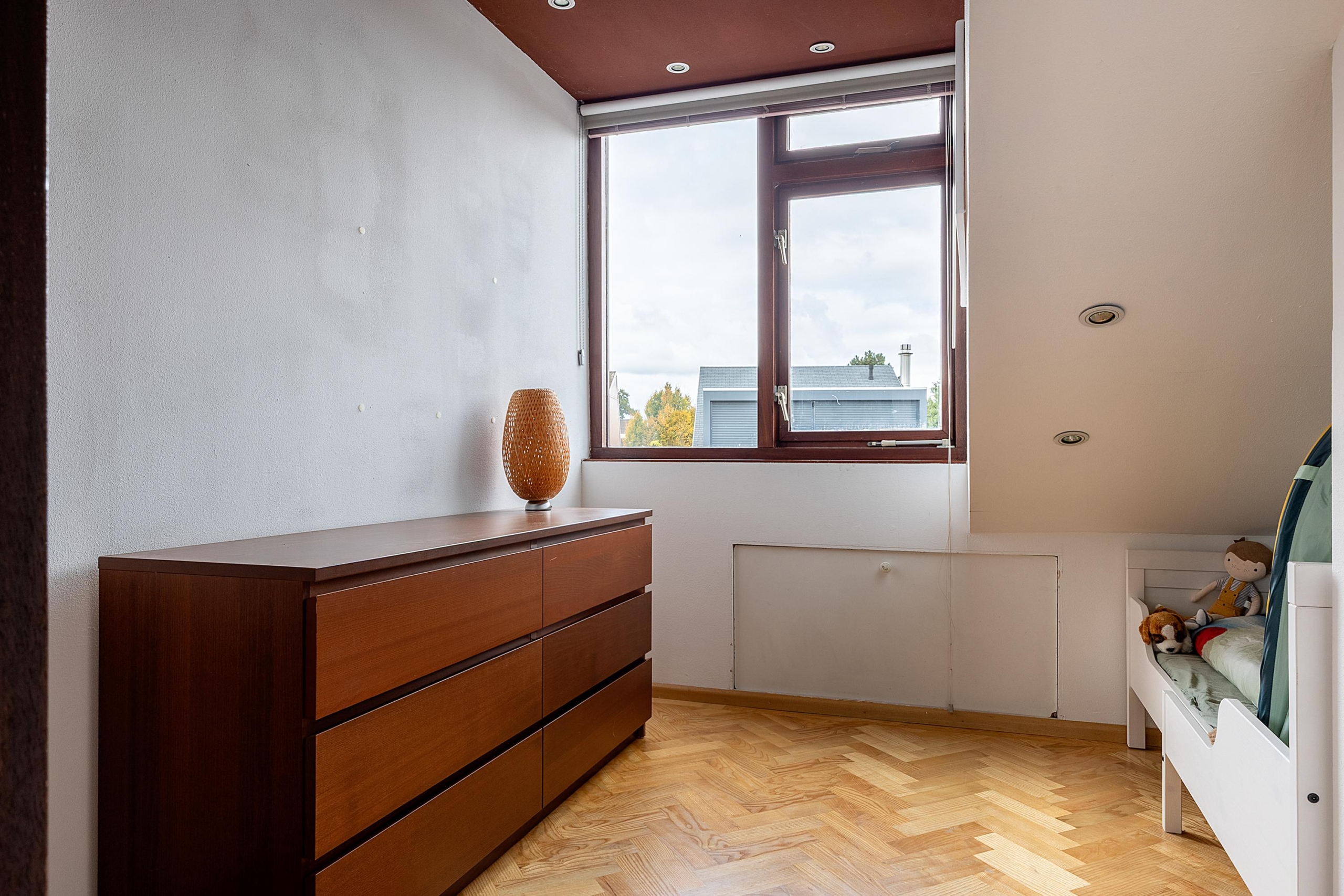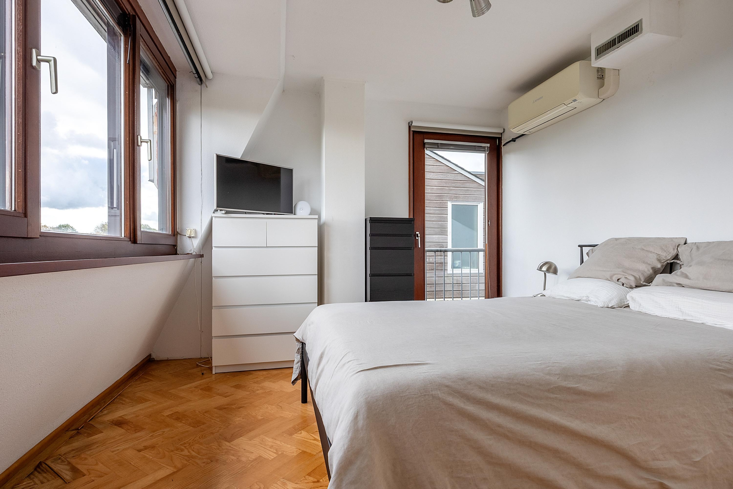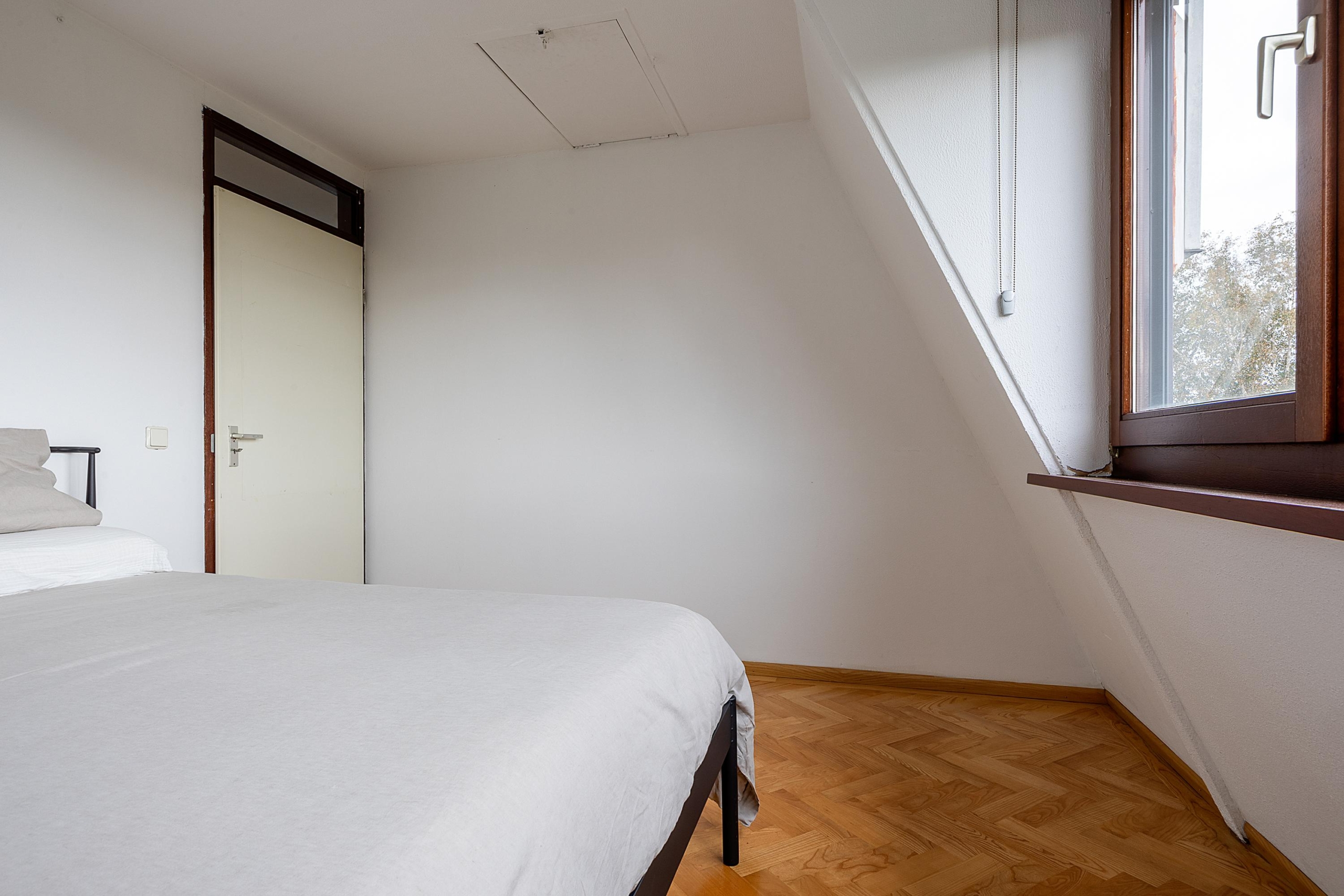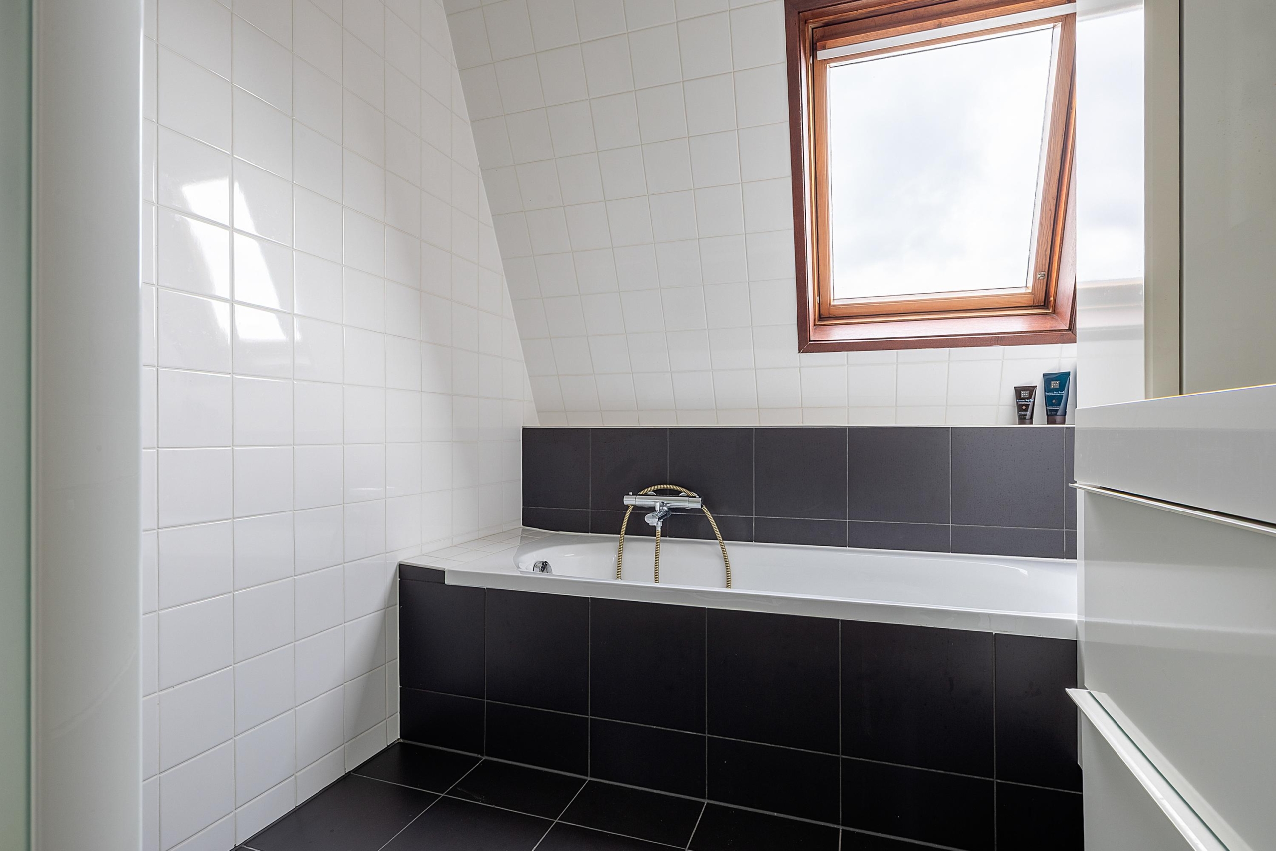Overloop met toegang tot de drie overige slaapkamers, voorzien van dakkapel. De ruime slaapkamer aan de achterzijde beschikt over een airco met verwarmingsfunctie, zonnescherm en toegang tot de bergvliering. De badkamer is uitgerust met een ligbad, douche, wastafelmeubel en daklicht. De 2 overige kamers zijn voorzien van praktische knieschotten. Alleen de slaapkamer met airco wordt momenteel verwarmd