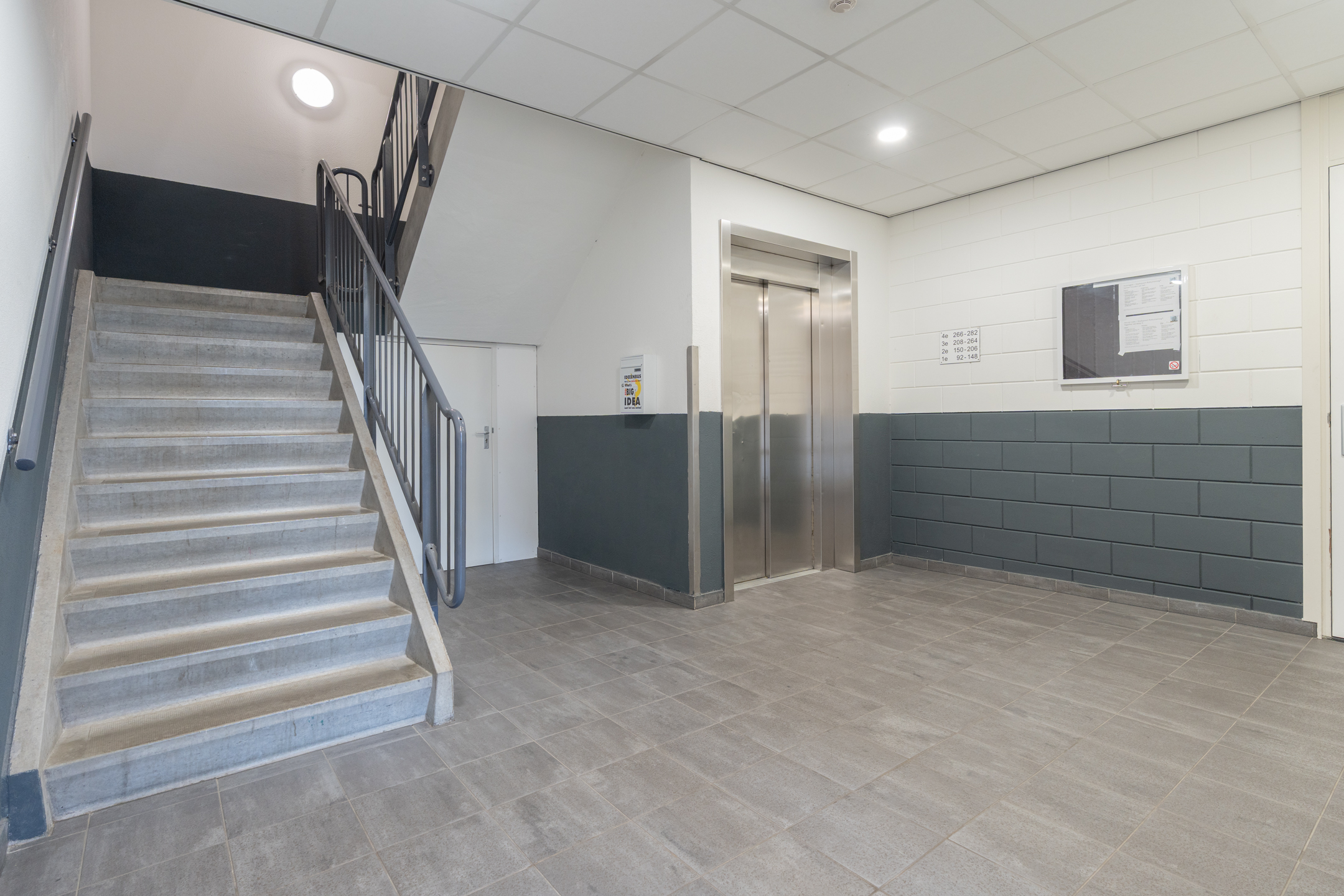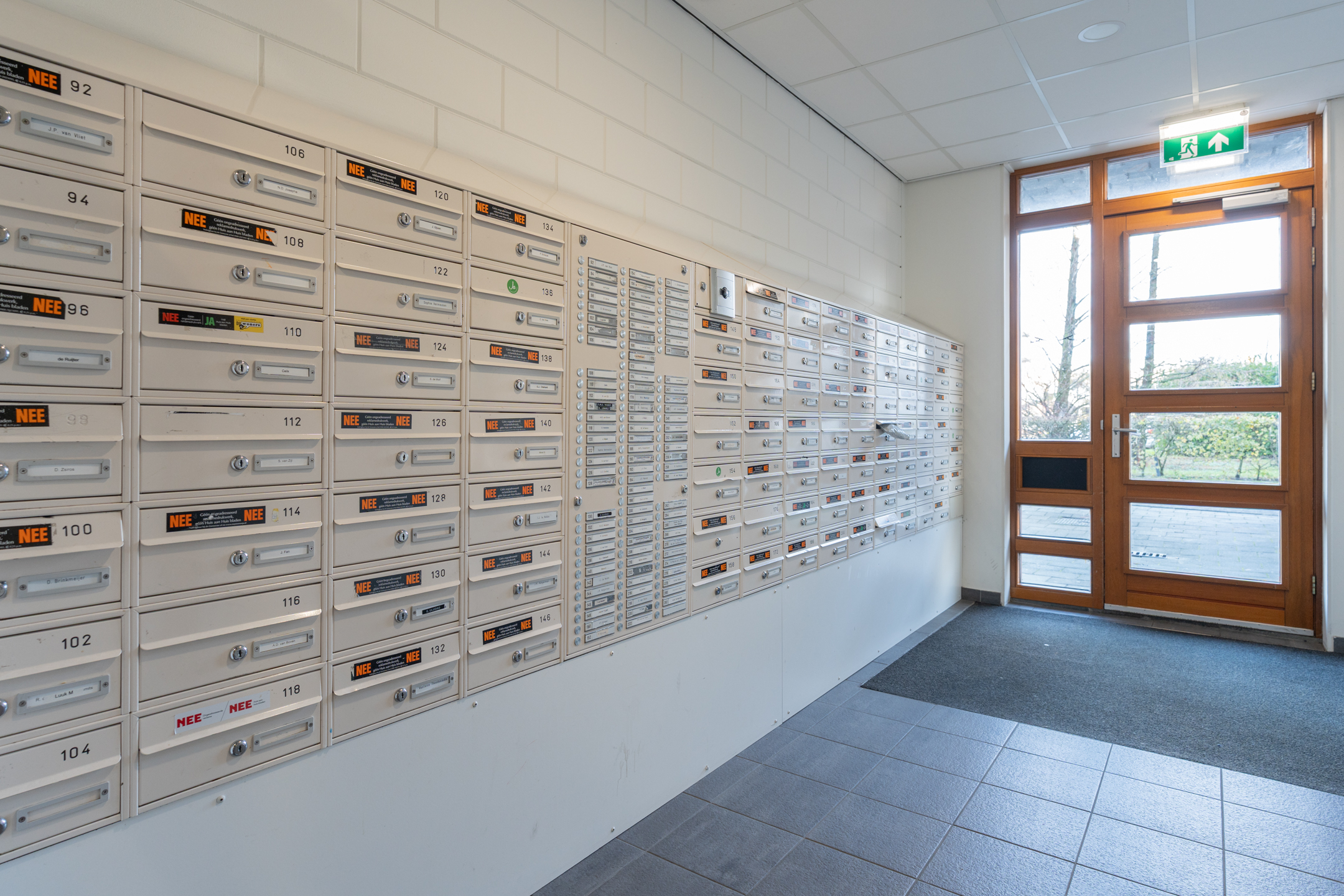 Centrale entree, algemene hal met bellentableau, brievenbussen, afgesloten toegang tot de lift en het trappenhuis. Buiten bevindt zich de afgesloten, gezamenlijke, fietsenberging.