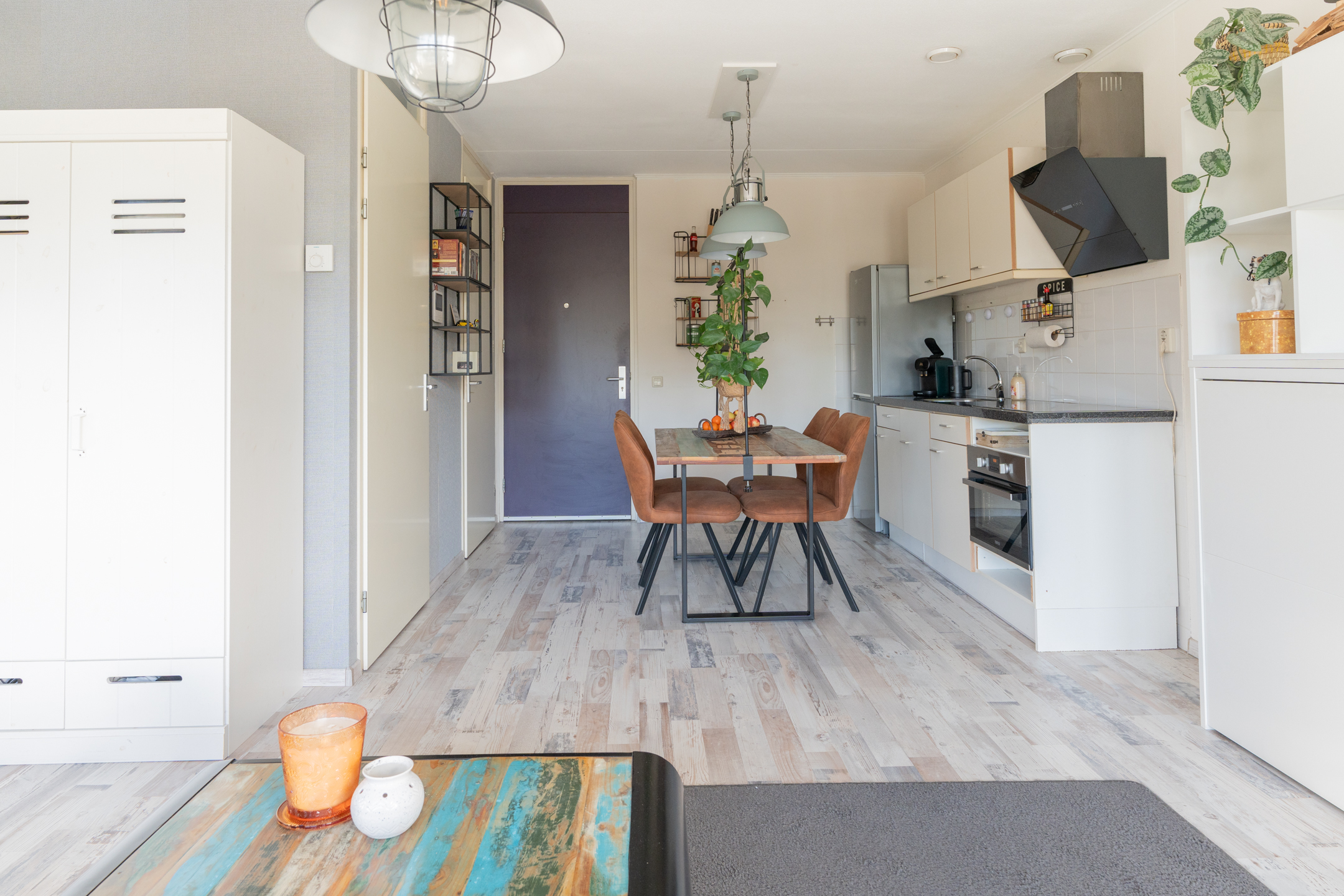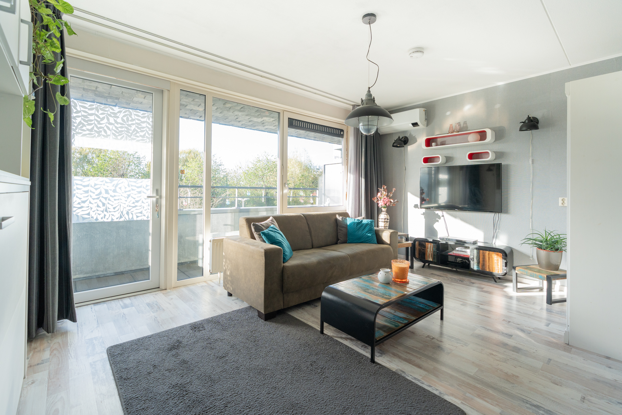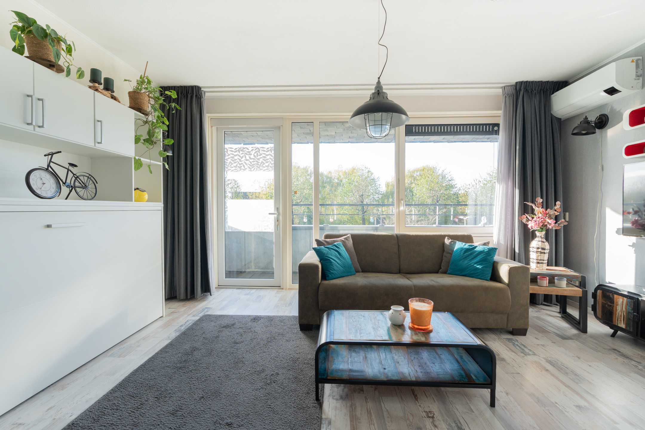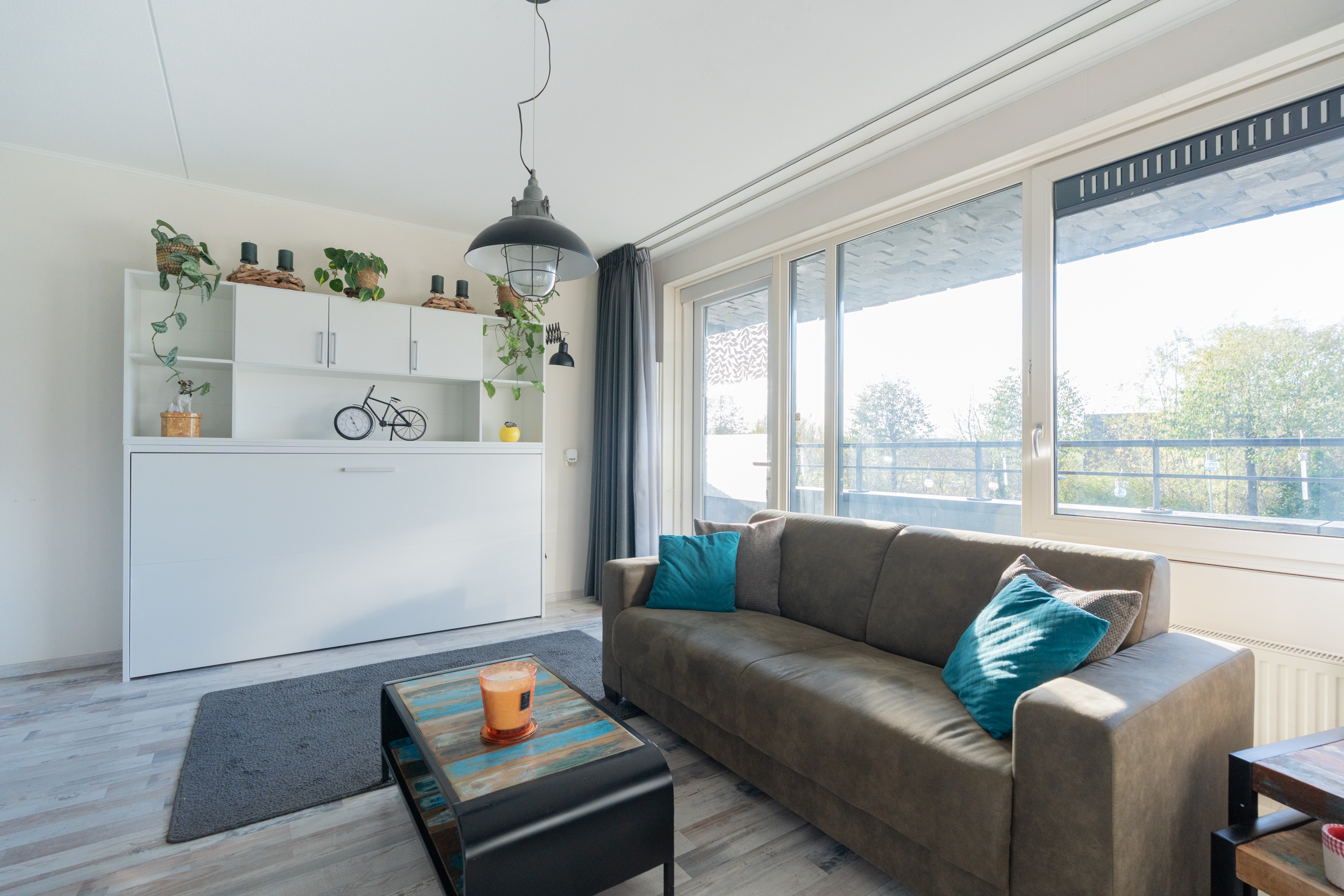 Je komt binnen in de lichte woon-/slaapkamer met grote raampartijen en een nette open keuken met stenen blad en recent vernieuwde inductiekookplaat, afzuigkap en oven. Dankzij de airco is het hier altijd comfortabel. Via de woonkamer stap je zo het royale balkon op, gelegen op het zuidwesten, perfect om van de middag- en avondzon te genieten, met een vrij en groen uitzicht. De frisse badkamer is uitgerust met een douchecabine, wastafelmeubel en toilet. In de praktische provisieberging vind je volop opbergruimte, meterkast en de aansluiting voor de wasmachine. Het bed is slim weggewerkt in een kast, maar wie wil, kan hier eenvoudig een aparte slaapkamer creëren.
