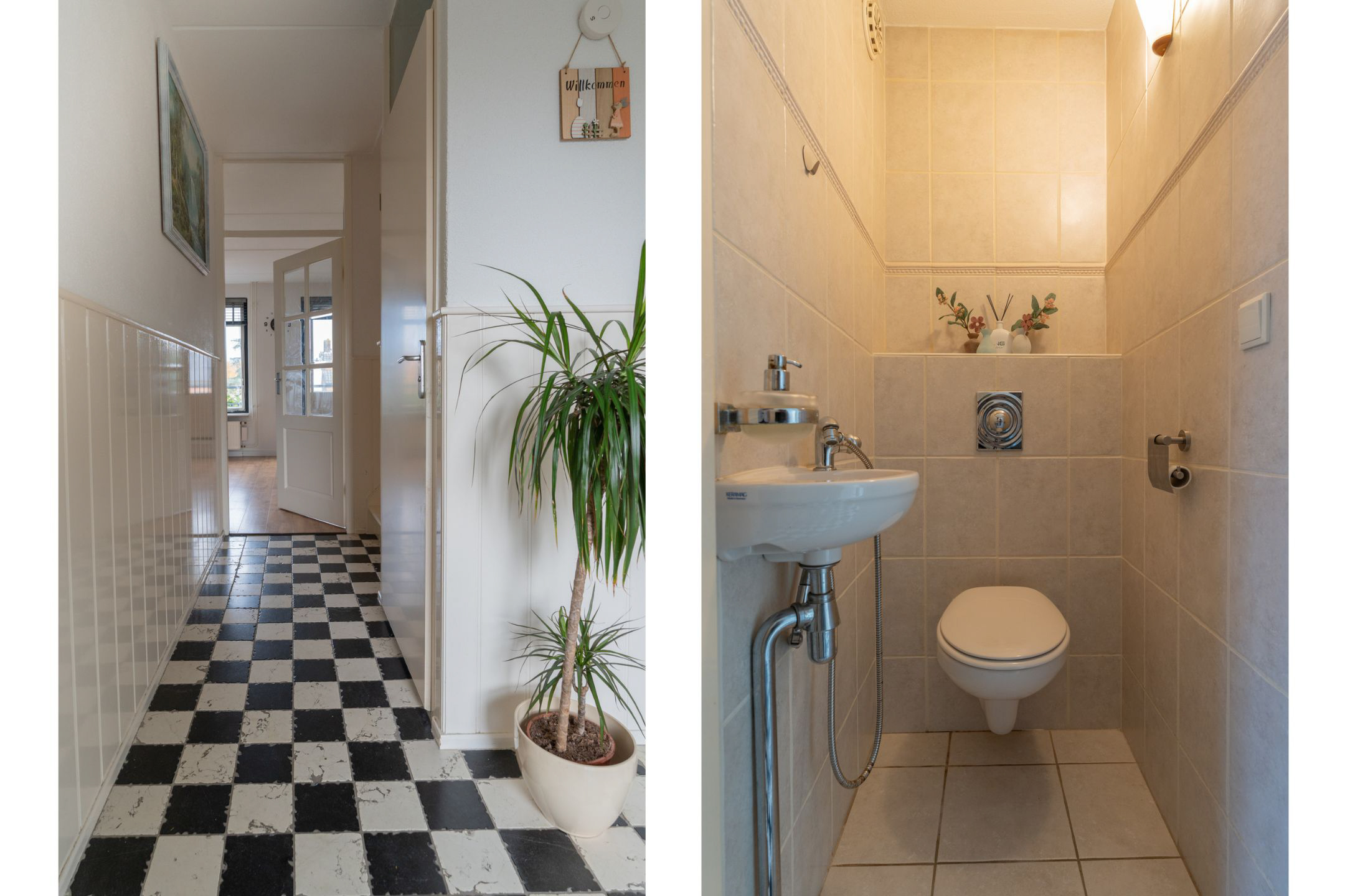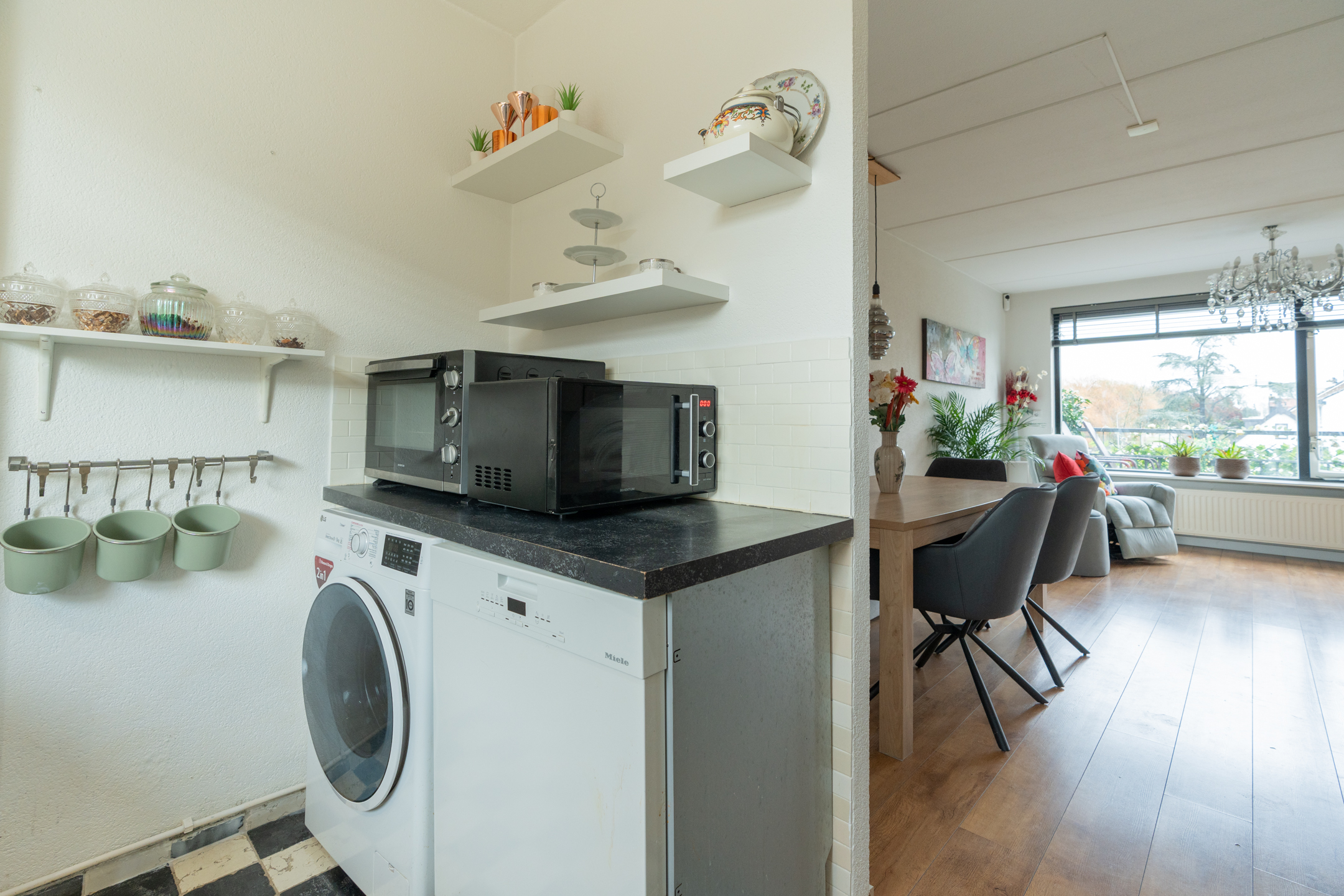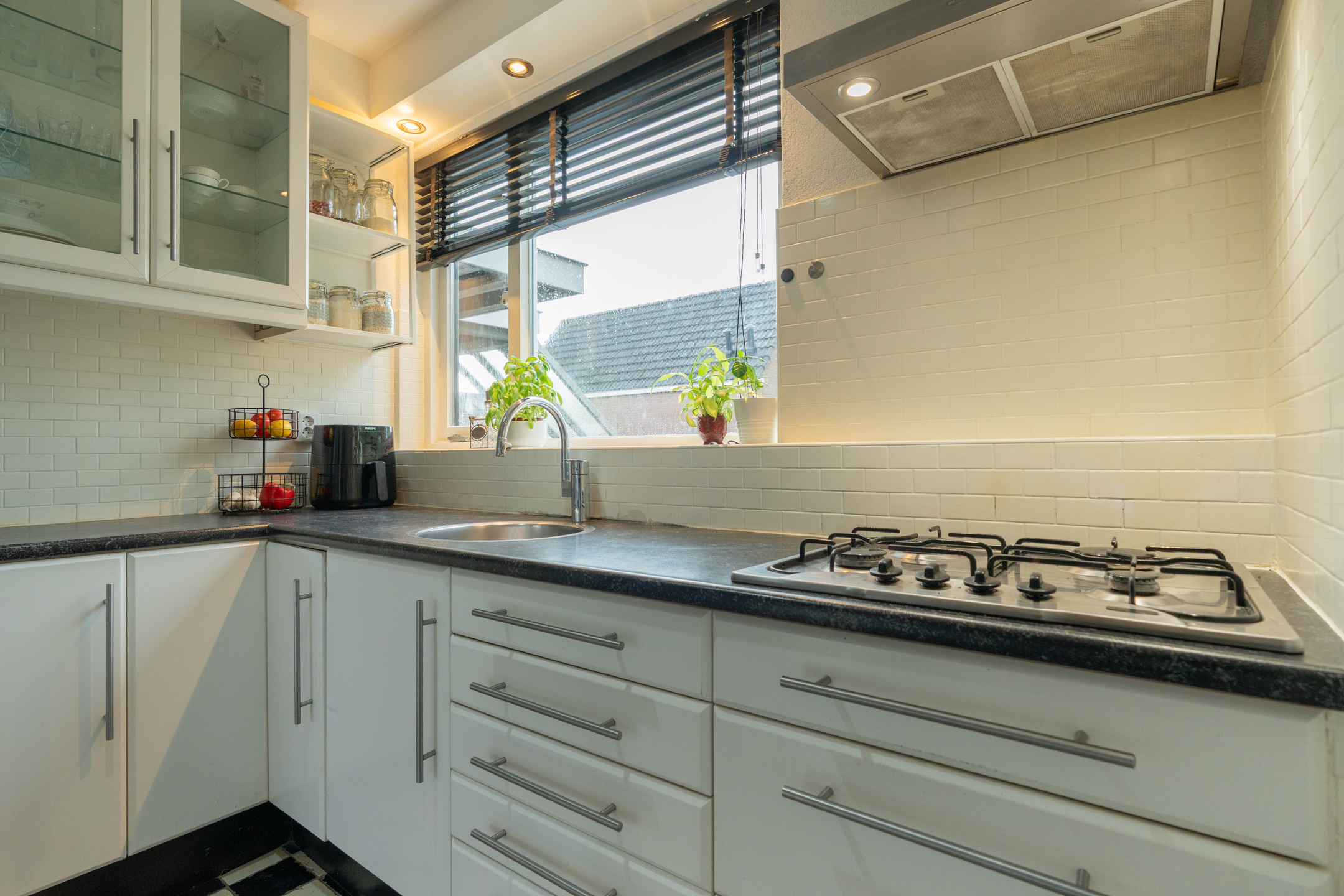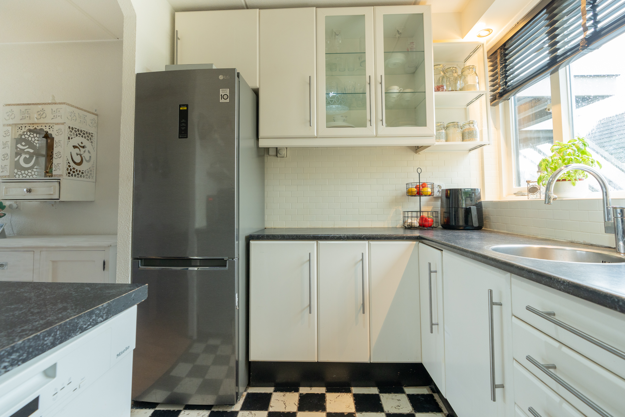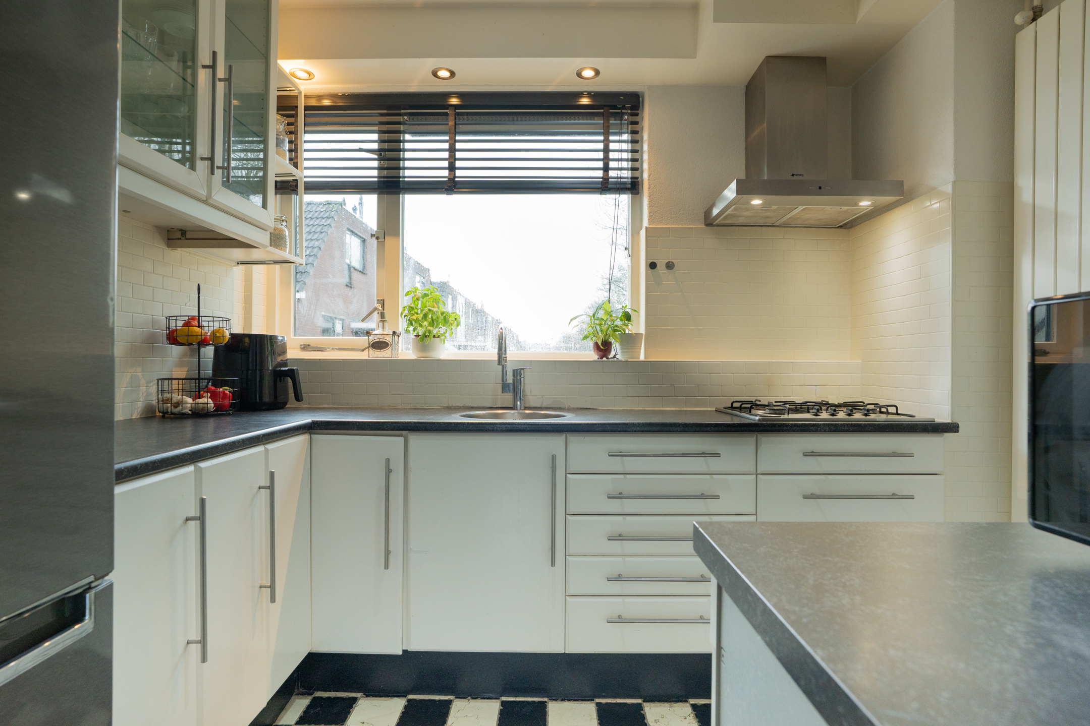 Entree, hal met stijlvolle zwart-witte vloertegel, kast met de c.v.-ketel (Vaillant 2023), vernieuwde uitgebreide meterkast (2023), glasvezel en slimme meters. Tevens tref je hier het toilet met fonteintje en de trapopgang. De lichte woonkamer heeft grote ramen en een handige provisiekast. Via de woonkamer stap je het balkon met vrij uitzicht op, waar je kunt genieten van de ochtendzon. De halfopen keuken aan de voorzijde is voorzien van een zwart-witte tegelvloer, een ingebouwd 4-pits gasfornuis met afzuigkap en losse apparatuur zoals oven, magnetron, vaatwasser en koel-/vriescombinatie. Hier vind je ook de aansluiting voor de wasmachine.