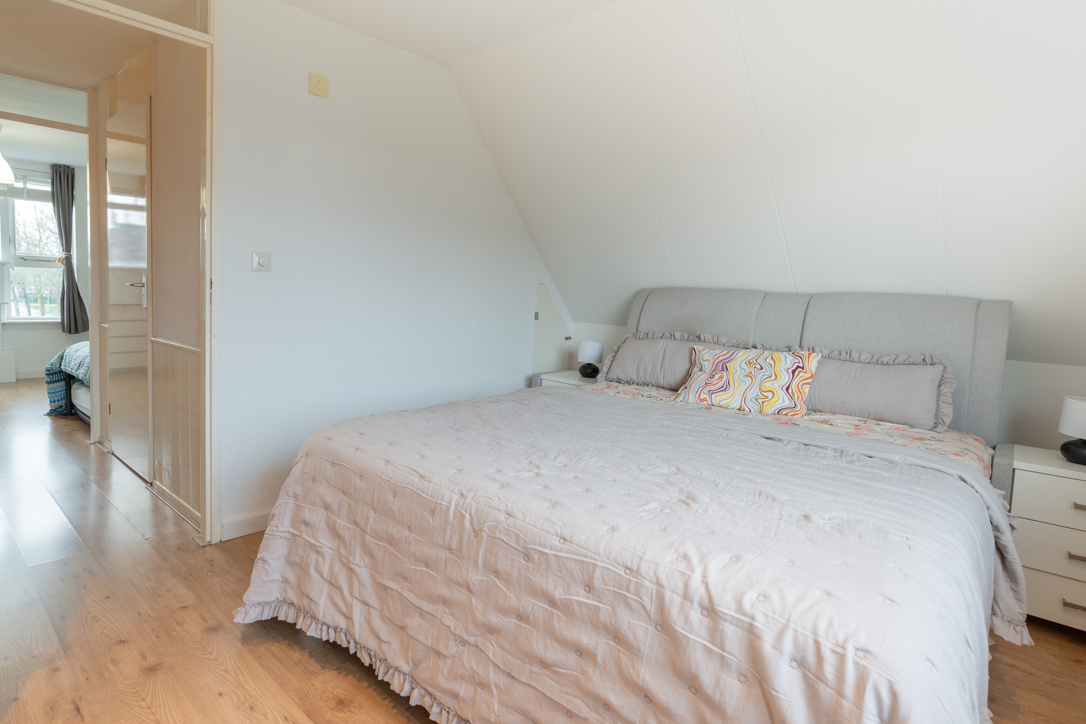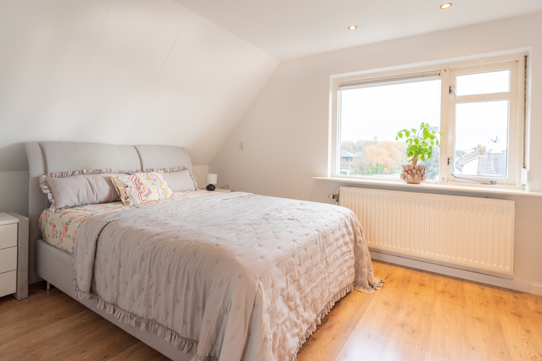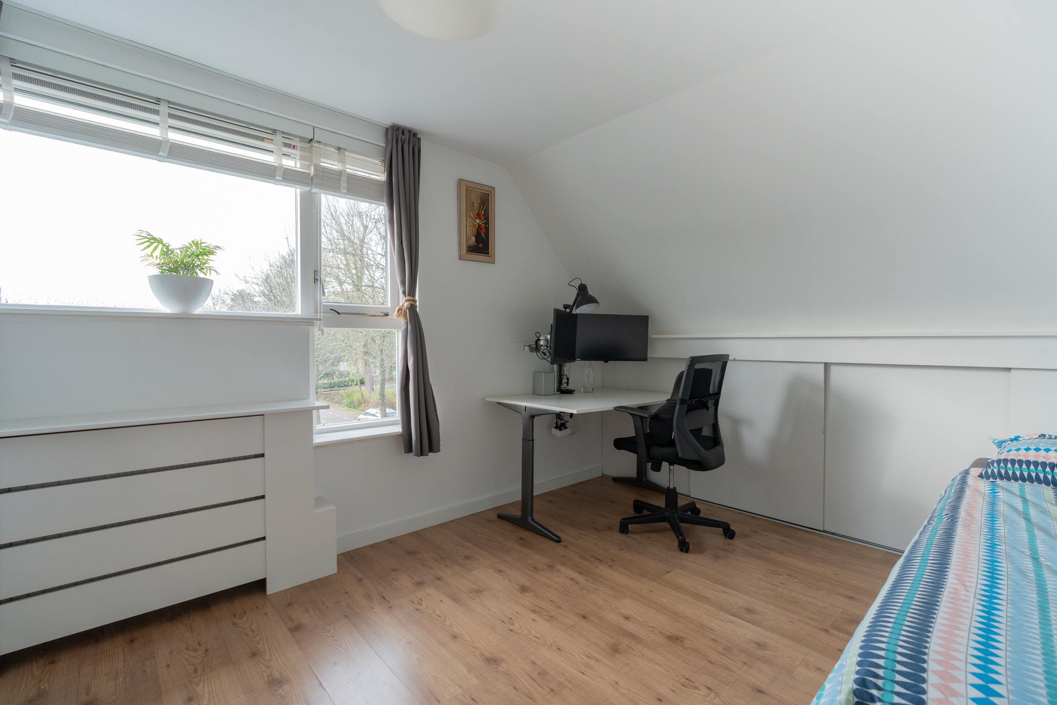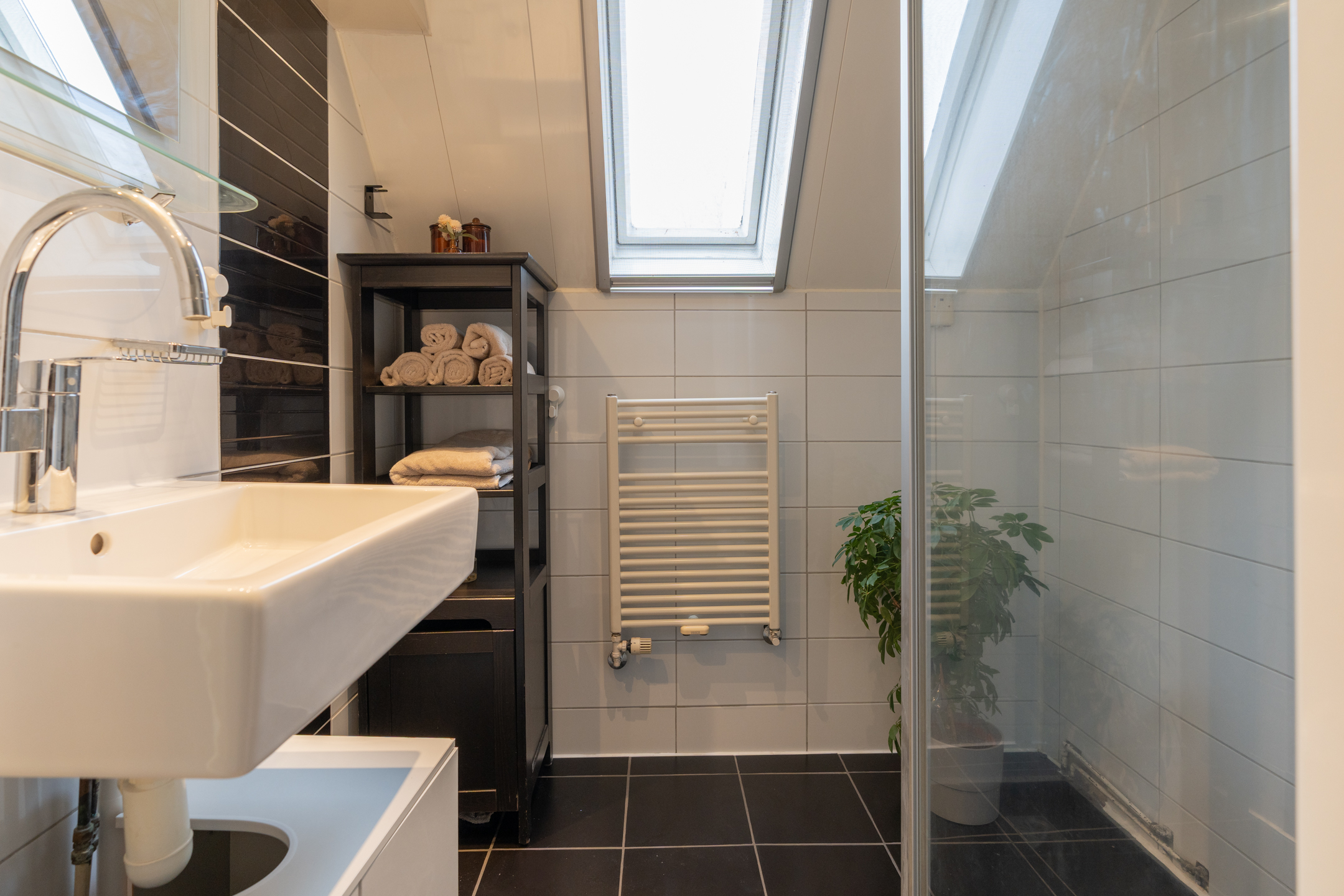 Ruime overloop met toegang tot twee royale slaapkamers. De slaapkamer aan de achterzijde is voorzien van een rolluik en ligt op het ochtendzonnetje. De slaapkamer aan de voorzijde beschikt over een grote kledingkast (blijft achter) en handige bergruimte achter de knieschotten. De badkamer is licht en praktisch ingedeeld met een douche, wastafel en dakraam.