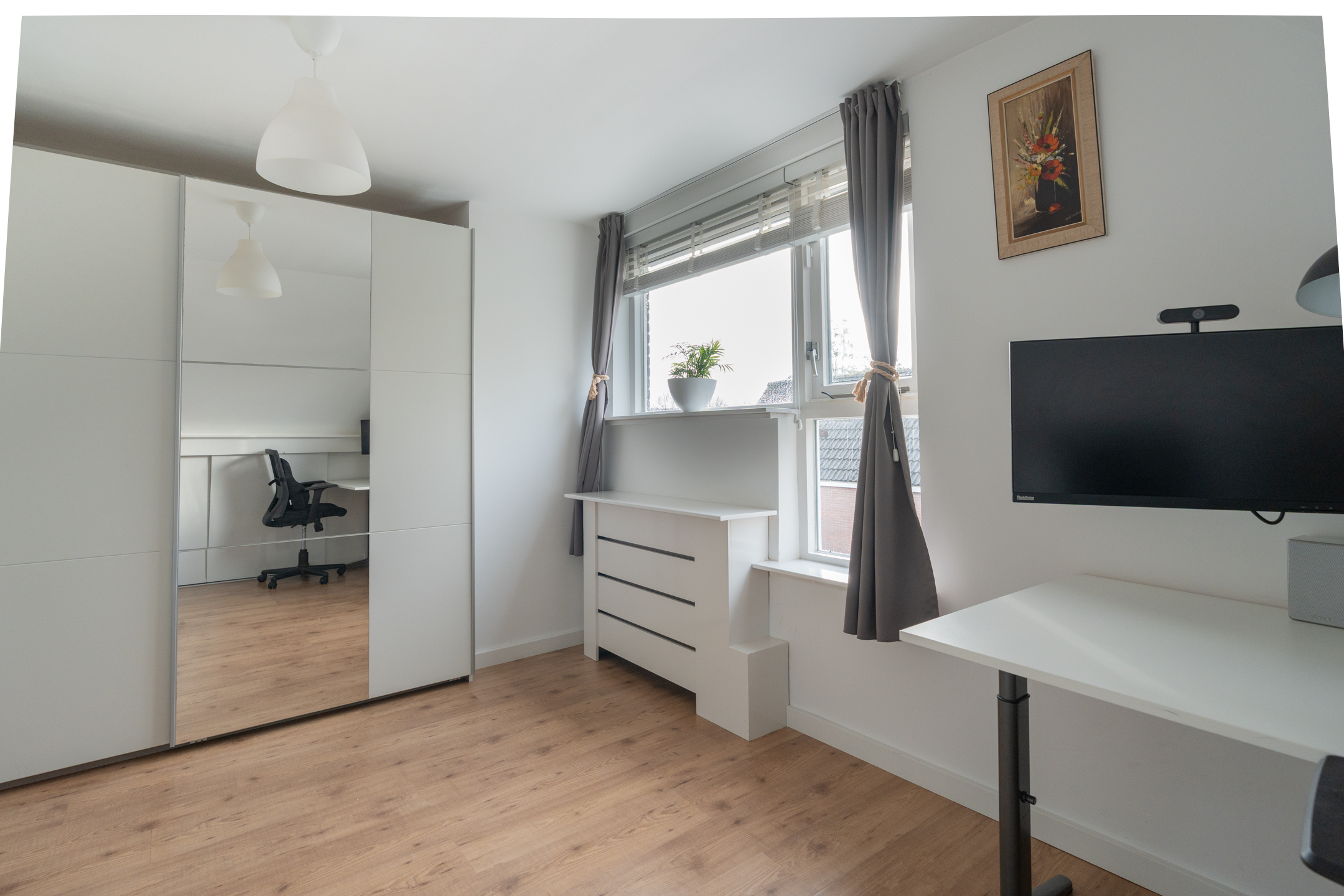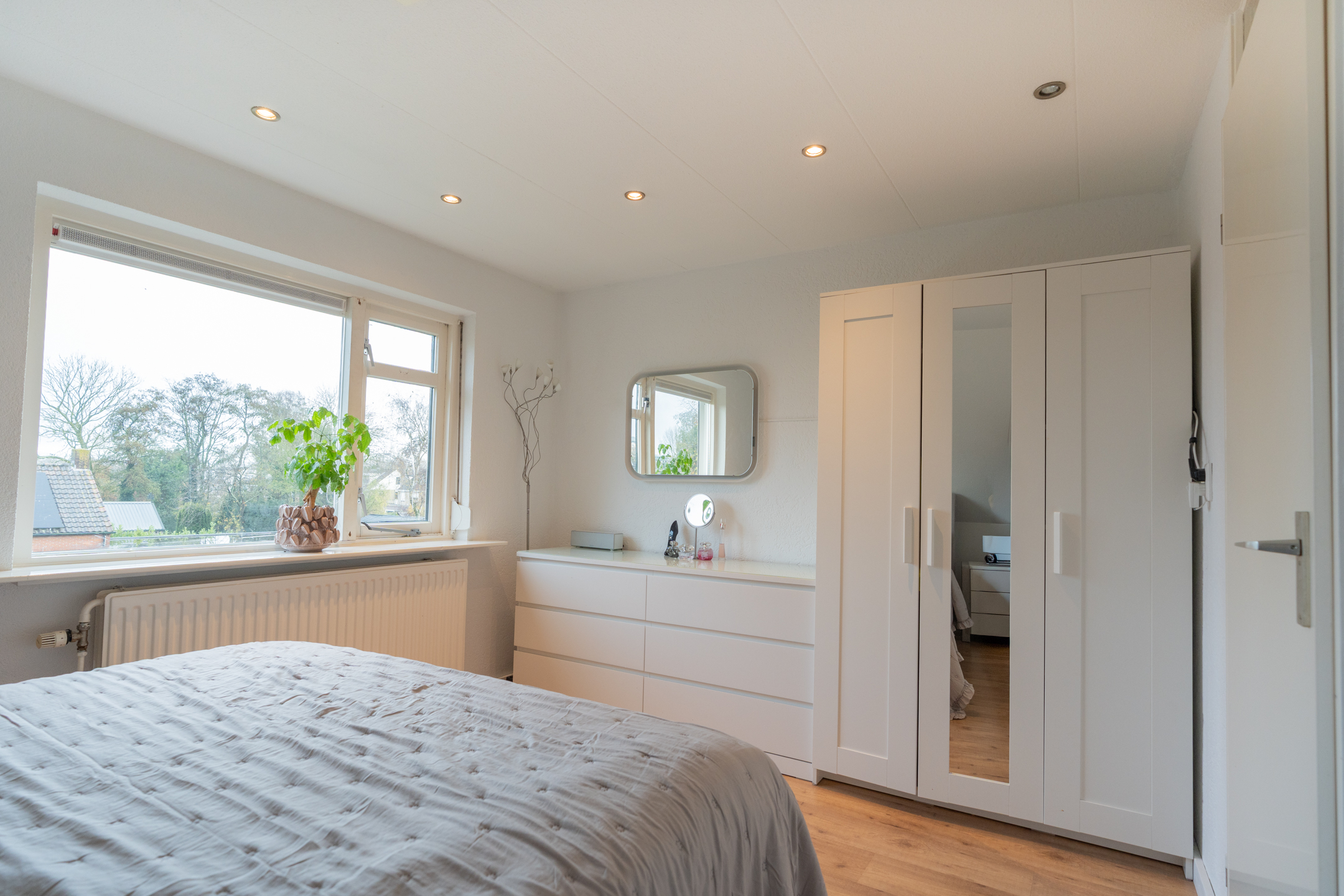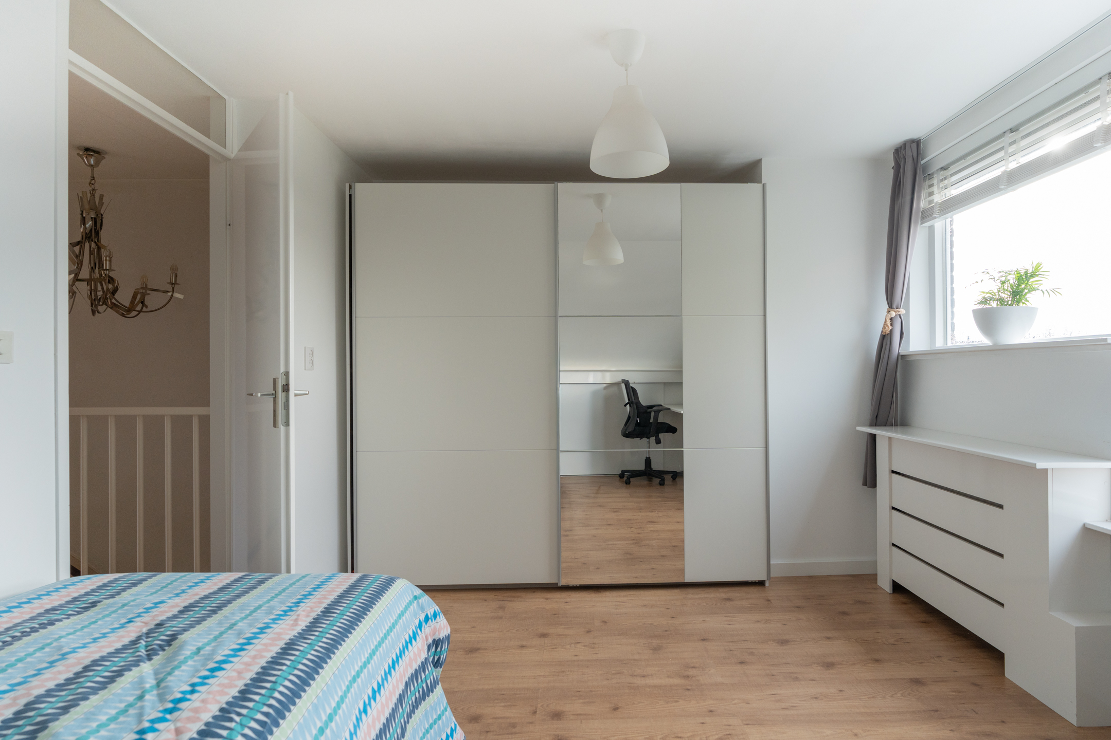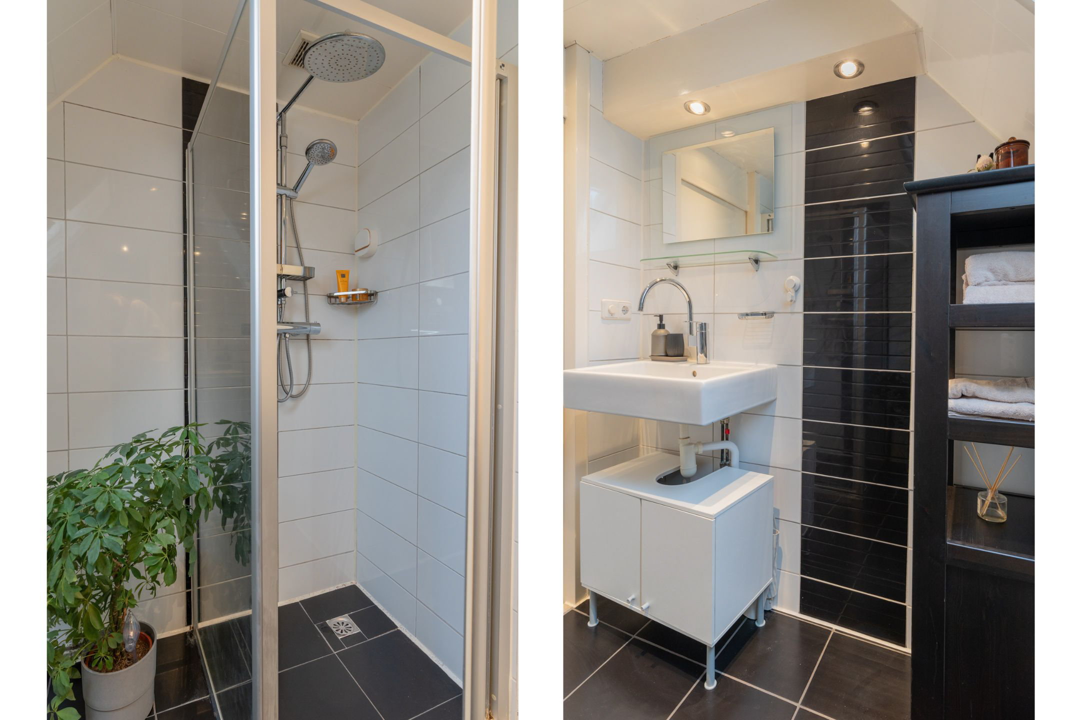 Ruime overloop met toegang tot twee royale slaapkamers. De slaapkamer aan de achterzijde is voorzien van een rolluik en ligt op het ochtendzonnetje. De slaapkamer aan de voorzijde beschikt over een grote kledingkast (blijft achter) en handige bergruimte achter de knieschotten. De badkamer is licht en praktisch ingedeeld met een douche, wastafel en dakraam.