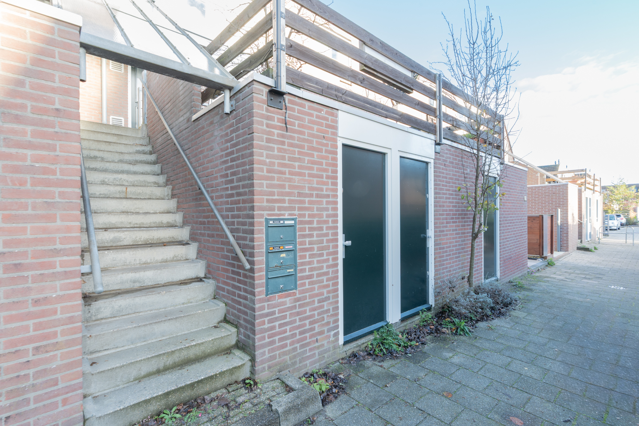 Centrale trapopgang voor de bovenwoningen en brievenbussen. En een ruime privé stenen berging voorzien van elektra, ideaal voor fietsen en opslag.