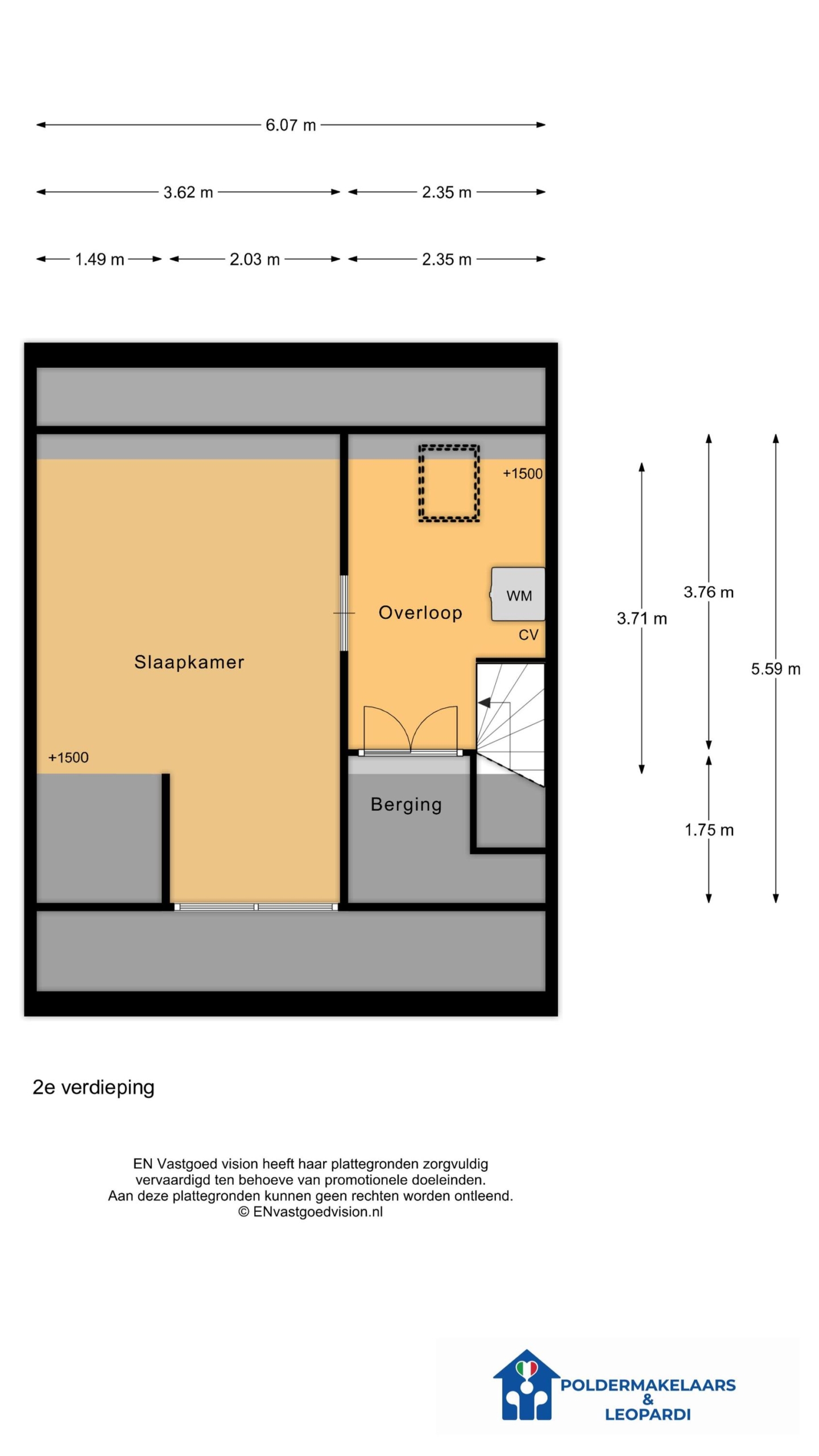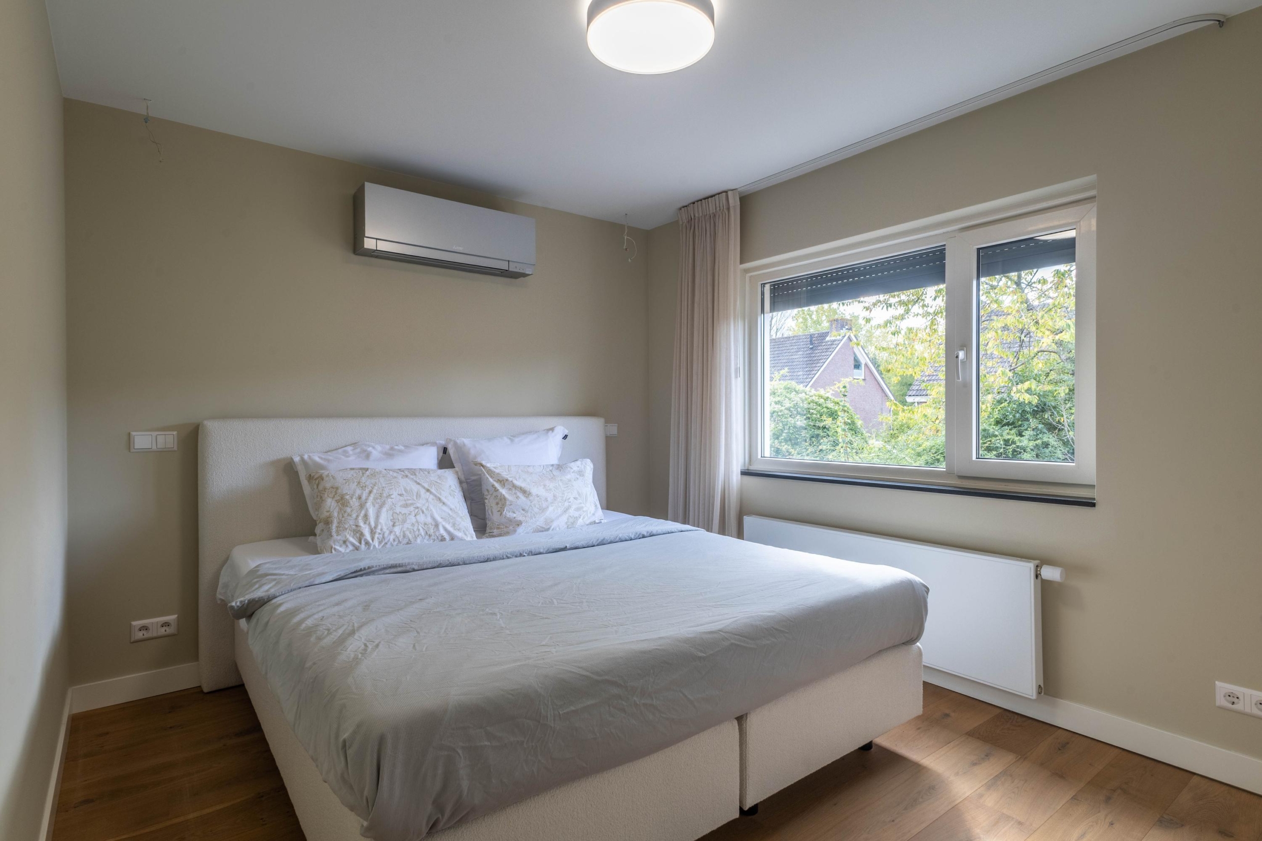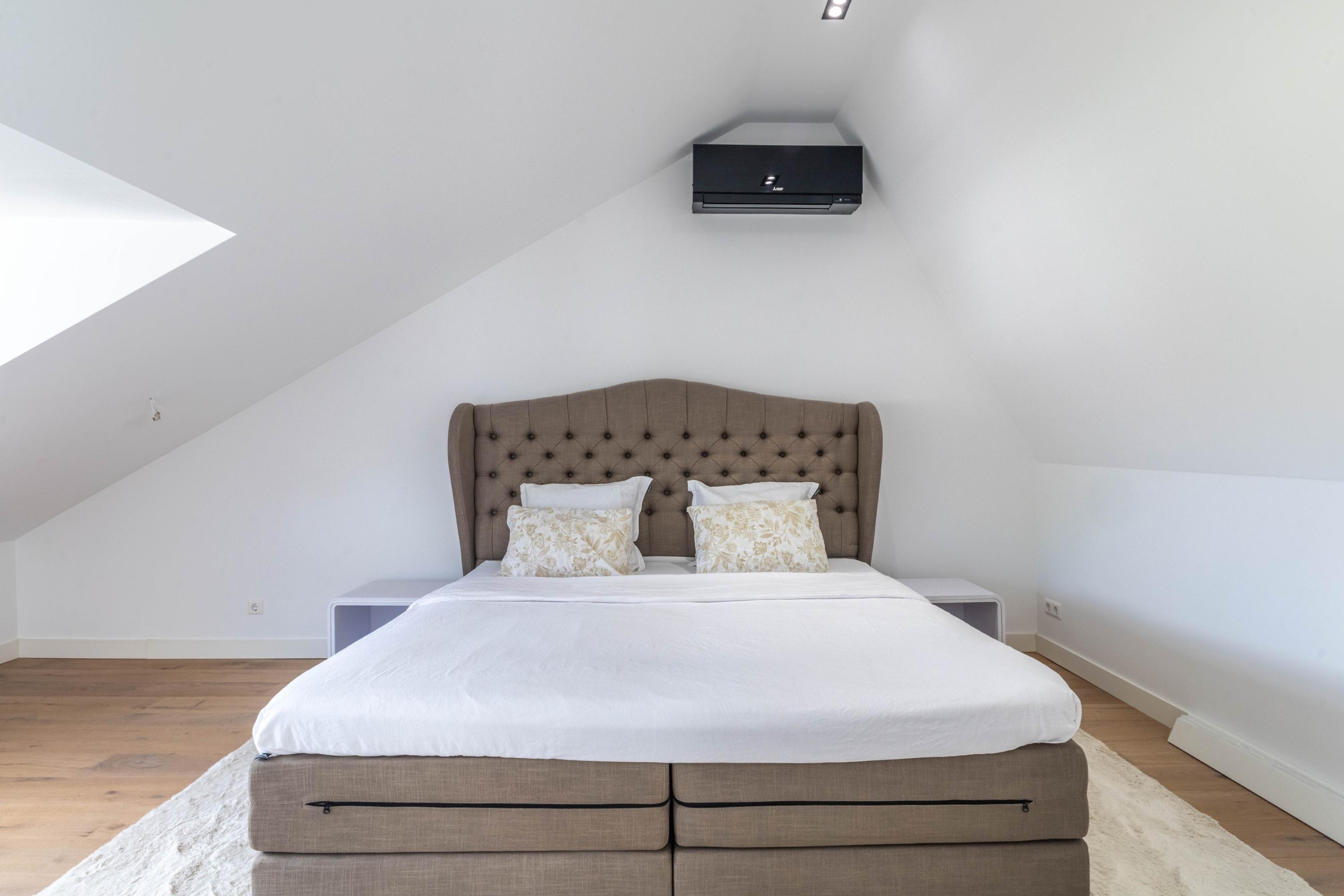 Landing with skylight and connections for the washing machine, dryer, central heating boiler (Intergas HR, from circa 2022) and practical storage space. Large bedroom with dormer window, wooden flooring, air conditioning, and anthracite roller shutters provide comfort and versatility.