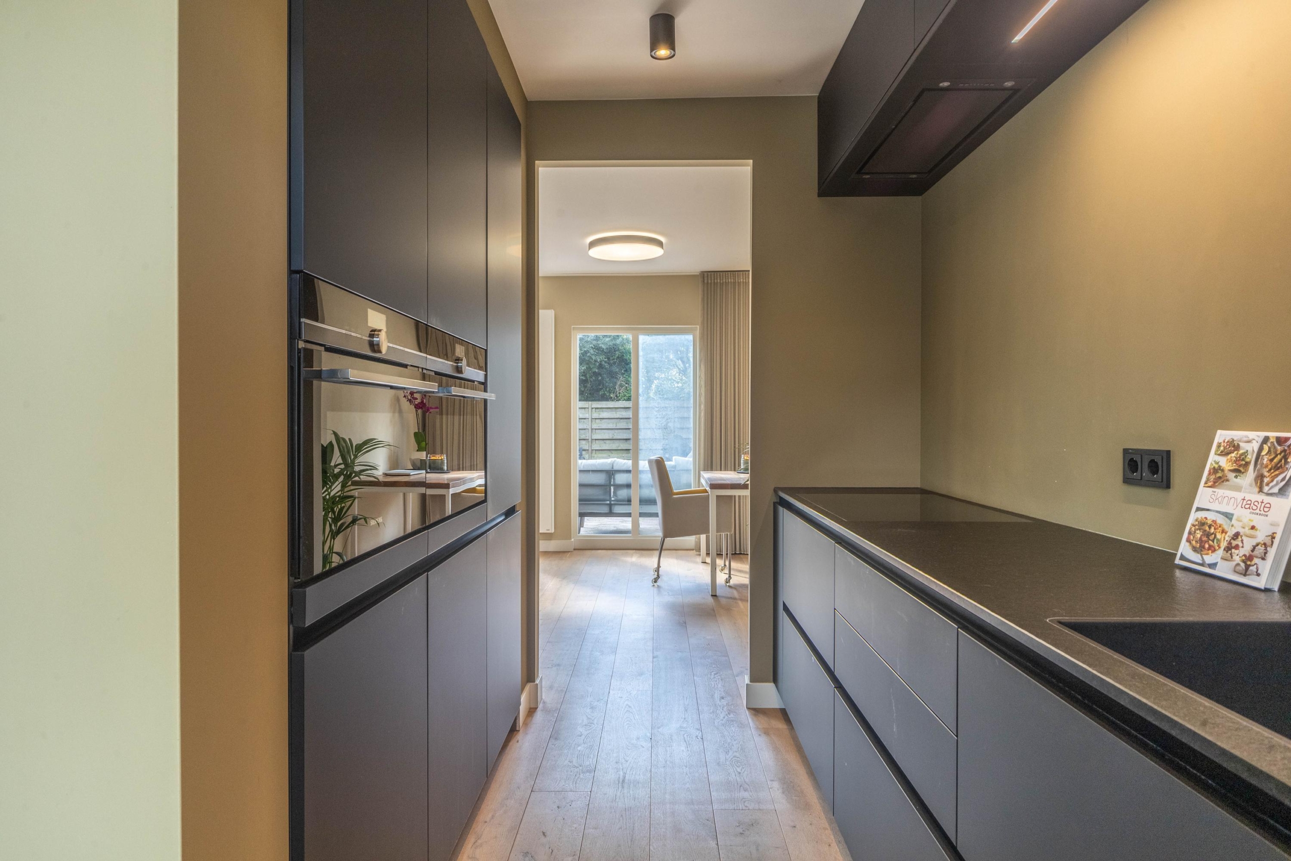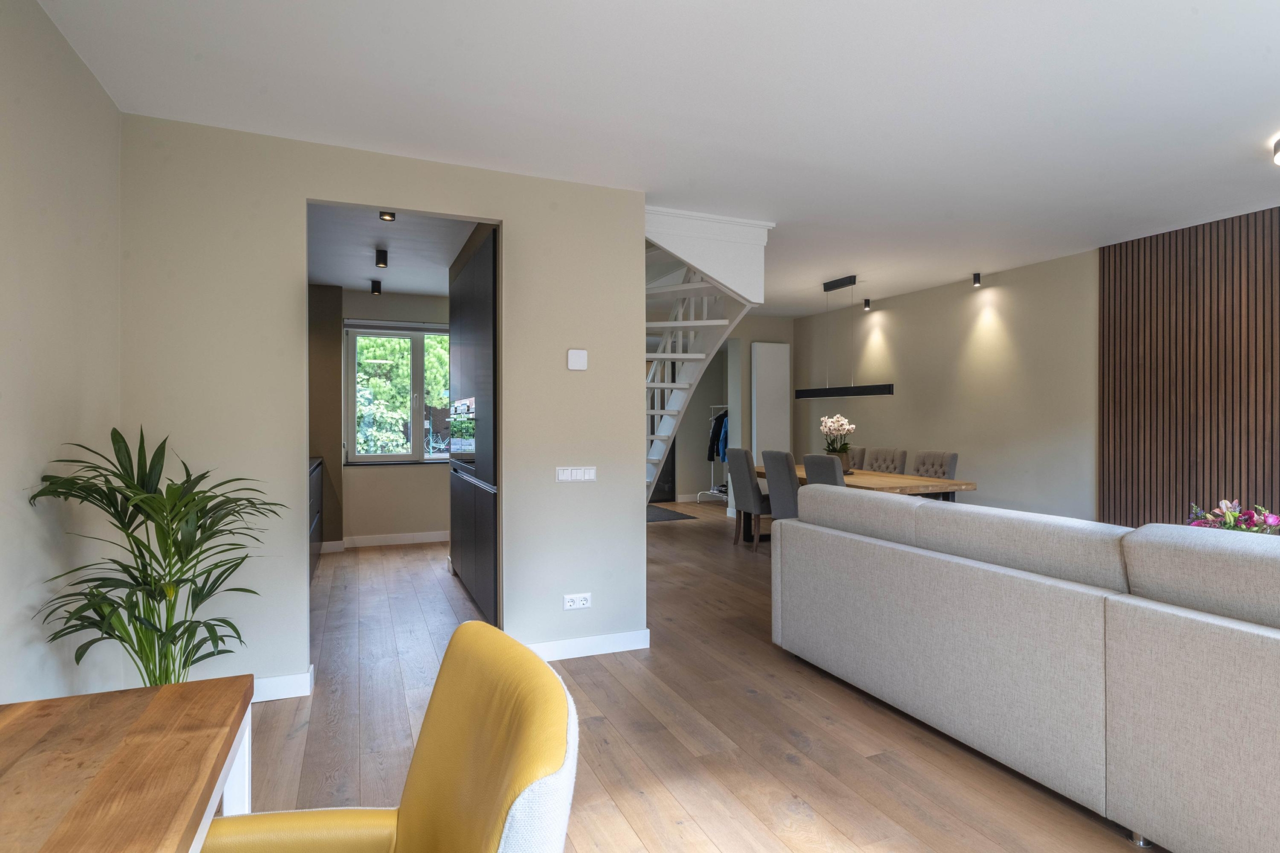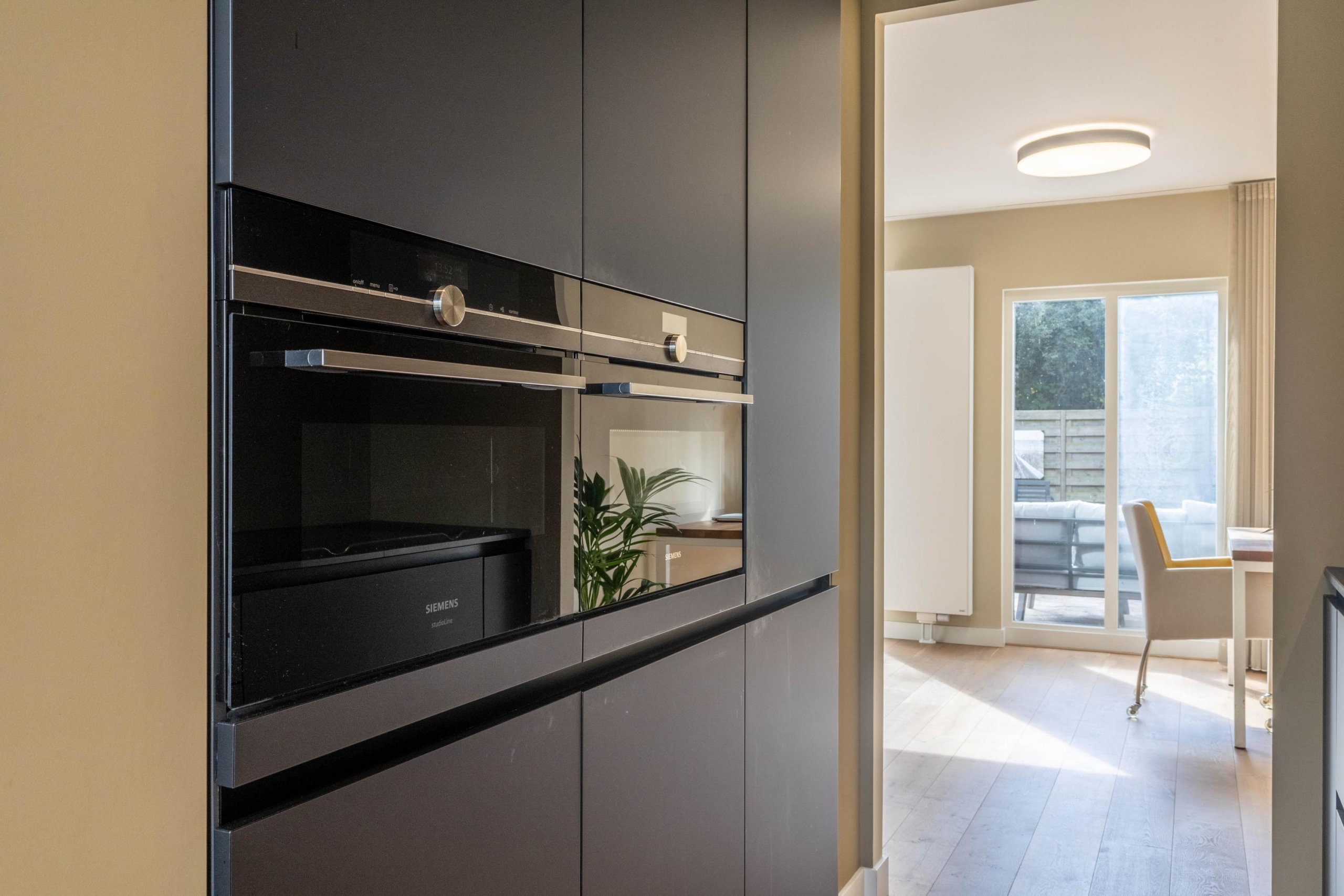 Entrance hall and modern toilet with washbasin. The bright, garden-facing living room features attractive acoustic panels and a warm wooden floor with underfloor heating. The modern semi-open kitchen is sleek and fully equipped with a hob, extractor hood, fridge/freezer, steam oven, combination oven, a Quooker, and dishwasher. Sliding doors open onto the back garden which enjoys the sun most of the day, ideal for relaxing or entertaining. At the front, you’ll find the carport and private parking space, as well as the extensive and modern meter cupboard and attached brick shed with electricity and a skylight.