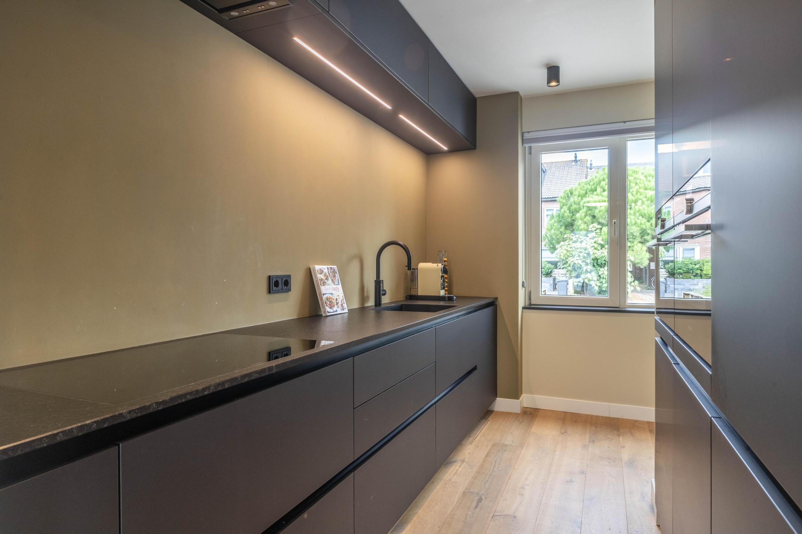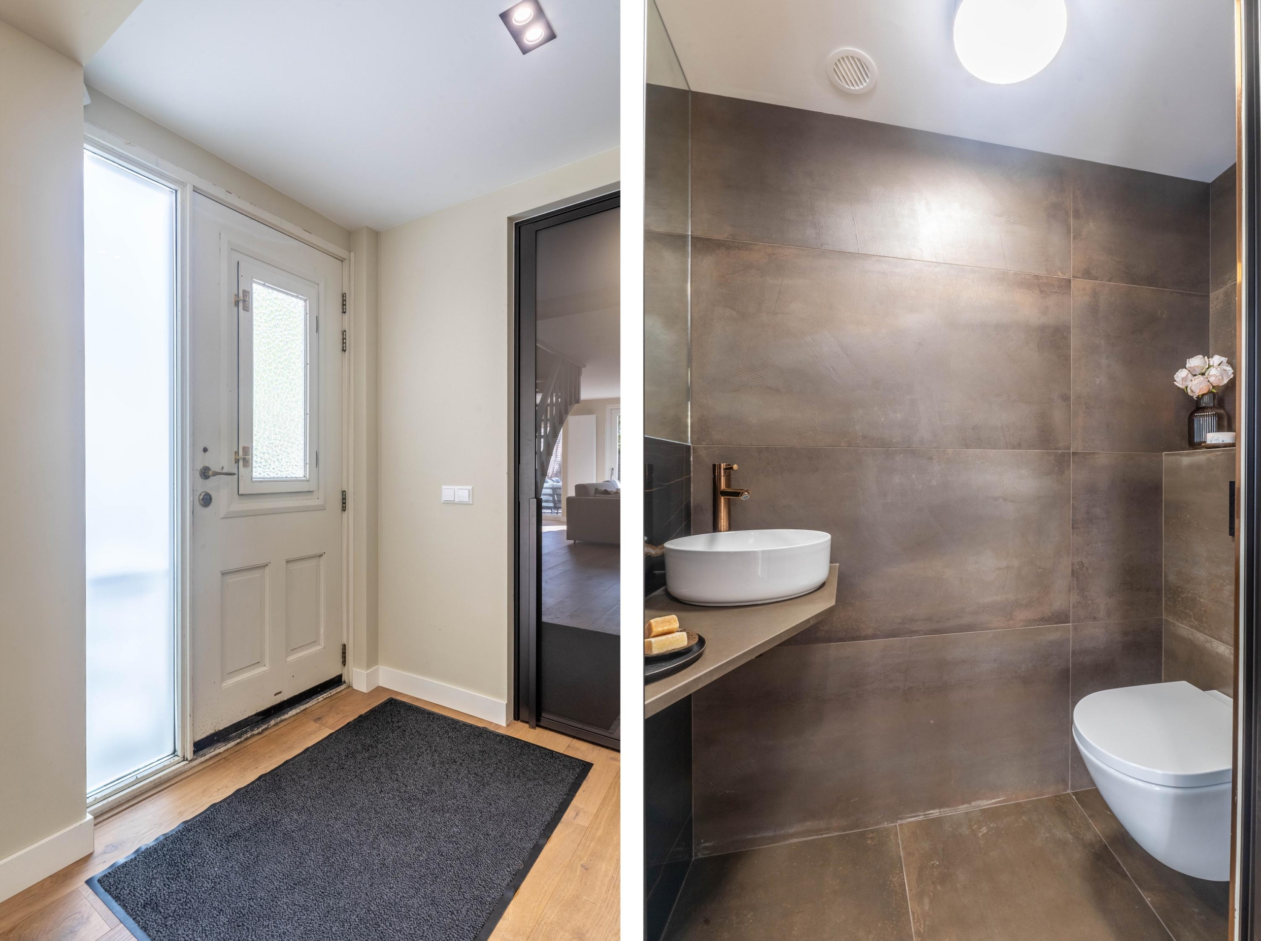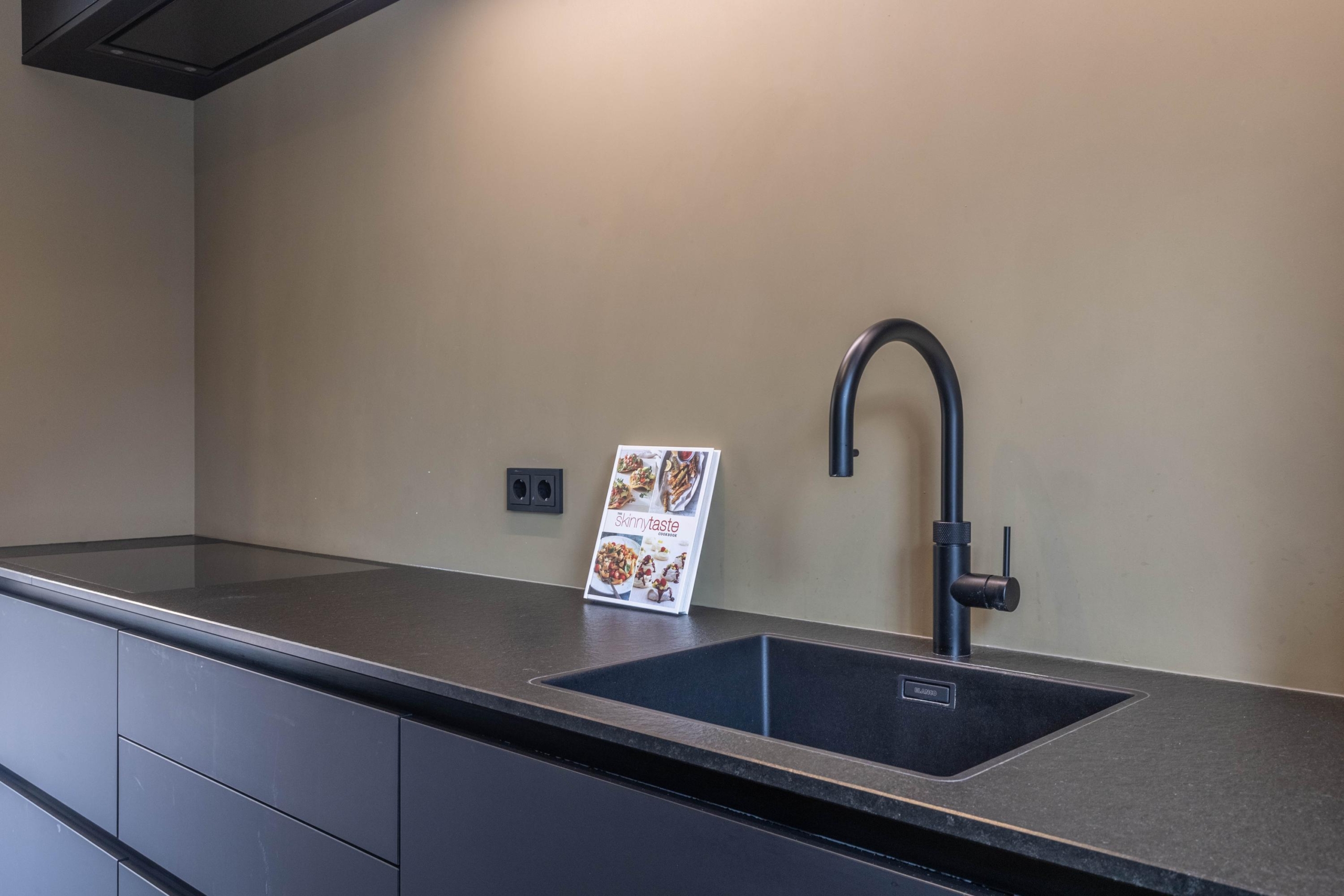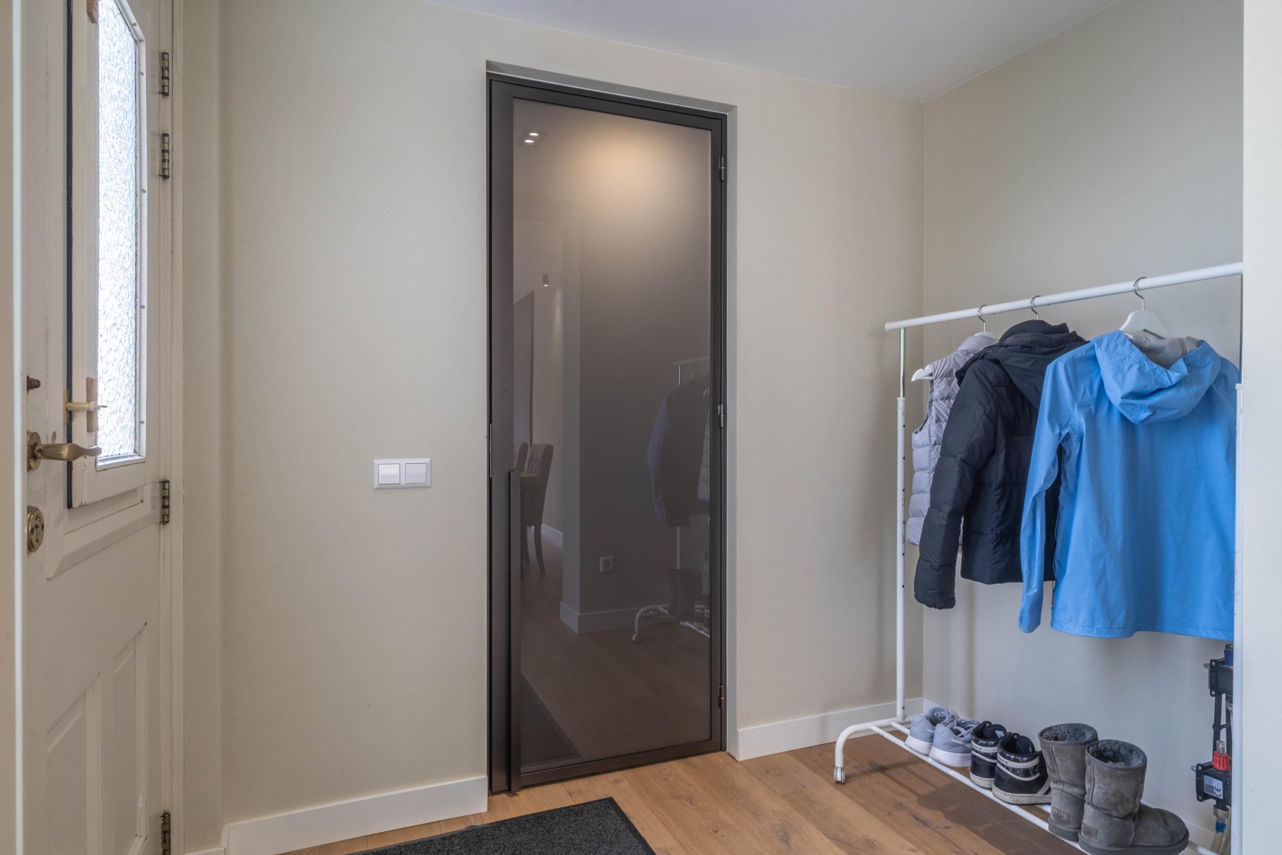 Entrance hall and modern toilet with washbasin. The bright, garden-facing living room features attractive acoustic panels and a warm wooden floor with underfloor heating. The modern semi-open kitchen is sleek and fully equipped with a hob, extractor hood, fridge/freezer, steam oven, combination oven, a Quooker, and dishwasher. Sliding doors open onto the back garden which enjoys the sun most of the day, ideal for relaxing or entertaining. At the front, you’ll find the carport and private parking space, as well as the extensive and modern meter cupboard and attached brick shed with electricity and a skylight.