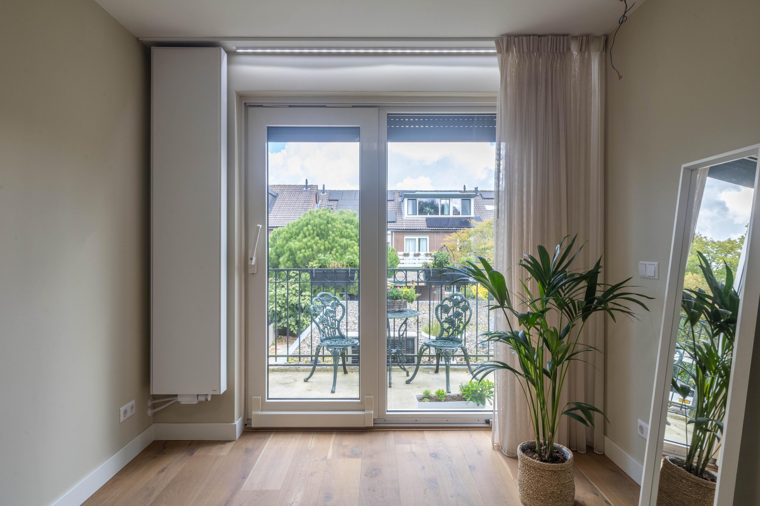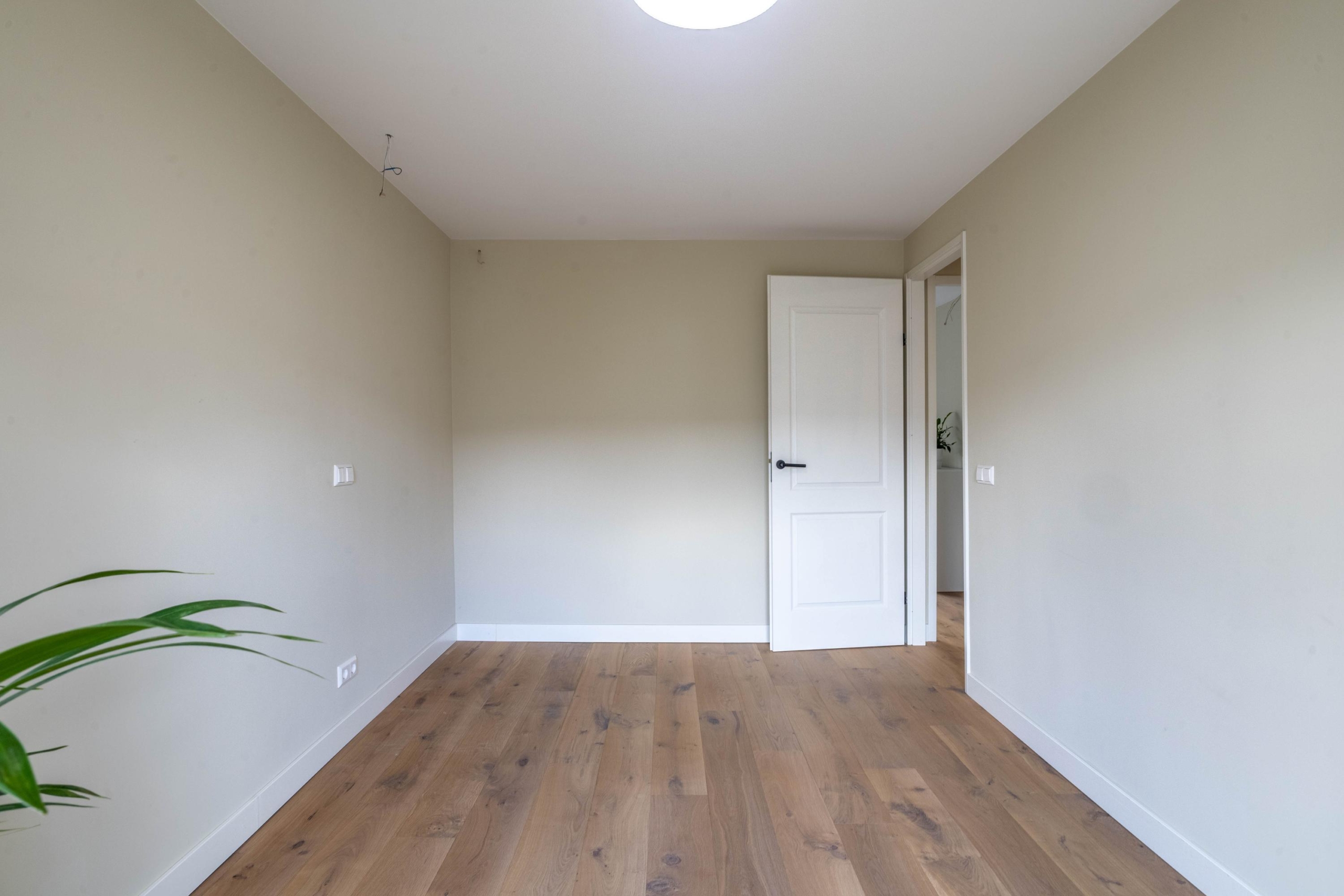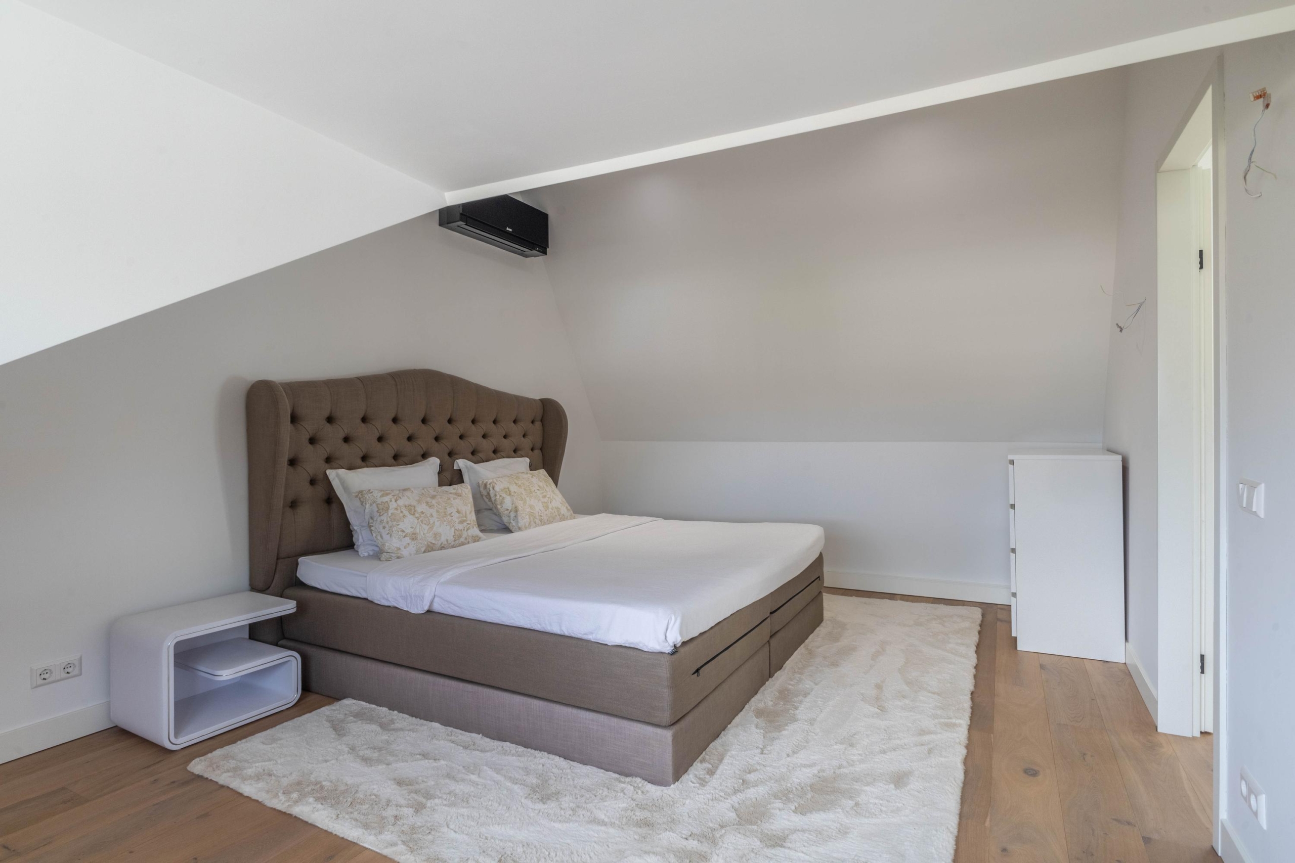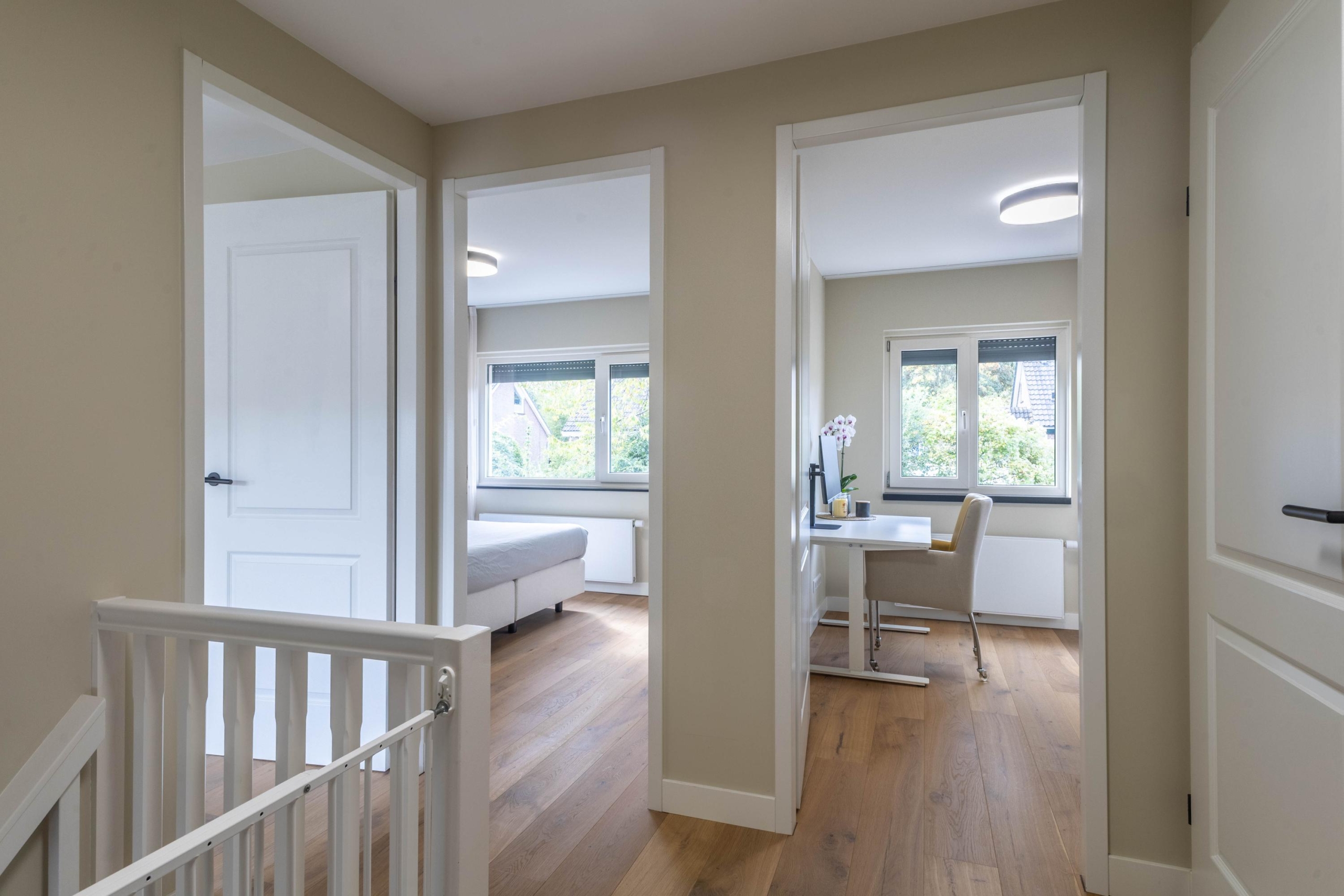 Overloop, die leidt naar een luxe, moderne badkamer is voorzien van een ligbad, inloopdouche met nisje, toilet en wastafel in meubel met bronzen kranen en elektrische vloerverwarming. Aan de voorzijde tref je een ruime slaapkamer met schuifpui naar ruime balkon. Aan de achterzijde is een riante ouderslaapkamer met airco en een 3e slaapkamer gelegen. Warme houten vloeren en antracietkleurige rolluiken zorgen voor een stijlvolle afwerking.