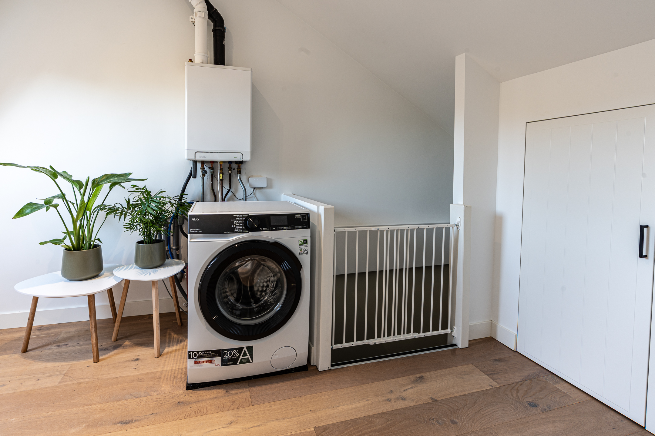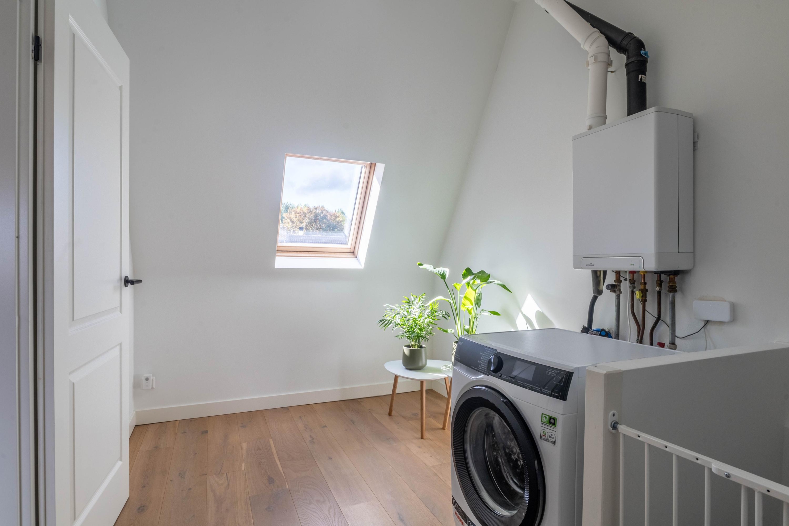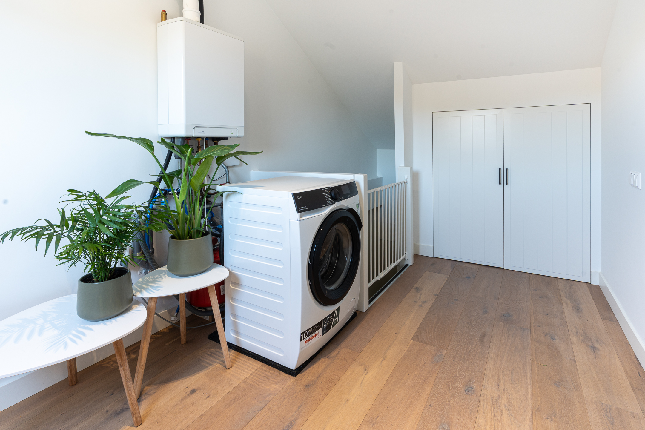 Voorzolder met dakraam en de aansluitingen van de wasmachine, droger, CV-combiketel (Intergas HR, bouwjaar circa 2022) en diverse praktische bergruimte achter de knieschotten. Een riante slaapkamer met dakkapel, warme houten vloer, airconditioning en antracietkleurige rolluik.