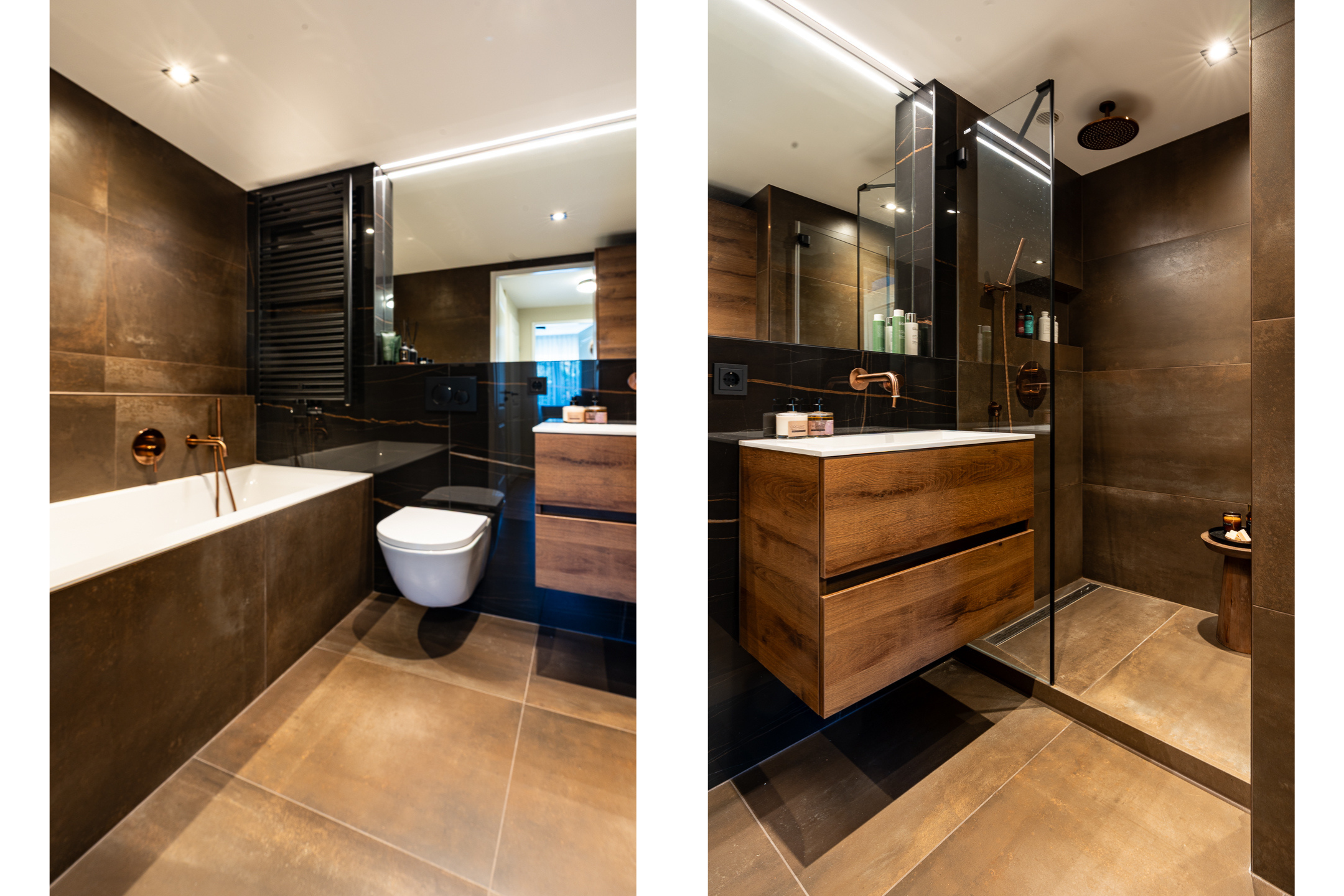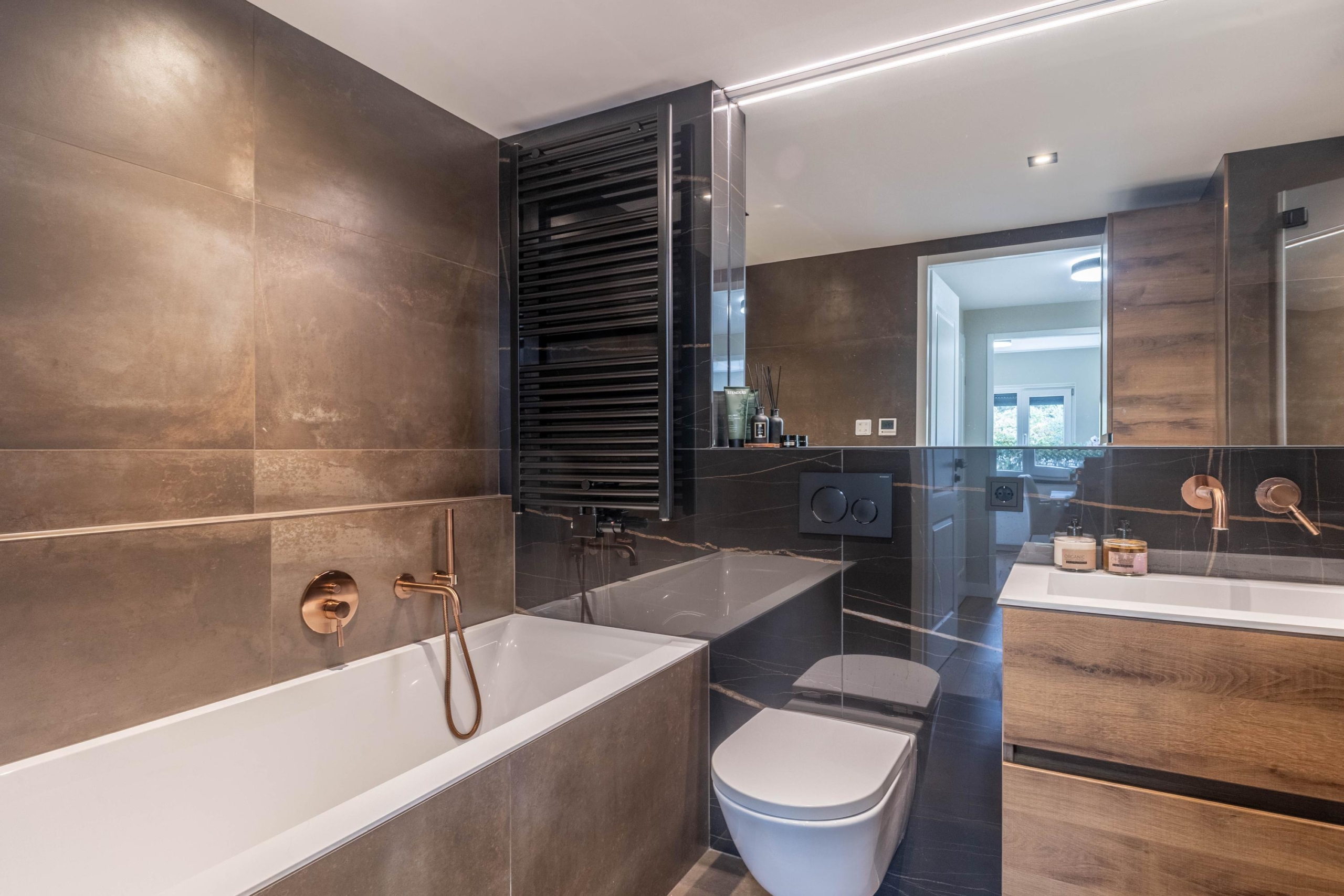 - Bathroom facilities Ligbad, toilet, wastafel, wastafelmeubel, inloopdouche, vloerverwarming