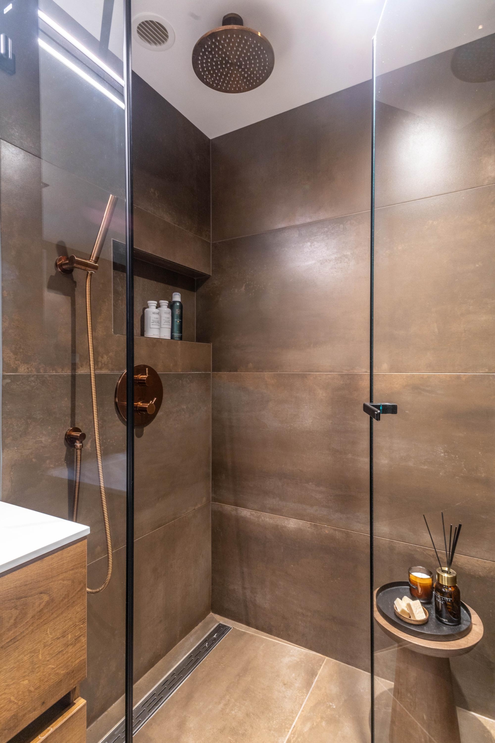 Landing leading to a luxurious, modern bathroom with a bathtub, walk-in shower with a niche, toilet, and a vanity sink completed with bronze taps and electric underfloor heating. At the front, you’ll find a spacious bedroom with sliding doors opening to a large balcony. At the rear, you’ll find a generous master bedroom with air conditioning and a third bedroom. Warm wooden flooring and anthracite shutters add a stylish finish.